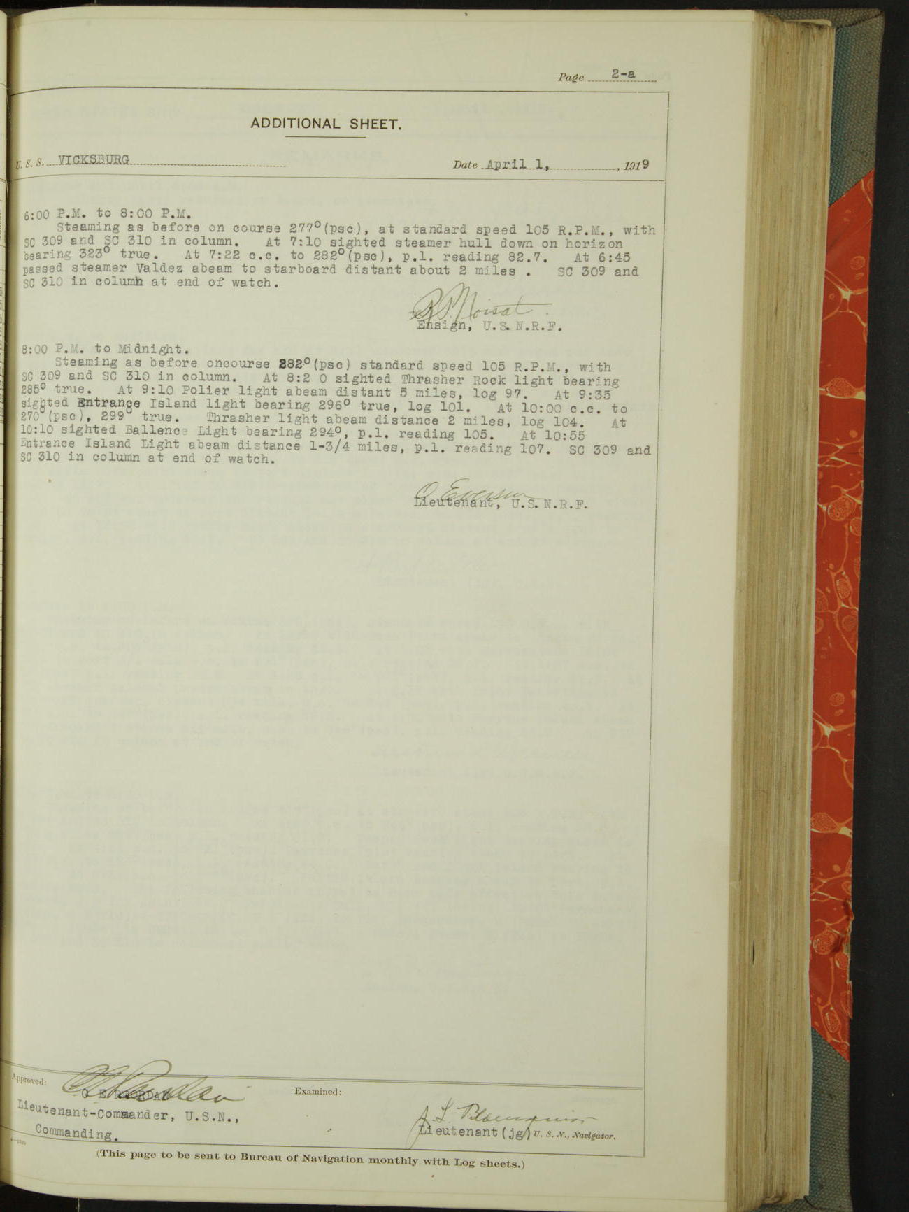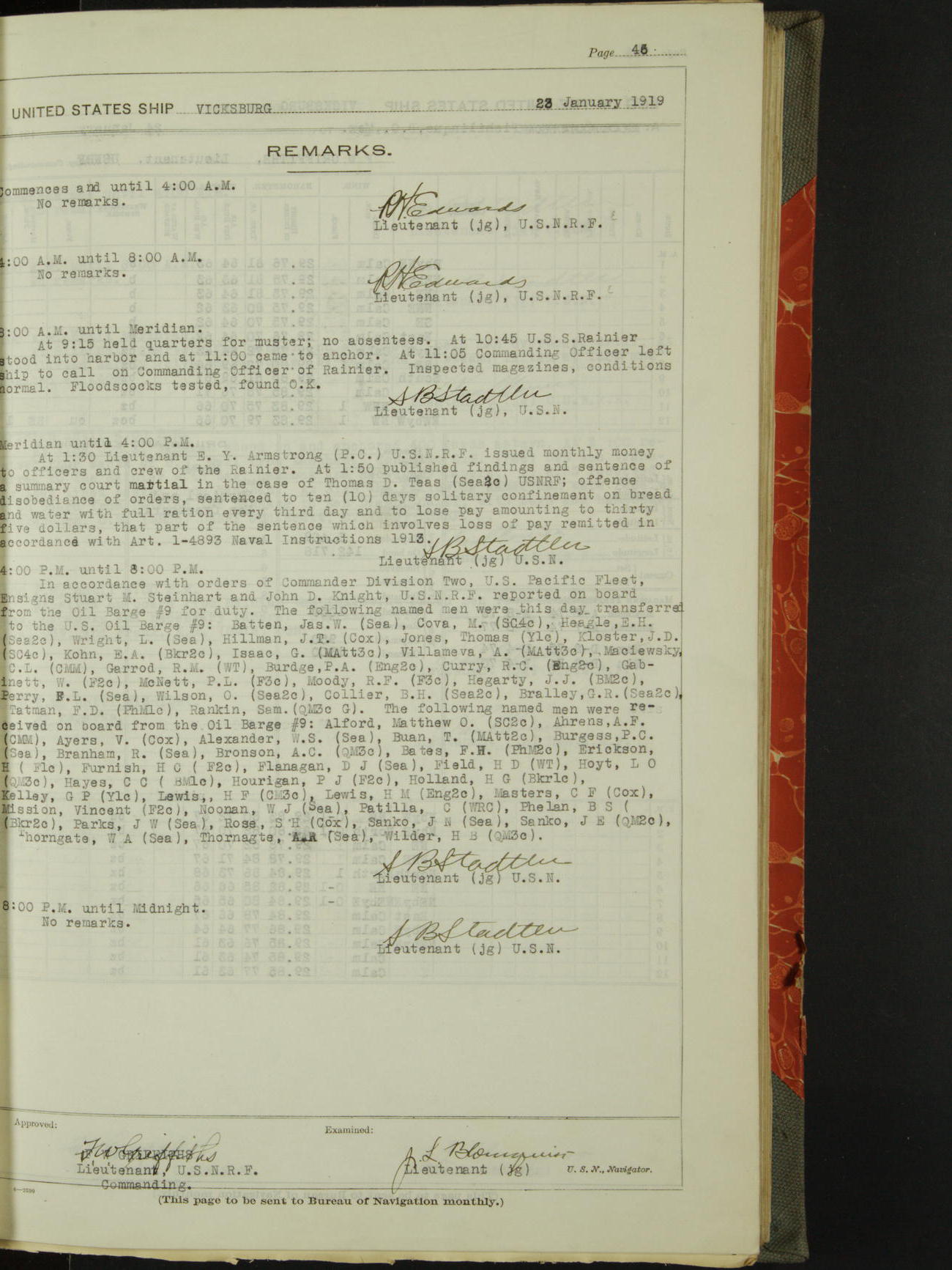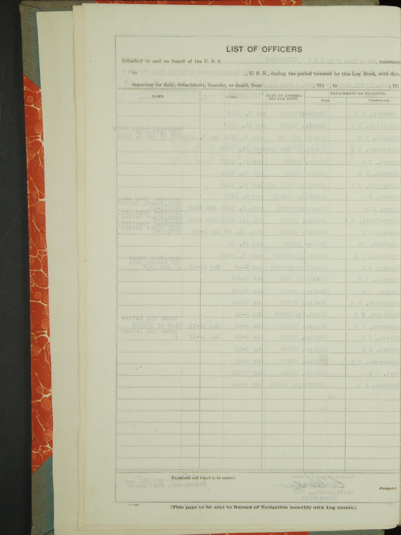 List of OfficerList of Officers attached to and on board of the USS "Vicksburg", commanded by Charles E Reordan, Lieutenant Commander, US Navy, during the period covered by this Log book with date of reporting for duty, detachment, transfer or death from January 1st, 1919, to January 31st, 1919