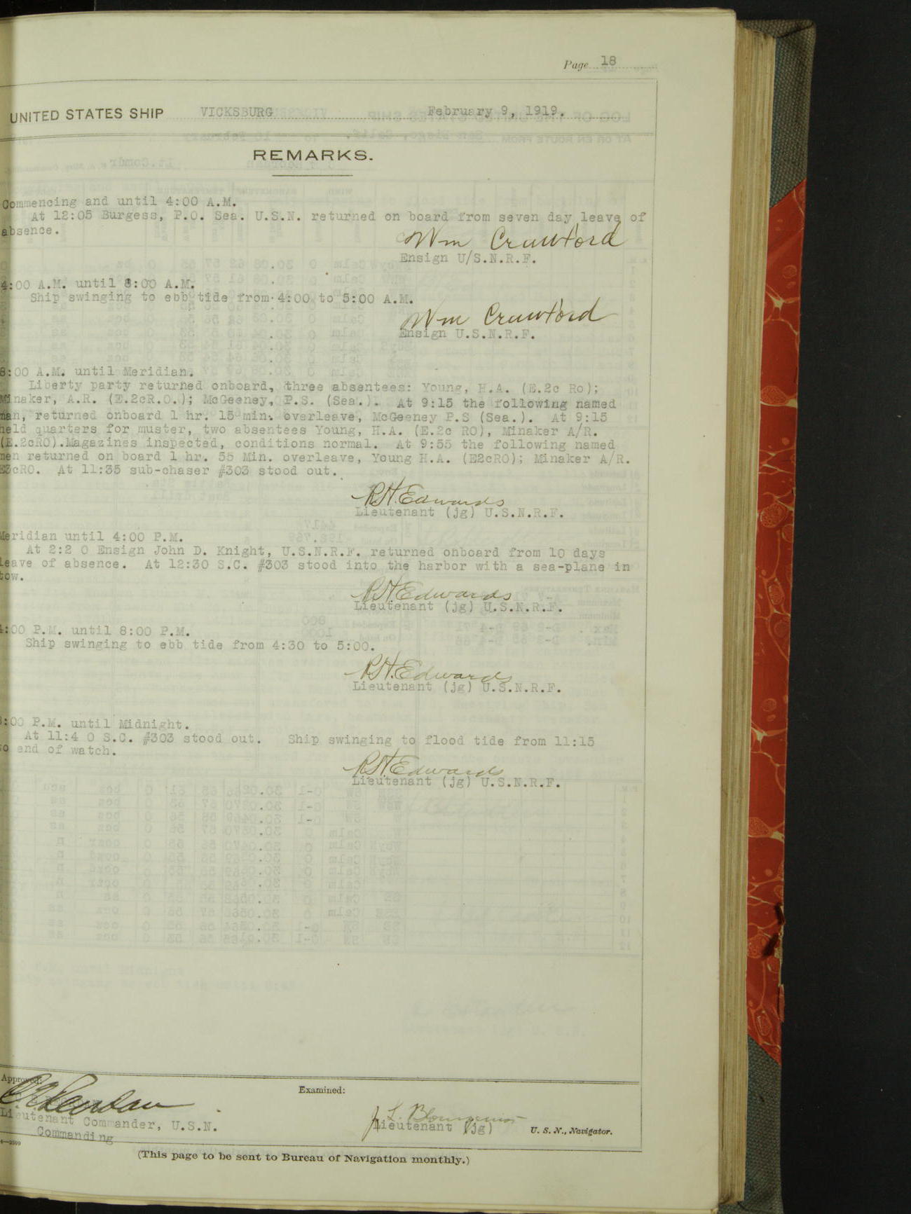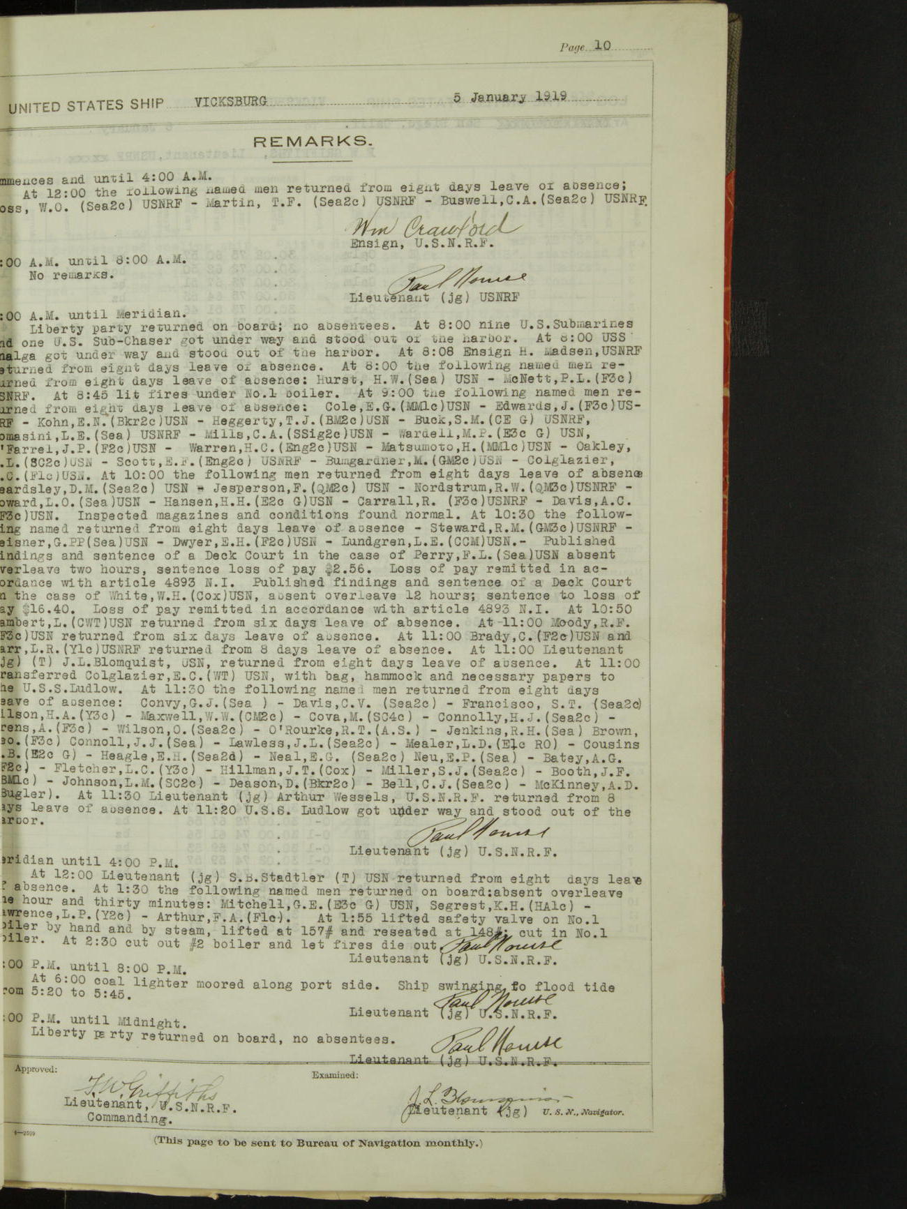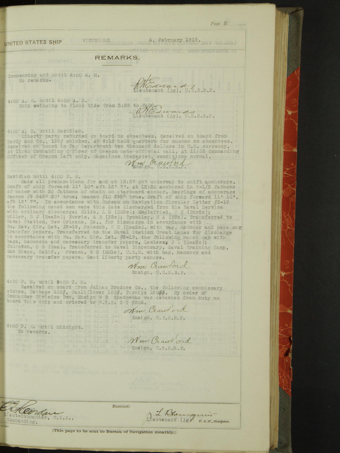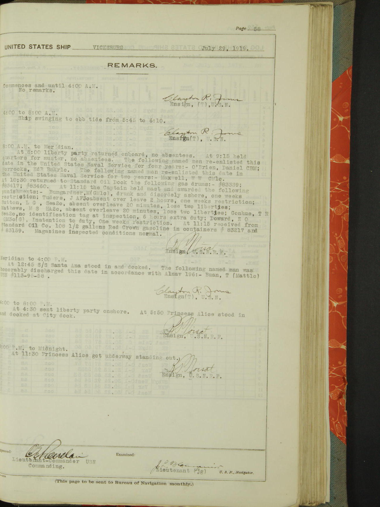 List of OfficerList of Officers attached to and on board of the USS "Vicksburg", commanded by Charles E Reordan, Lieutenant Commander, US Navy, during the period covered by this Log book with date of reporting for duty, detachment, transfer or death from January 1st, 1919, to January 31st, 1919