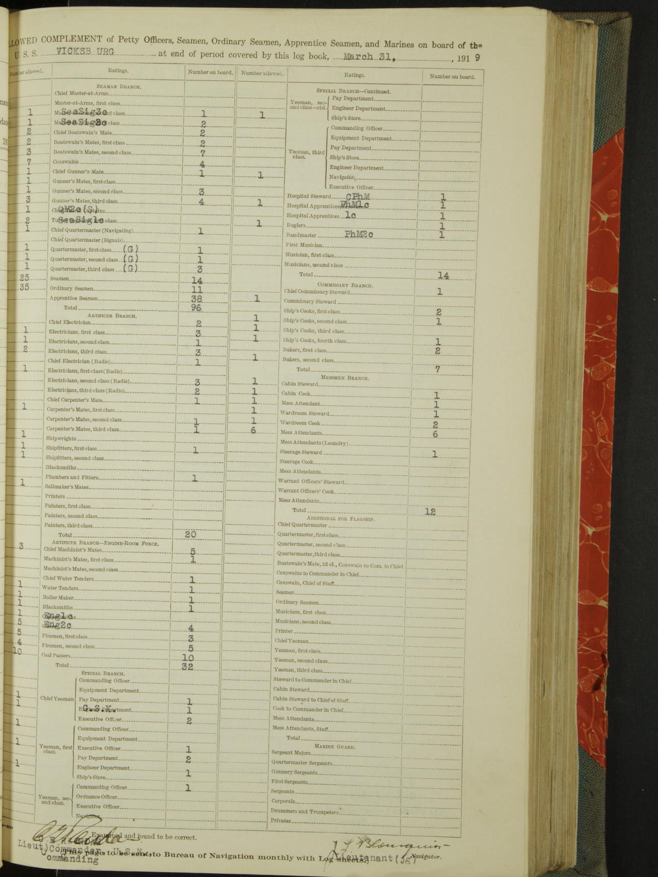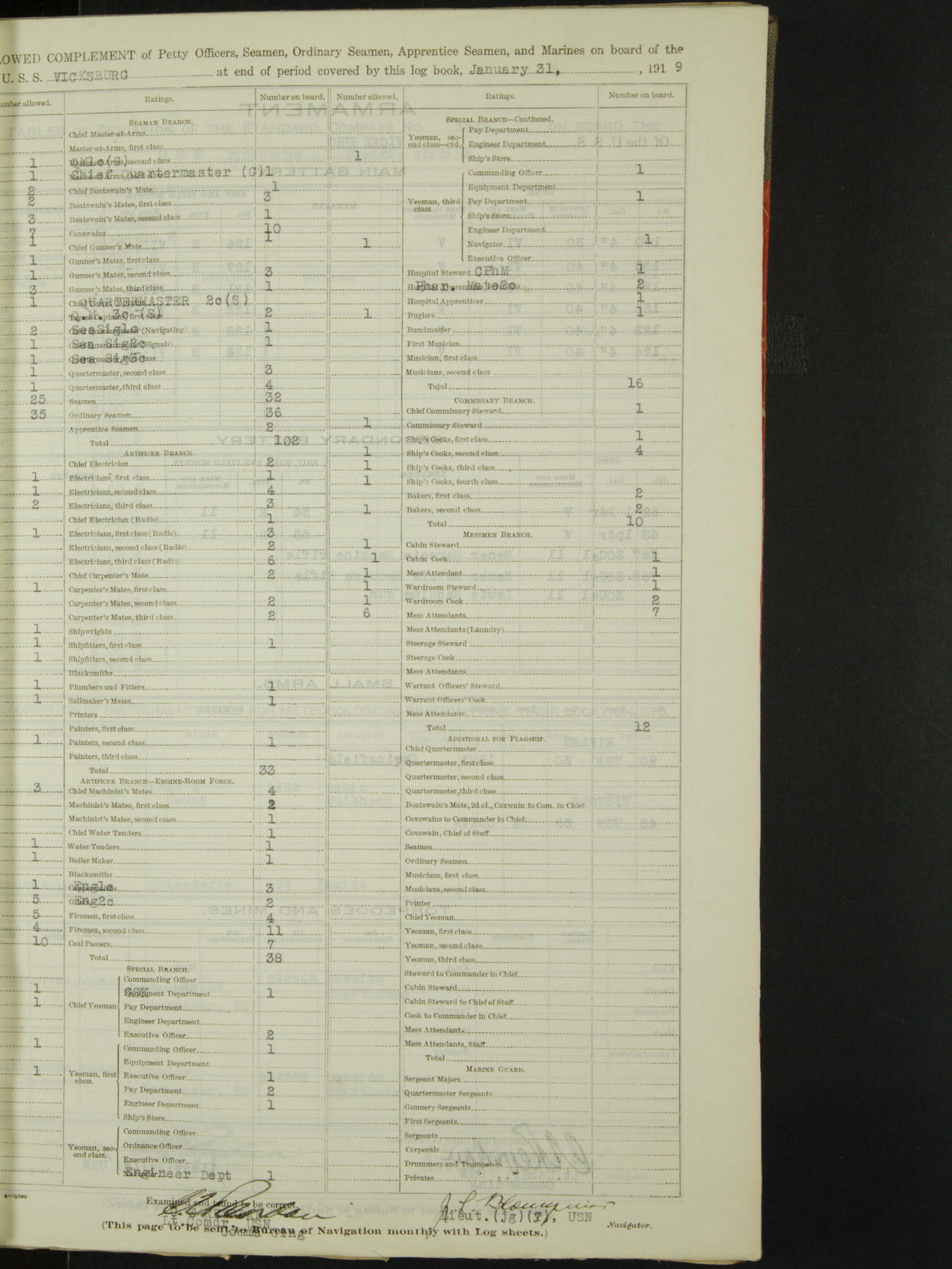 Complement of Petty Officers, Seamen, Ordinary Seamen, Apprentice Seamen, and Marines on board of the USS "Vicksburg", 3rd rate, at the end of period covered by this log book, January 31st, 1919