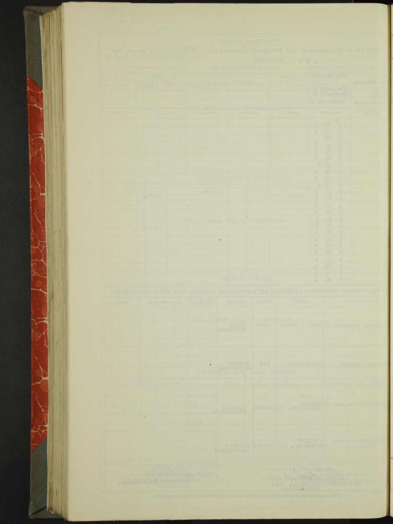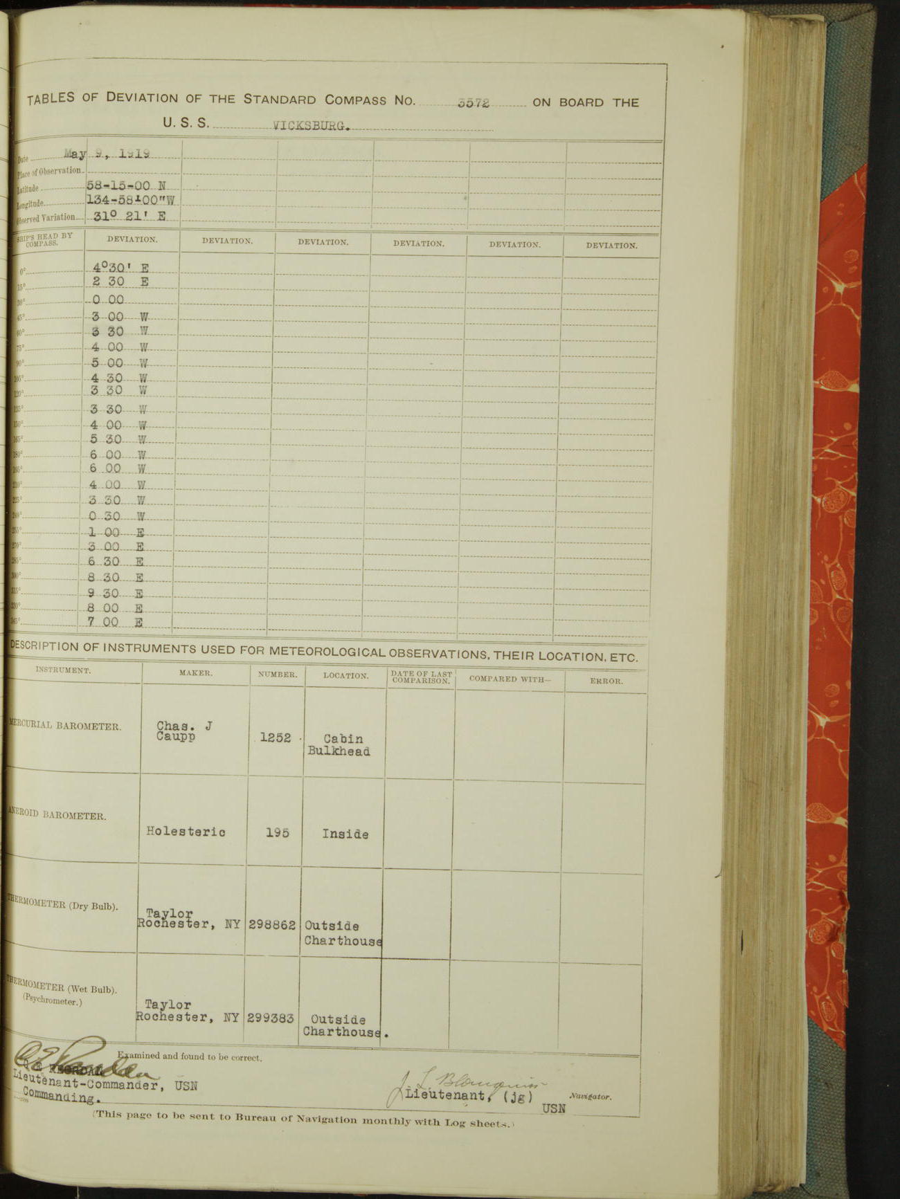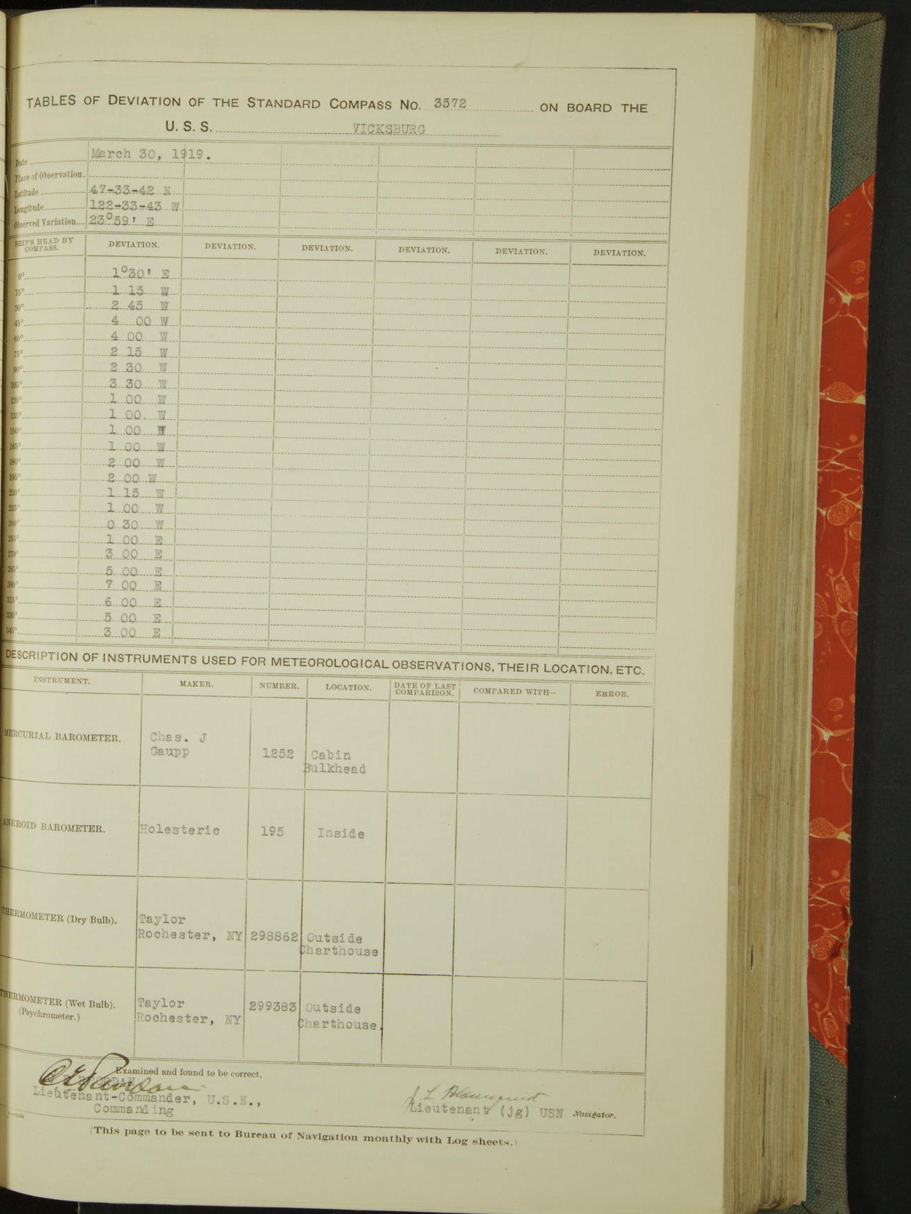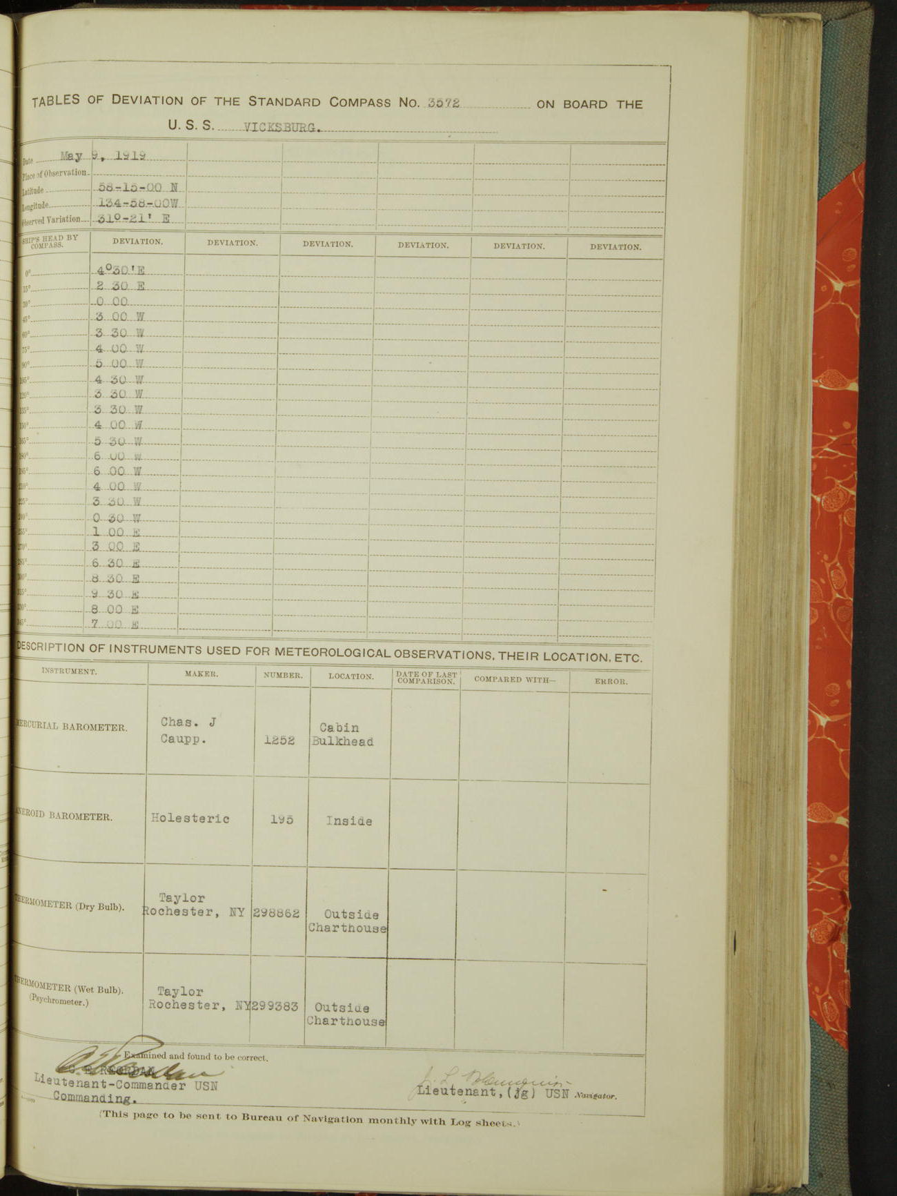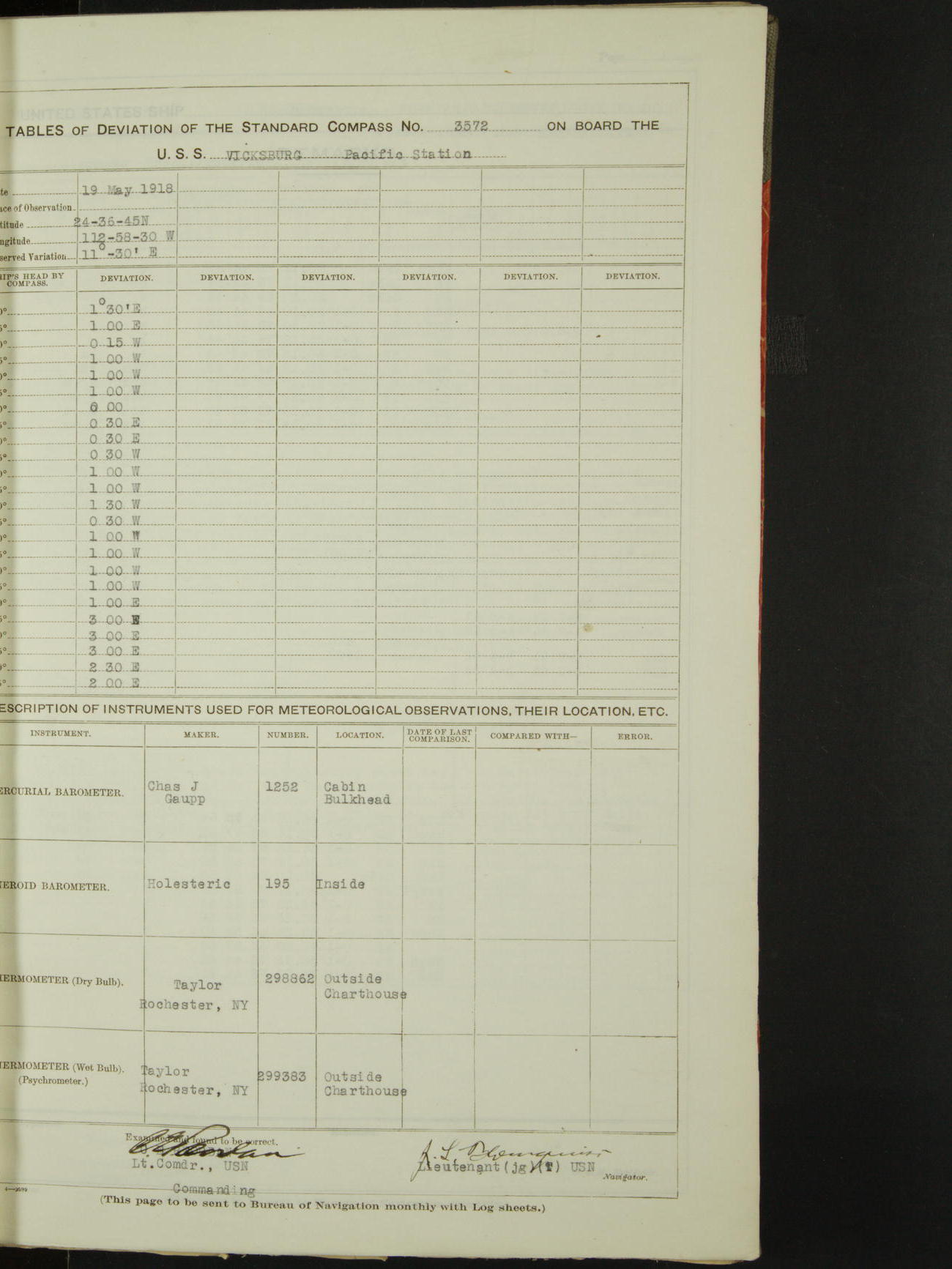 Tables of deviation of the standard compass N° 3572 on board the USS Vicksburg Pacific Station