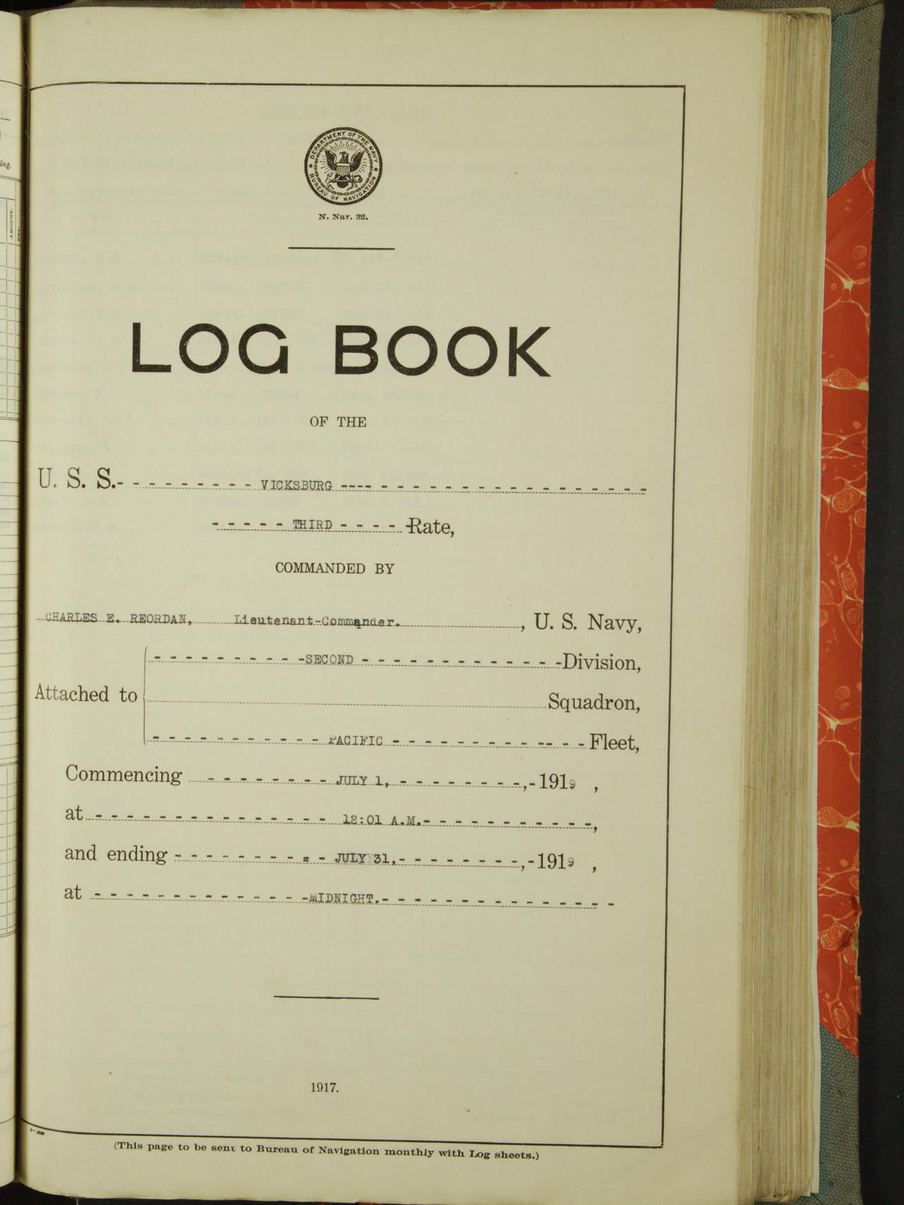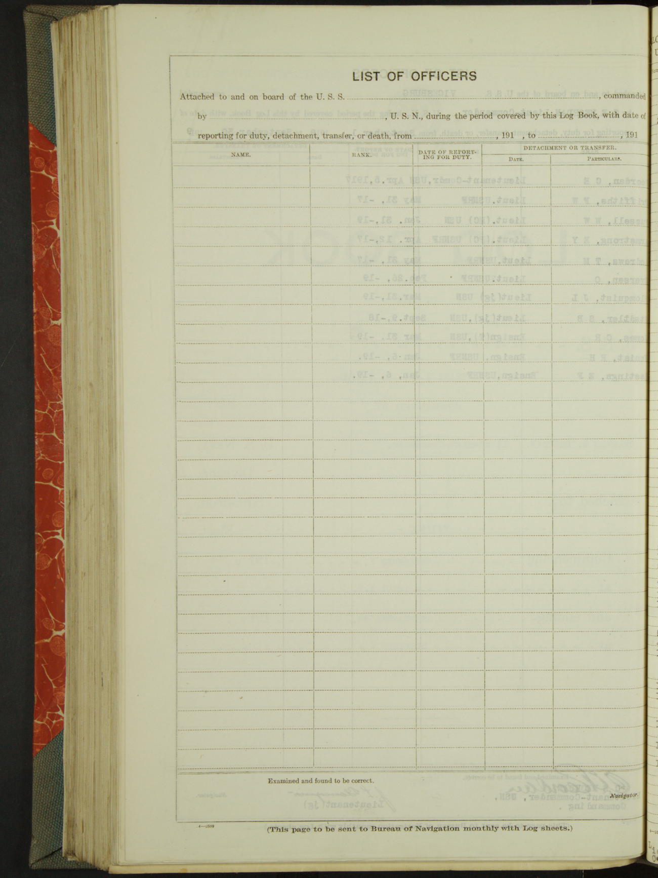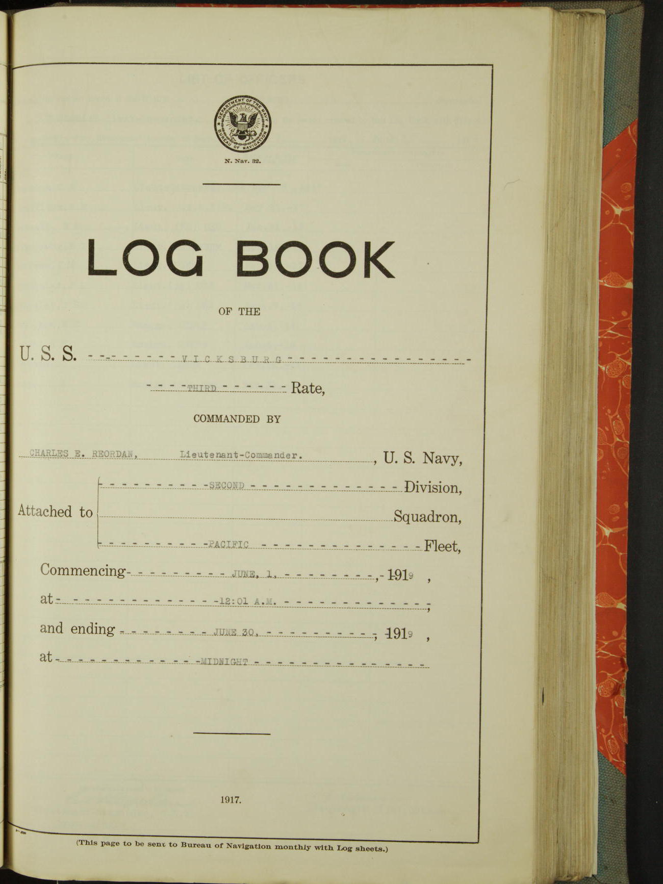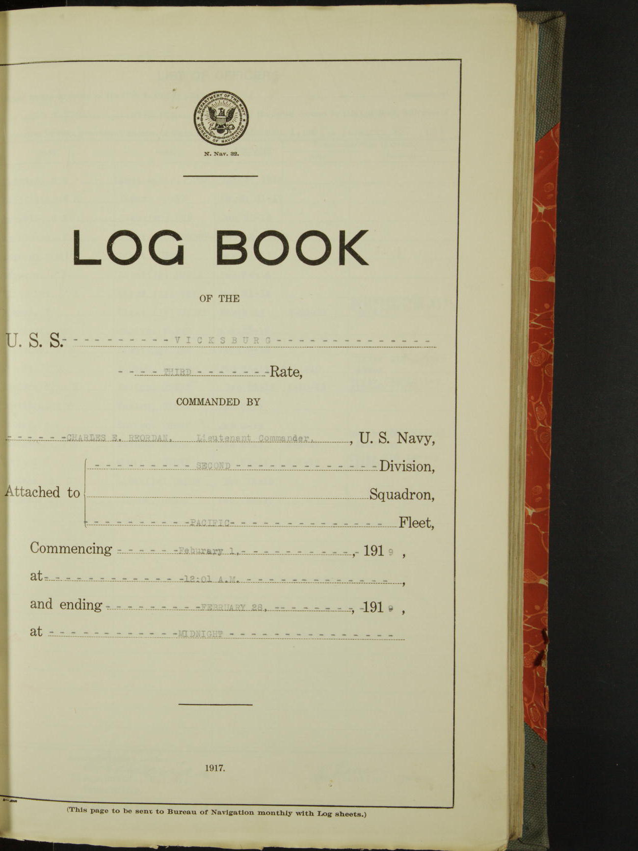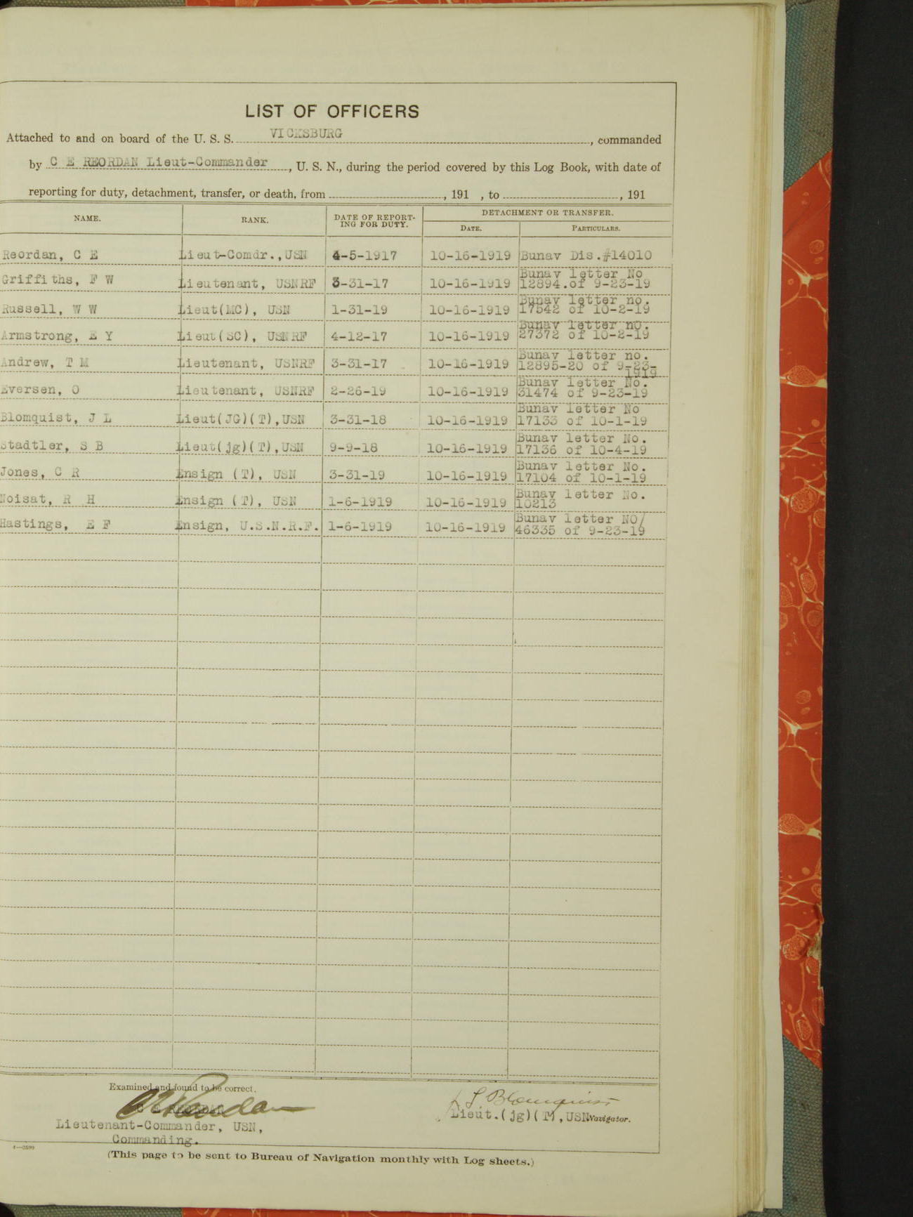 List of OfficerList of Officers attached to and on board of the USS "Vicksburg", commanded by Charles E Reordan, Lieutenant Commander, US Navy, during the period covered by this Log book with date of reporting for duty, detachment, transfer or death from ...