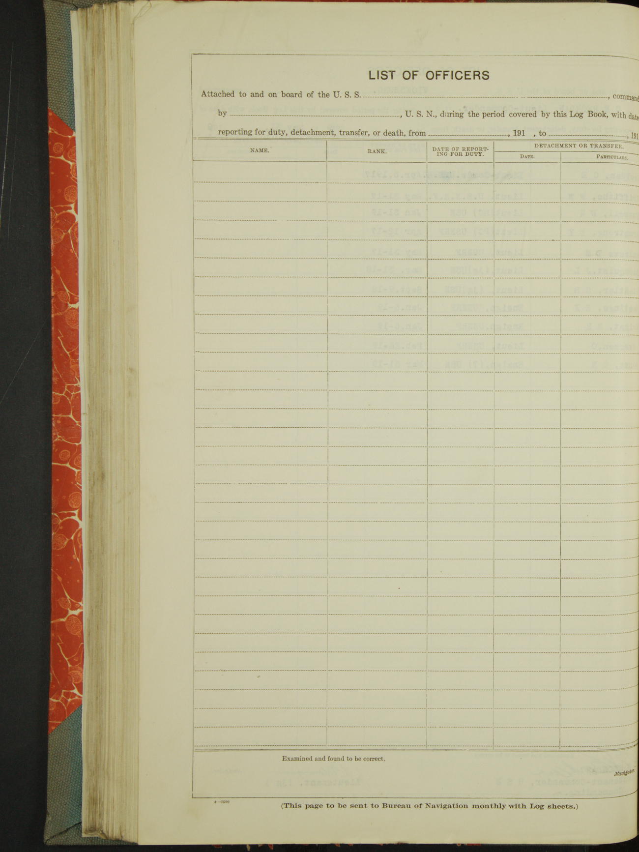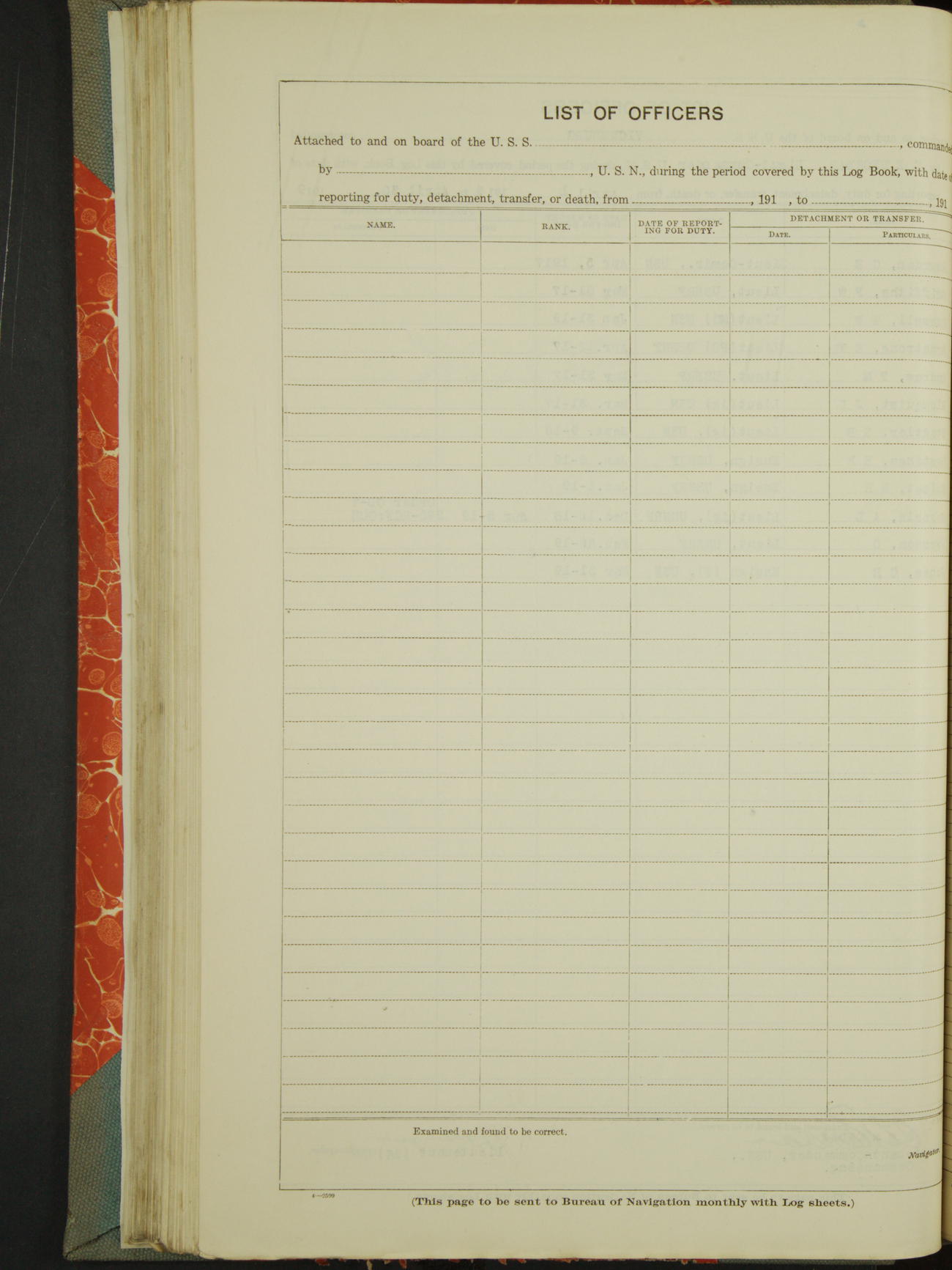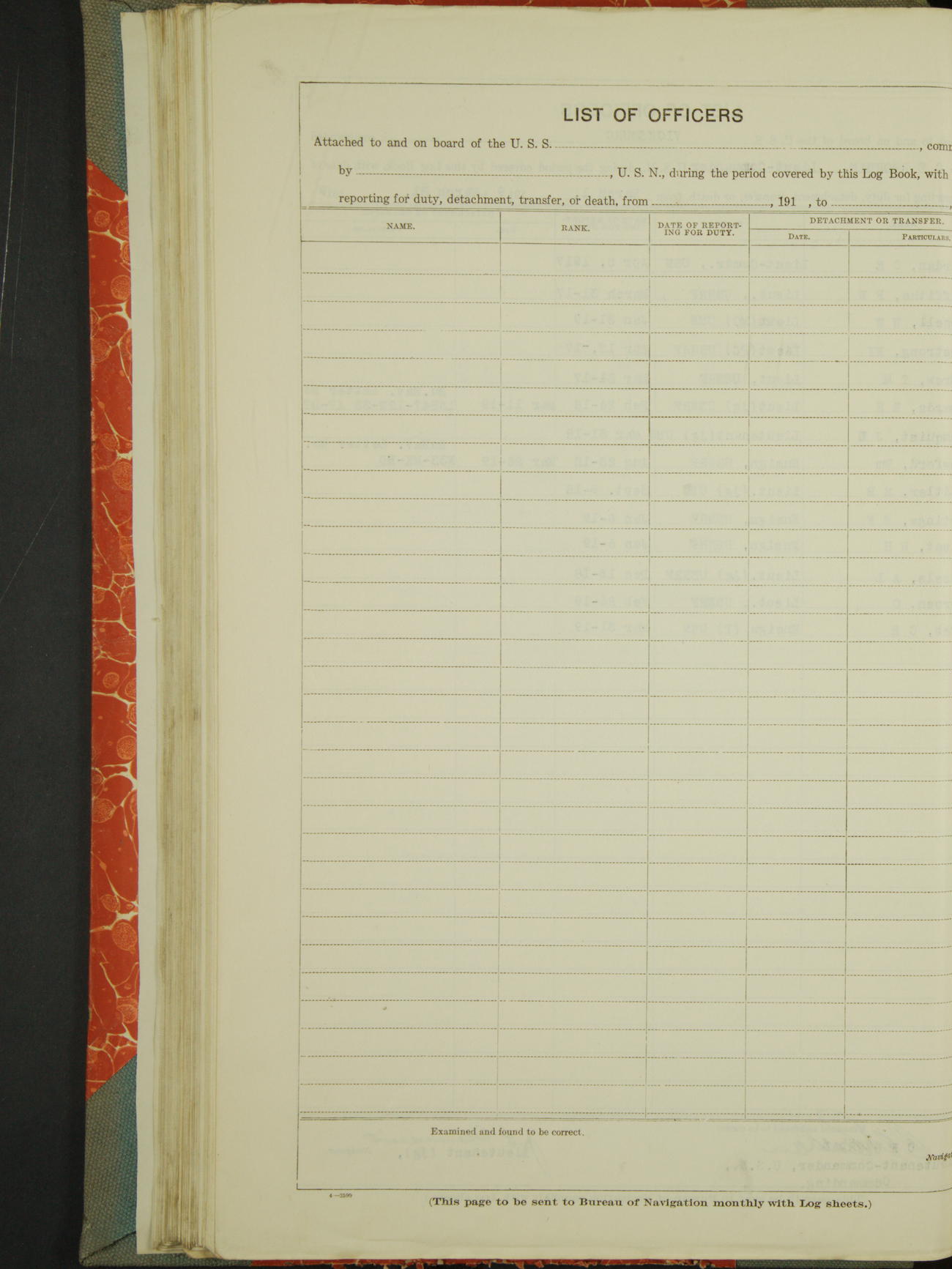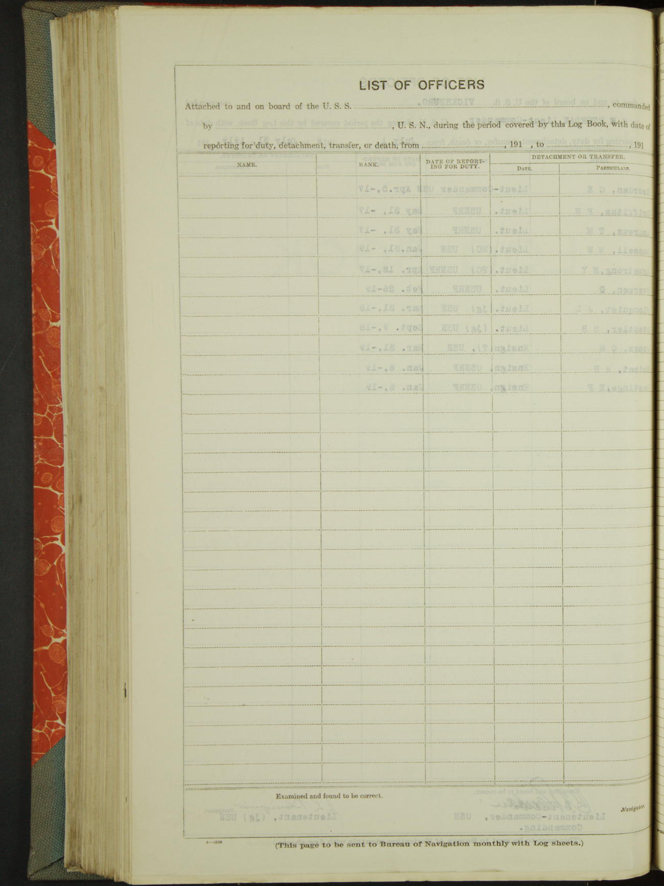 List of OfficerList of Officers attached to and on board of the USS "Vicksburg", commanded by Charles E Reordan, Lieutenant Commander, US Navy, during the period covered by this Log book with date of reporting for duty, detachment, transfer or death from ...
