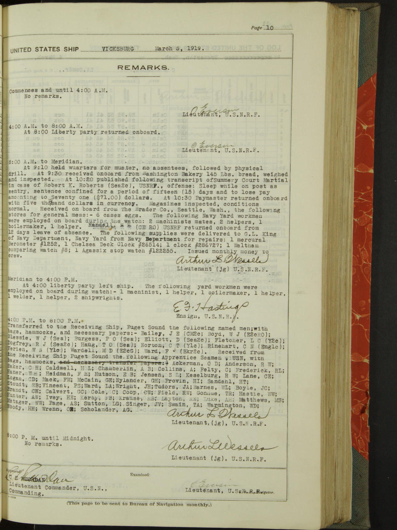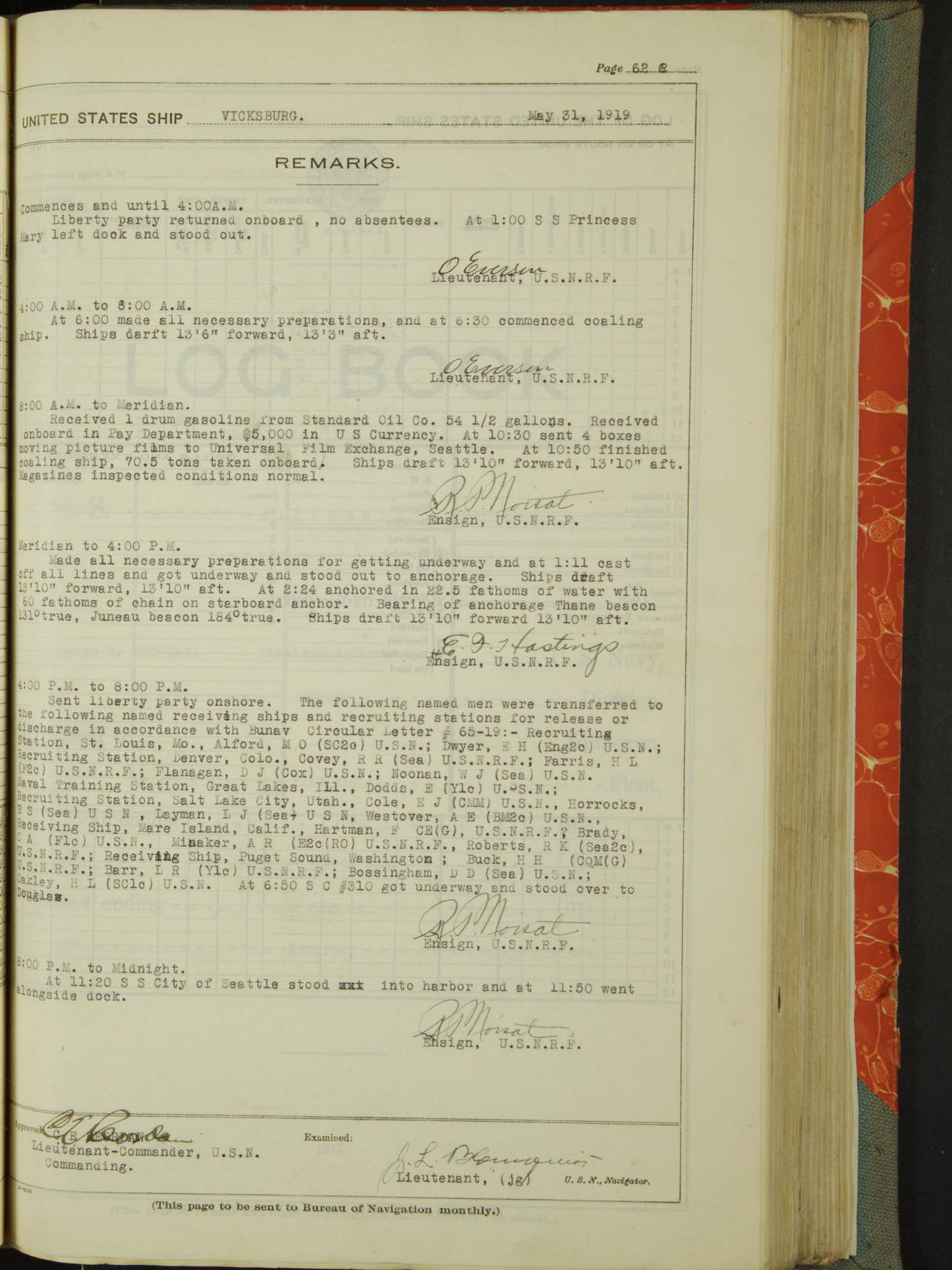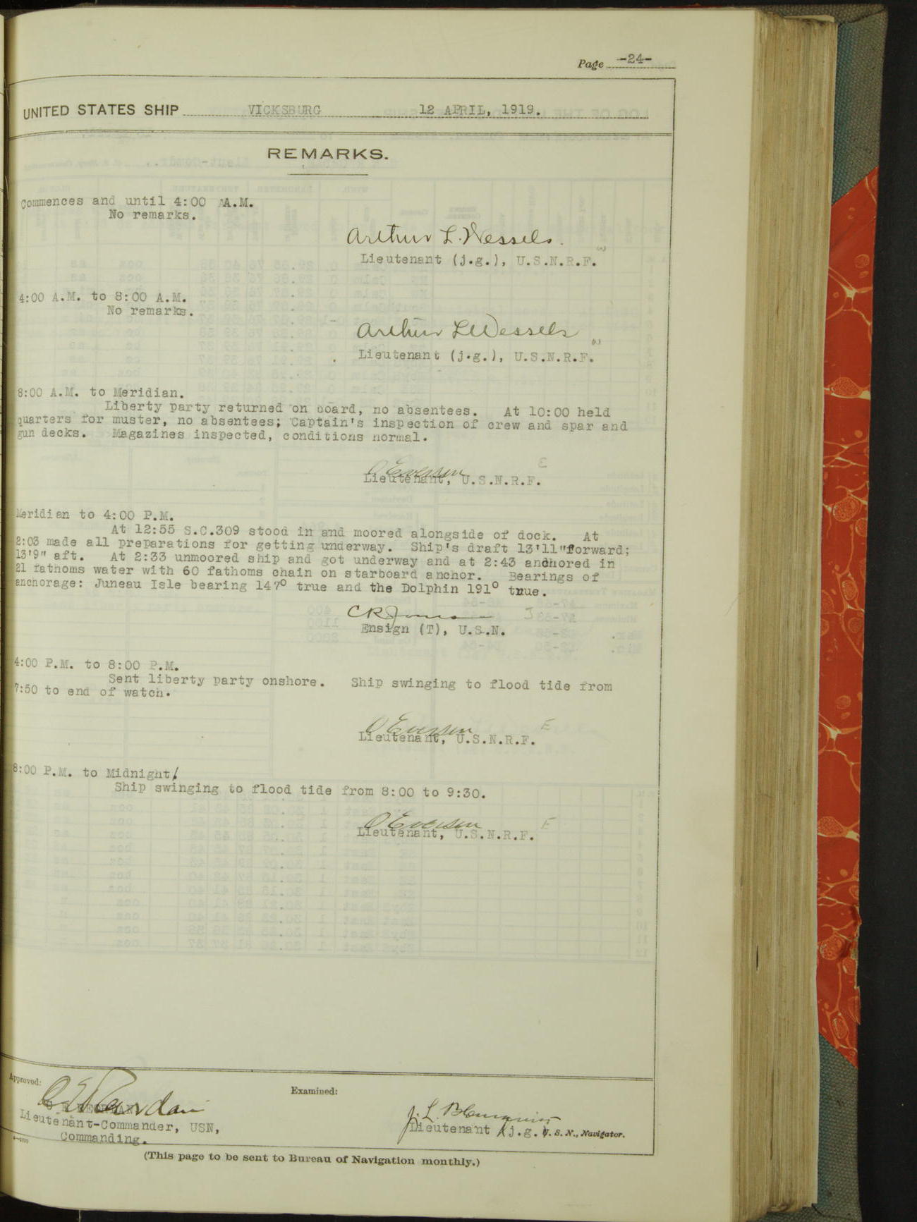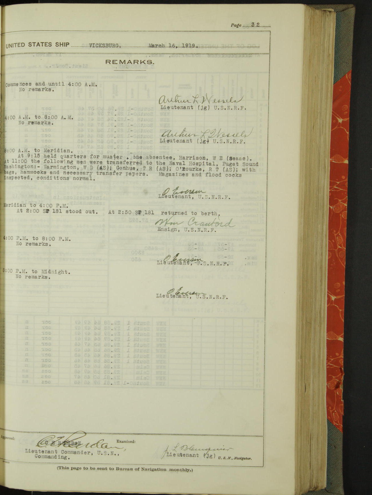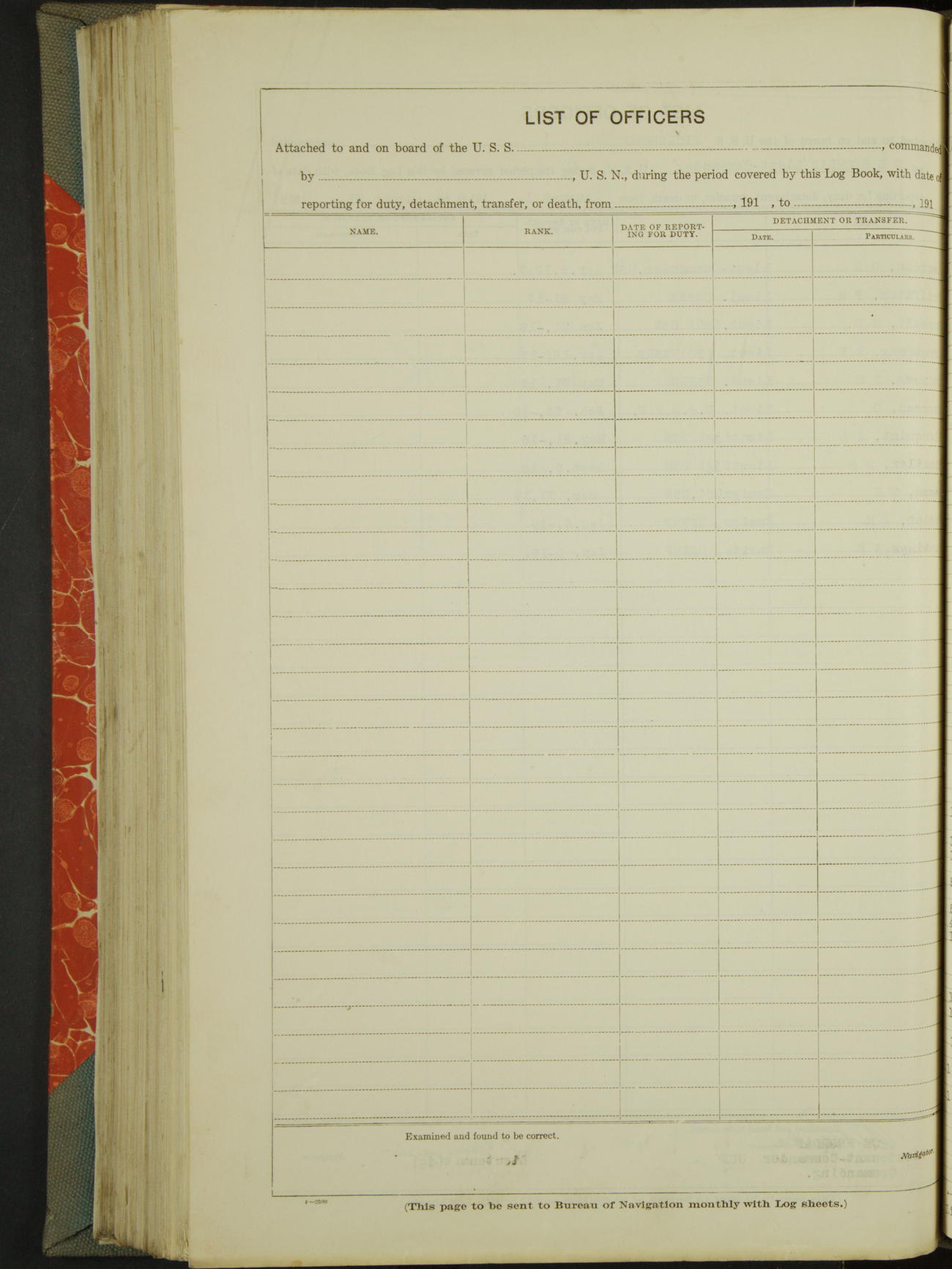 List of OfficerList of Officers attached to and on board of the USS "Vicksburg", commanded by Charles E Reordan, Lieutenant Commander, US Navy, during the period covered by this Log book with date of reporting for duty, detachment, transfer or death from ...