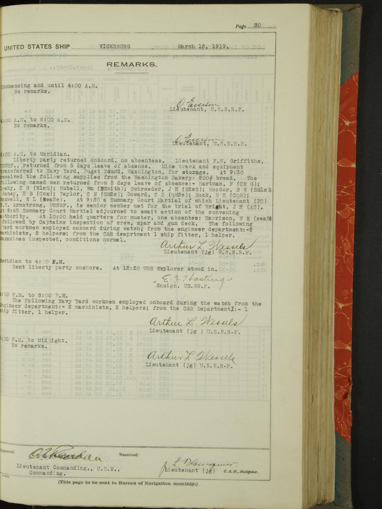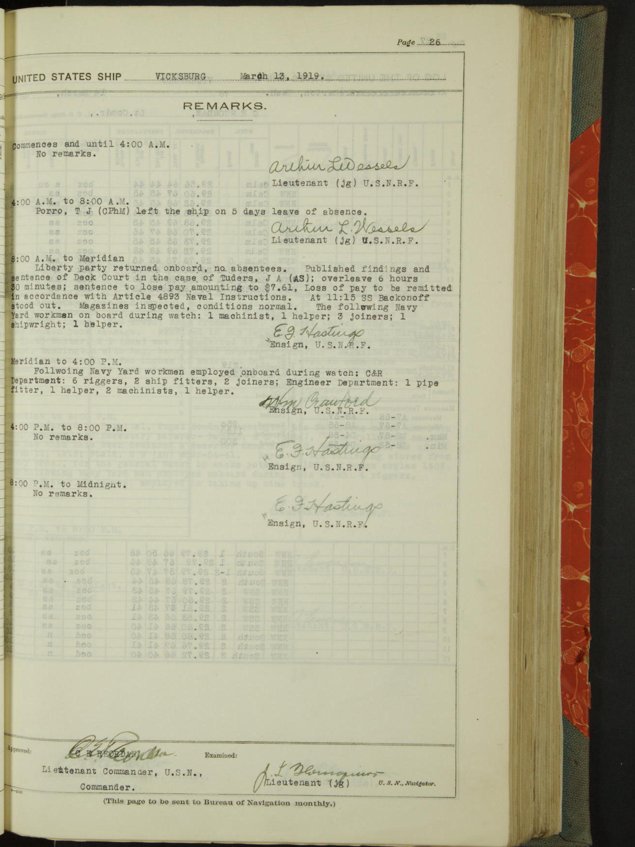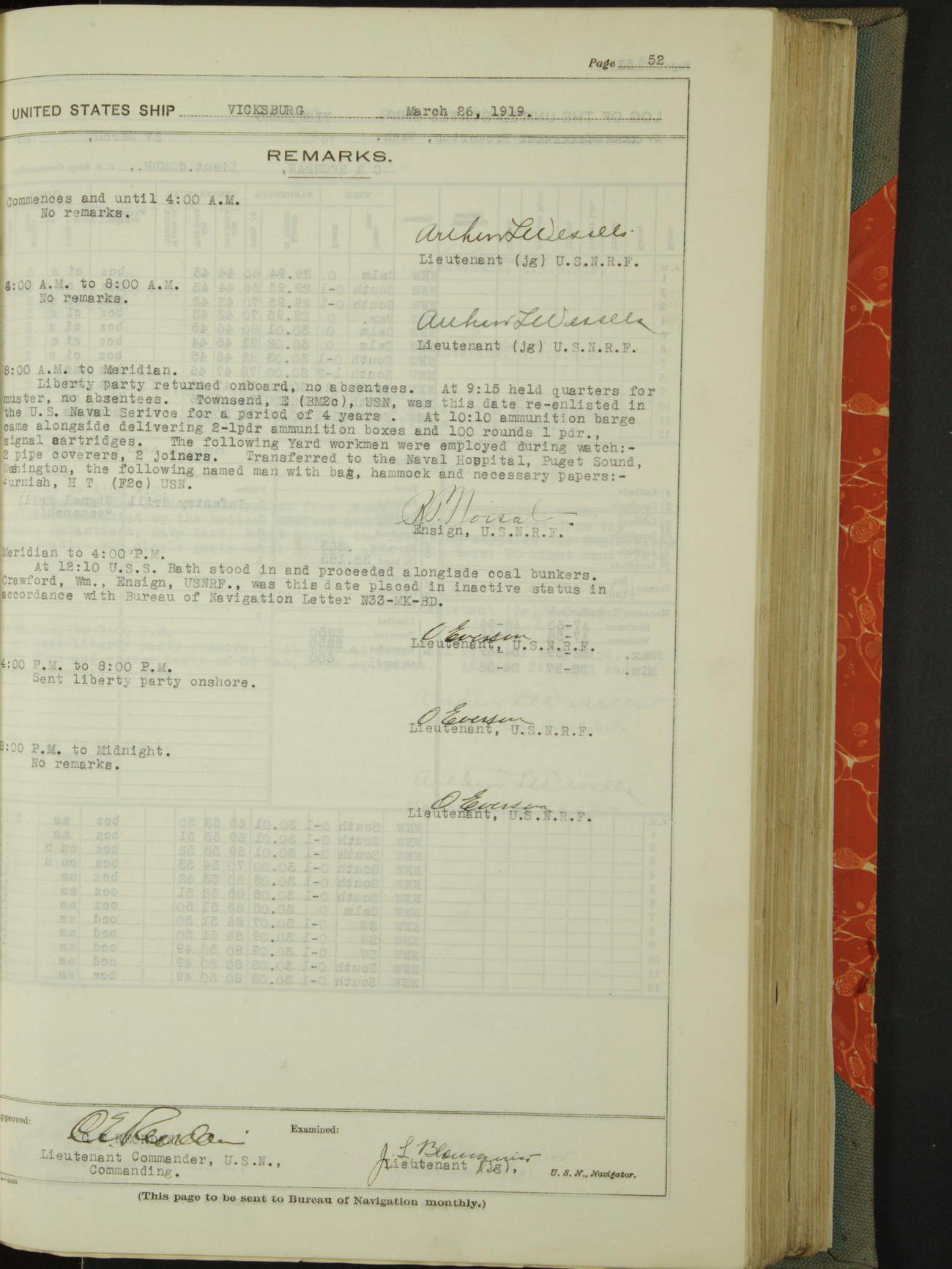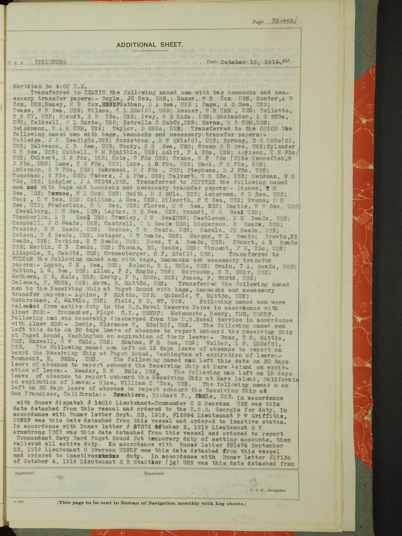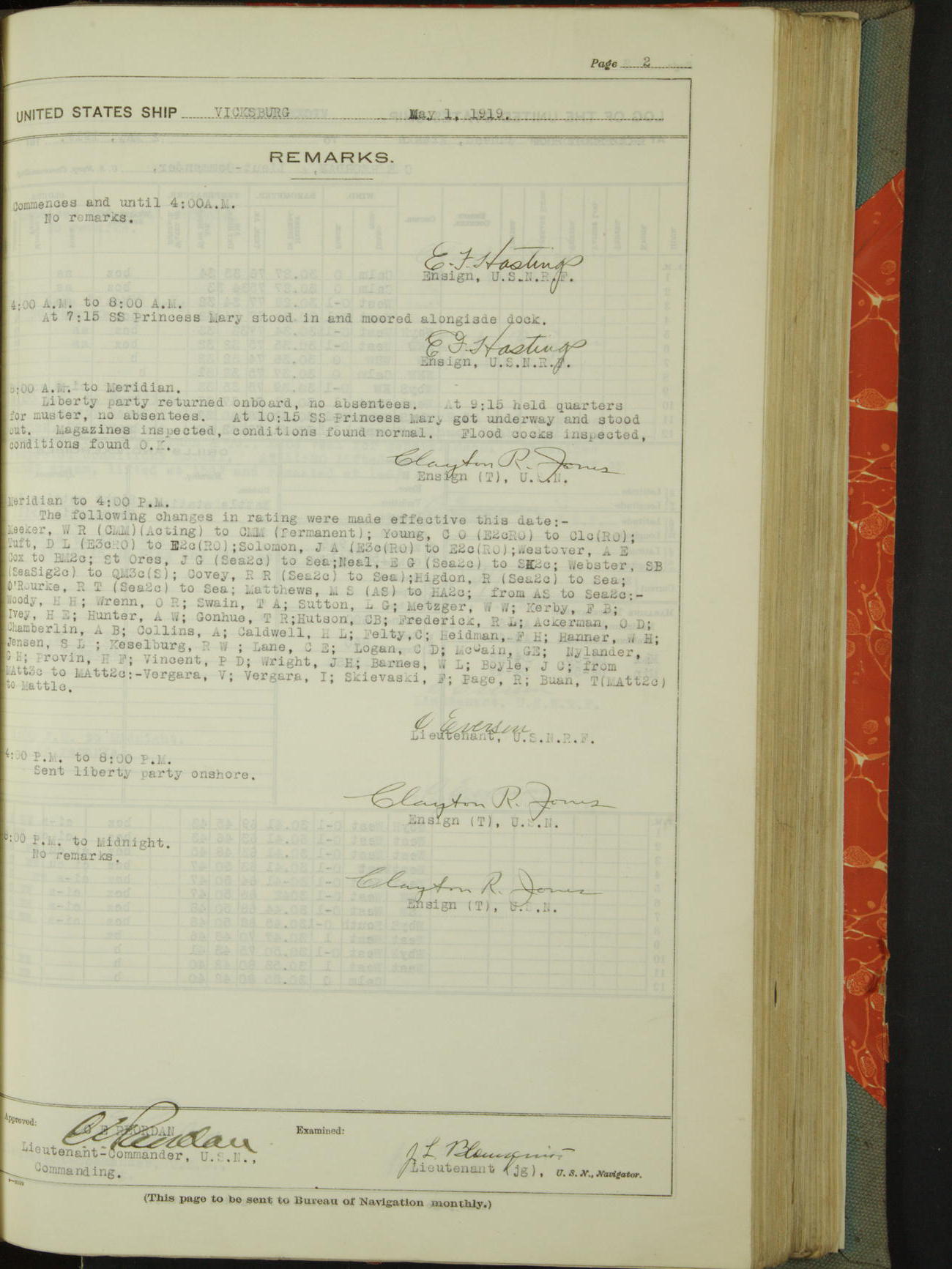 List of OfficerList of Officers attached to and on board of the USS "Vicksburg", commanded by Charles E Reordan, Lieutenant Commander, US Navy, during the period covered by this Log book with date of reporting for duty, detachment, transfer or death from ...