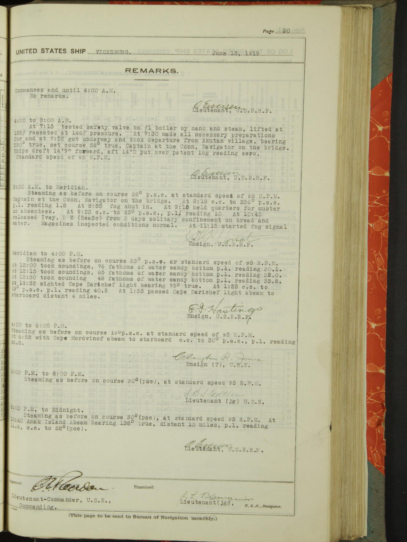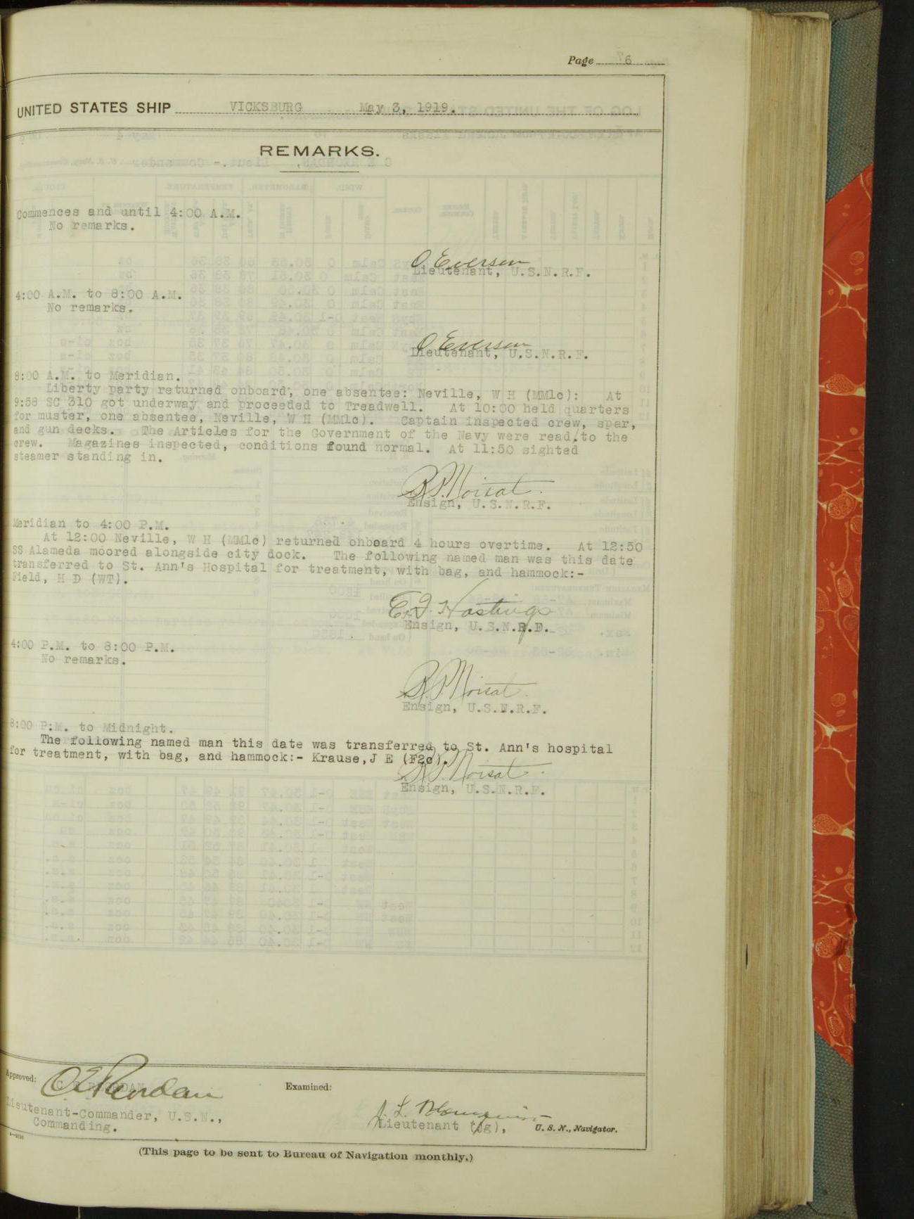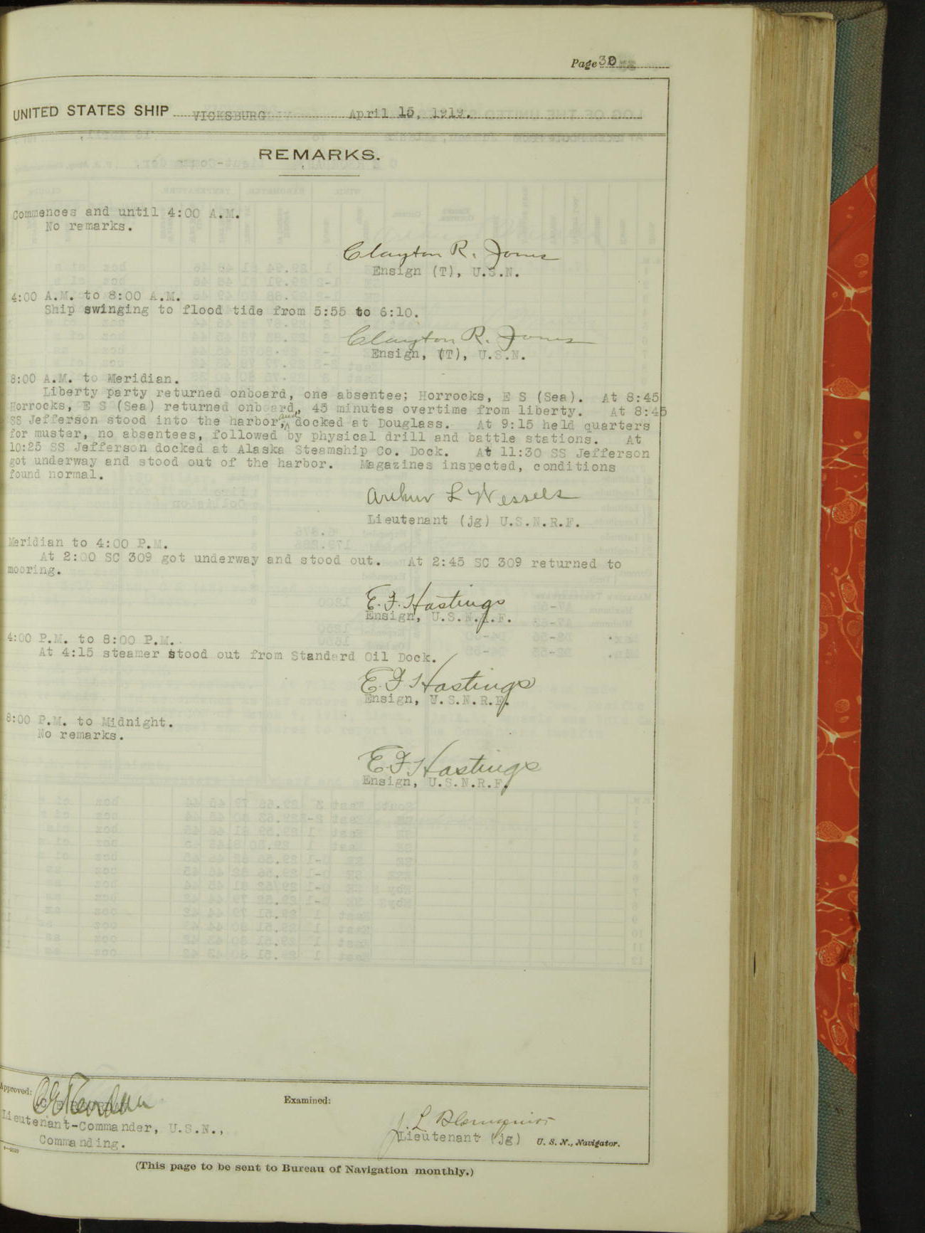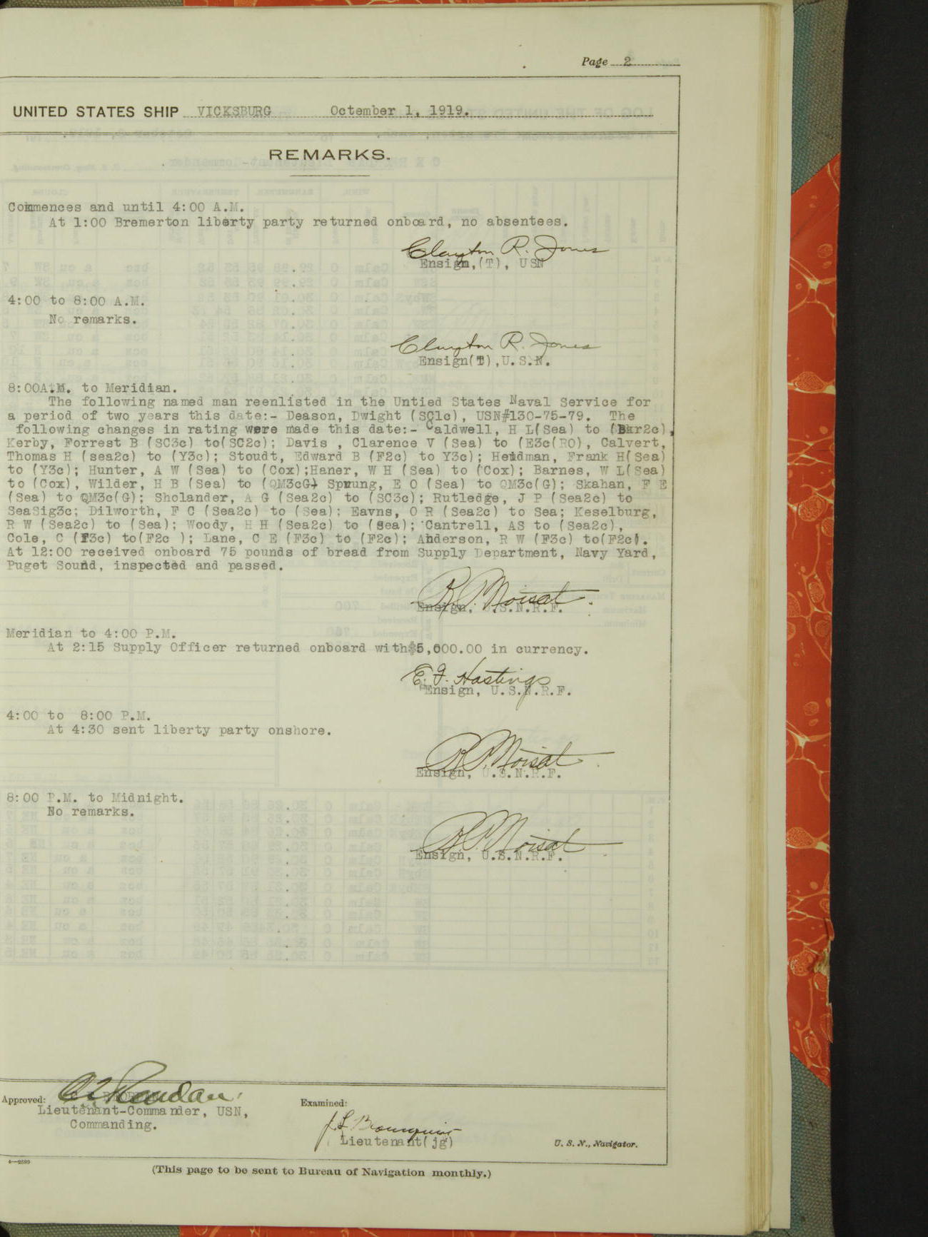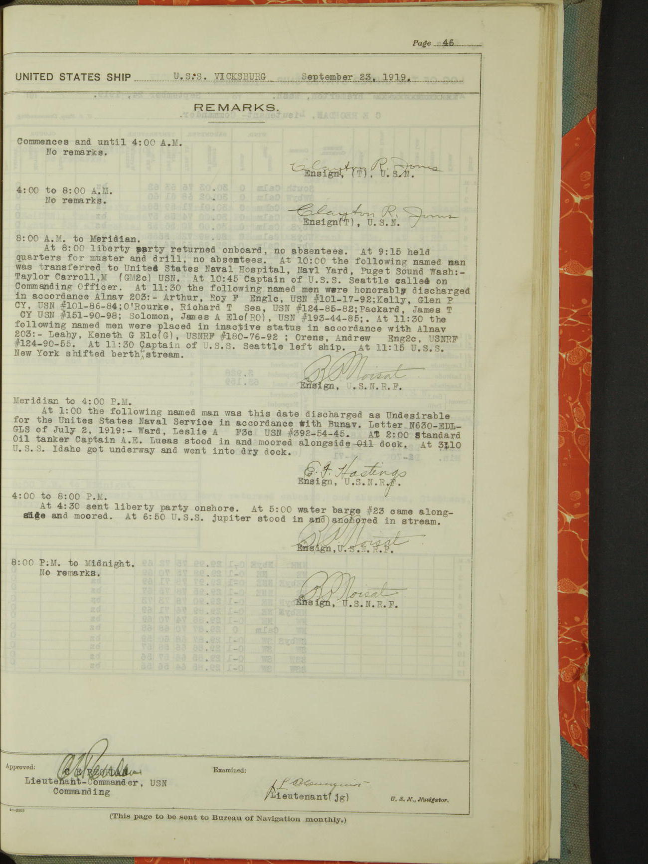 List of OfficerList of Officers attached to and on board of the USS "Vicksburg", commanded by Charles E Reordan, Lieutenant Commander, US Navy, during the period covered by this Log book with date of reporting for duty, detachment, transfer or death from ...