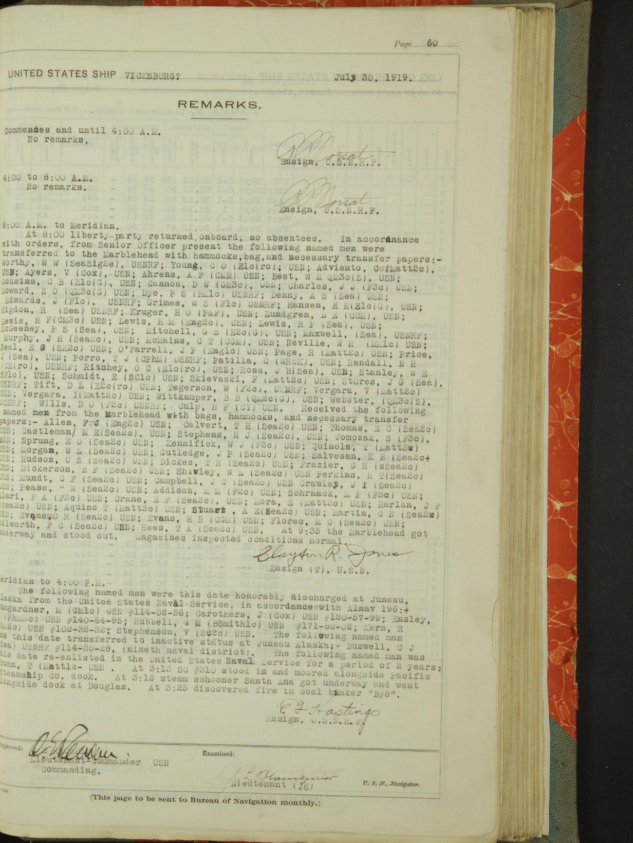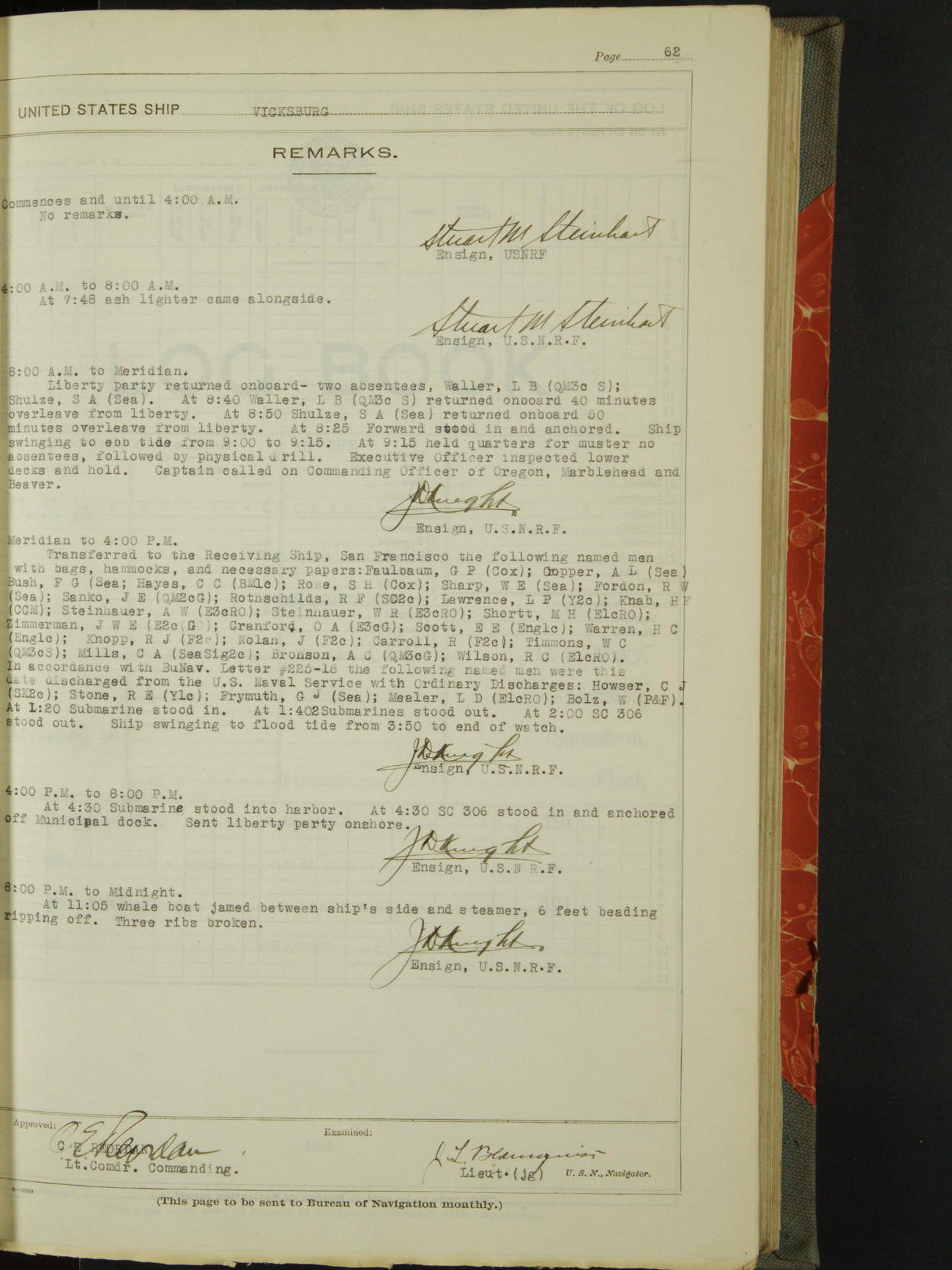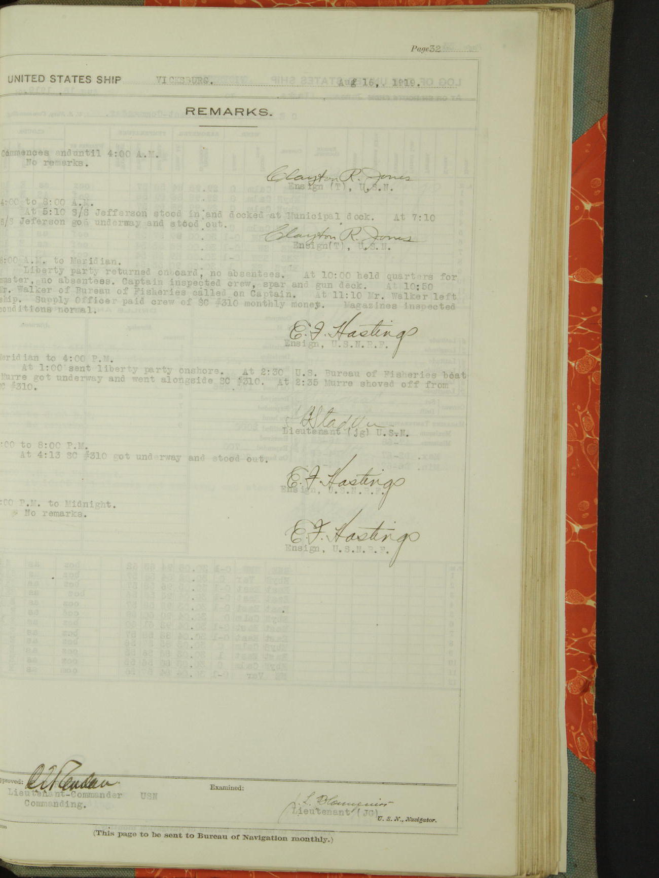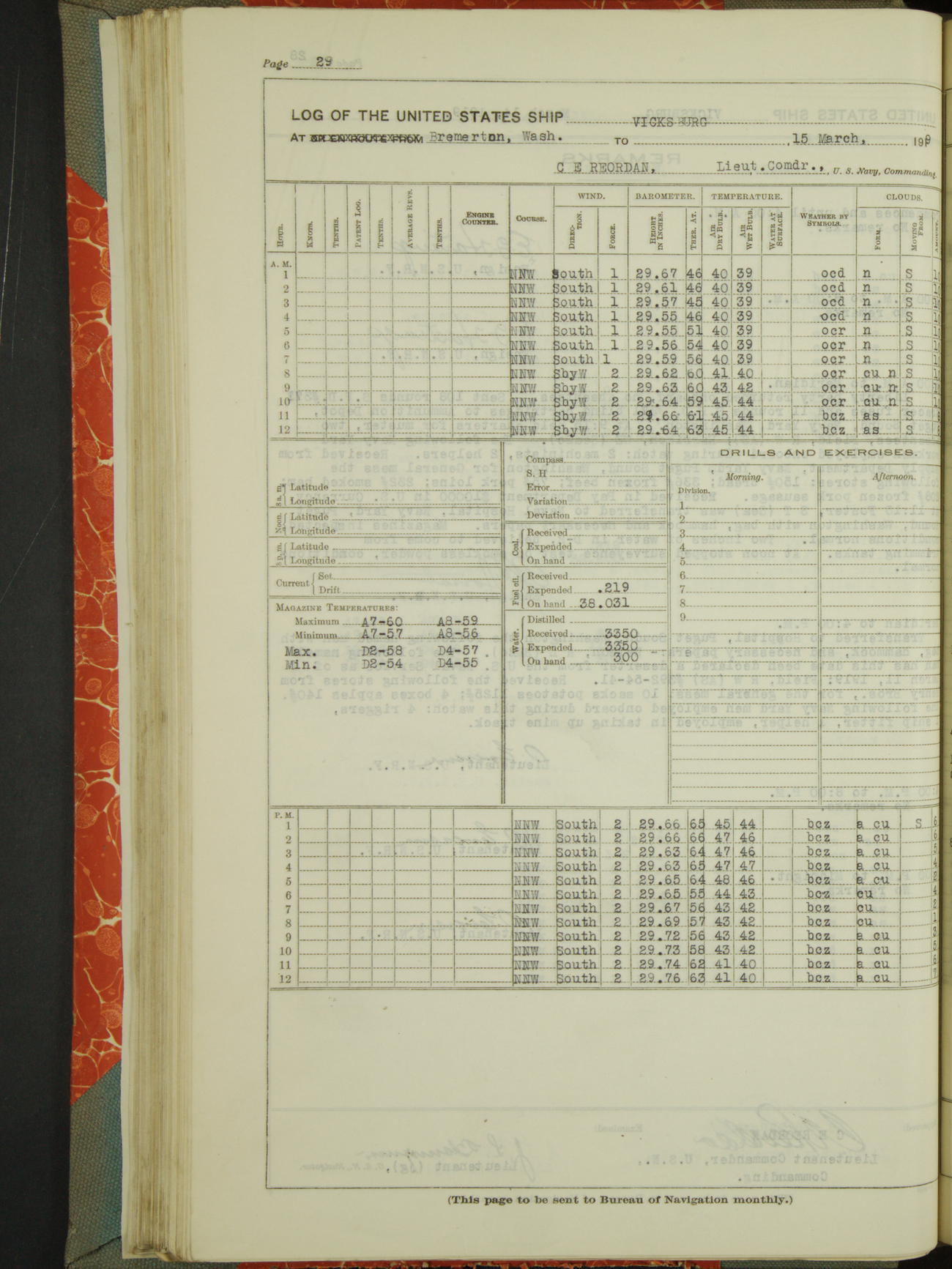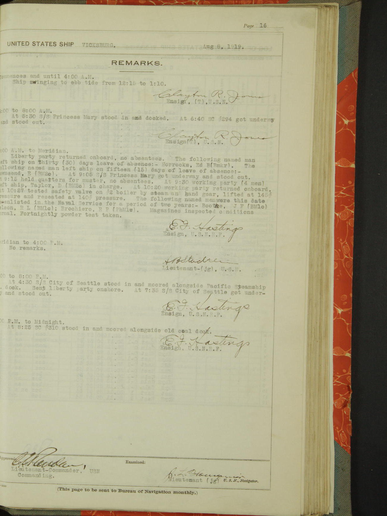 List of OfficerList of Officers attached to and on board of the USS "Vicksburg", commanded by Charles E Reordan, Lieutenant Commander, US Navy, during the period covered by this Log book with date of reporting for duty, detachment, transfer or death from ...