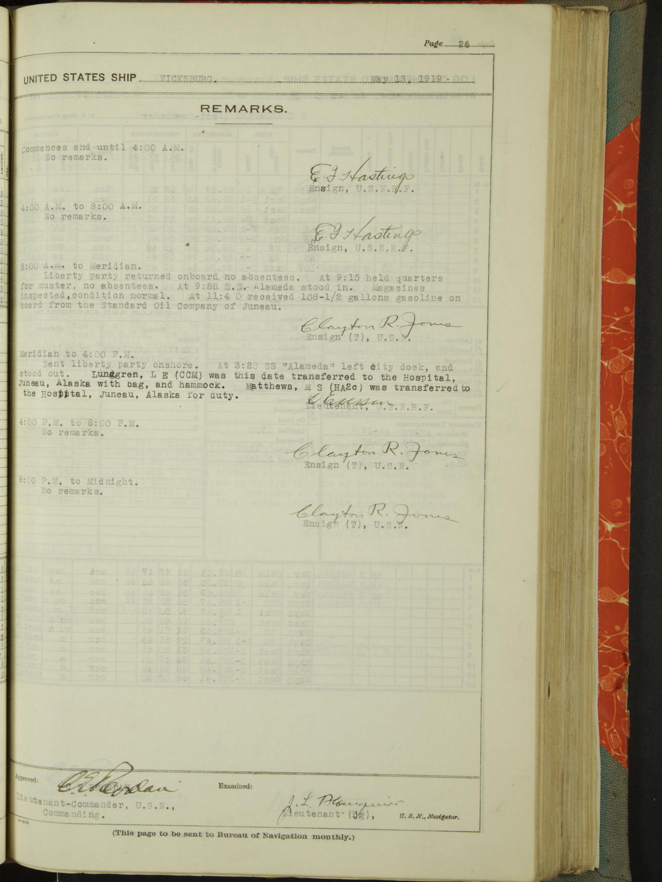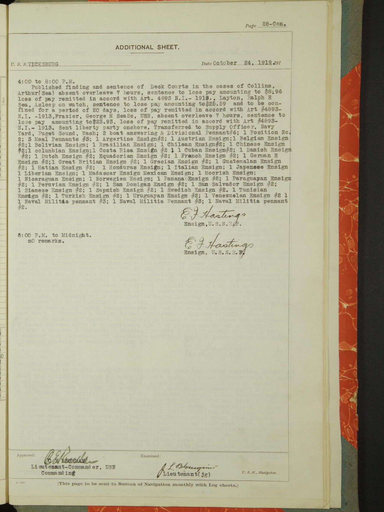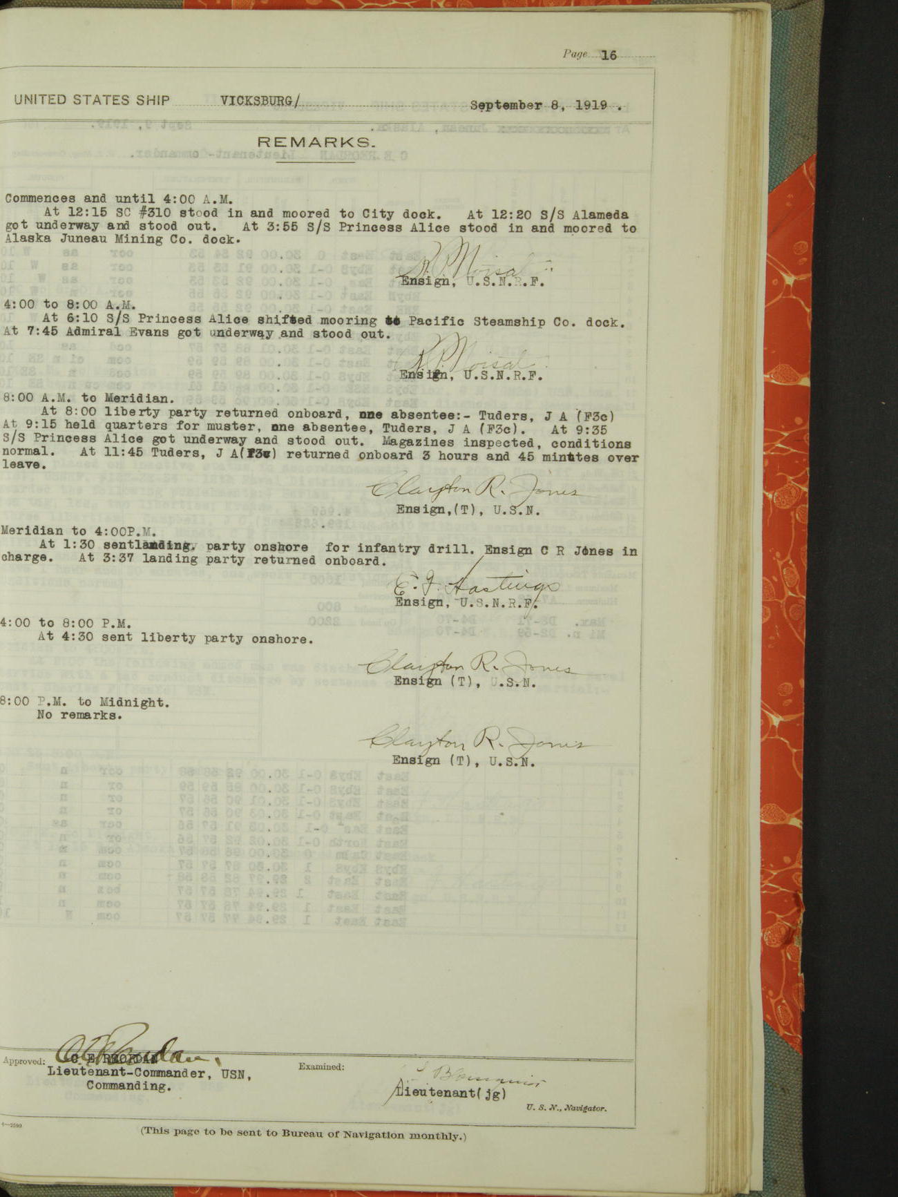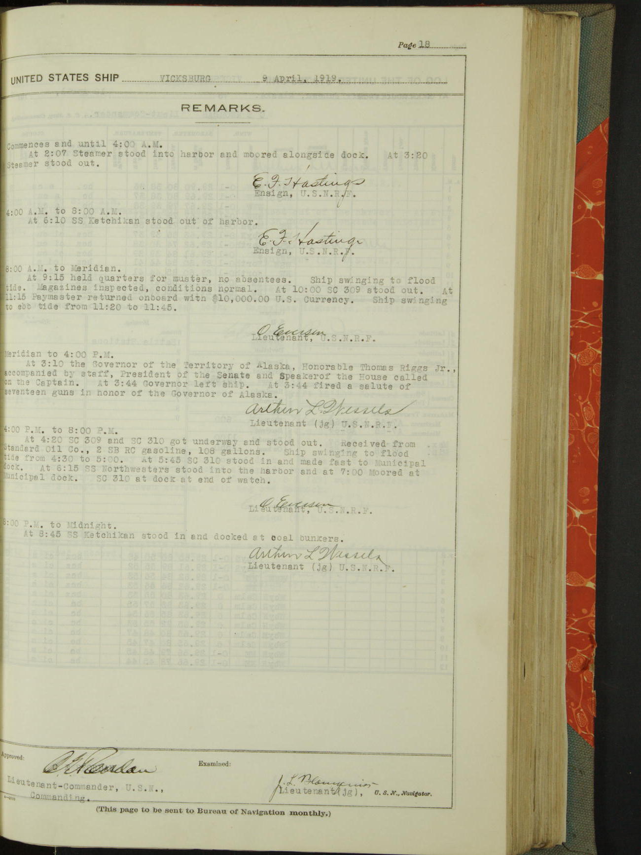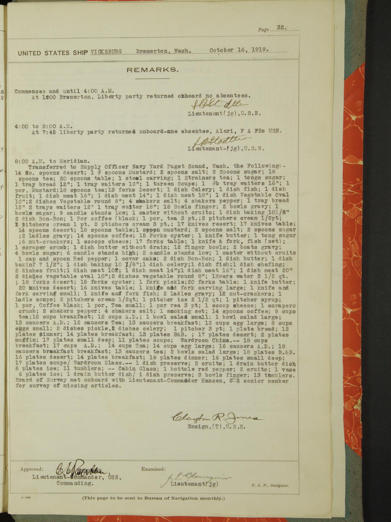 List of OfficerList of Officers attached to and on board of the USS "Vicksburg", commanded by Charles E Reordan, Lieutenant Commander, US Navy, during the period covered by this Log book with date of reporting for duty, detachment, transfer or death from ...