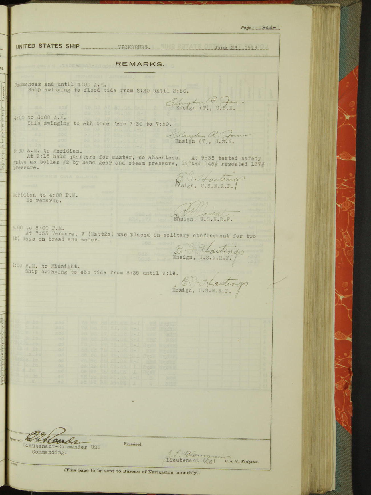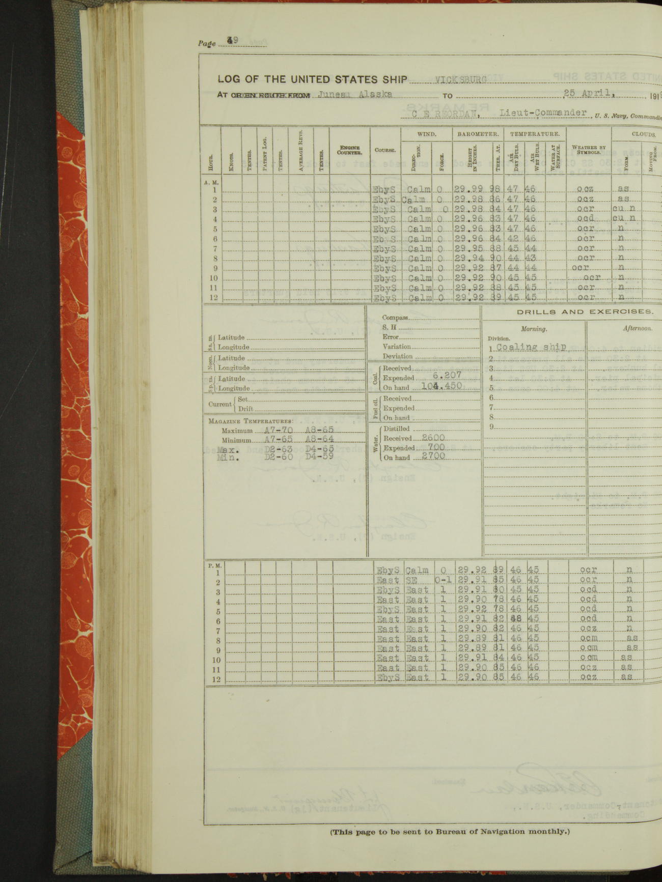50874ec109d409075501bf6b: (http://oldweather.s3.amazonaws.com/ow3/final/USS Vicksburg/vol04of04_cr2_to_jpg/vol04of04_001_1.jpg)