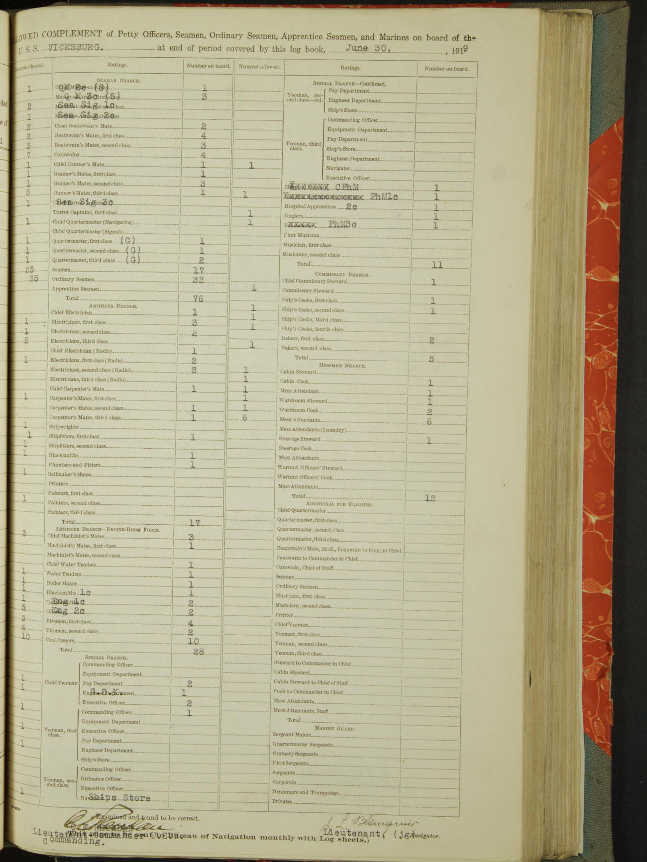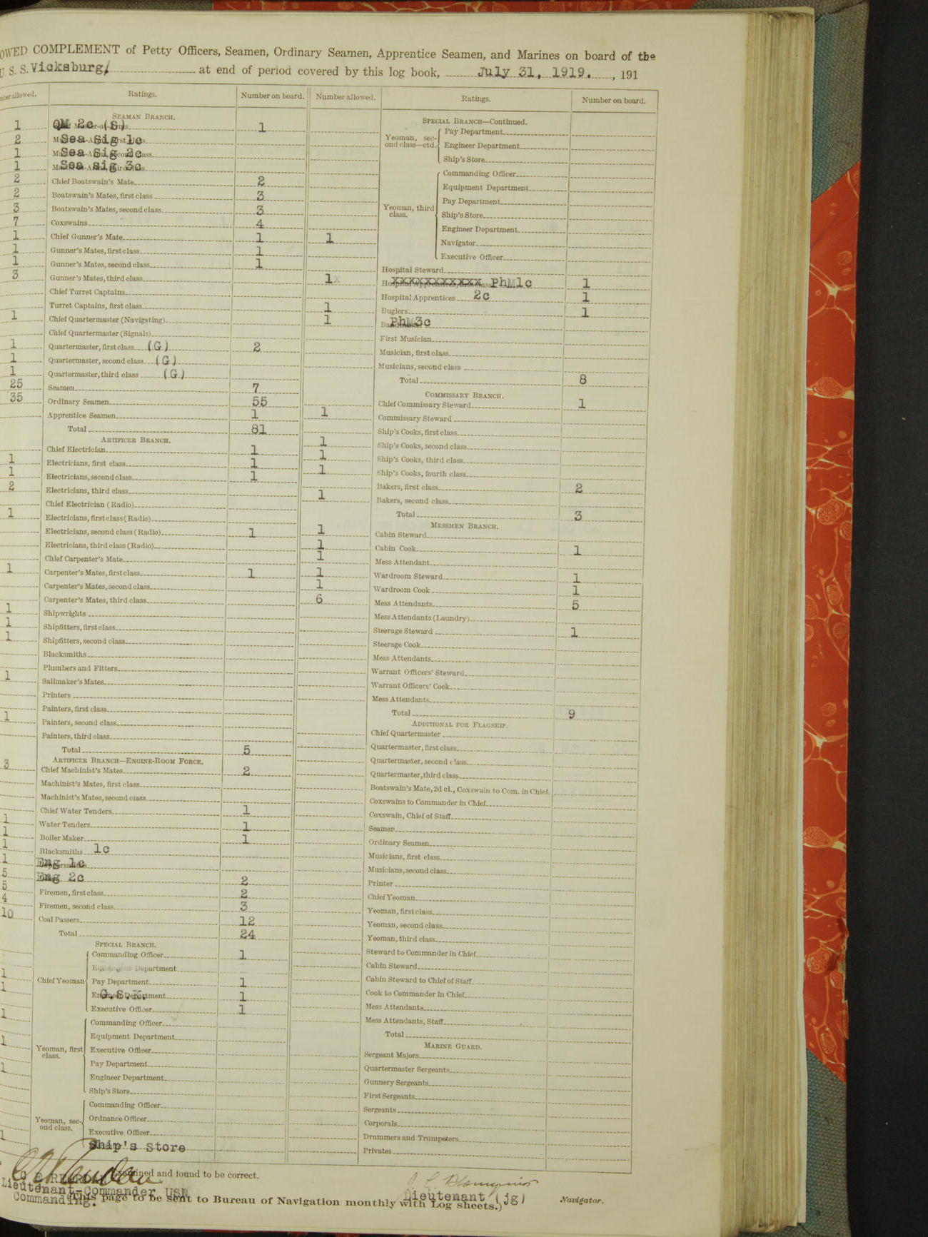 Allowed Complement of Petty Officers, Seamen, Ordinary Seamen, Apprentice Seamen, and Marines on board of the USS "Vicksburg" at the end of the period covered by this log book, October 16th, 1919