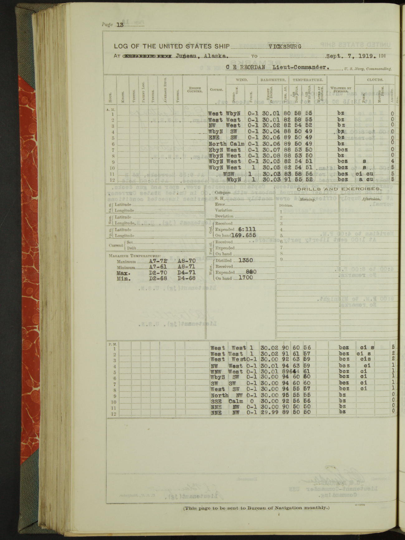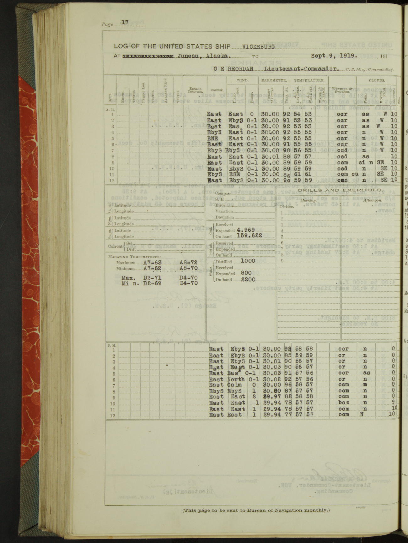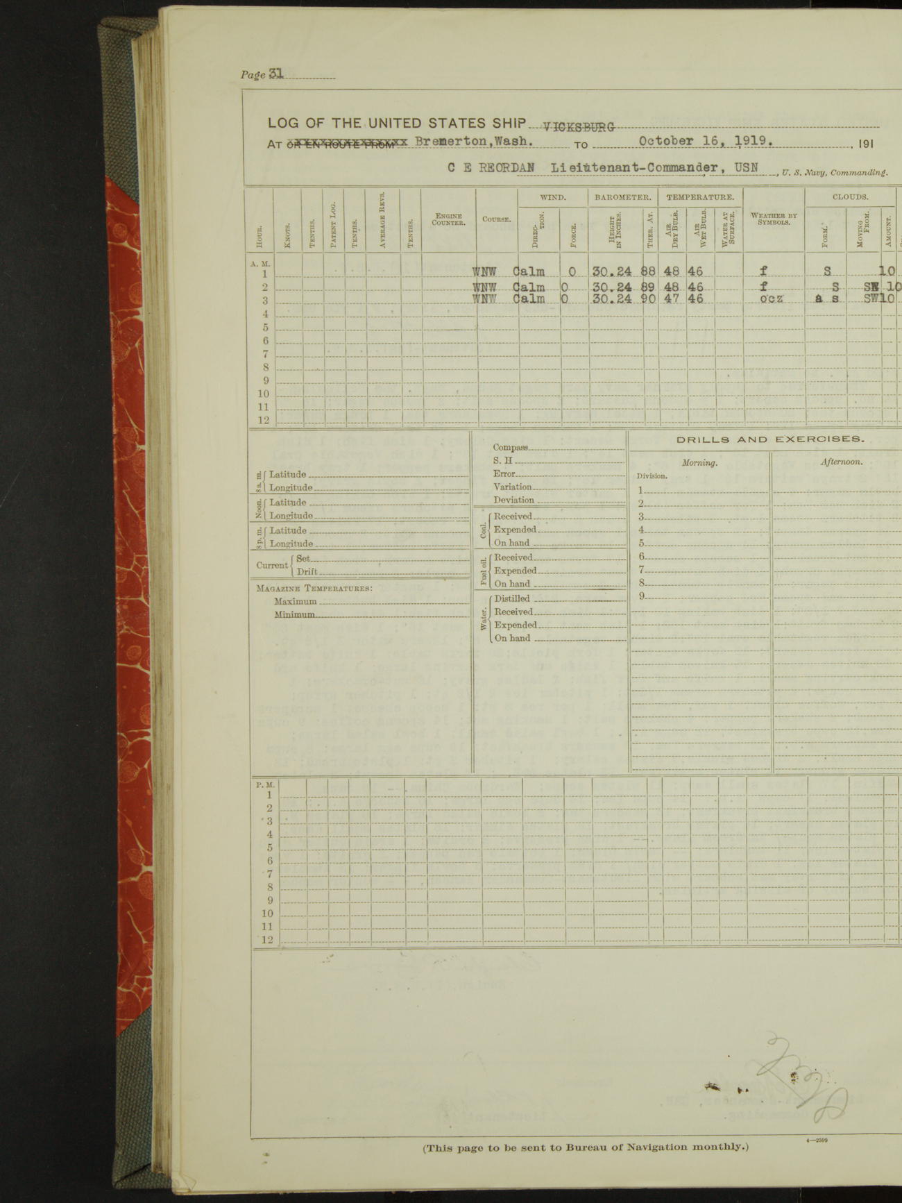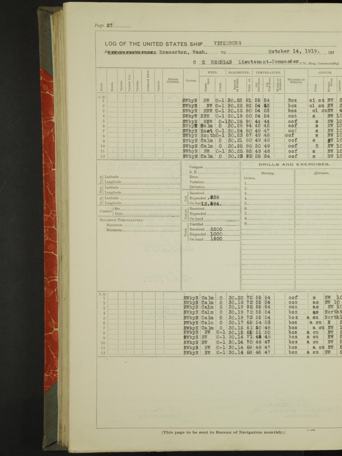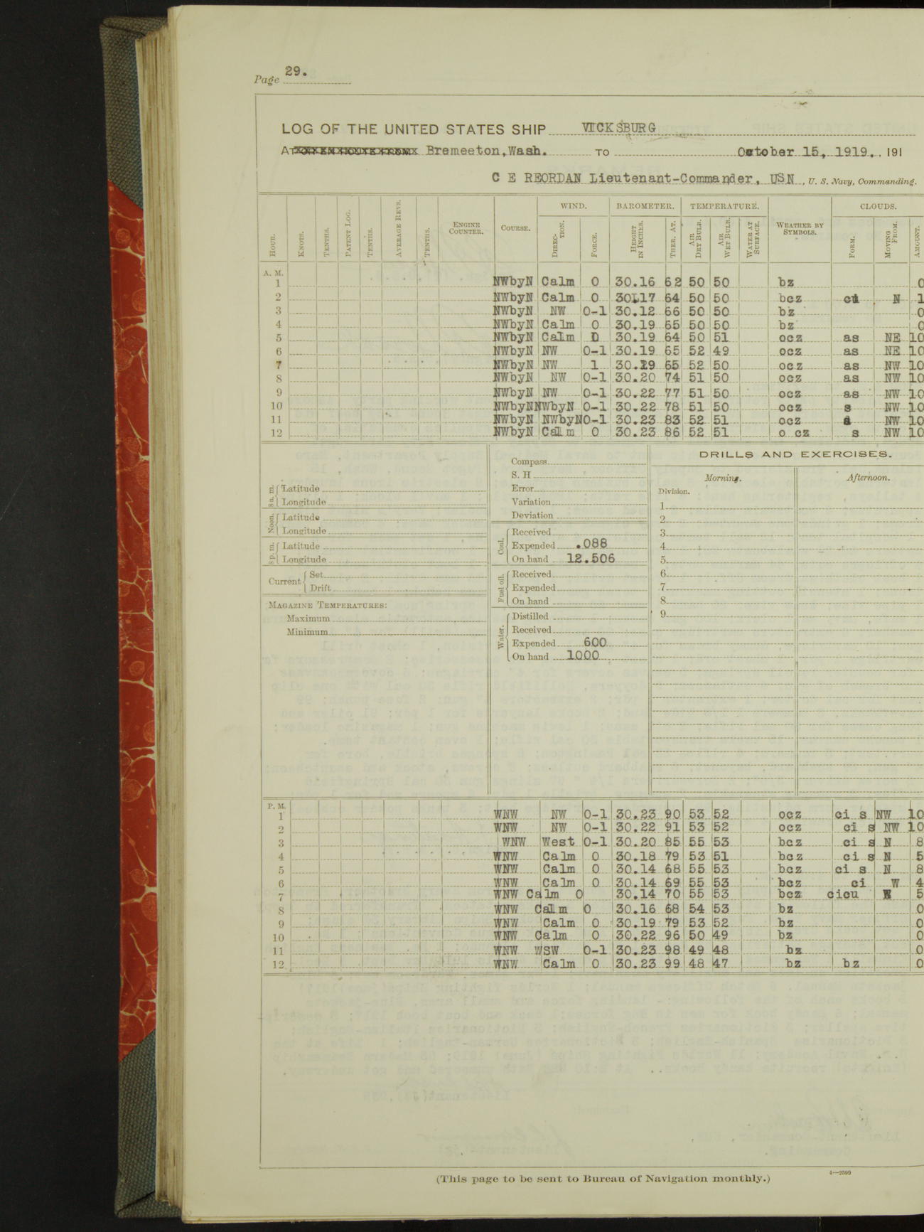 LogLog book of the USS "Vicksburg", 3rd rate, commanded by Charled E Reordan, Lieutenant-Commander, US Navy, Attached to Second division, Pacific Fleet Commencing October 1st, 1919, at 1.0am, and ending October 16th, 1919, at Midnight