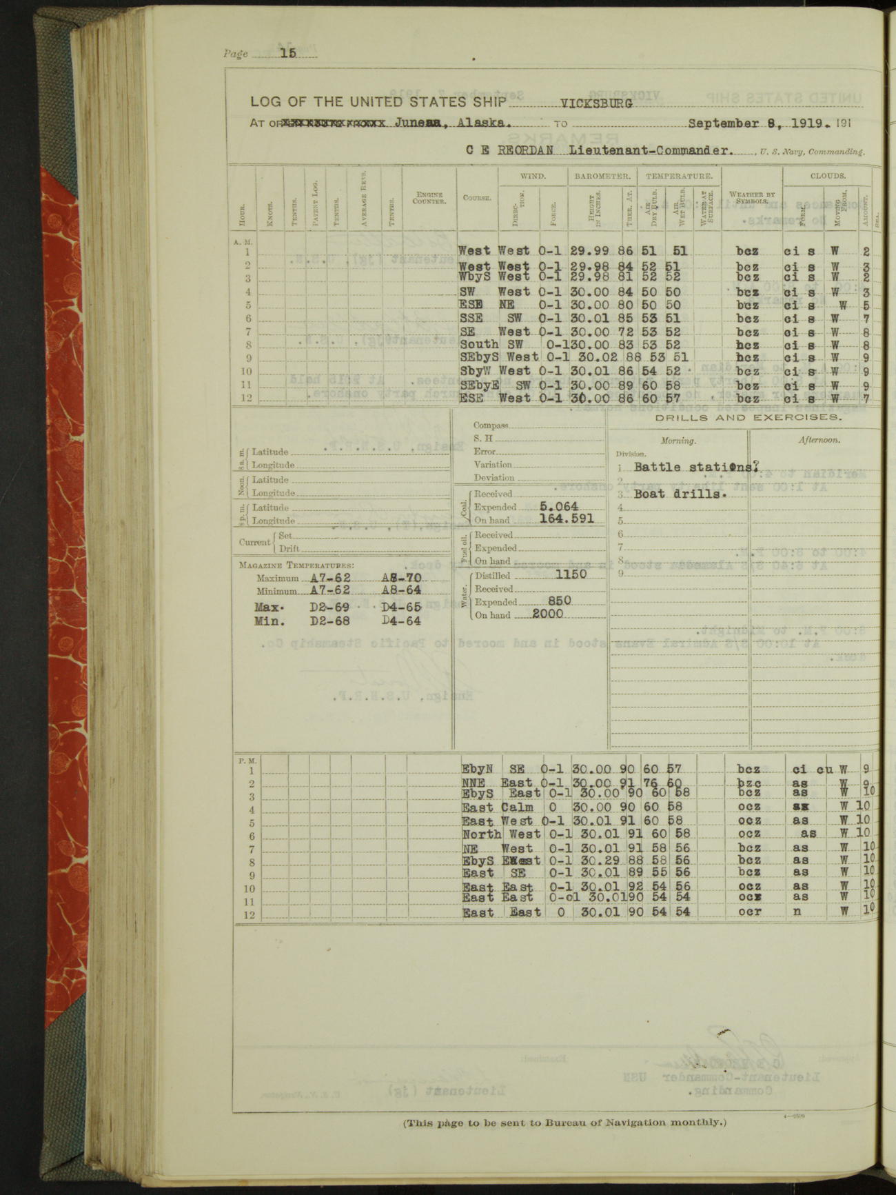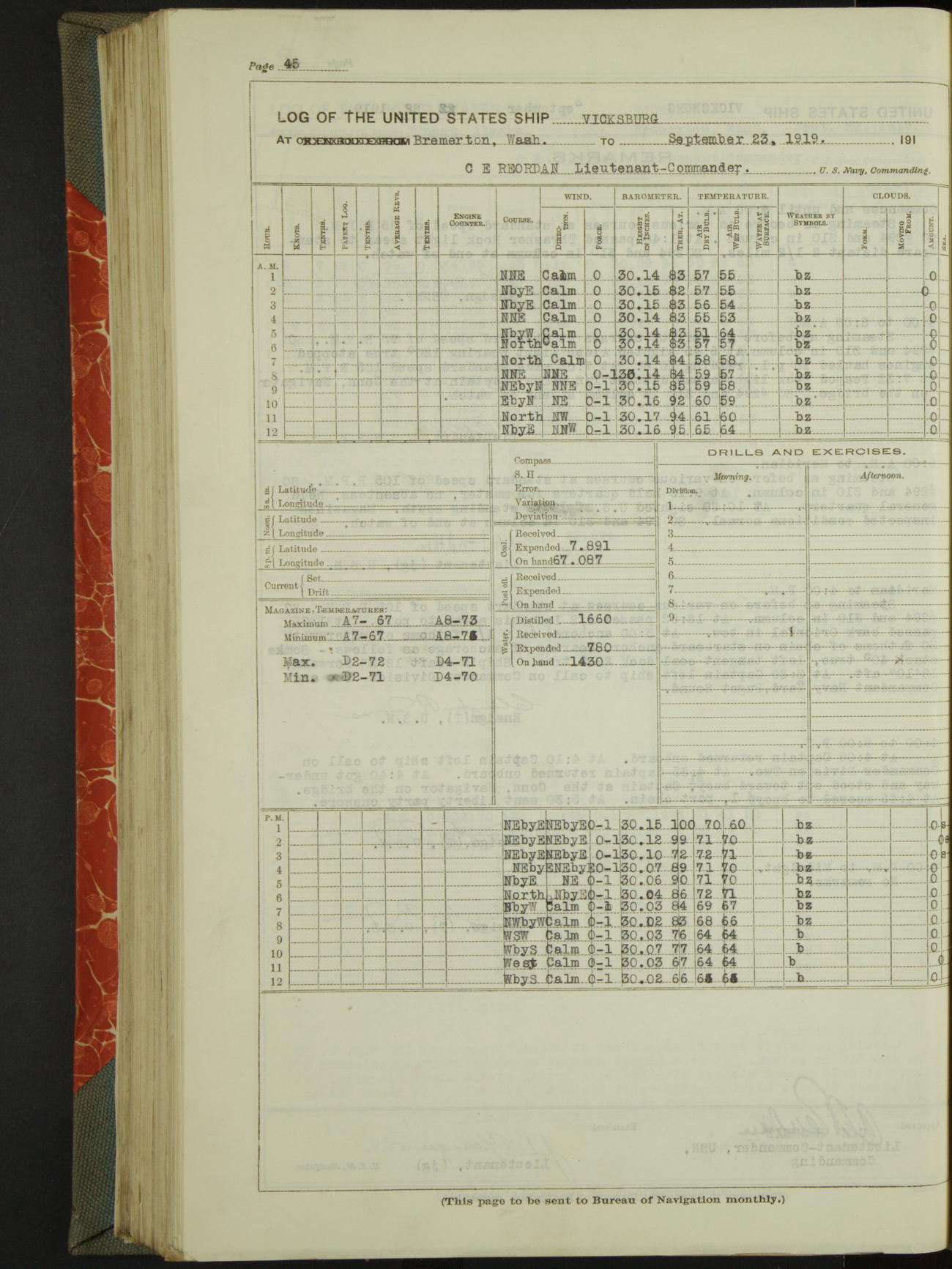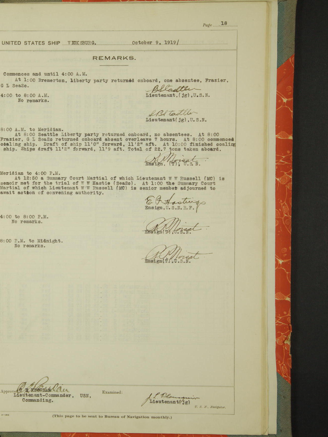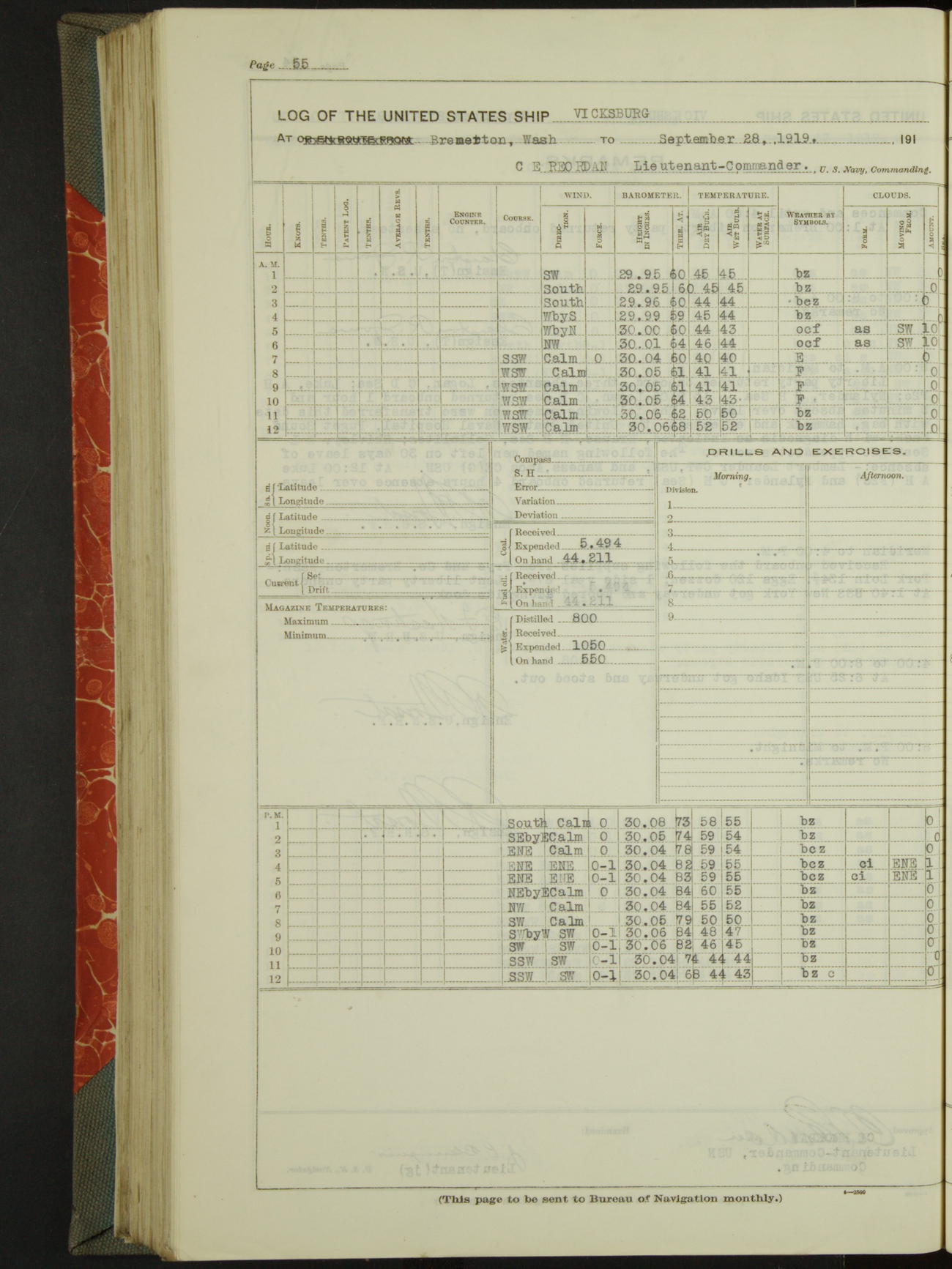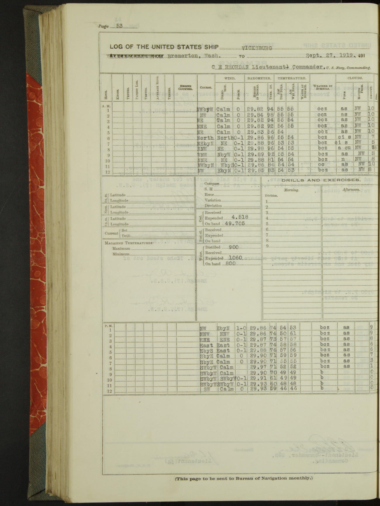LogLog book of the USS "Vicksburg", 3rd rate, commanded by Charled E Reordan, Lieutenant-Commander, US Navy, Attached to Second division, Pacific Fleet Commencing October 1st, 1919, at 1.0am, and ending October 16th, 1919, at Midnight