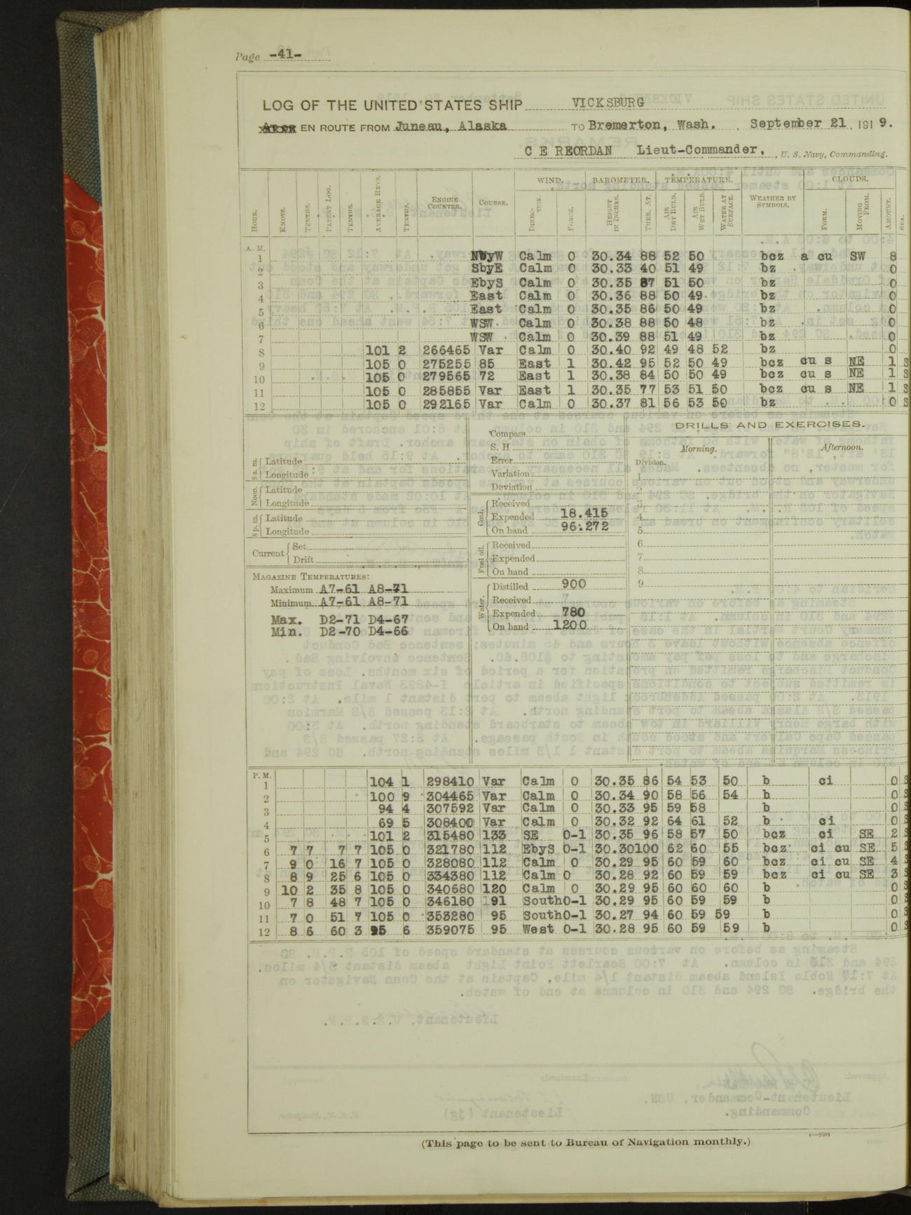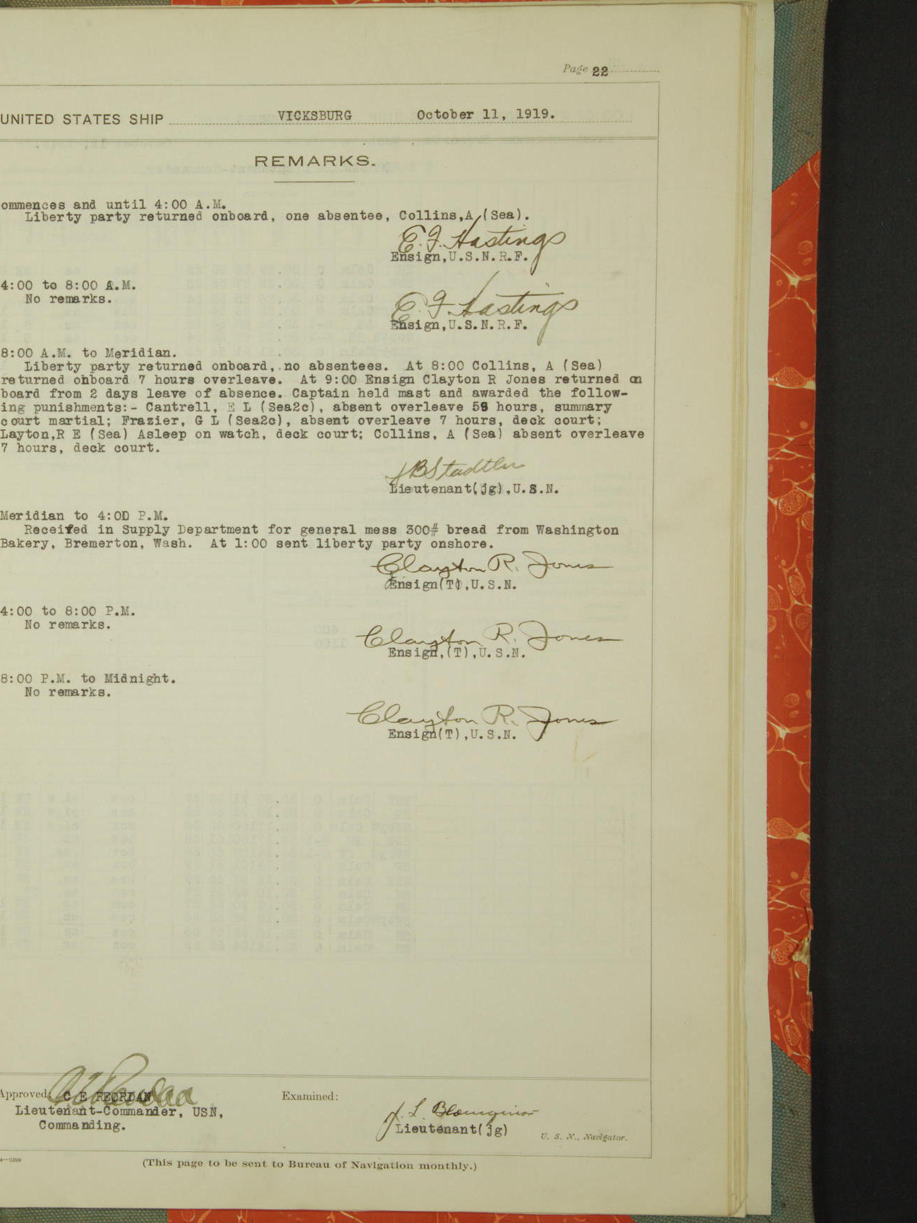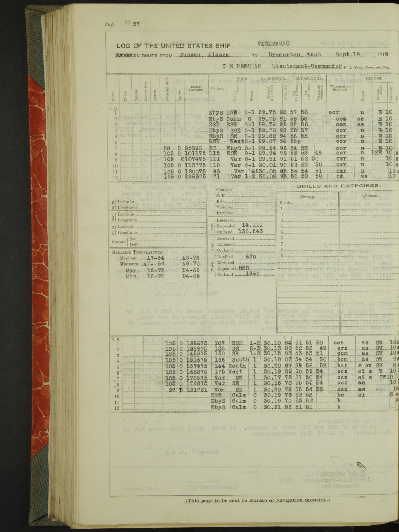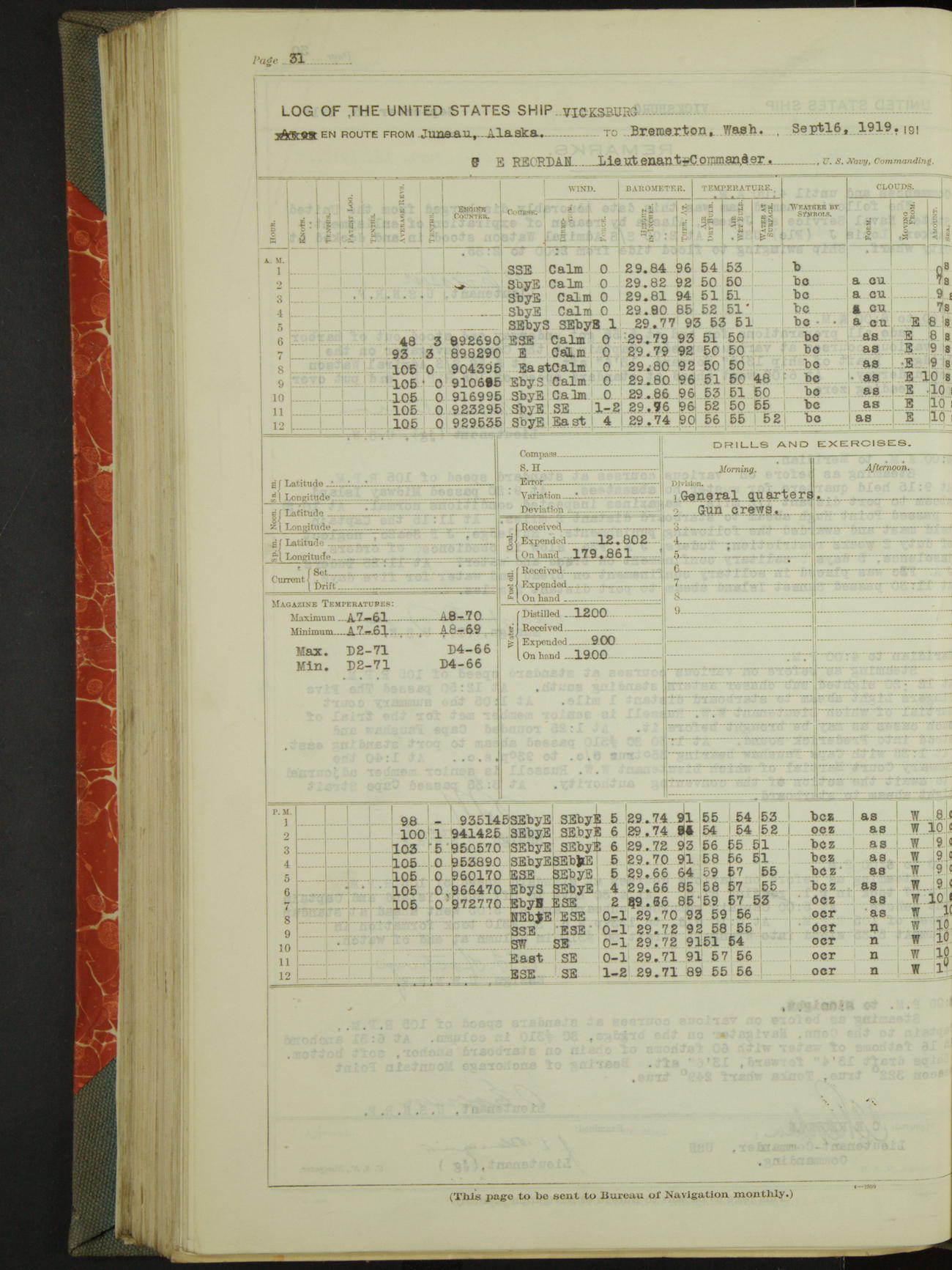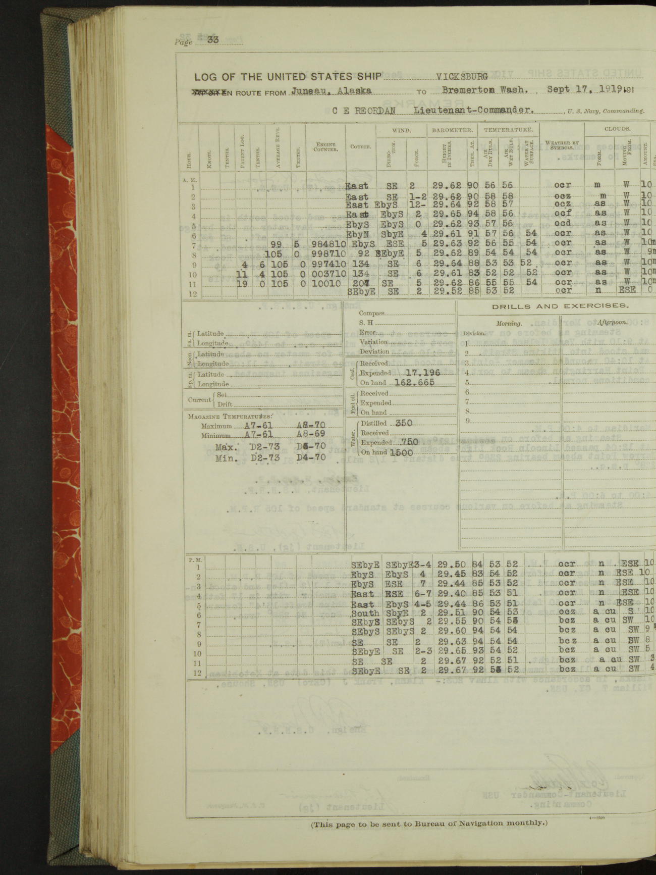 LogLog book of the USS "Vicksburg", 3rd rate, commanded by Charled E Reordan, Lieutenant-Commander, US Navy, Attached to Second division, Pacific Fleet Commencing October 1st, 1919, at 1.0am, and ending October 16th, 1919, at Midnight