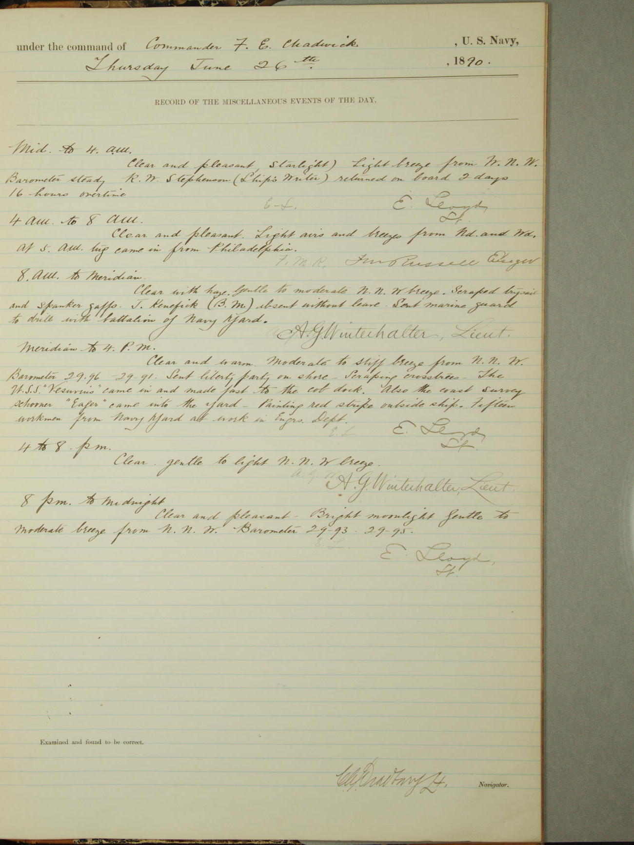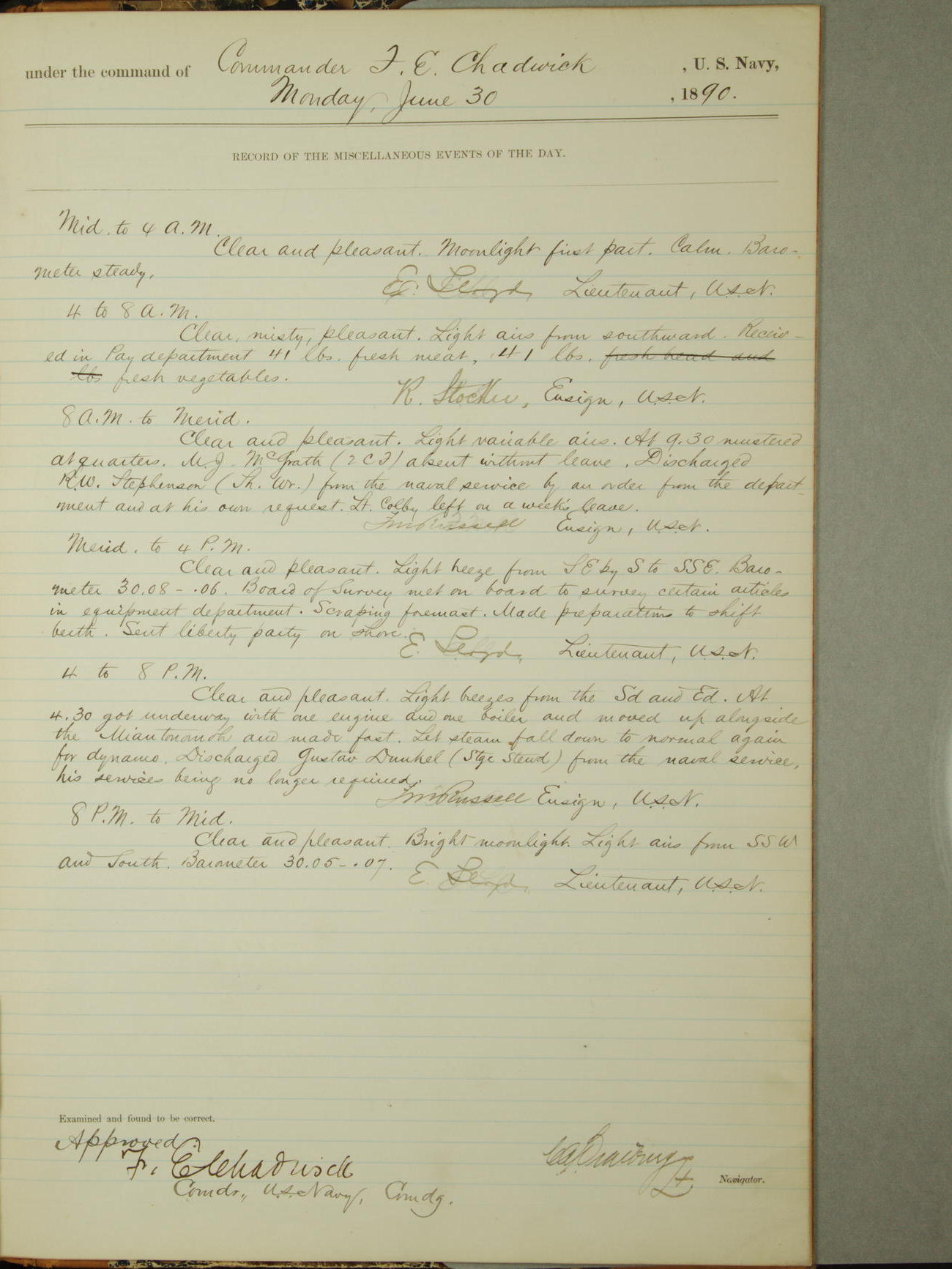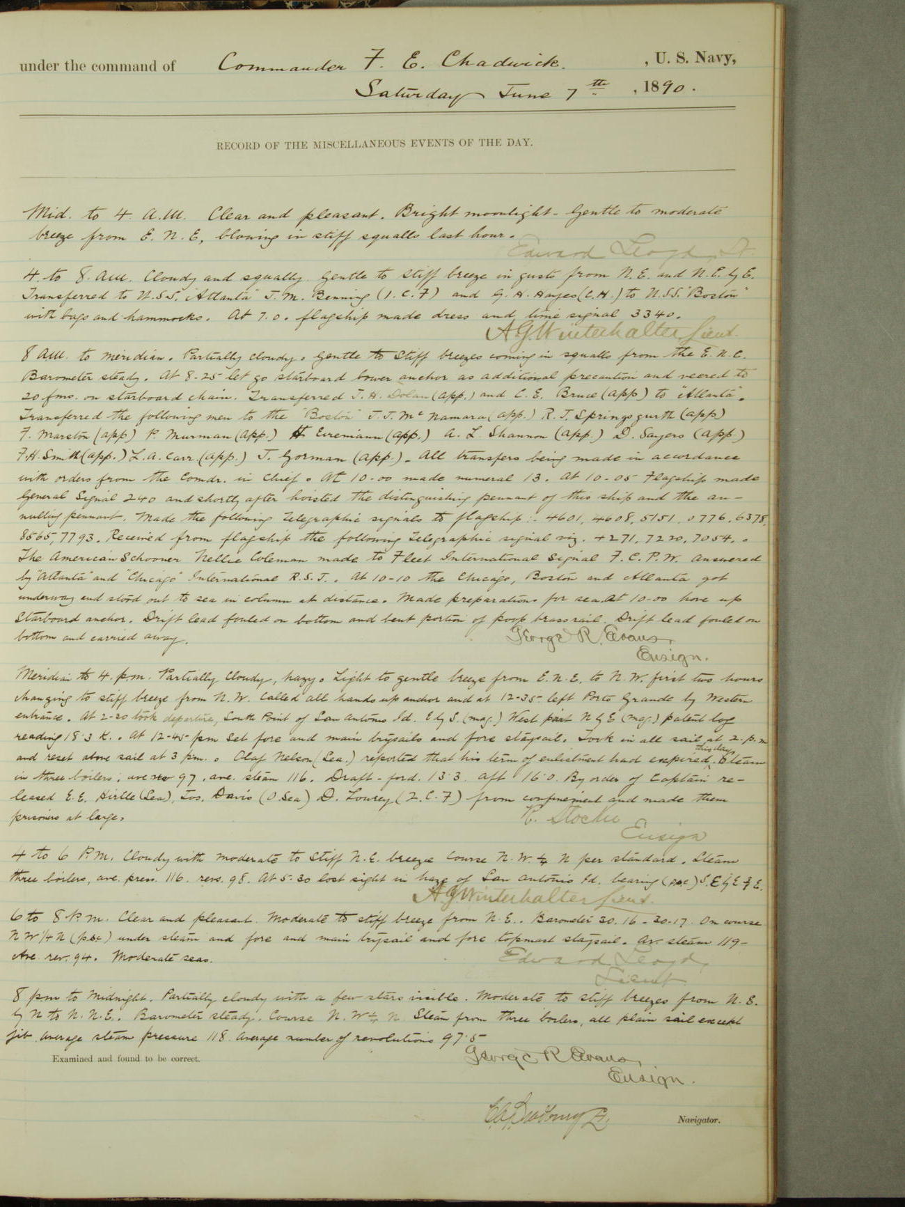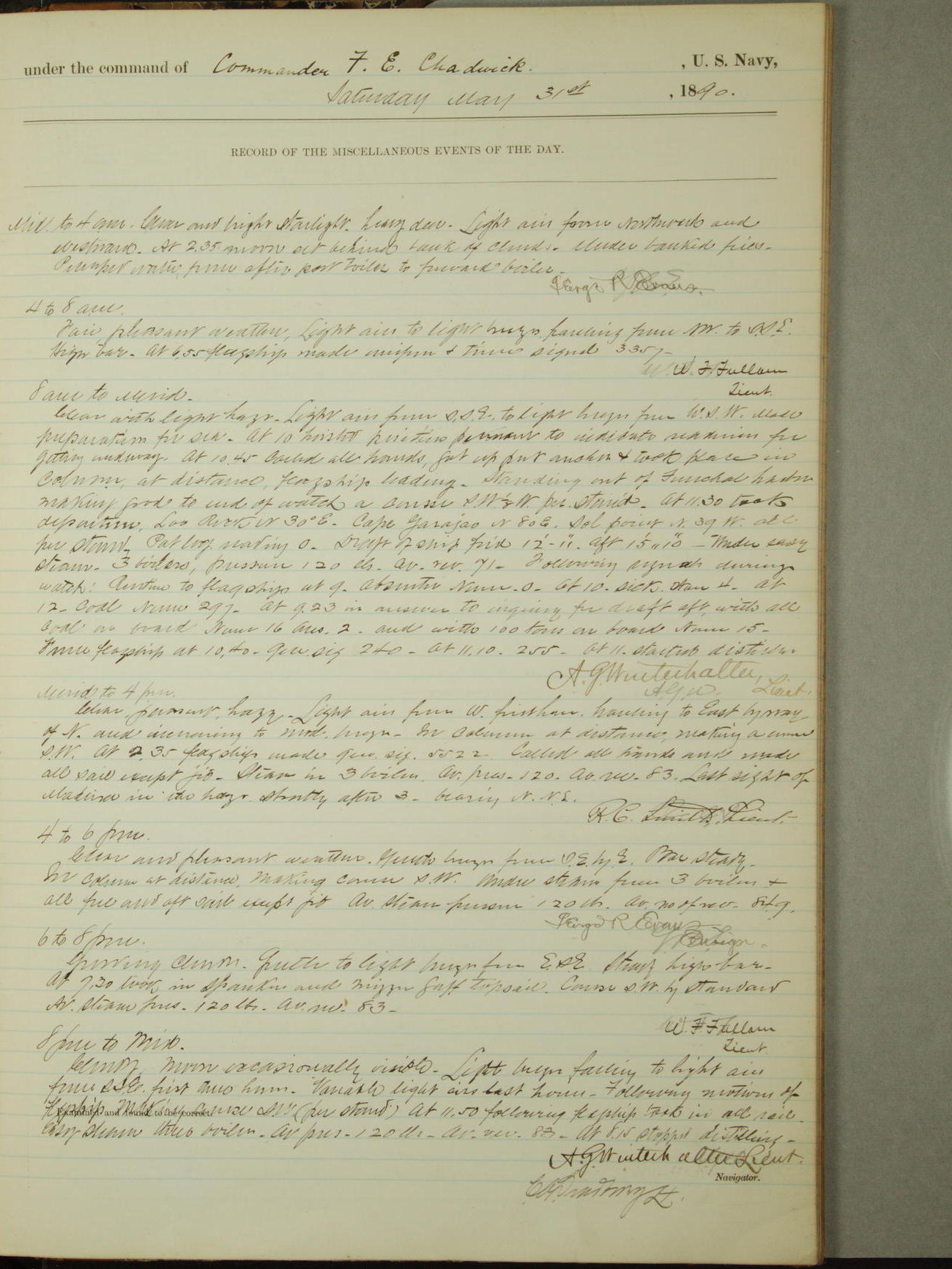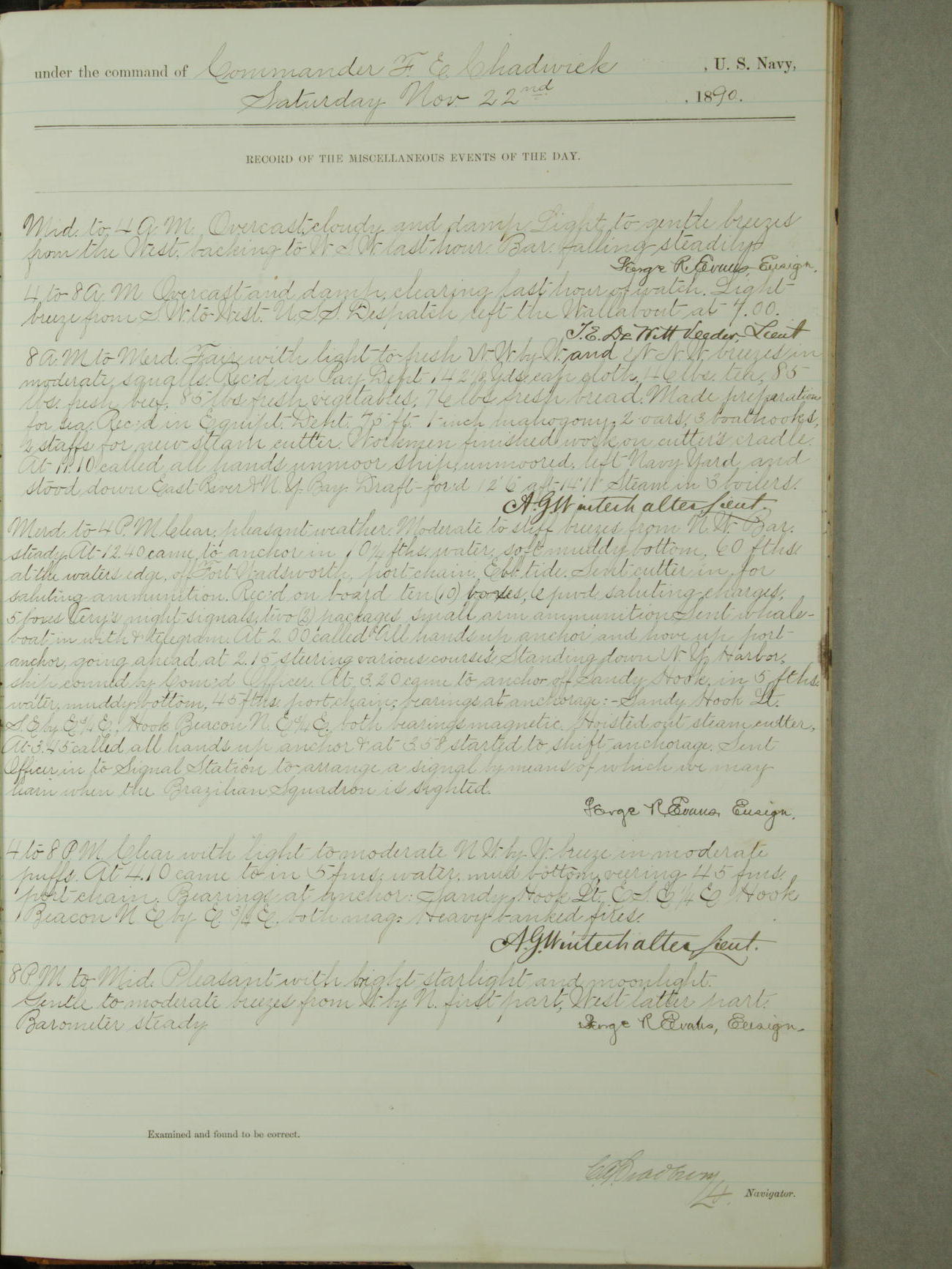 Attached to and on board of the U.S. Steamer "Yorktown", 3rd Rate, commanded by Commander F.E. Chadwick, U.S. Navy, at the time of leaving anchorage at Navy Yard League Island, Pennsylvania the 25th day of April, 1889.