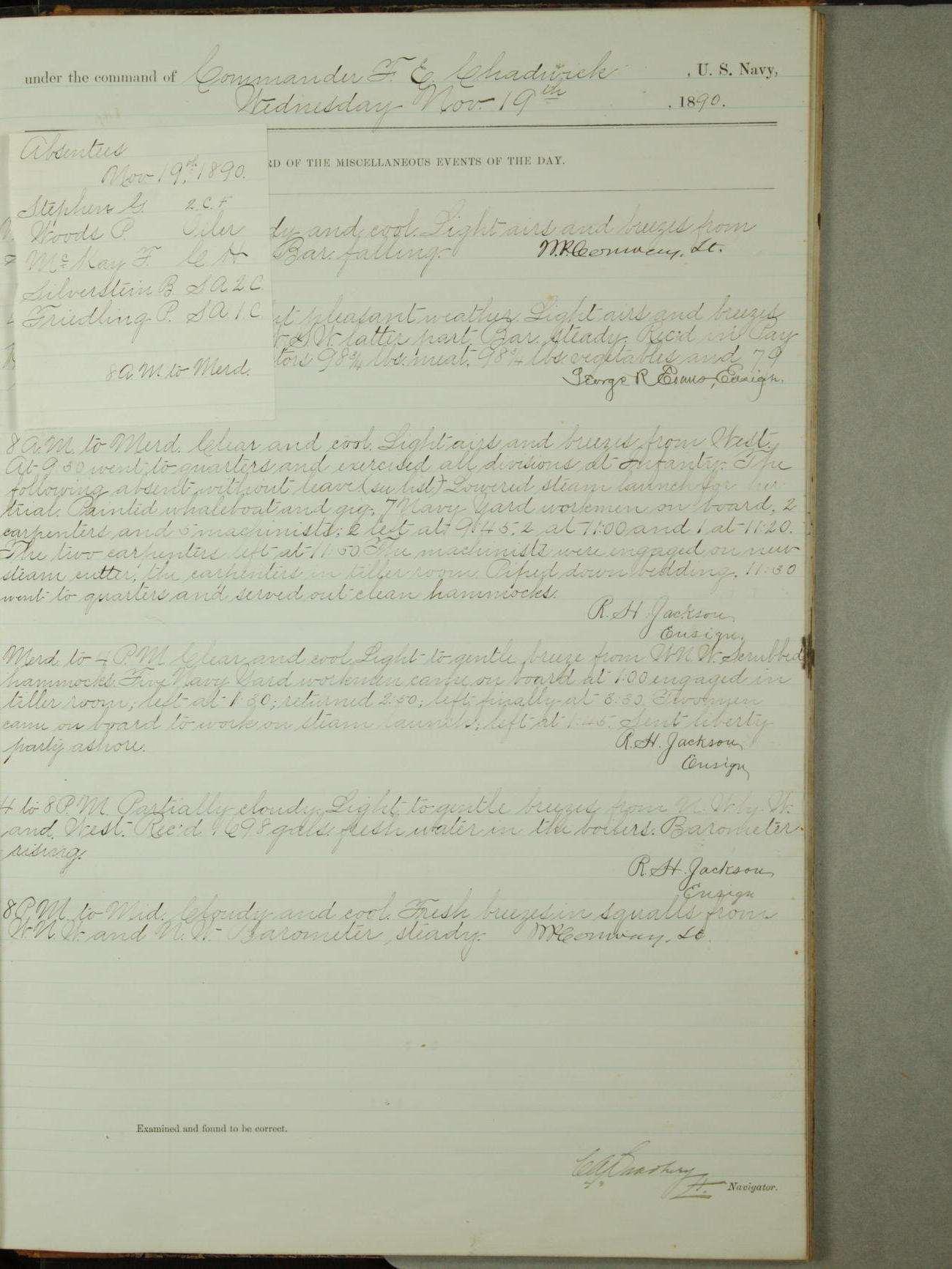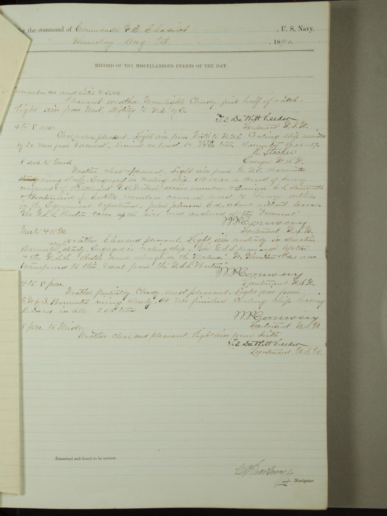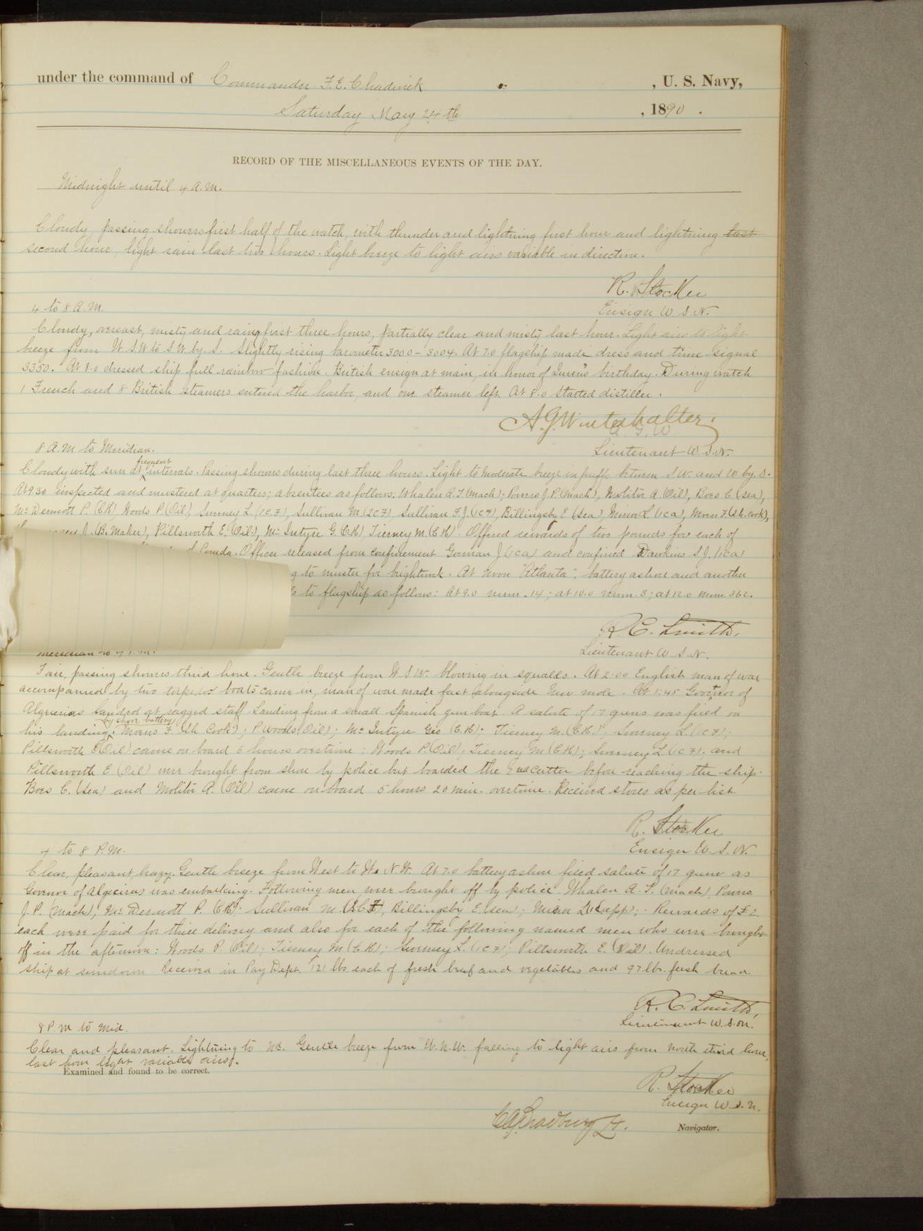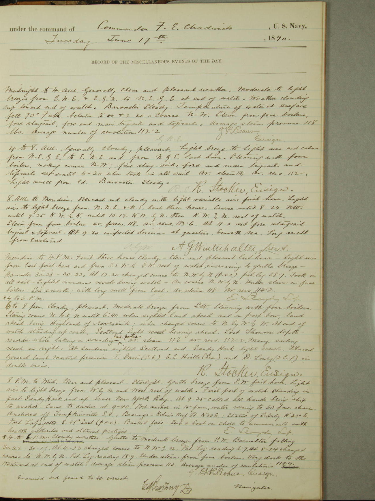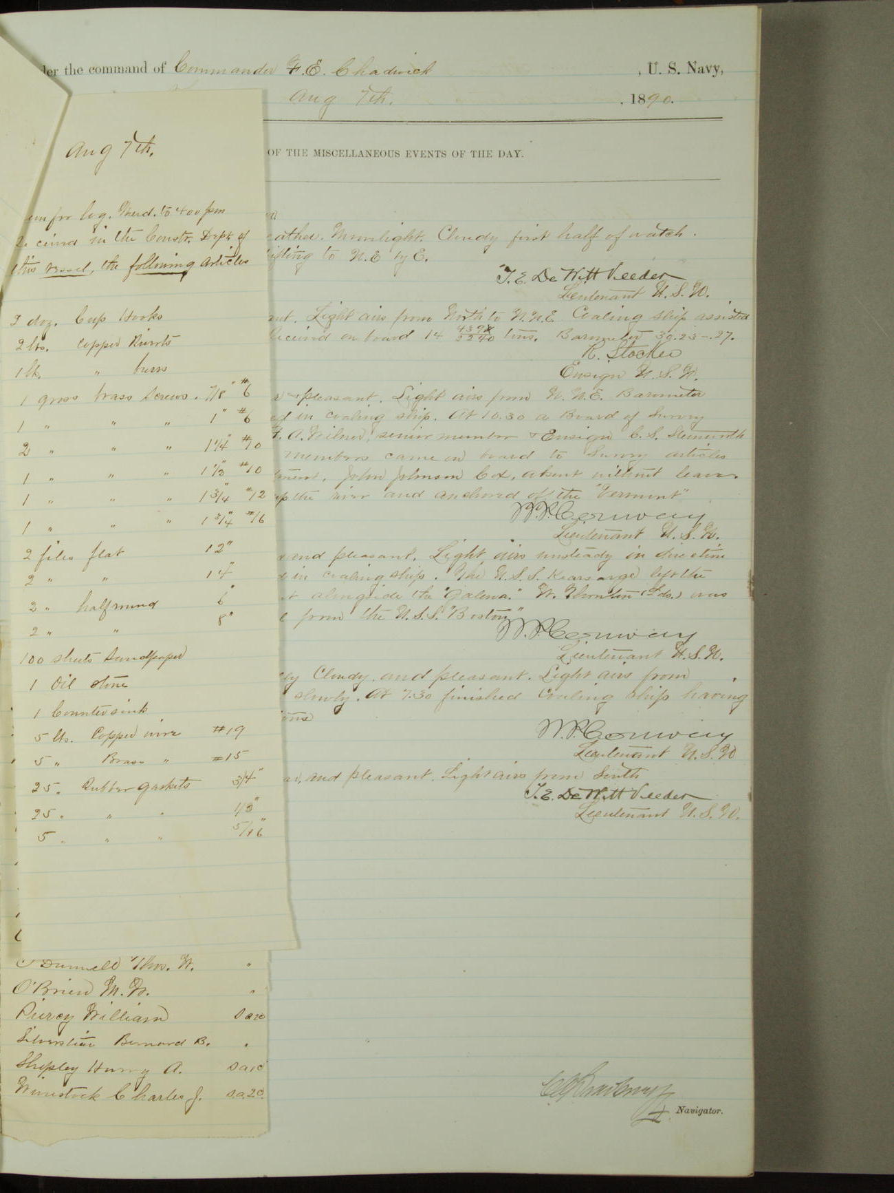 Attached to and on board of the U.S. Steamer "Yorktown", 3rd Rate, commanded by Commander F.E. Chadwick, U.S. Navy, at the time of leaving anchorage at Navy Yard League Island, Pennsylvania the 25th day of April, 1889.