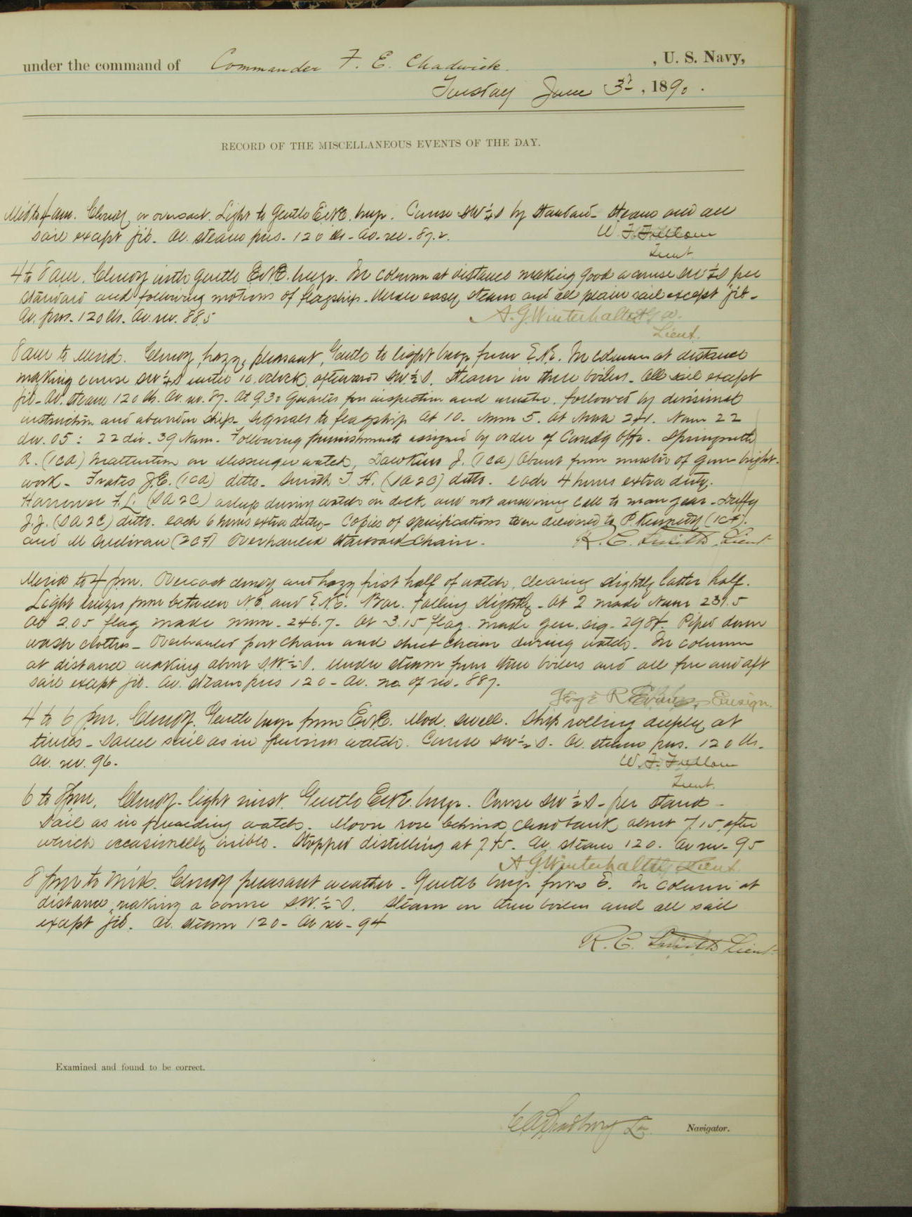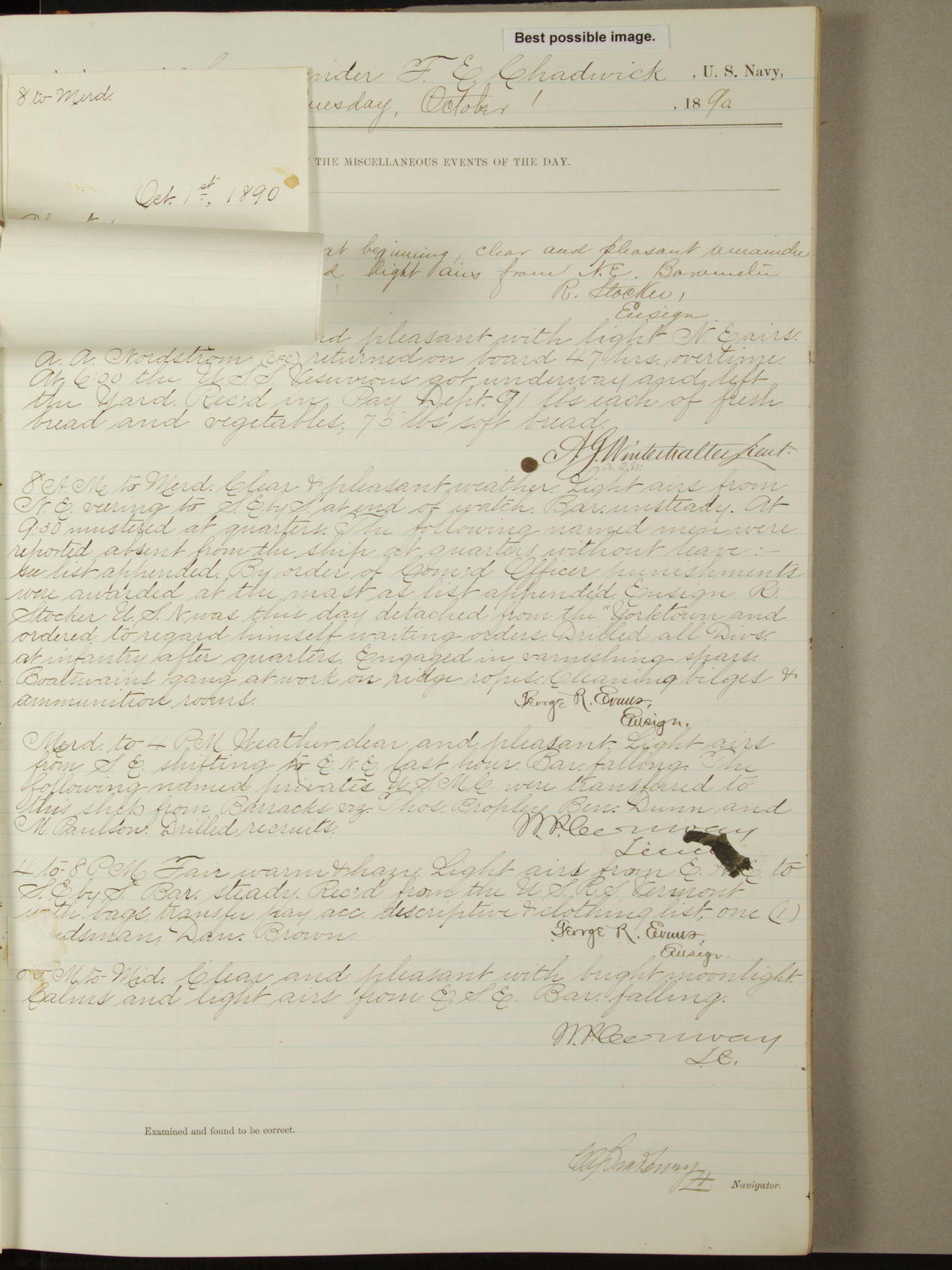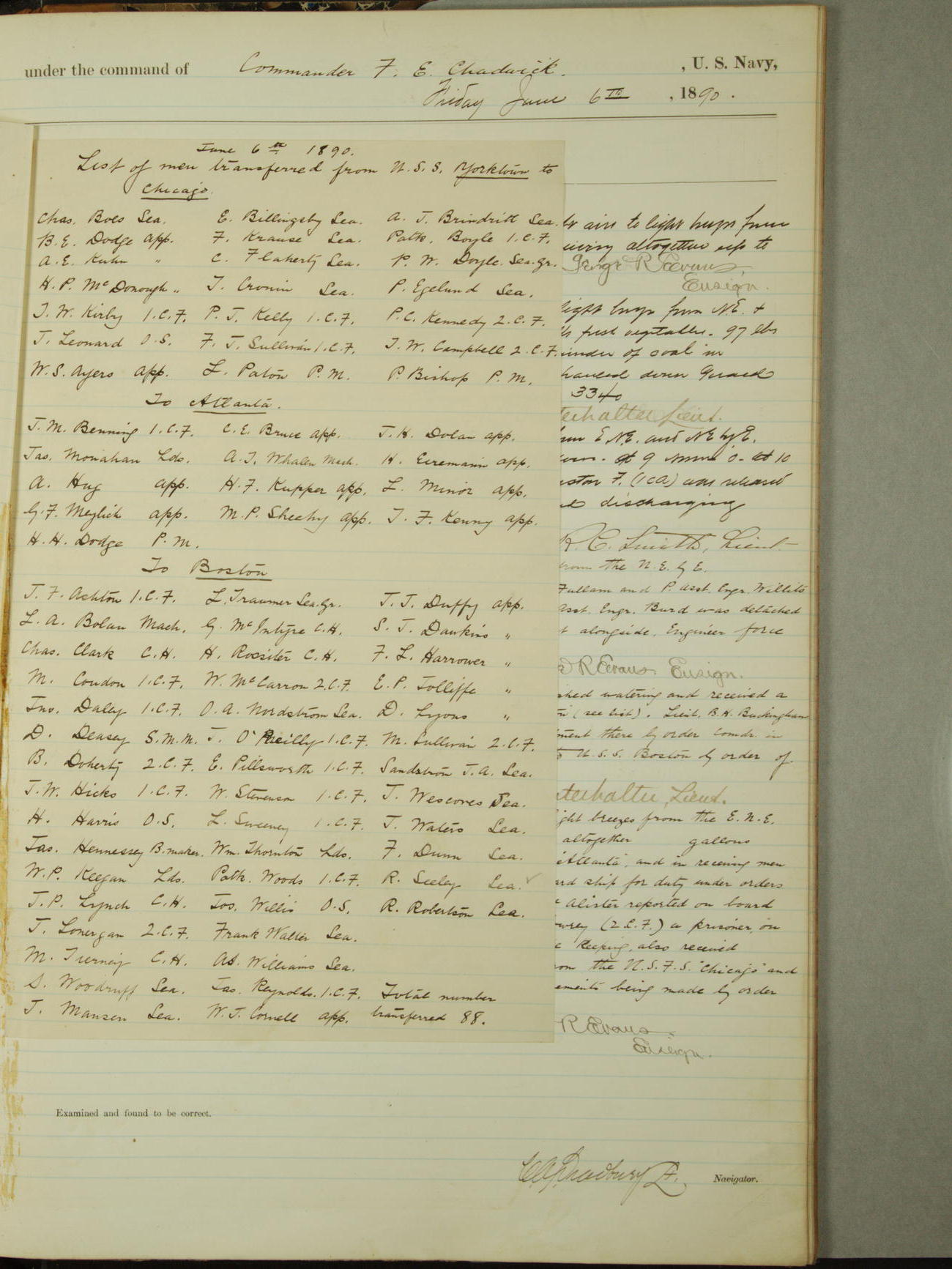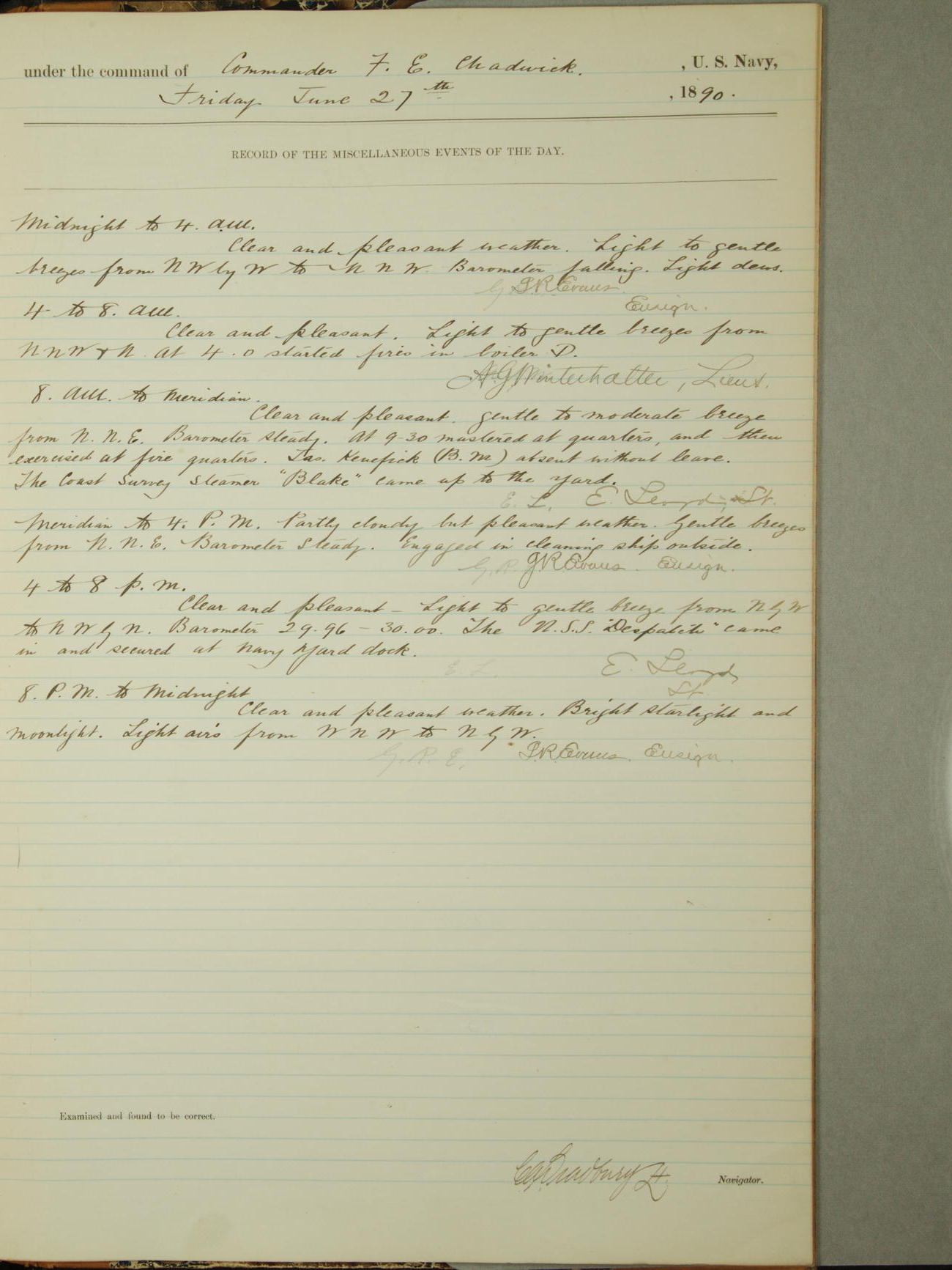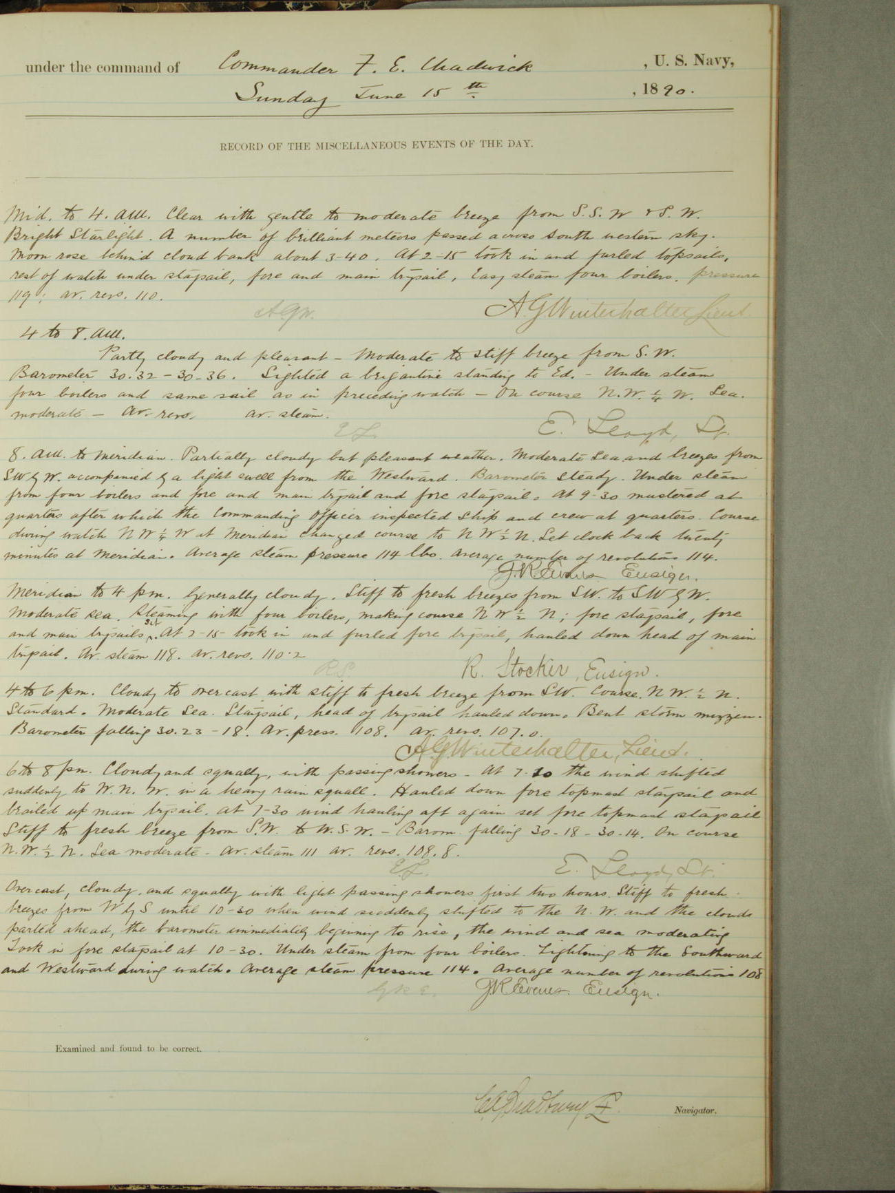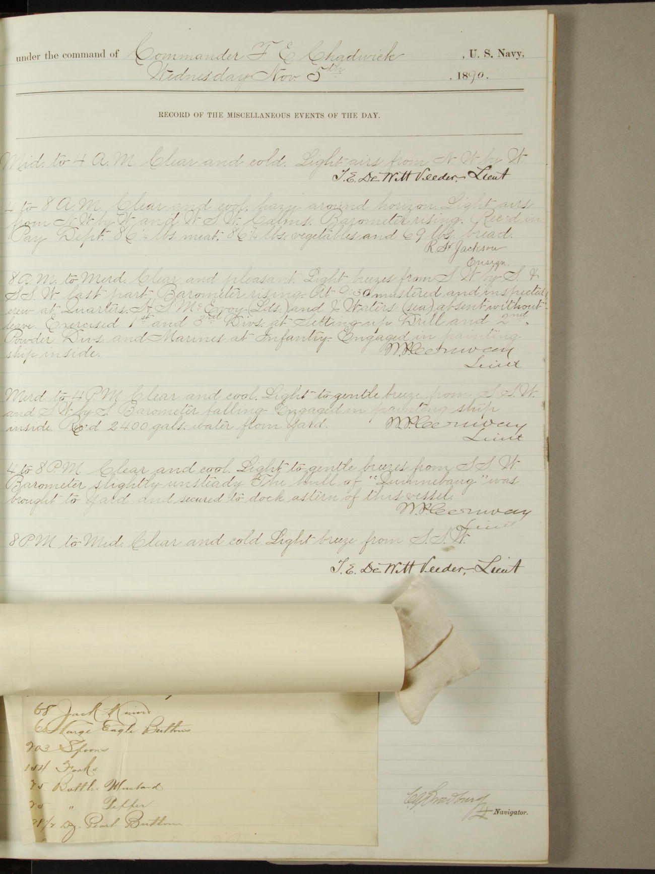 Attached to and on board of the U.S. Steamer "Yorktown", 3rd Rate, commanded by Commander F.E. Chadwick, U.S. Navy, at the time of leaving anchorage at Navy Yard League Island, Pennsylvania the 25th day of April, 1889.