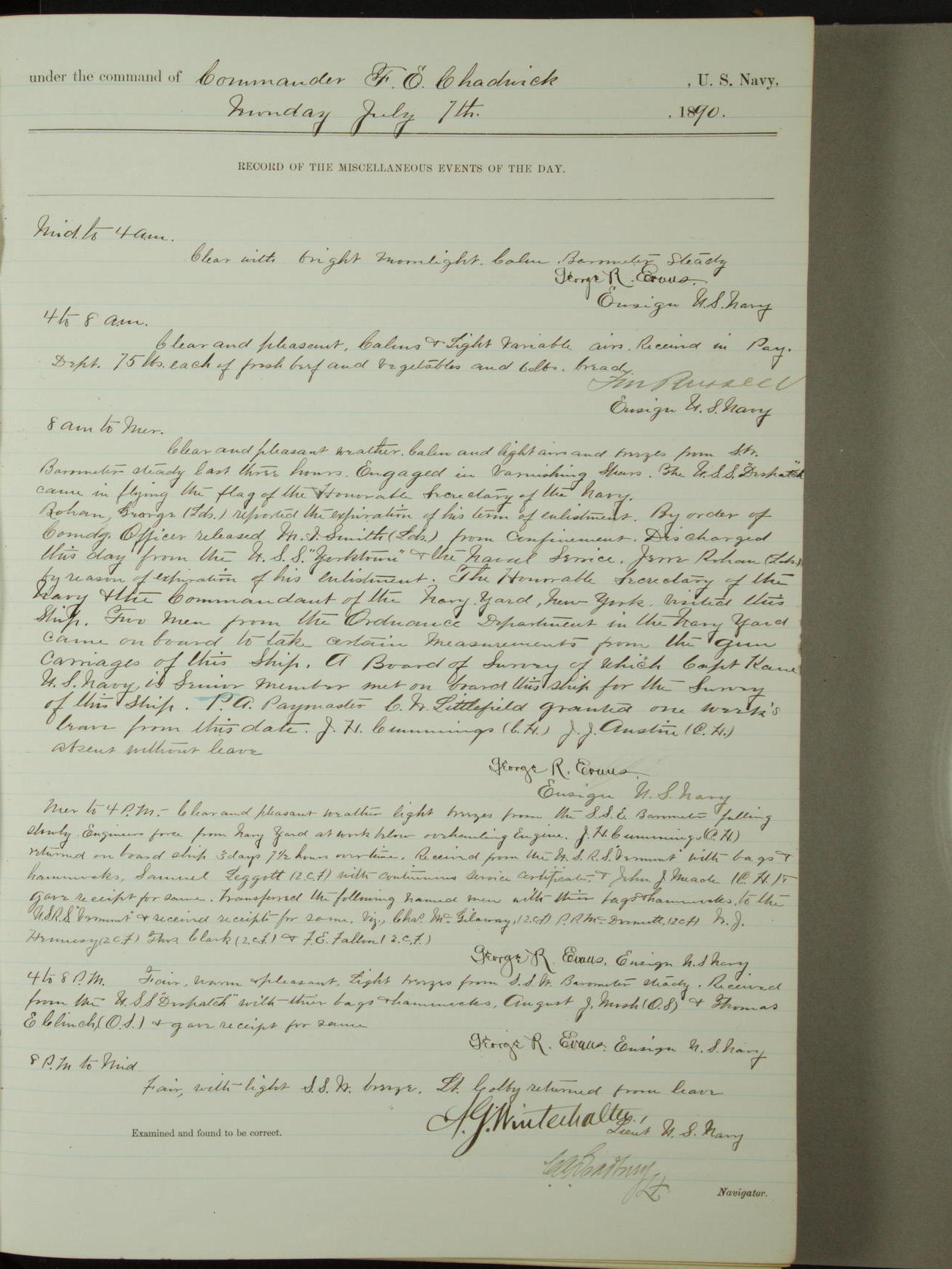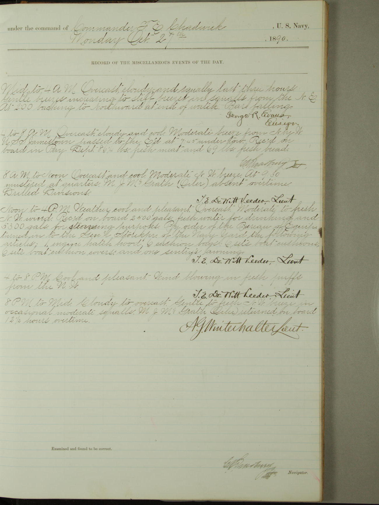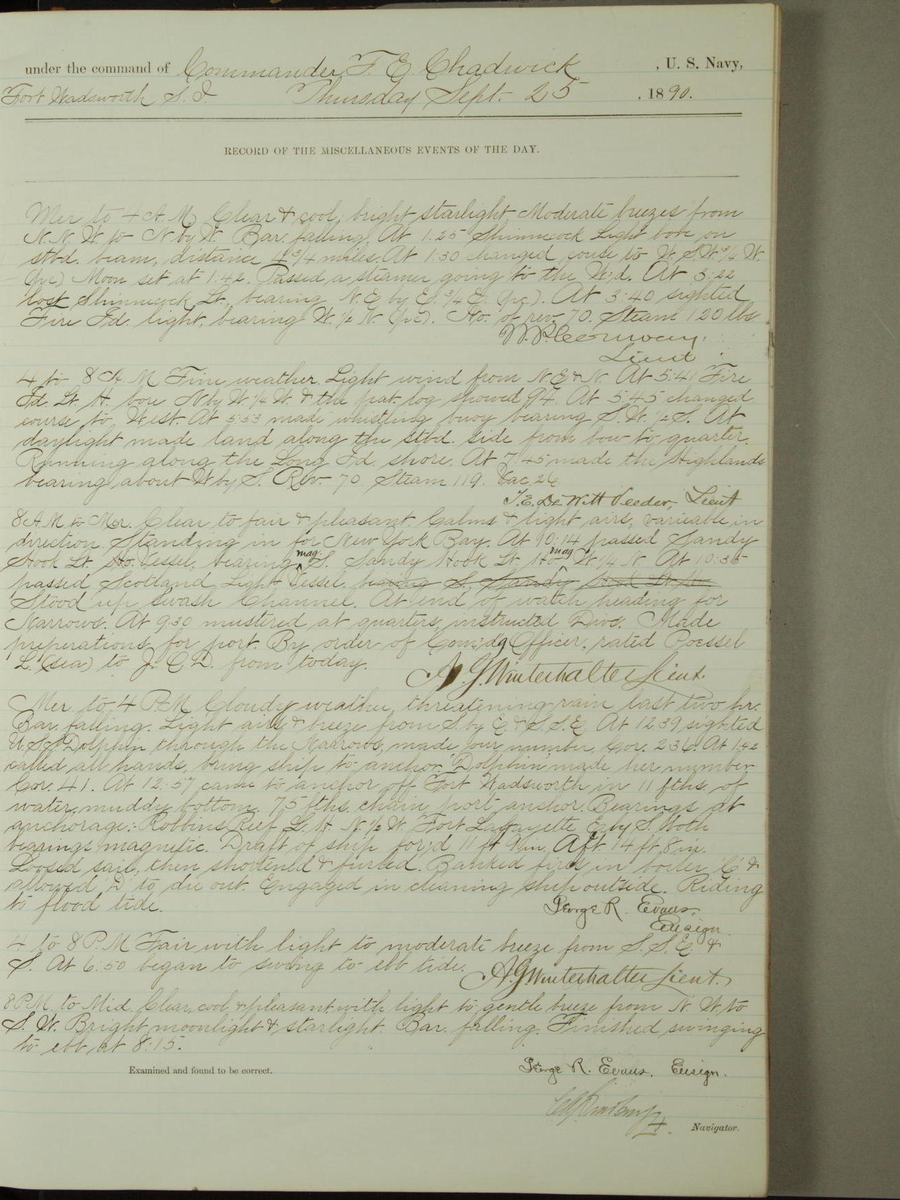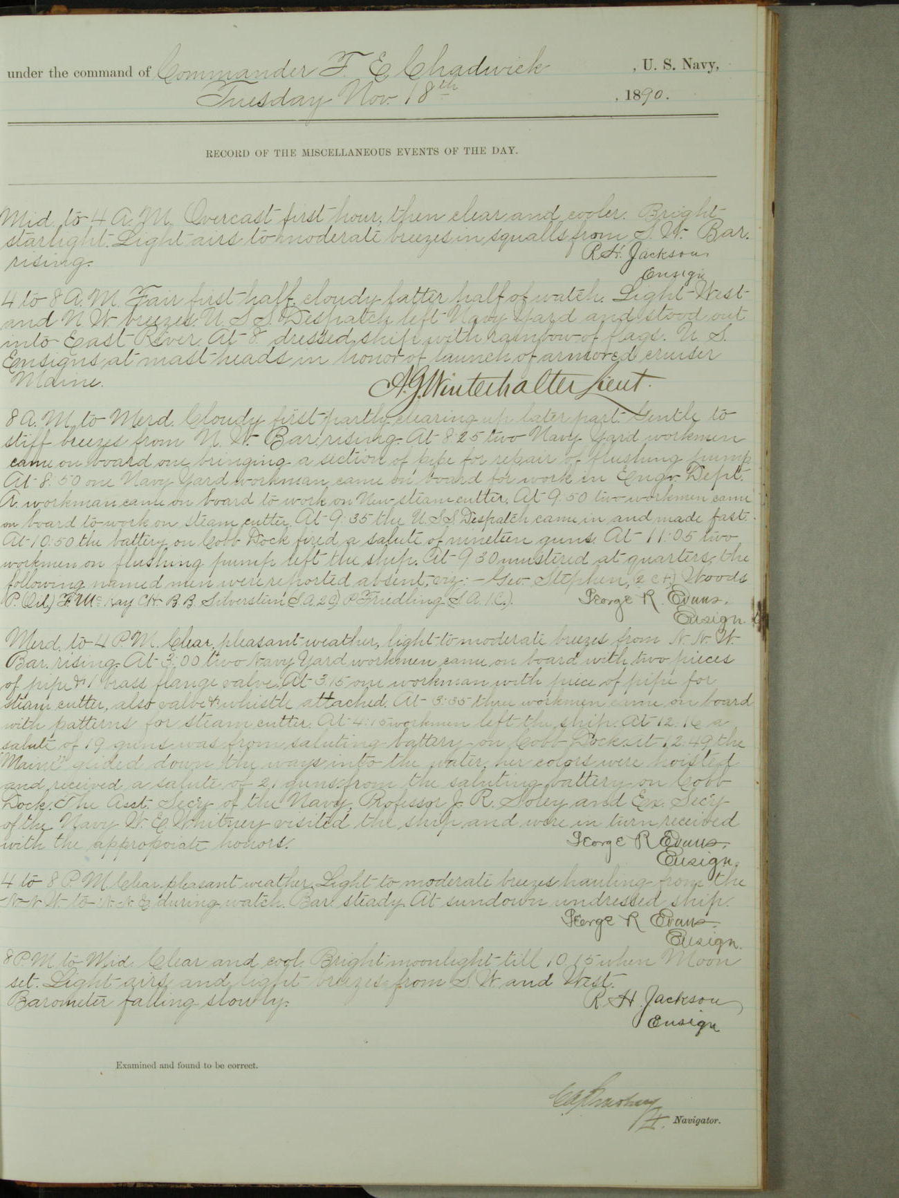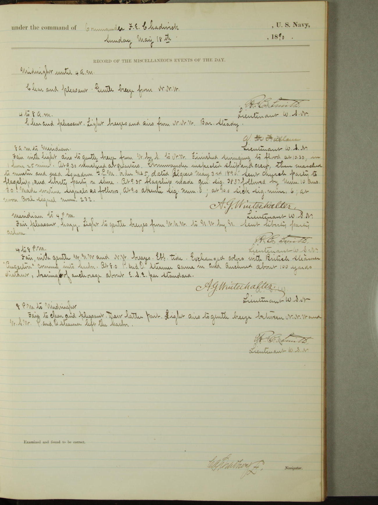Attached to and on board of the U.S. Steamer "Yorktown", 3rd Rate, commanded by Commander F.E. Chadwick, U.S. Navy, at the time of leaving anchorage at Navy Yard League Island, Pennsylvania the 25th day of April, 1889.