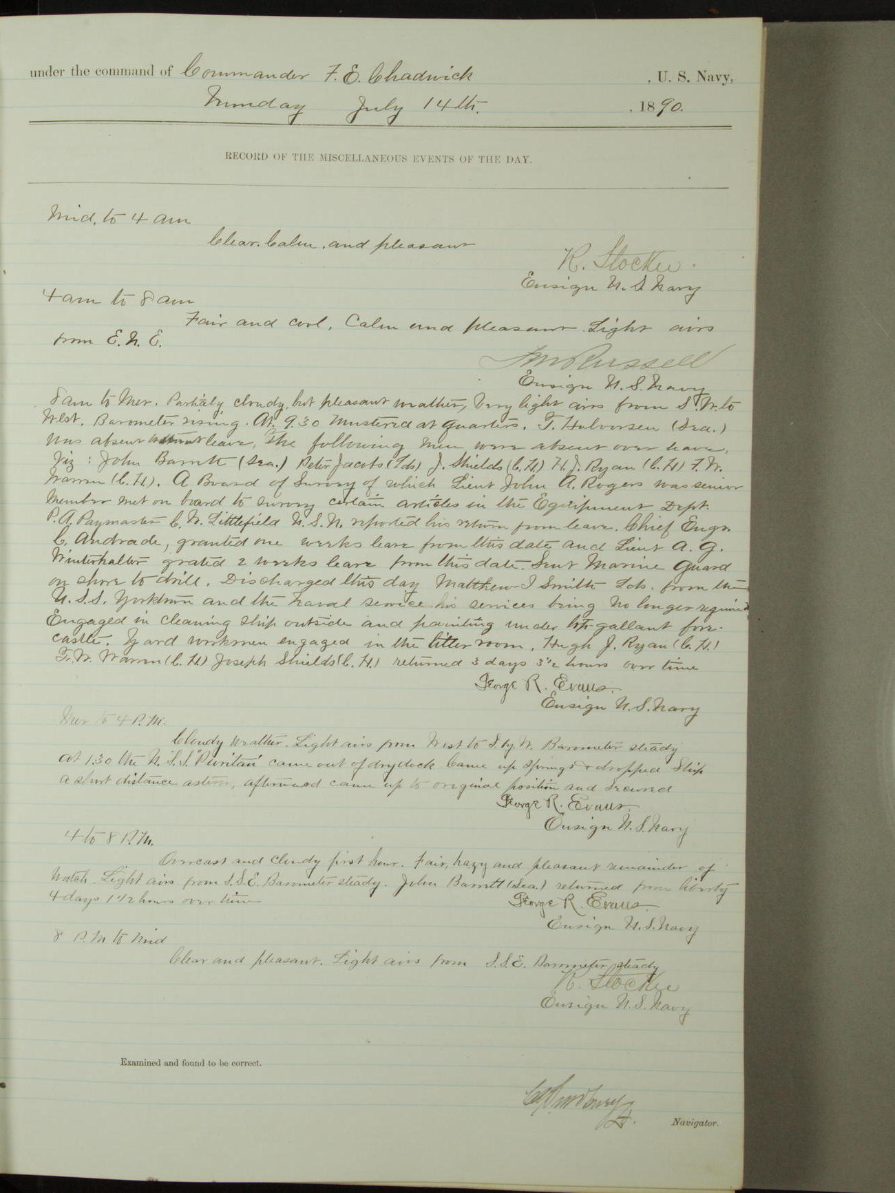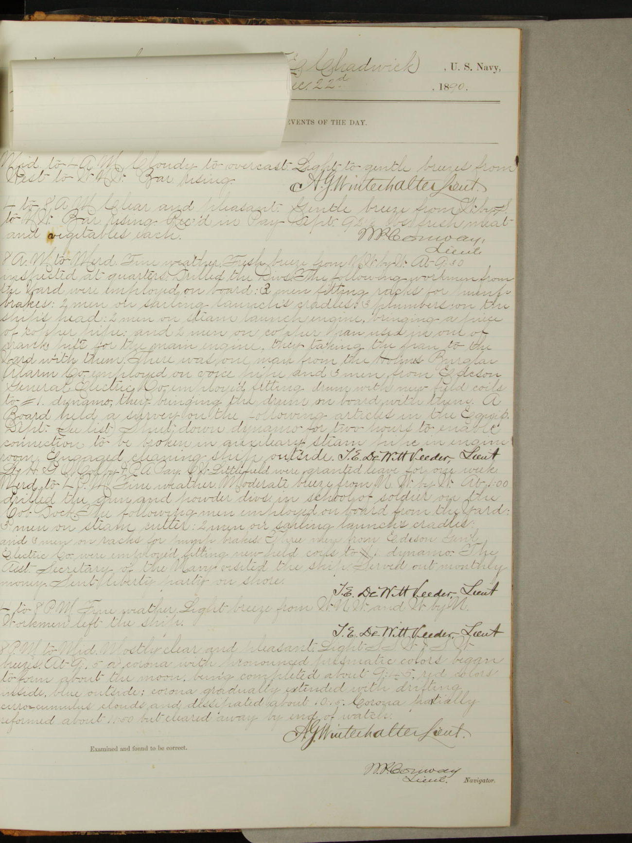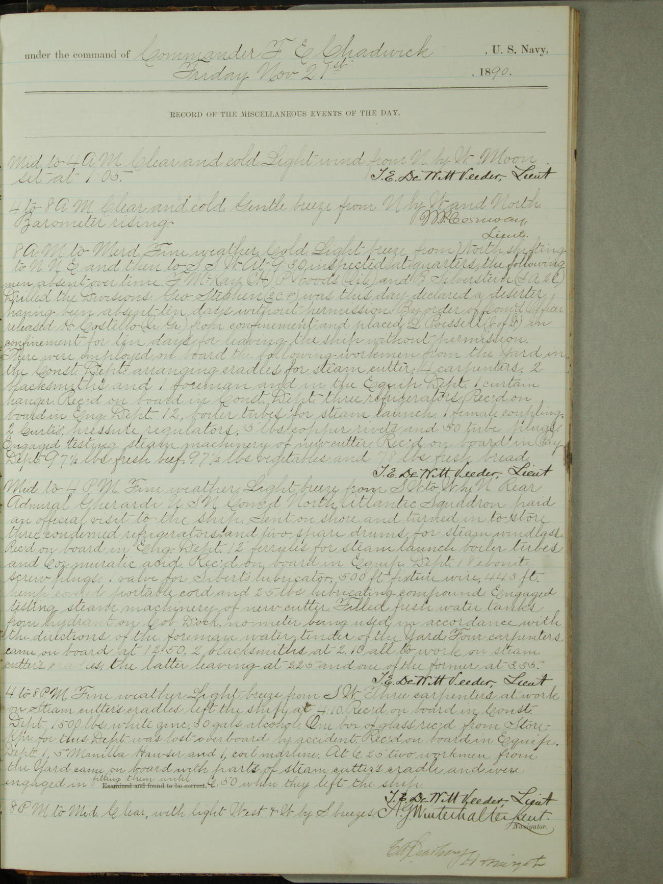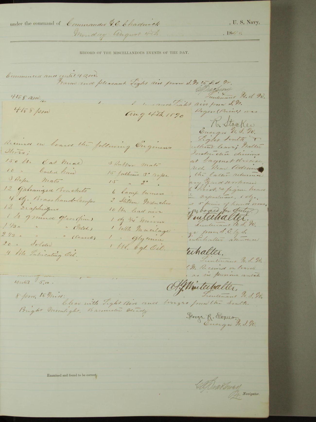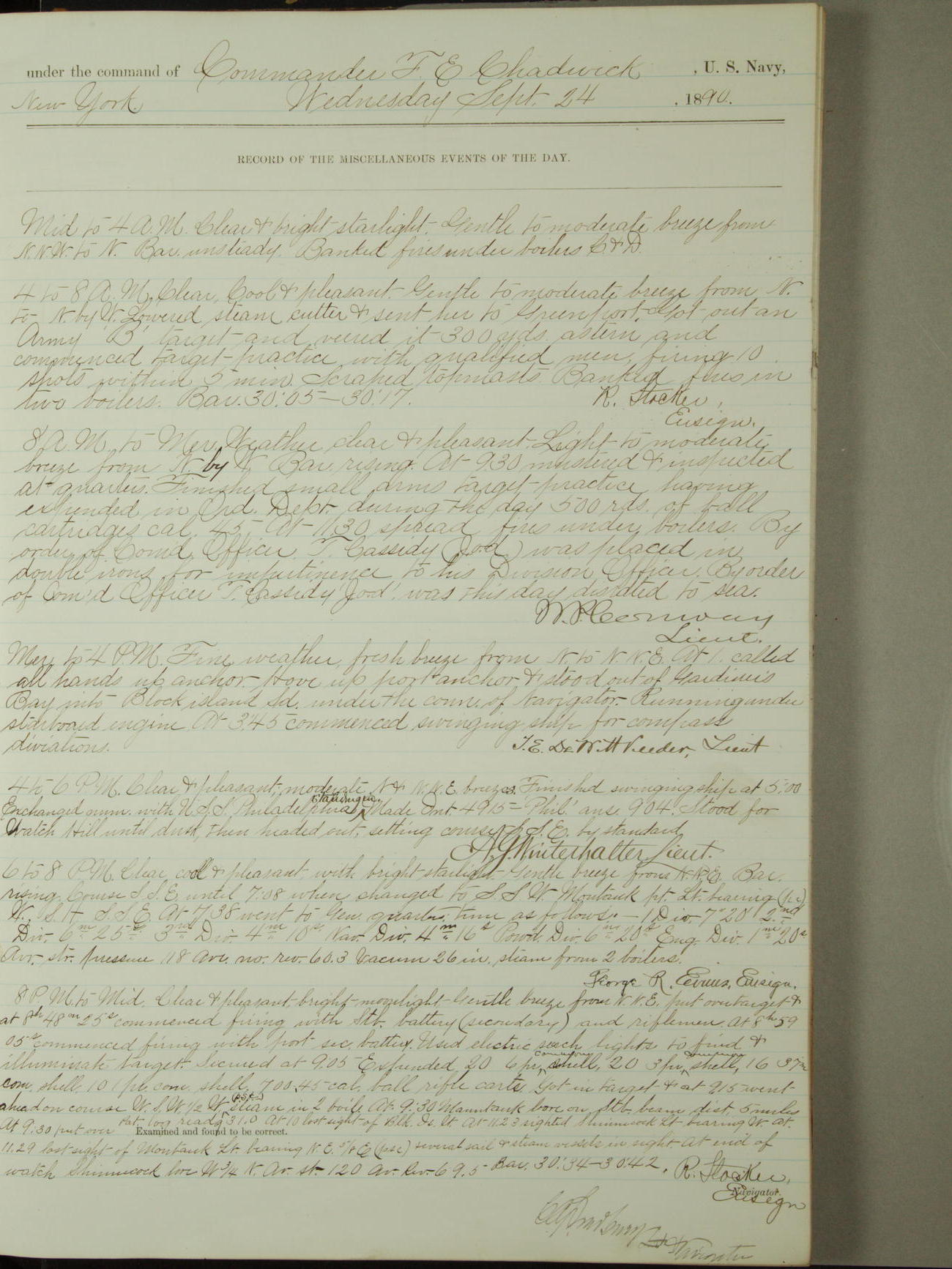 Attached to and on board of the U.S. Steamer "Yorktown", 3rd Rate, commanded by Commander F.E. Chadwick, U.S. Navy, at the time of leaving anchorage at Navy Yard League Island, Pennsylvania the 25th day of April, 1889.