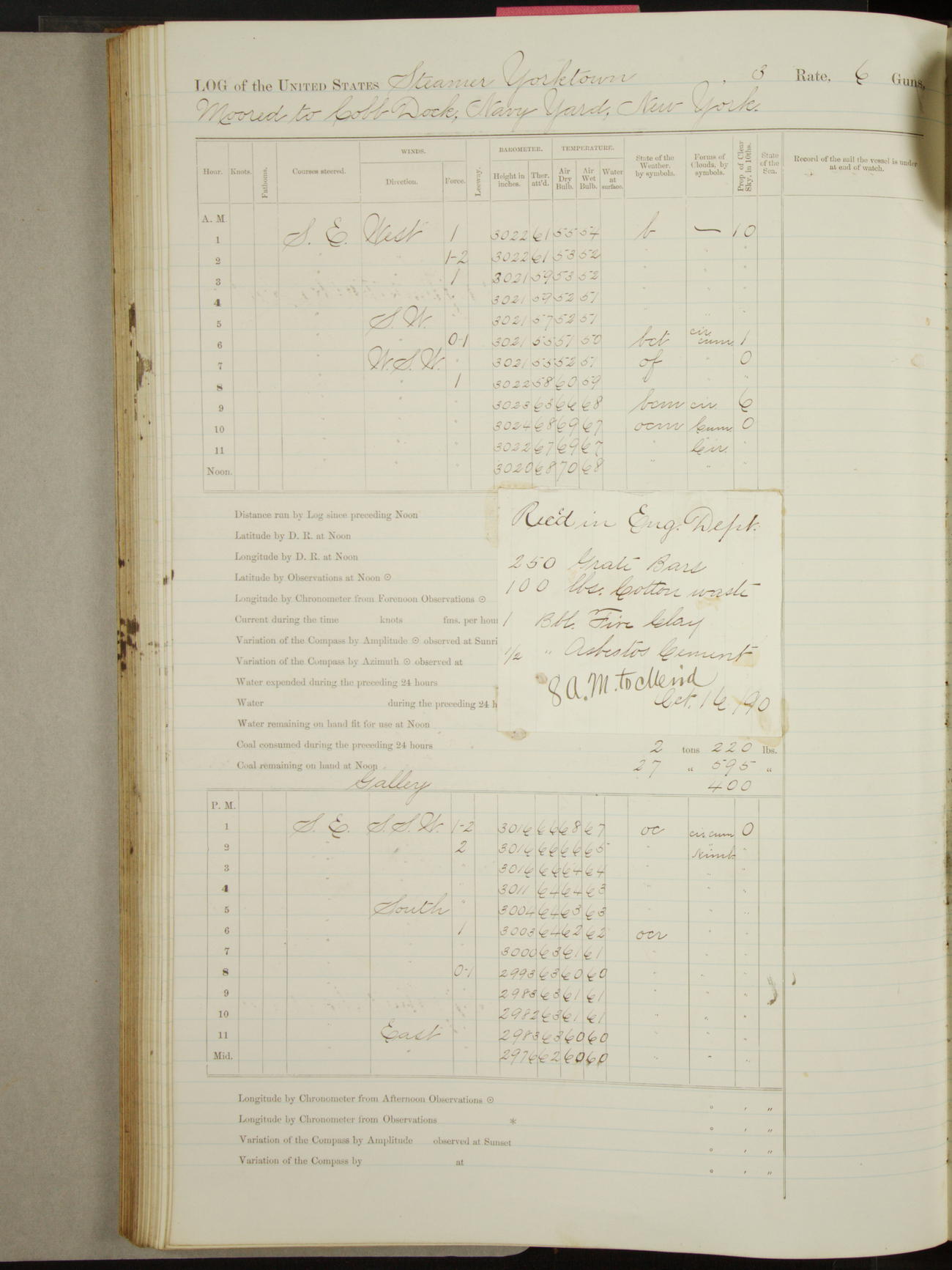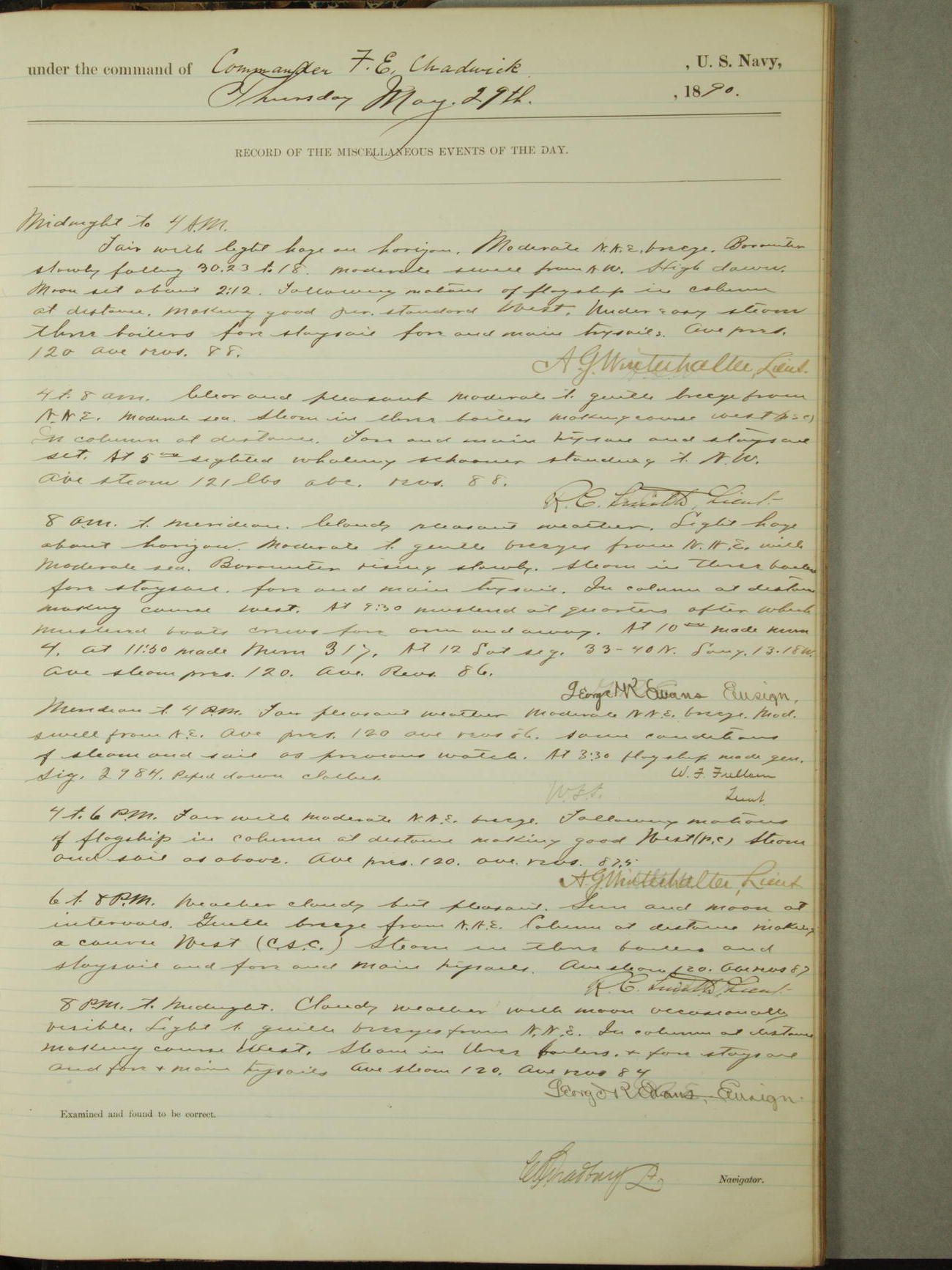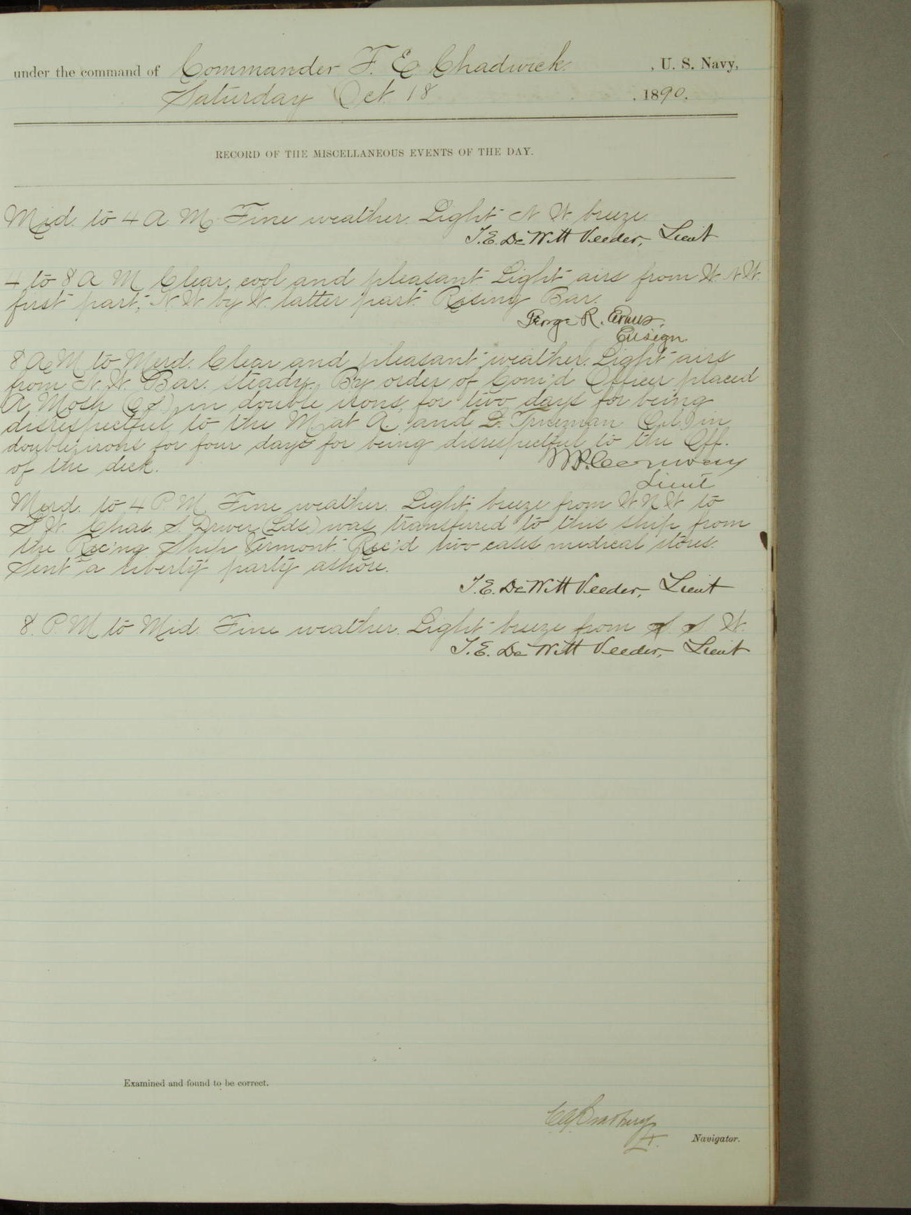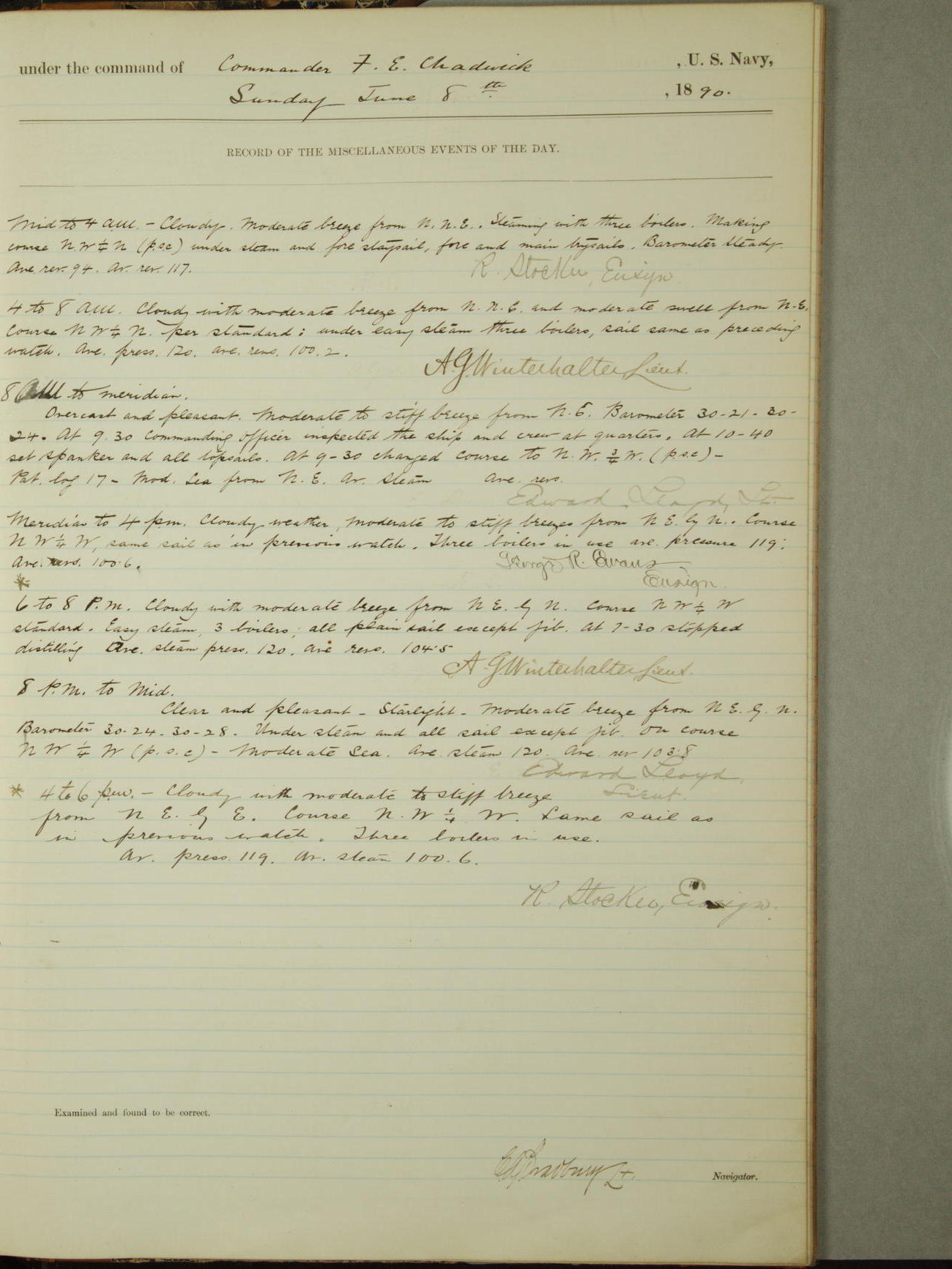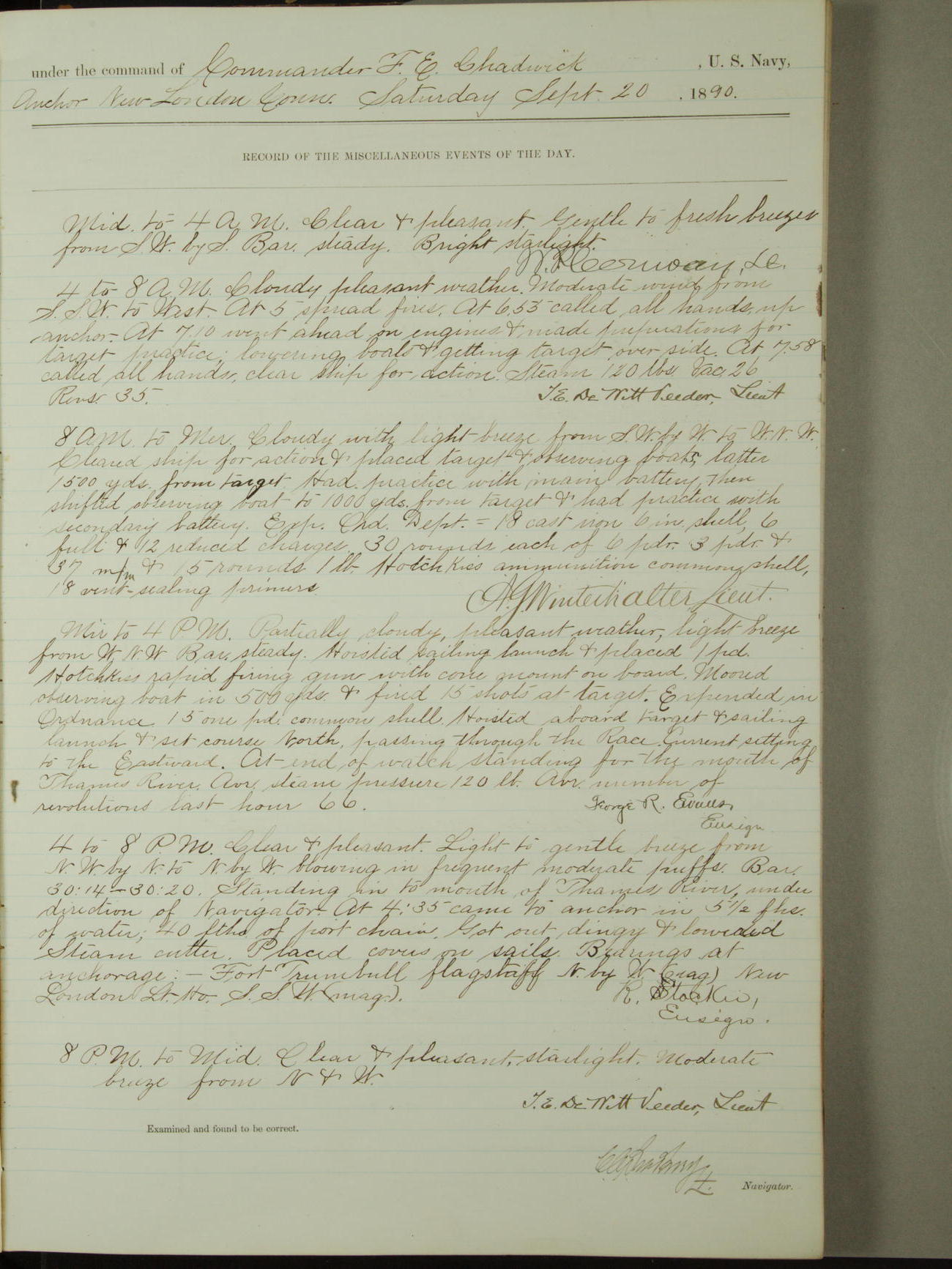 Attached to and on board of the U.S. Steamer "Yorktown", 3rd Rate, commanded by Commander F.E. Chadwick, U.S. Navy, at the time of leaving anchorage at Navy Yard League Island, Pennsylvania the 25th day of April, 1889.