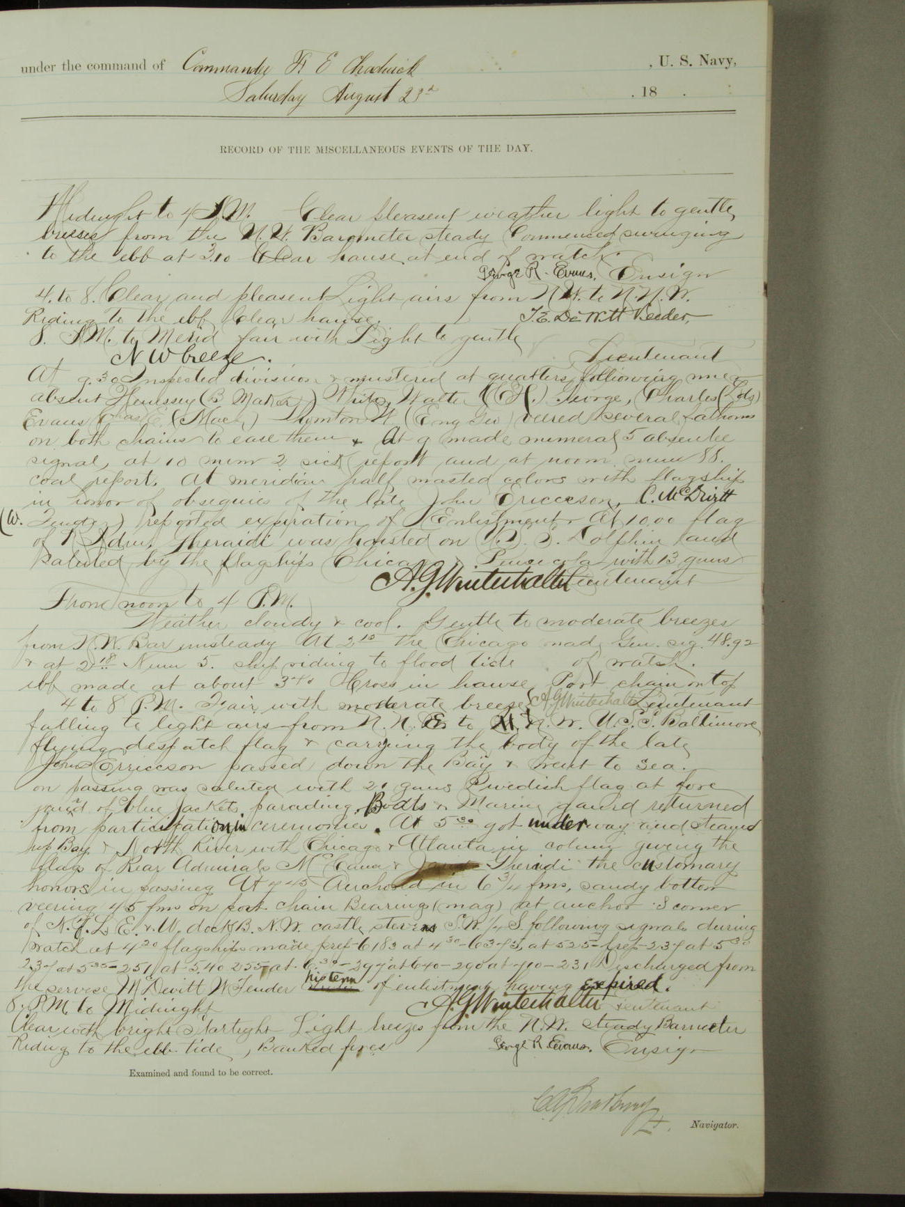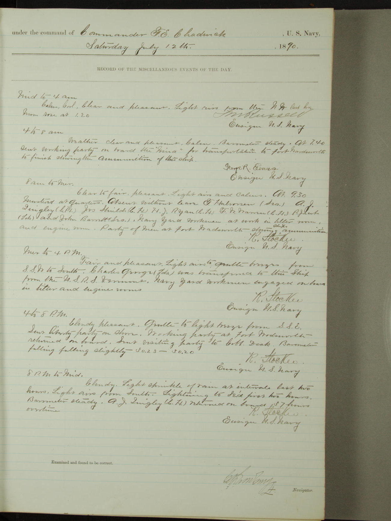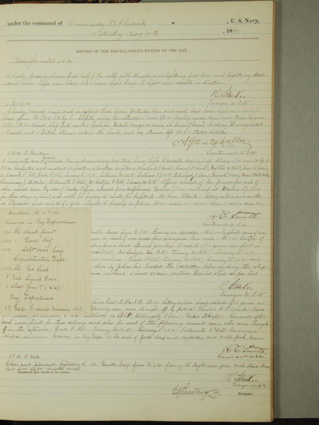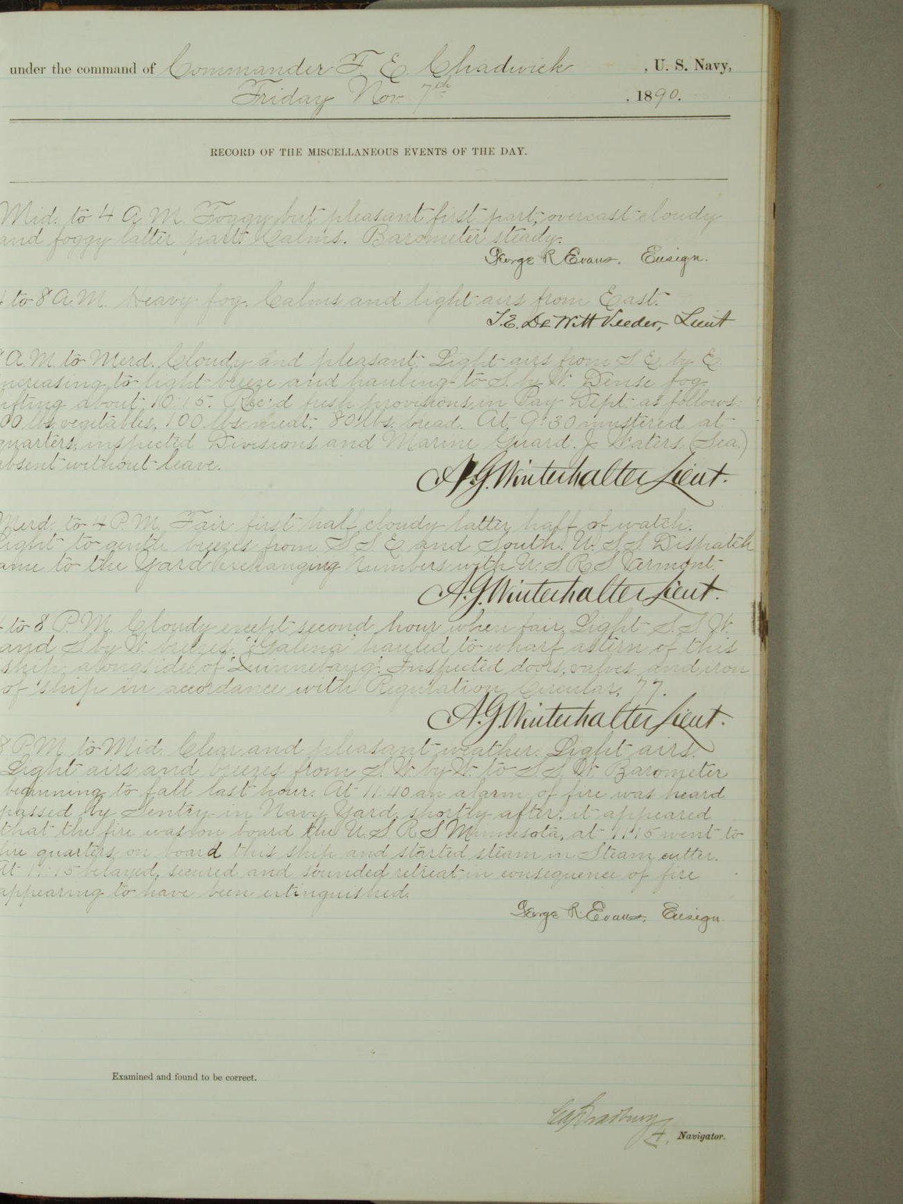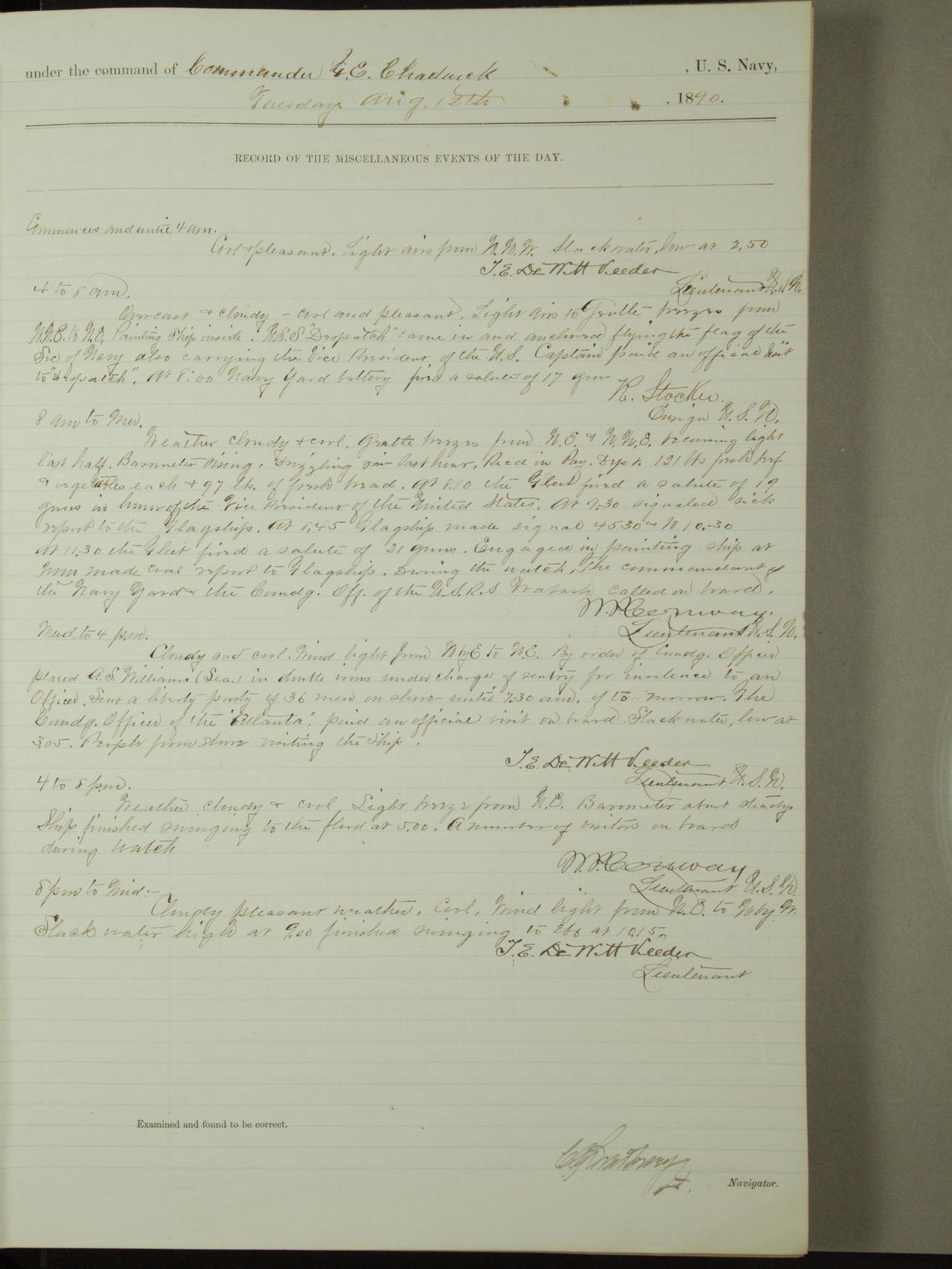 Attached to and on board of the U.S. Steamer "Yorktown", 3rd Rate, commanded by Commander F.E. Chadwick, U.S. Navy, at the time of leaving anchorage at Navy Yard League Island, Pennsylvania the 25th day of April, 1889.