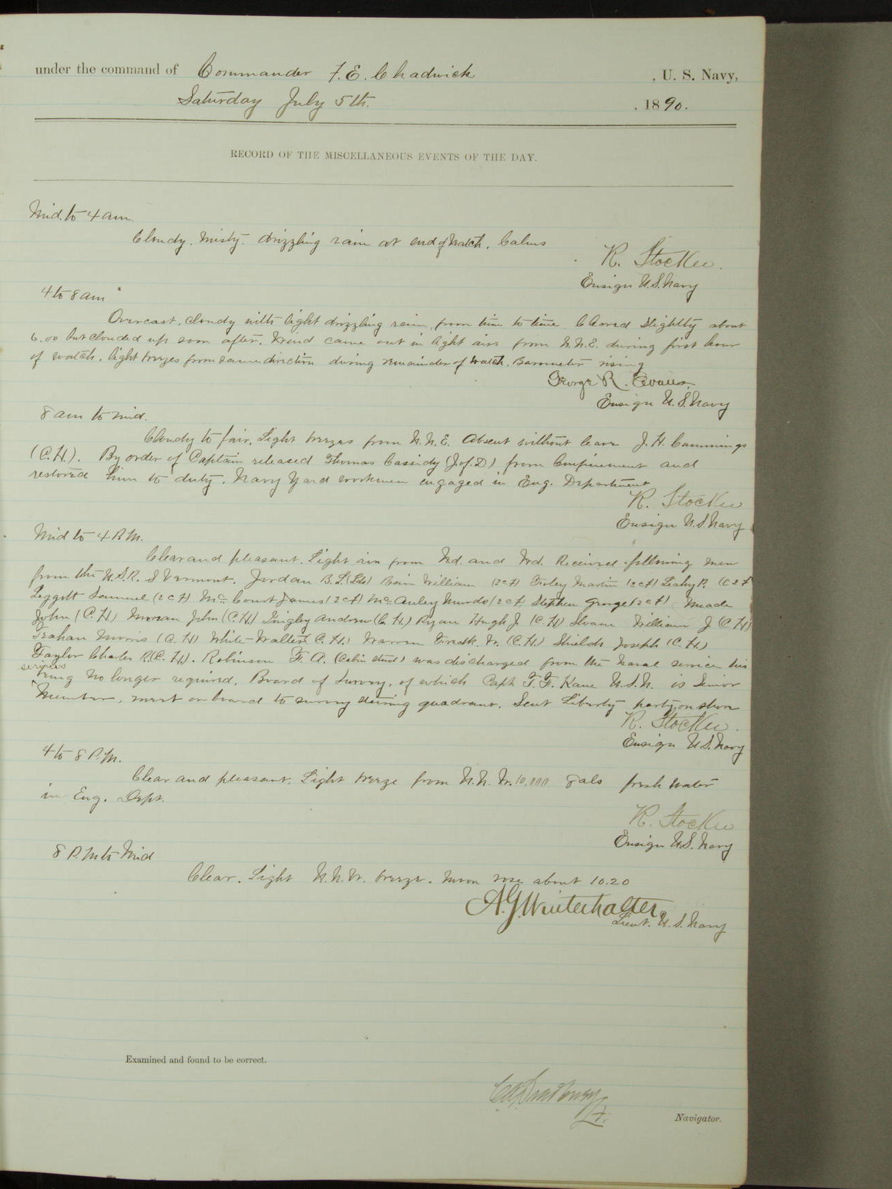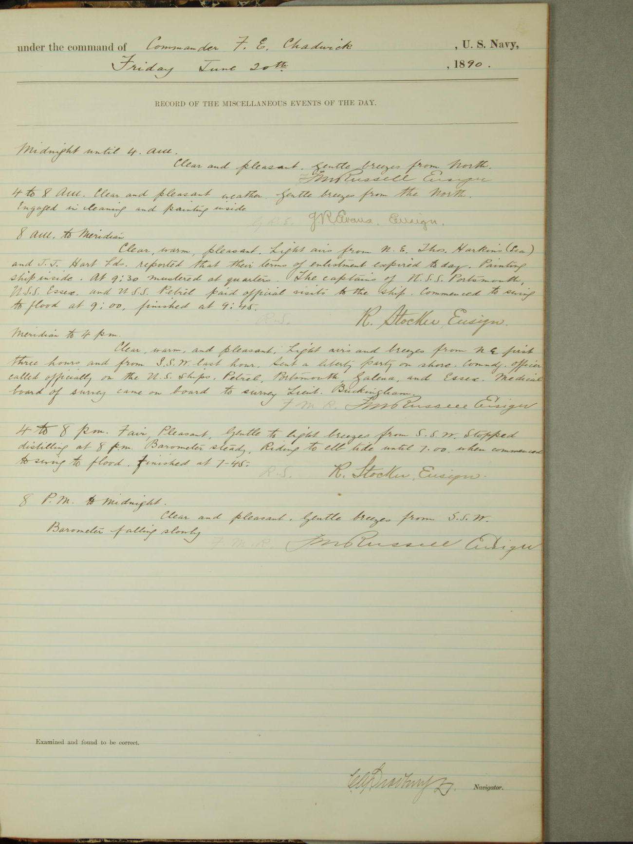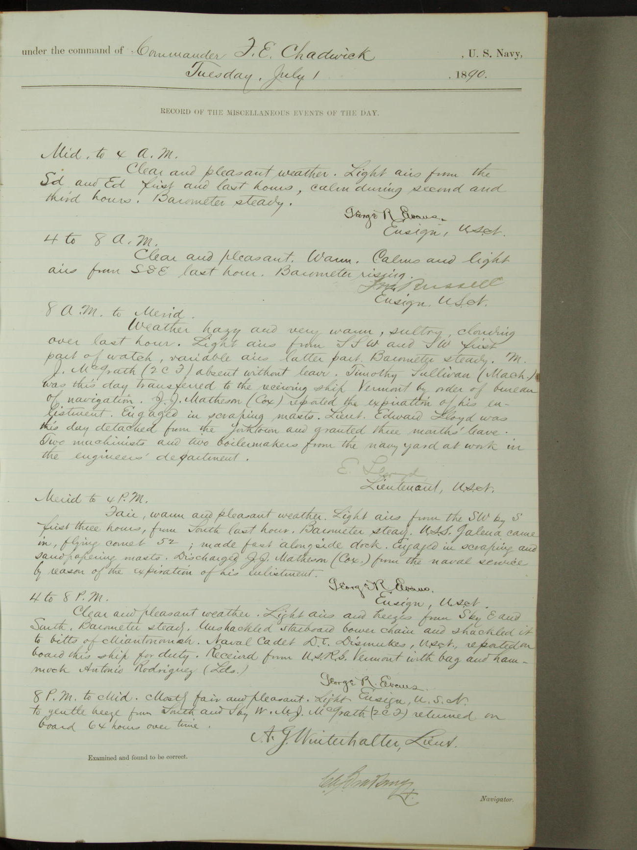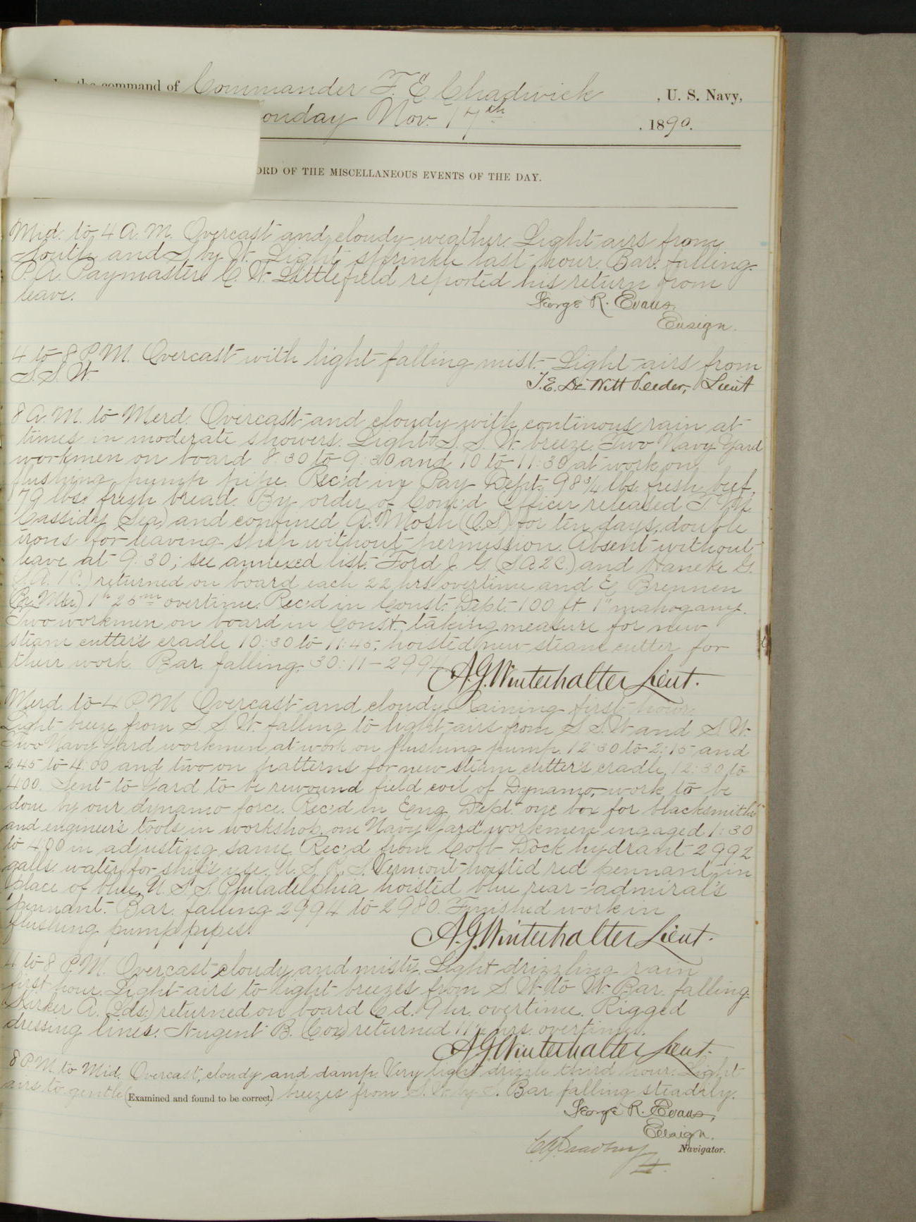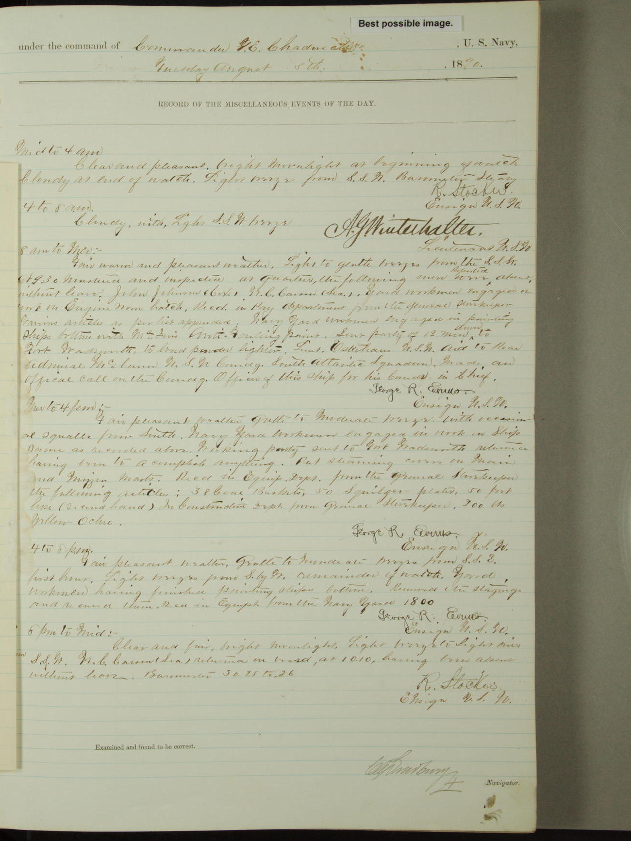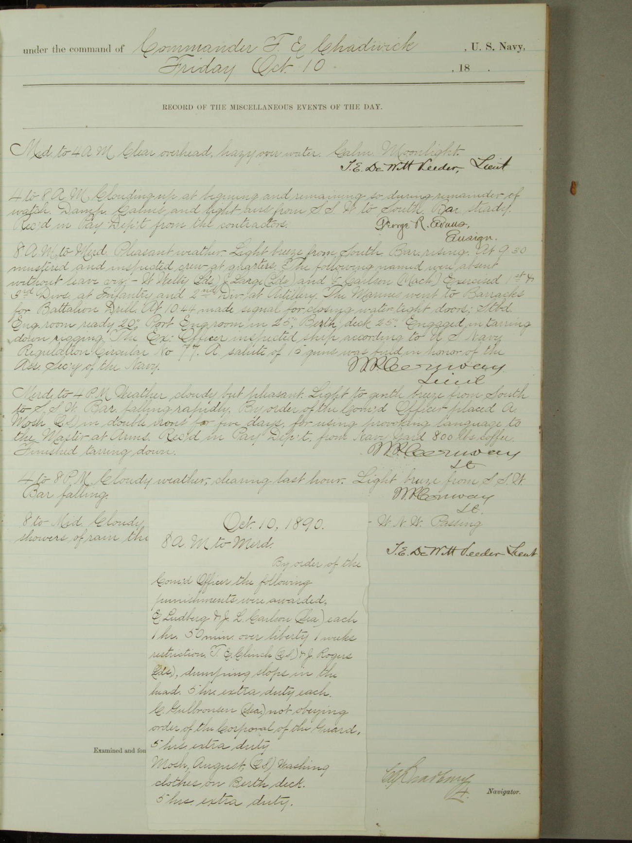 Attached to and on board of the U.S. Steamer "Yorktown", 3rd Rate, commanded by Commander F.E. Chadwick, U.S. Navy, at the time of leaving anchorage at Navy Yard League Island, Pennsylvania the 25th day of April, 1889.