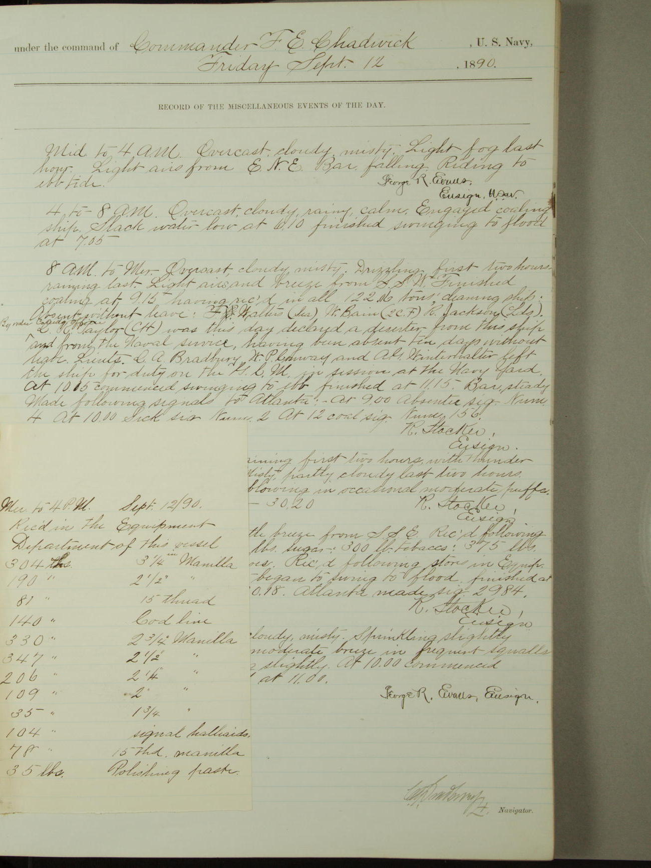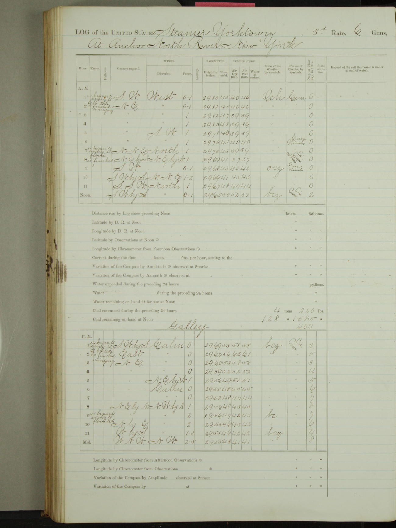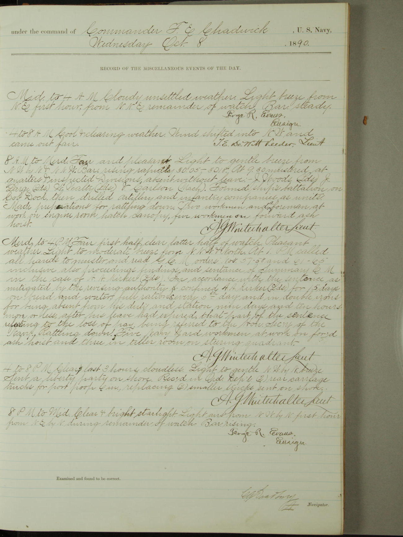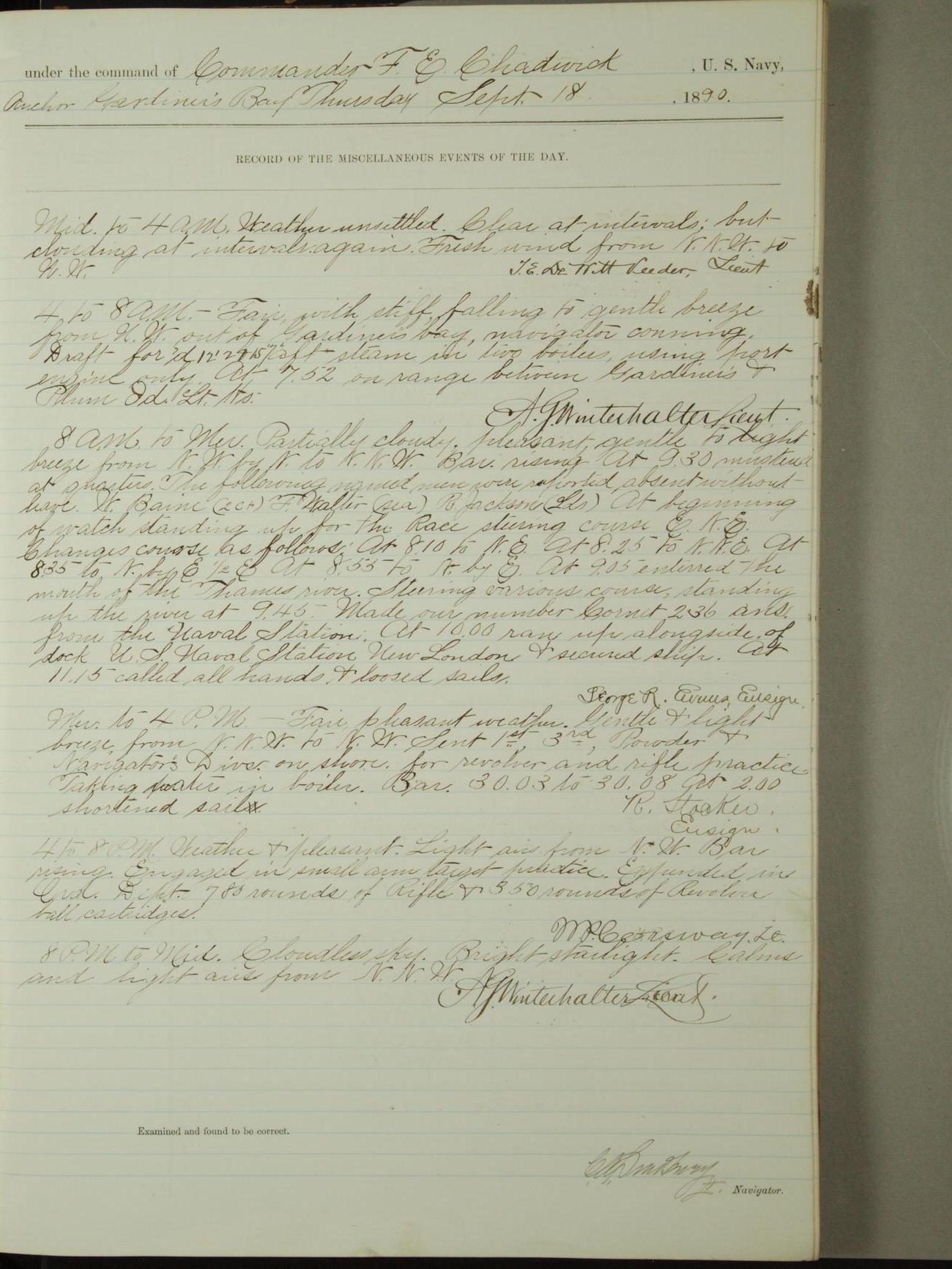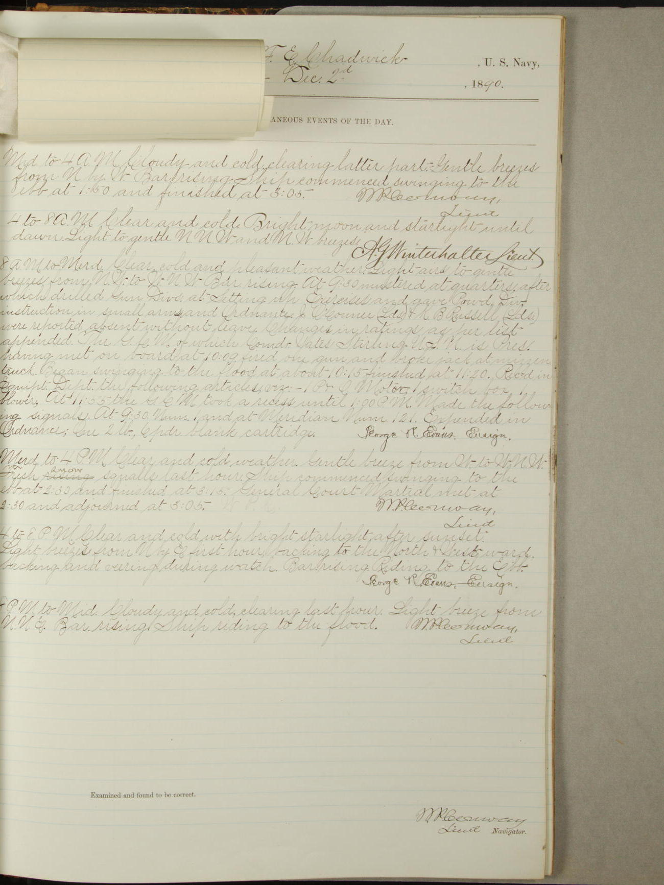 Attached to and on board of the U.S. Steamer "Yorktown", 3rd Rate, commanded by Commander F.E. Chadwick, U.S. Navy, at the time of leaving anchorage at Navy Yard League Island, Pennsylvania the 25th day of April, 1889.