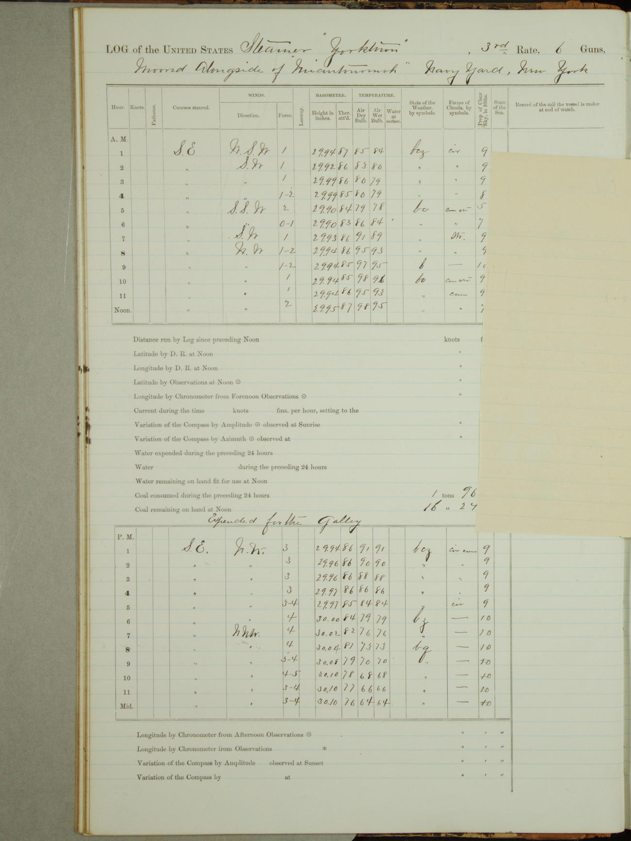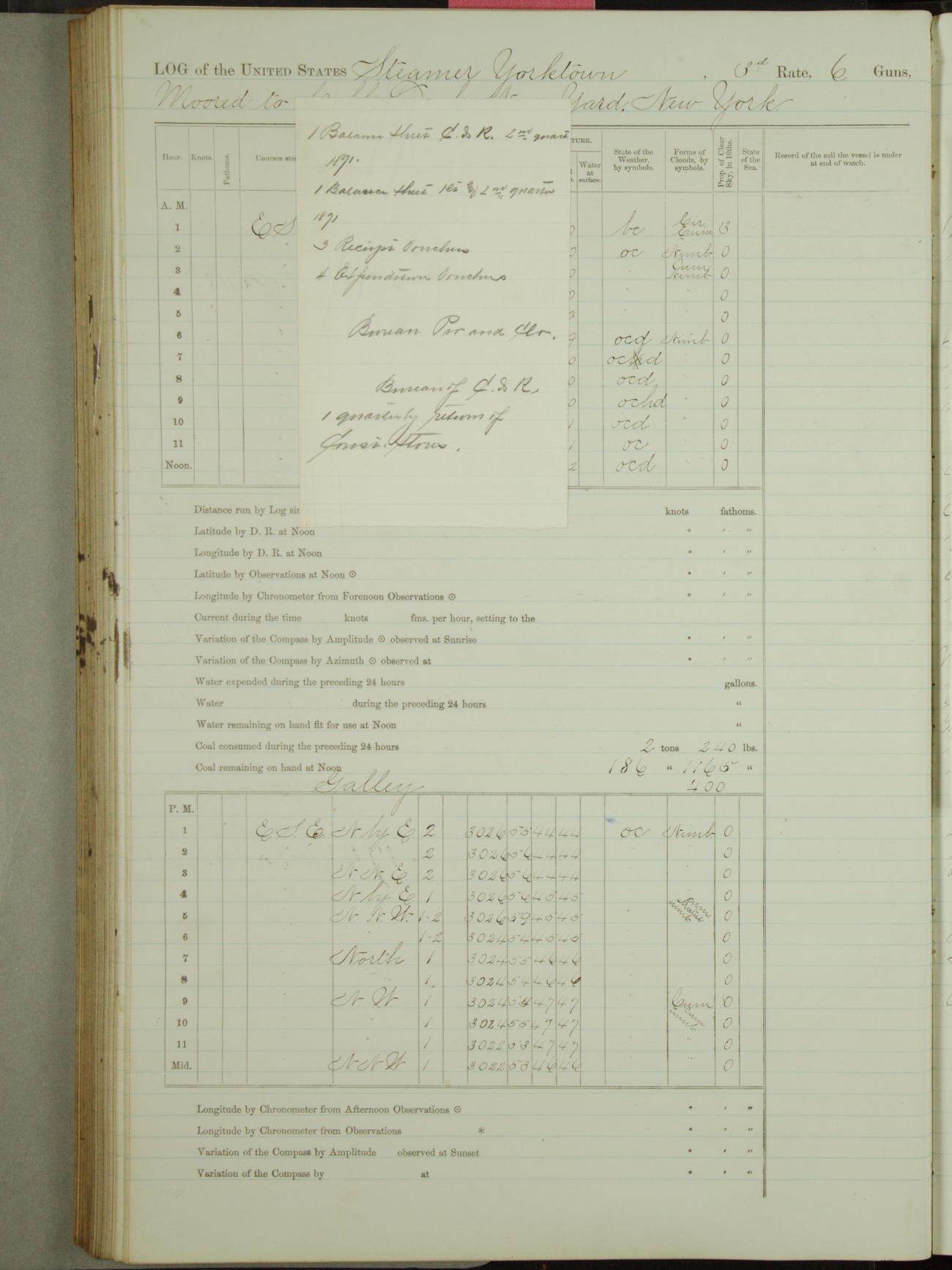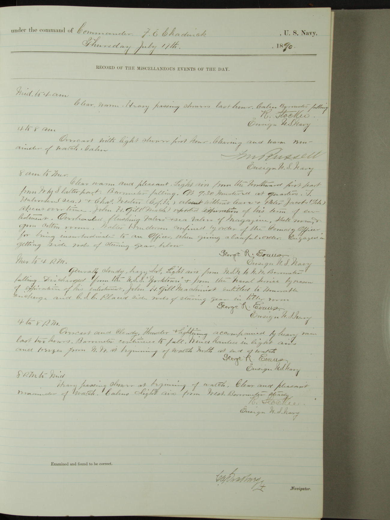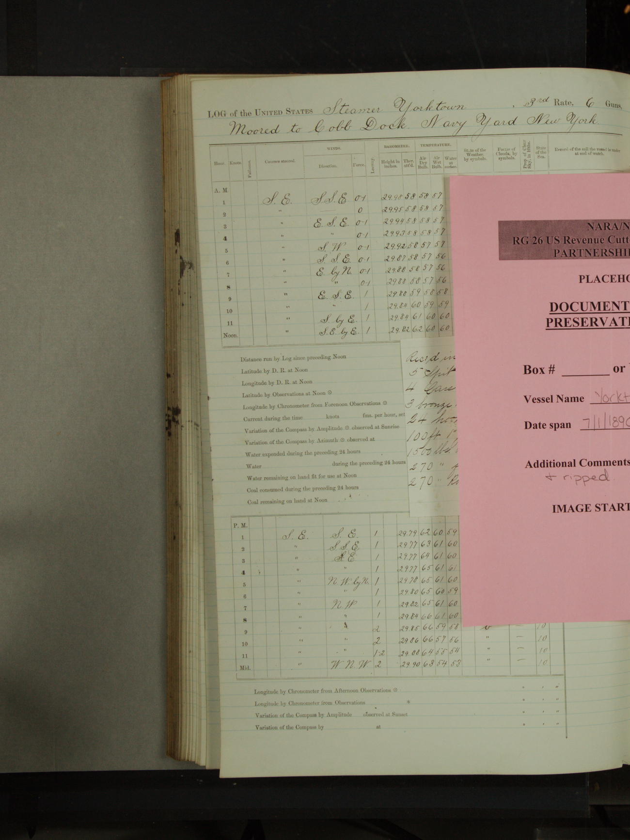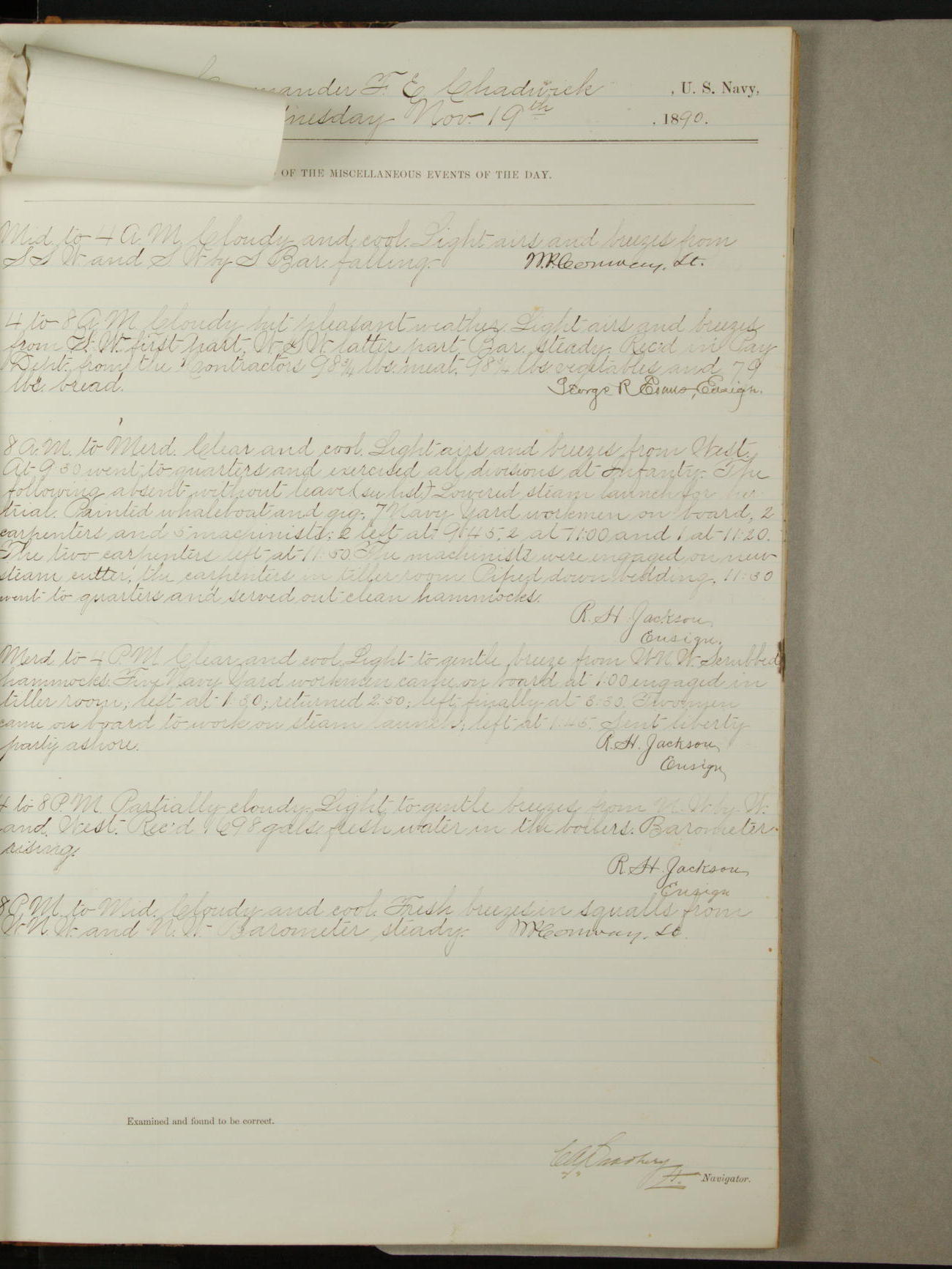 Attached to and on board of the U.S. Steamer "Yorktown", 3rd Rate, commanded by Commander F.E. Chadwick, U.S. Navy, at the time of leaving anchorage at Navy Yard League Island, Pennsylvania the 25th day of April, 1889.