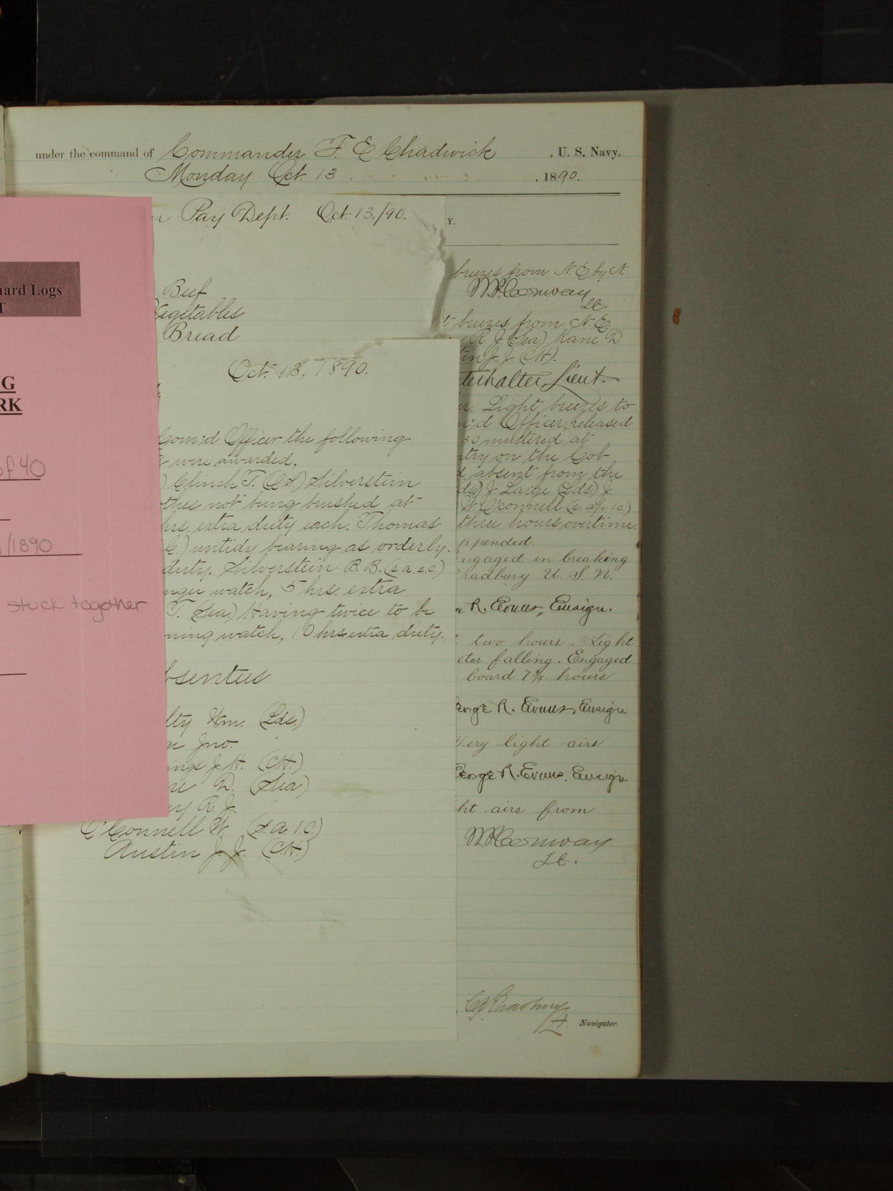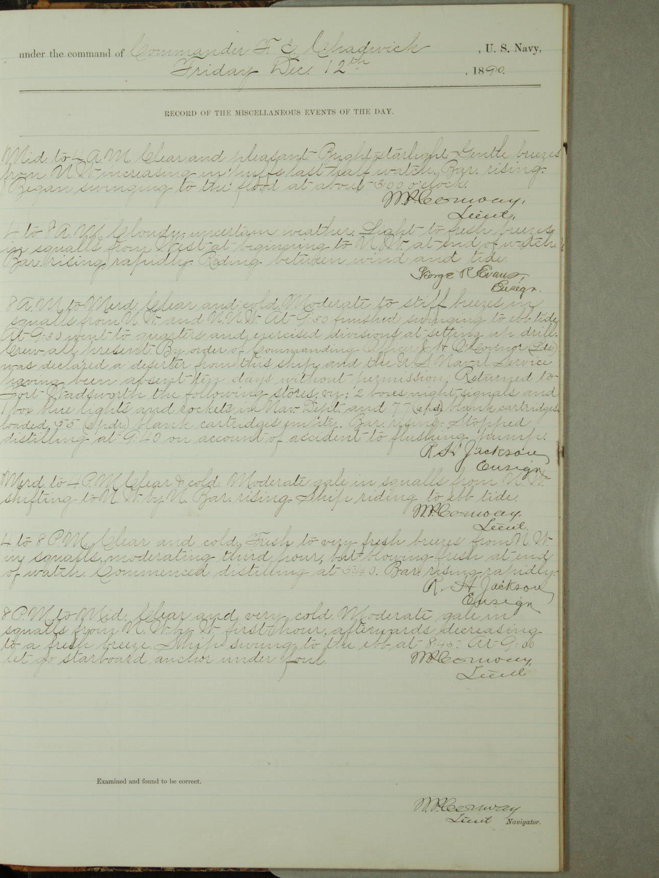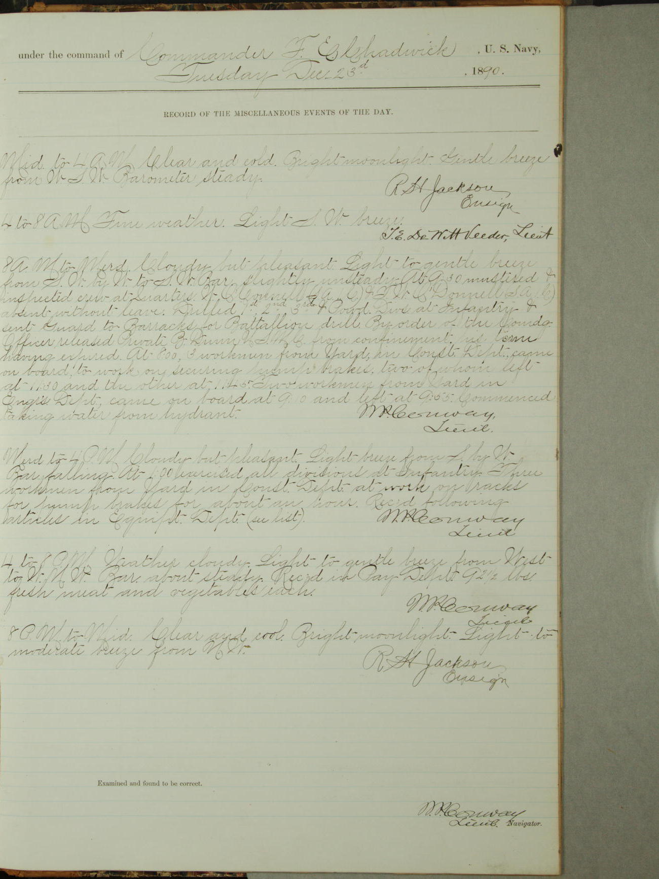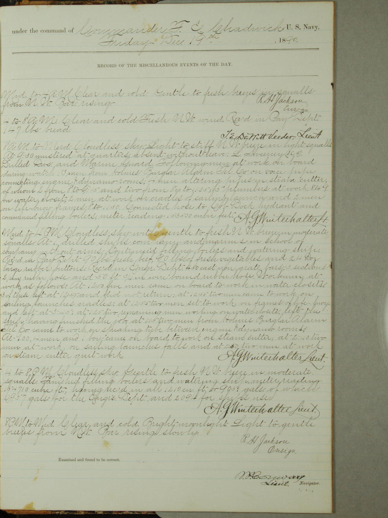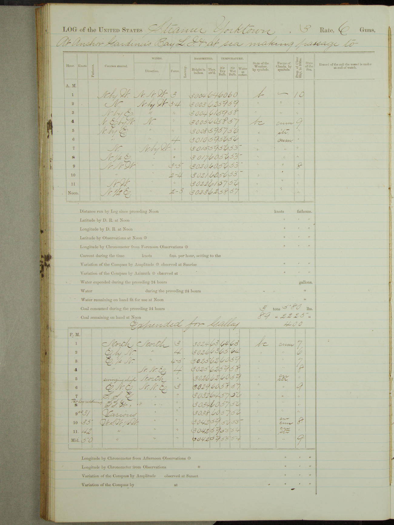 Attached to and on board of the U.S. Steamer "Yorktown", 3rd Rate, commanded by Commander F.E. Chadwick, U.S. Navy, at the time of leaving anchorage at Navy Yard League Island, Pennsylvania the 25th day of April, 1889.