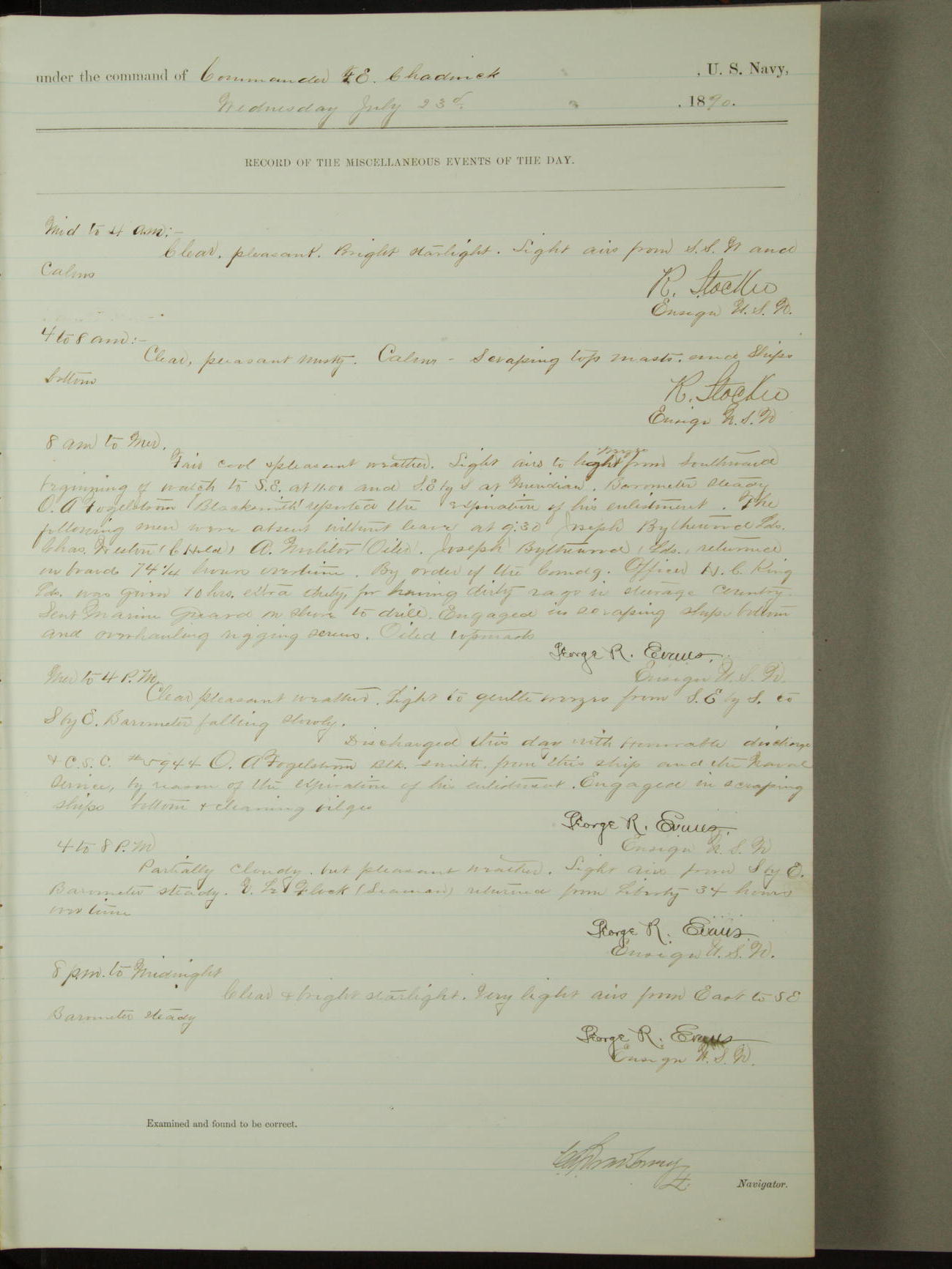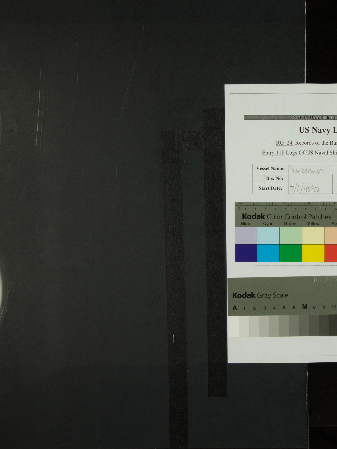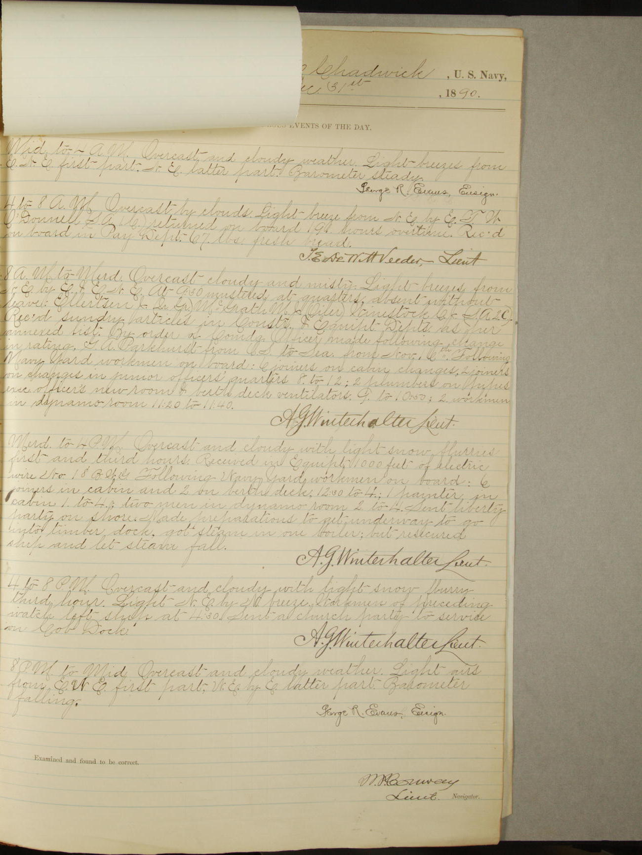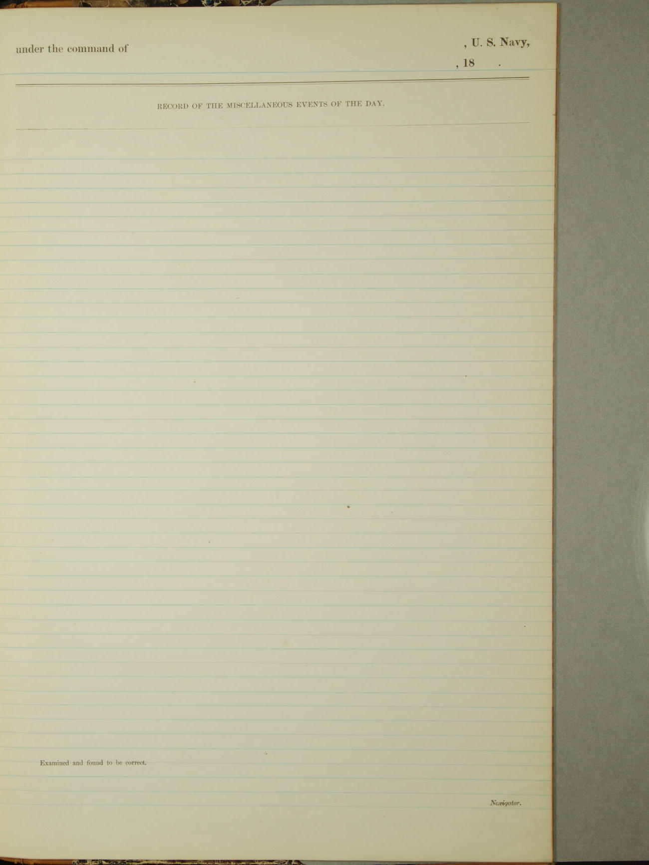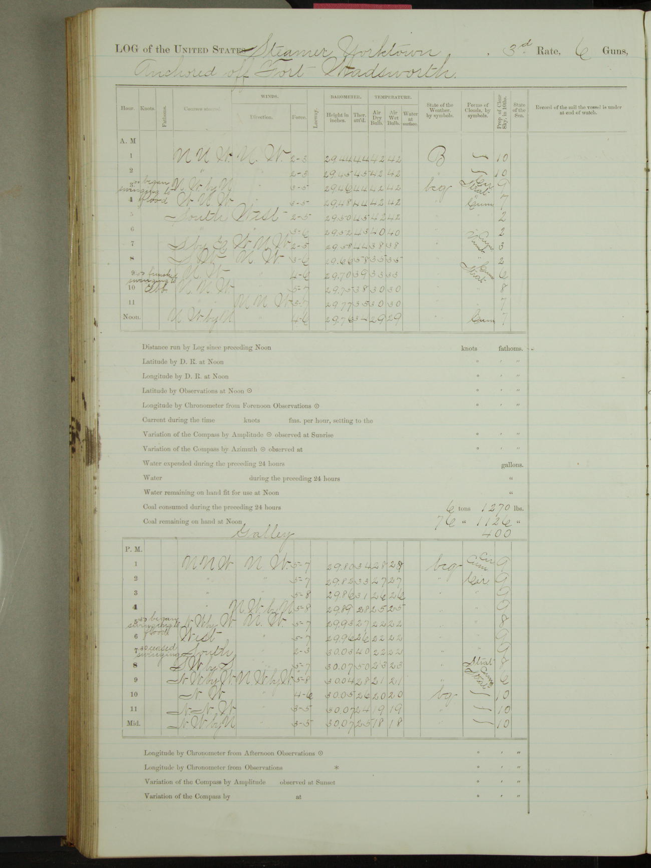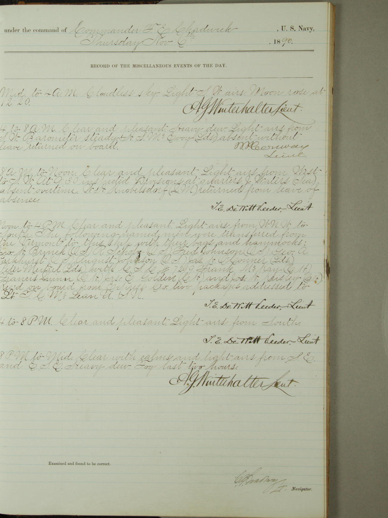 Attached to and on board of the U.S. Steamer "Yorktown", 3rd Rate, commanded by Commander F.E. Chadwick, U.S. Navy, at the time of leaving anchorage at Navy Yard League Island, Pennsylvania the 25th day of April, 1889.