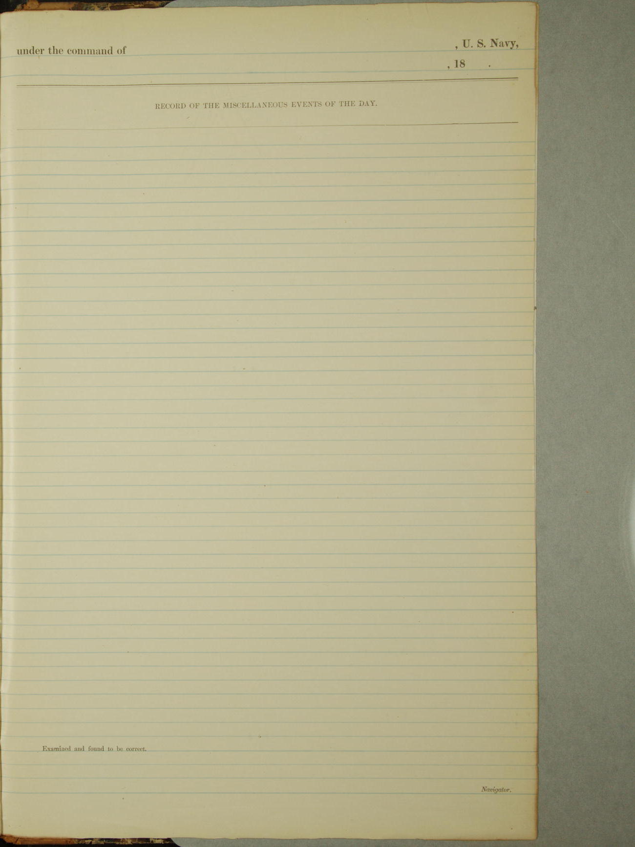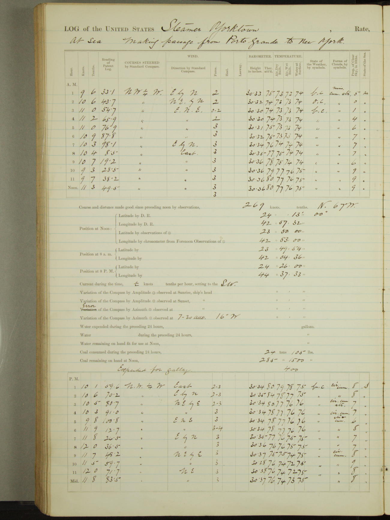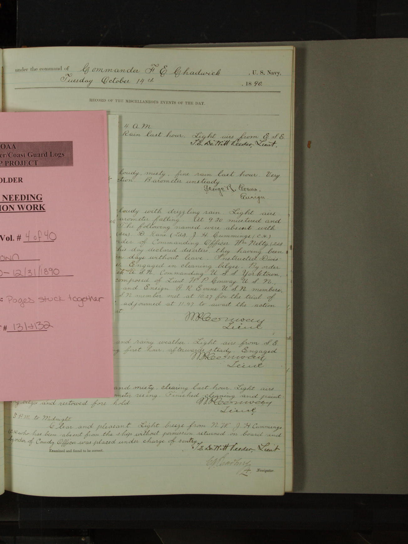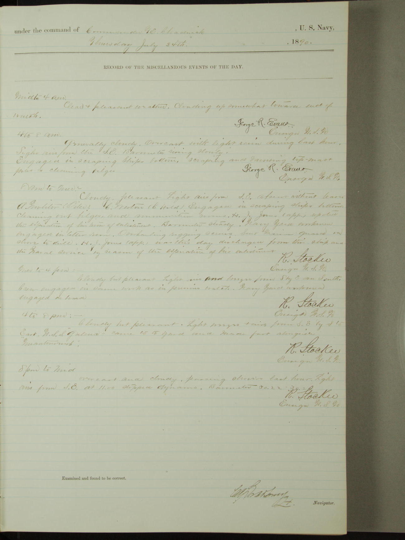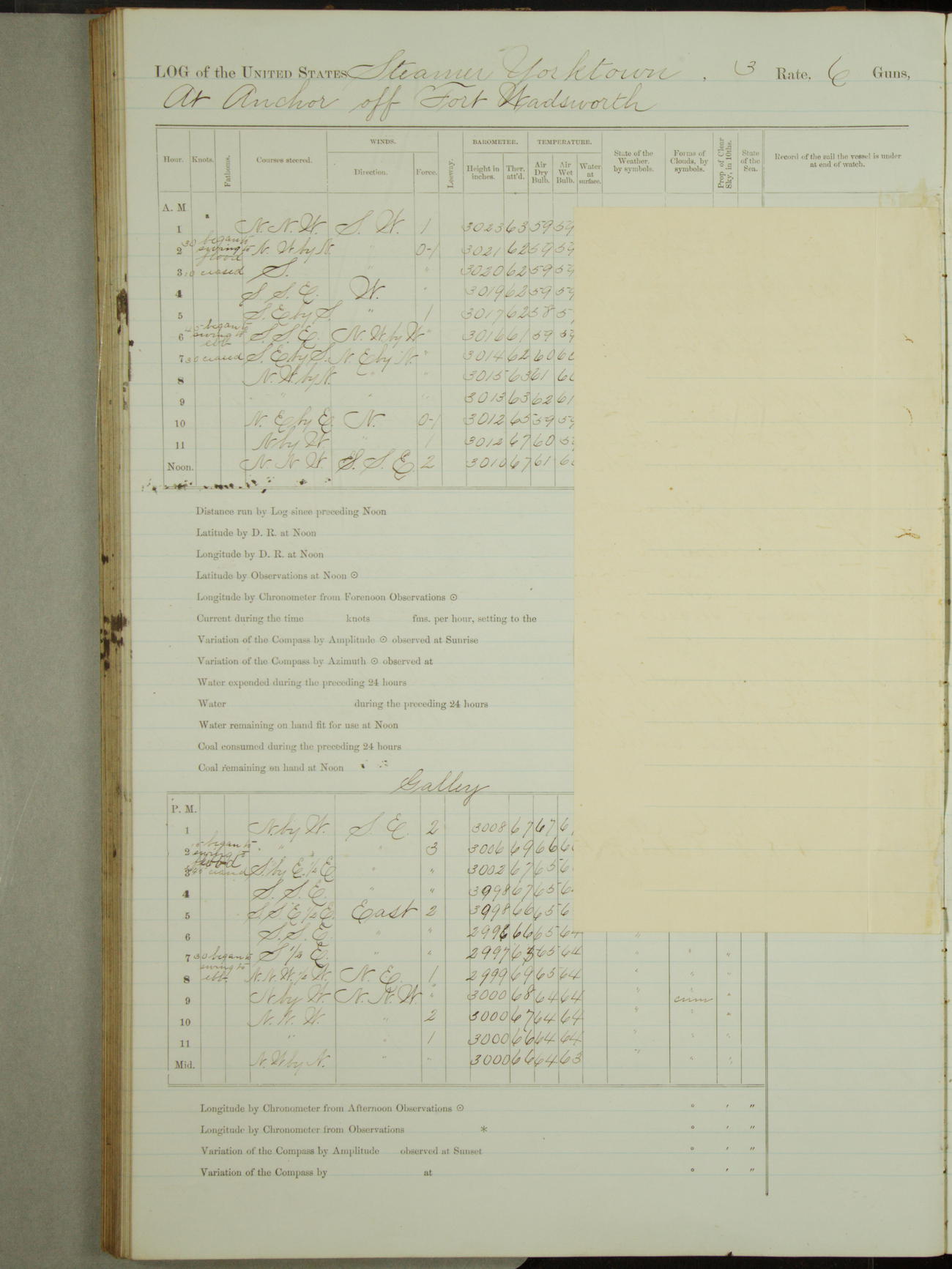 Attached to and on board of the U.S. Steamer "Yorktown", 3rd Rate, commanded by Commander F.E. Chadwick, U.S. Navy, at the time of leaving anchorage at Navy Yard League Island, Pennsylvania the 25th day of April, 1889.