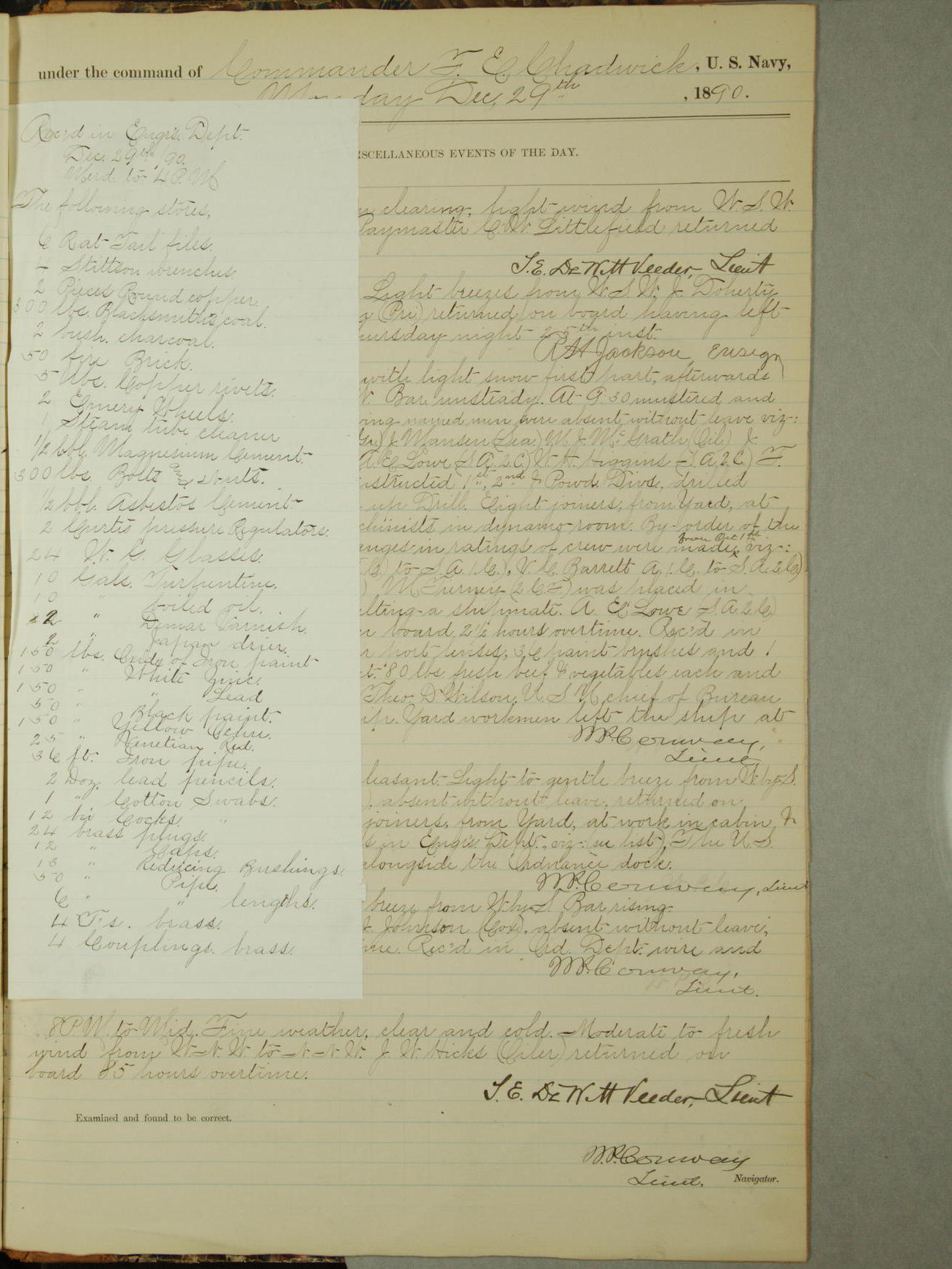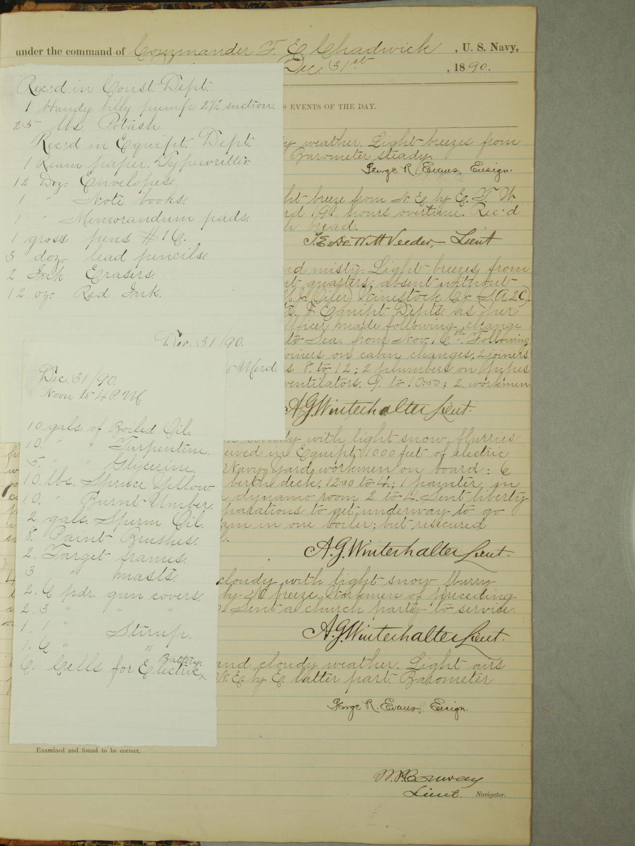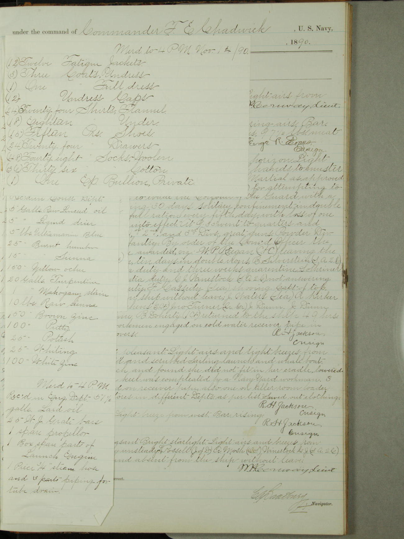 December 31, 1890, noon to 4pm: 10 gallons of boiled oil; 10 gallons of turpentine; 5 gallons of glycerin; 10 pounds spruce yellow; 10 pounds burnt umber; 2 gallons sperm oil; 8 paint brushes; 2 target frames; 3 target masts; 2 6-pounder gun covers; 2 3-pounder gun covers; 1 1-pounder stirrup; 1 6-pounder stirrups; 6 cells for electric battery.