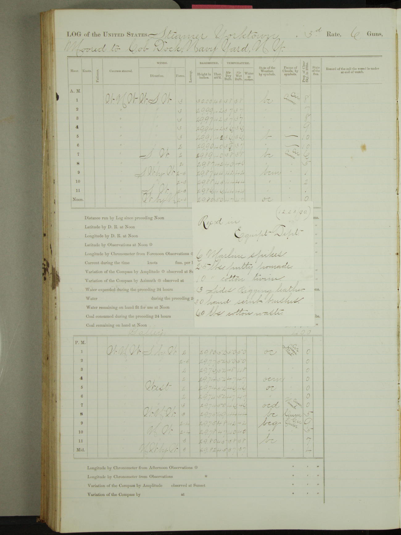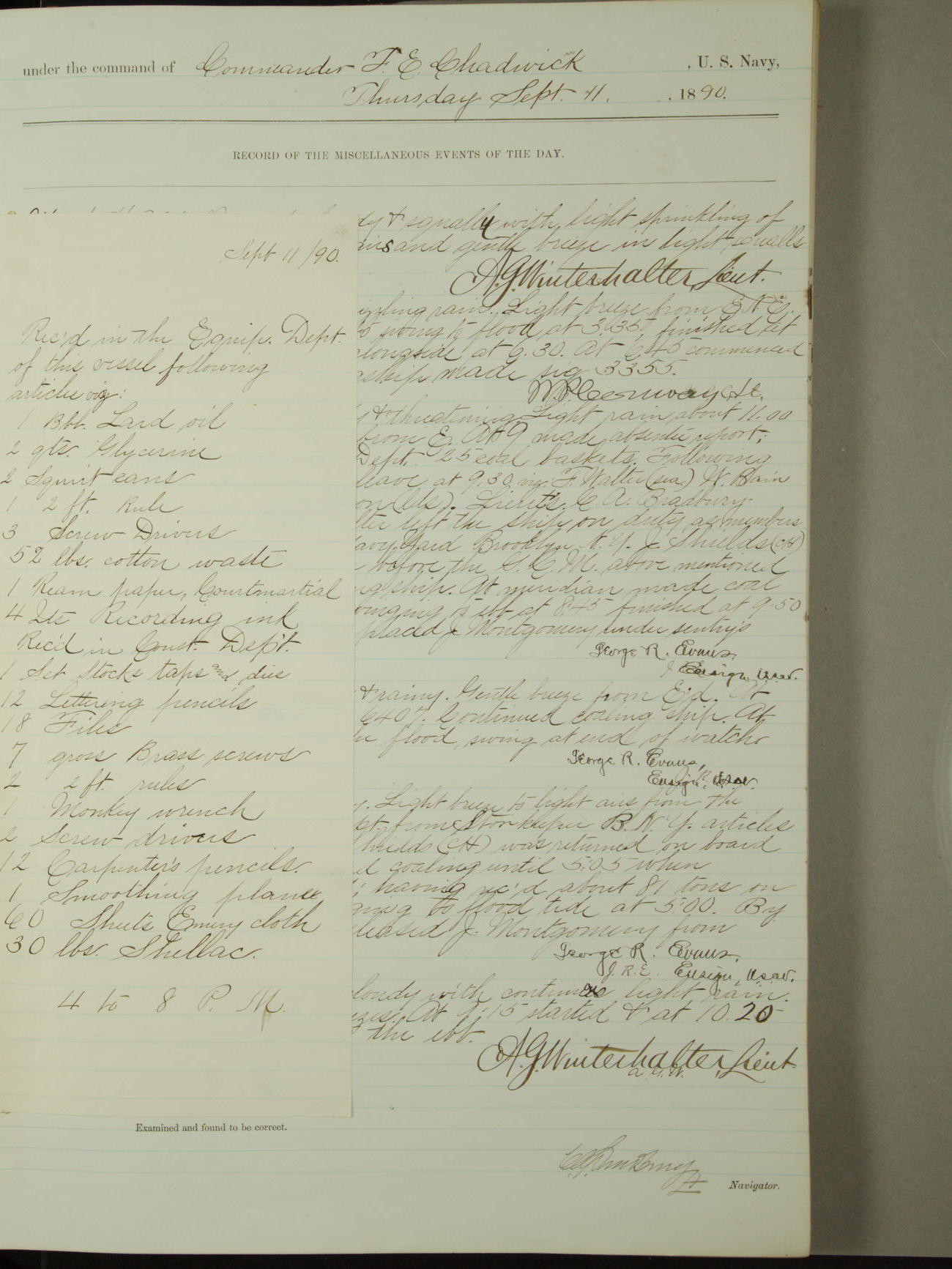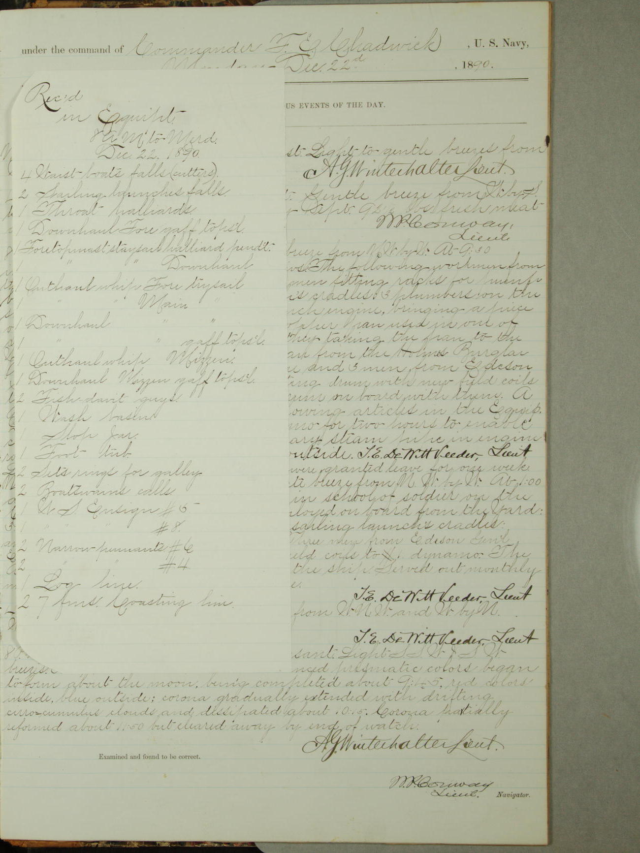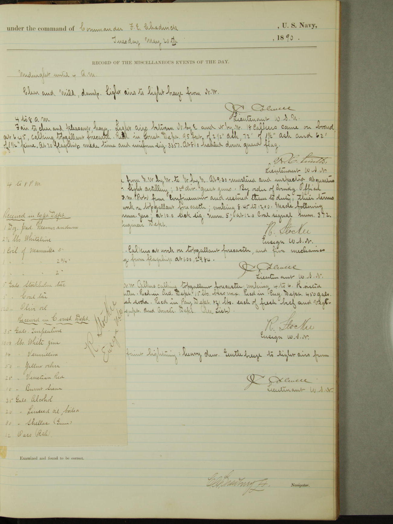 December 31, 1890, noon to 4pm: 10 gallons of boiled oil; 10 gallons of turpentine; 5 gallons of glycerin; 10 pounds spruce yellow; 10 pounds burnt umber; 2 gallons sperm oil; 8 paint brushes; 2 target frames; 3 target masts; 2 6-pounder gun covers; 2 3-pounder gun covers; 1 1-pounder stirrup; 1 6-pounder stirrups; 6 cells for electric battery.
