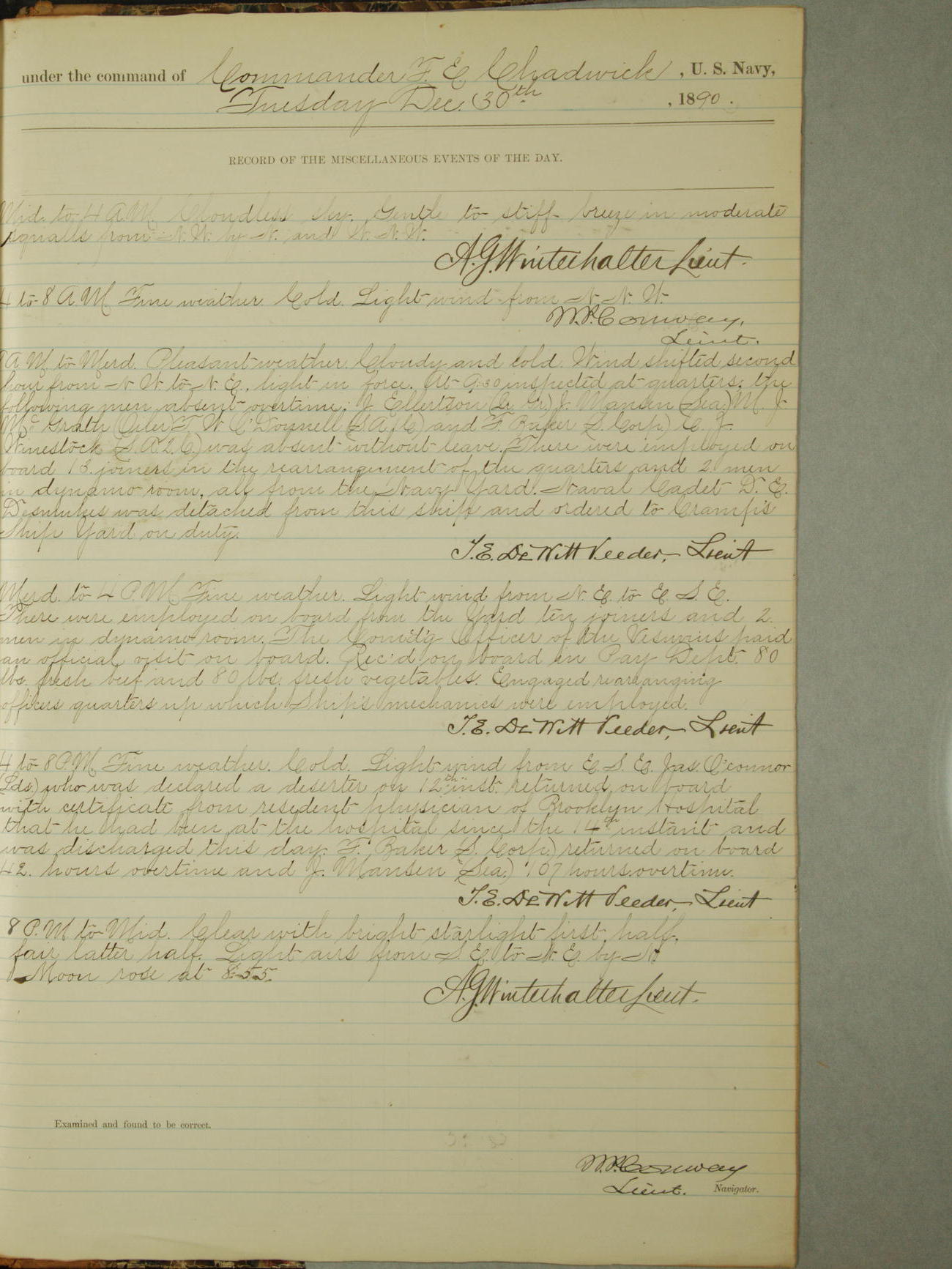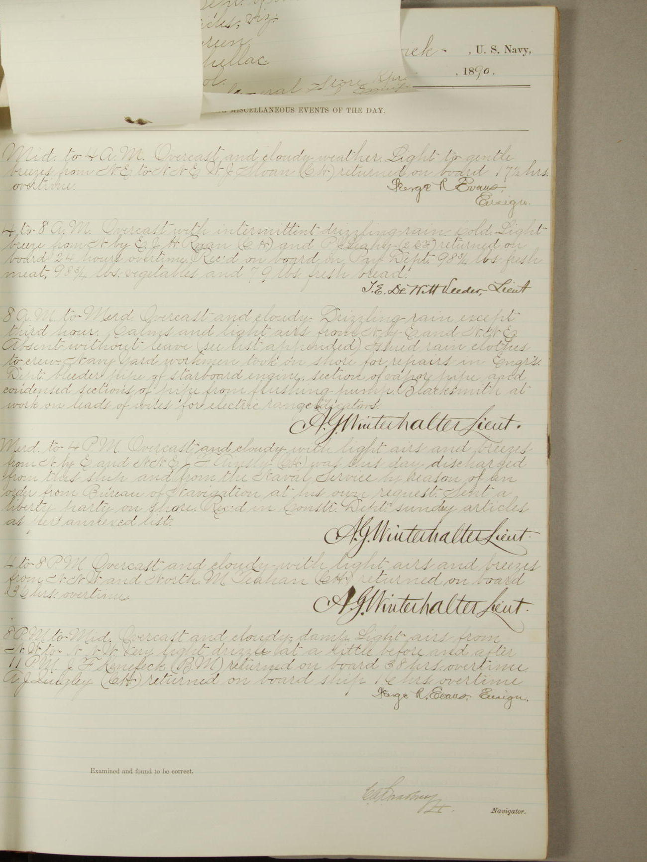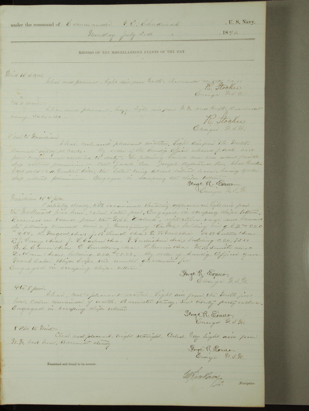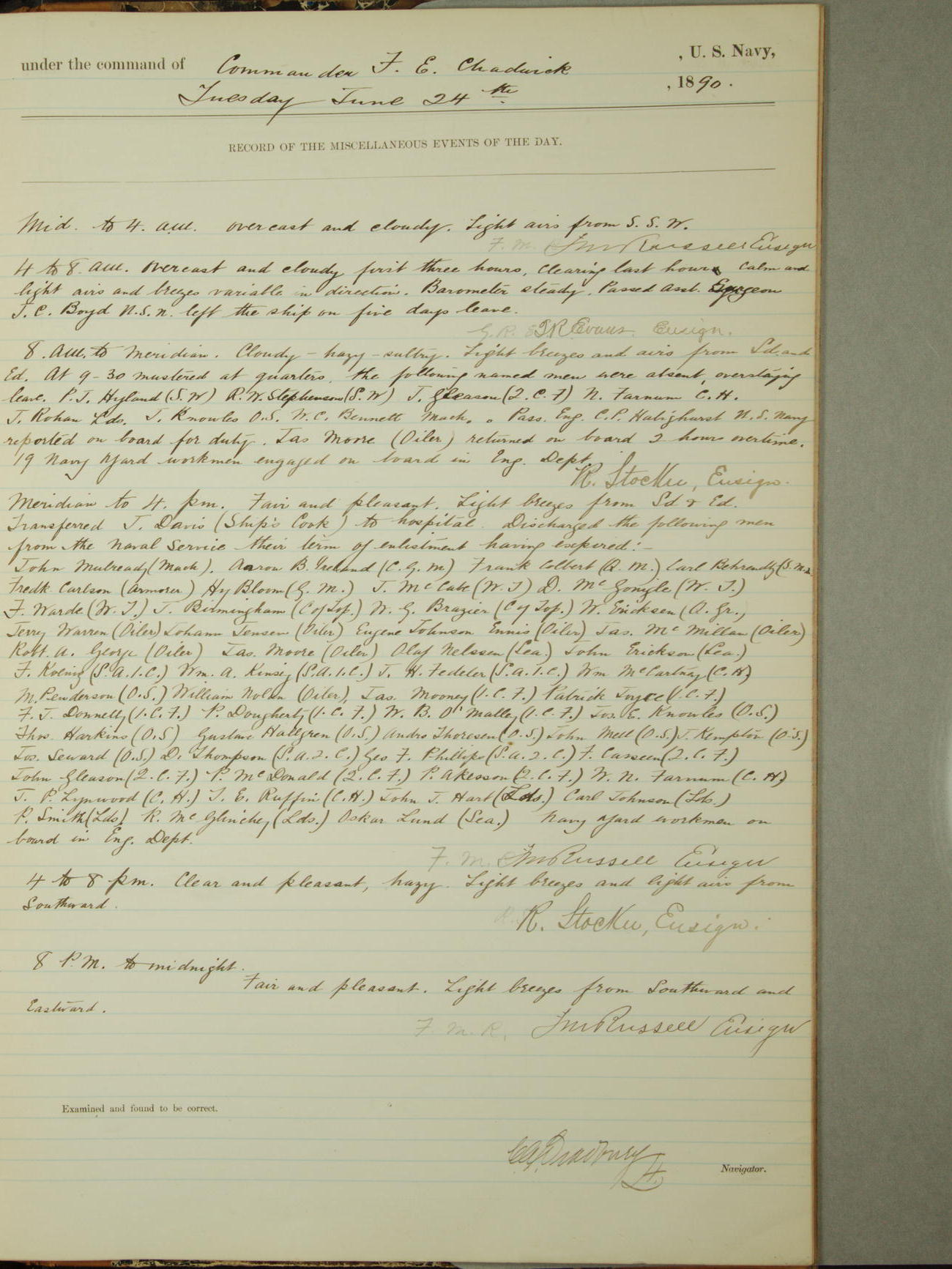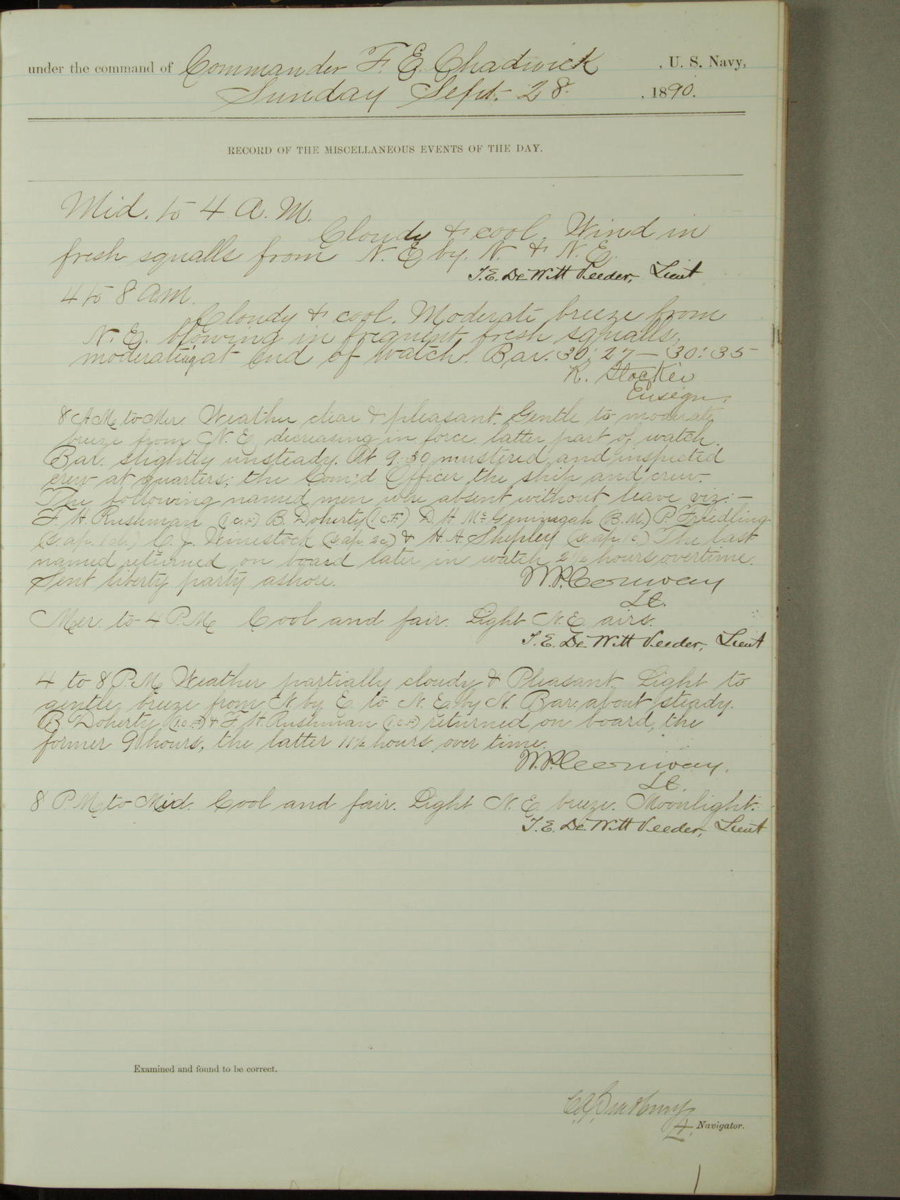 At 9.30am inspected at quarters, the following men absent overtime: J. Ellertson, Quarter Gunner, J. Mansen, Seaman, M.J. McGrath, Oiler, T.W. O'Donnell, Seaman Apprentice First-class, and F. Baker, Ship's Corporal.