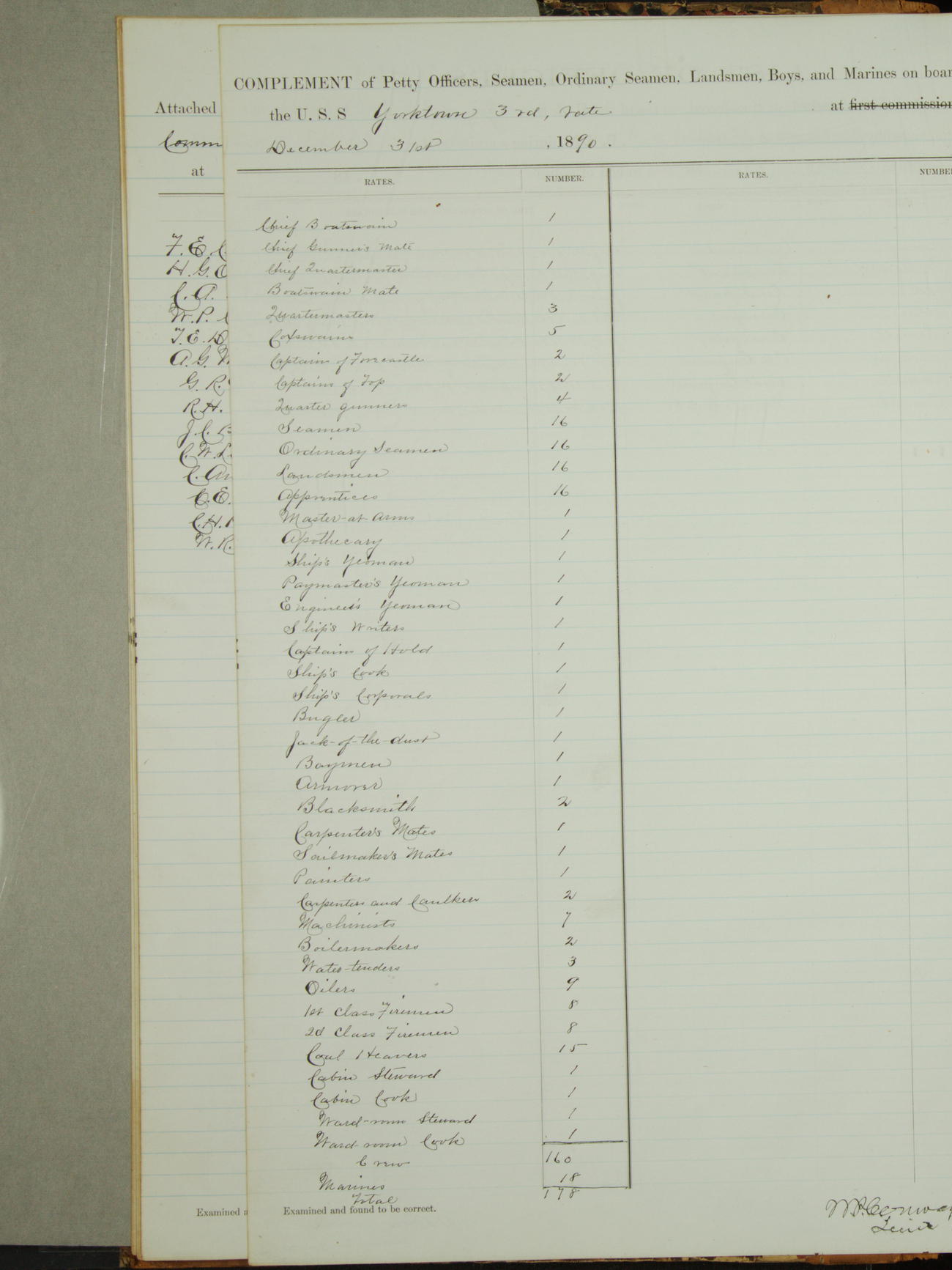 Complement of Petty Officers, Seamen, Ordinary Seamen, Landsmen, Boys, and Marines on board of U.S. Steamer "Yorktown", 3rd Rate, at first commissioning, 23rd April, 1889, Navy Yard League Island, Pennsylvania.