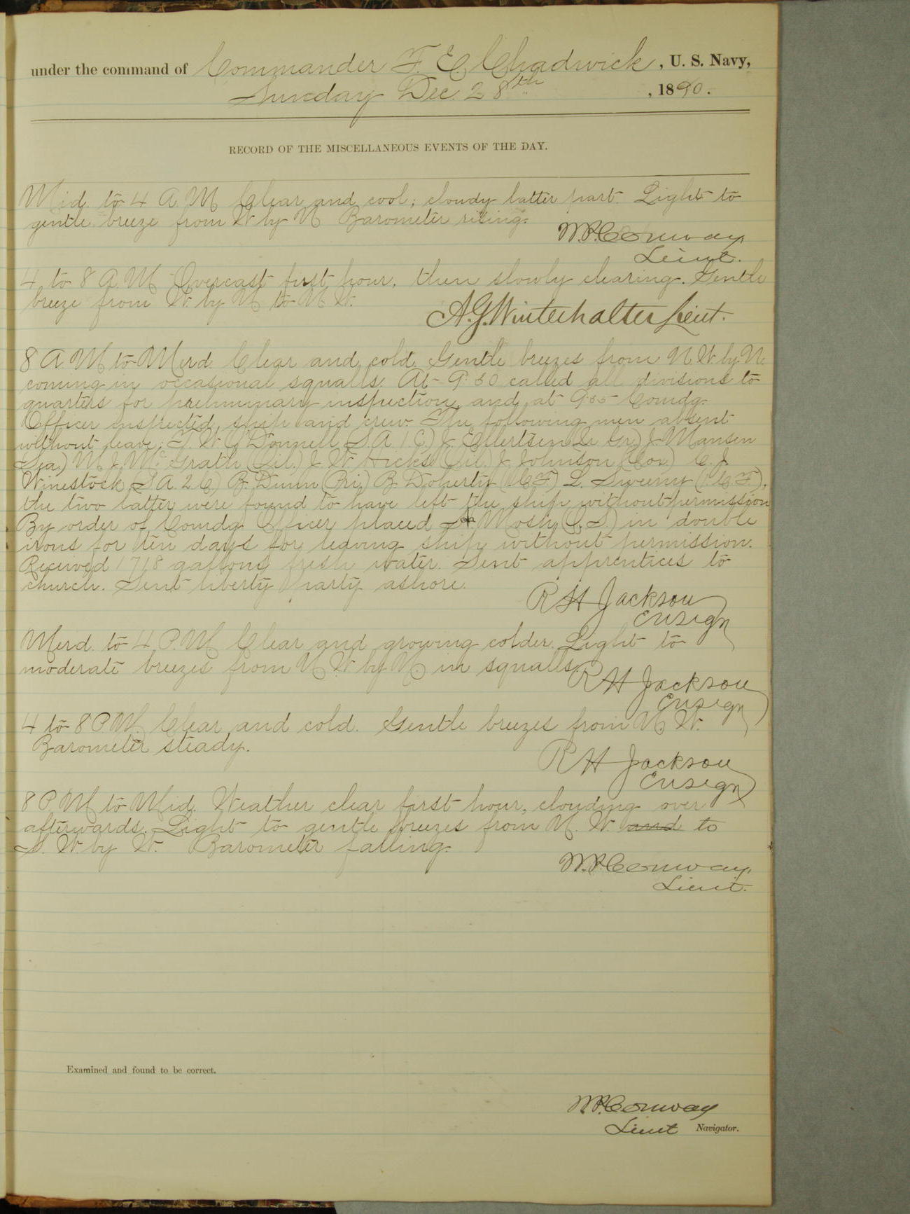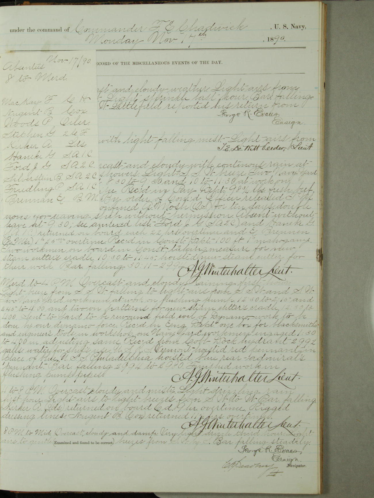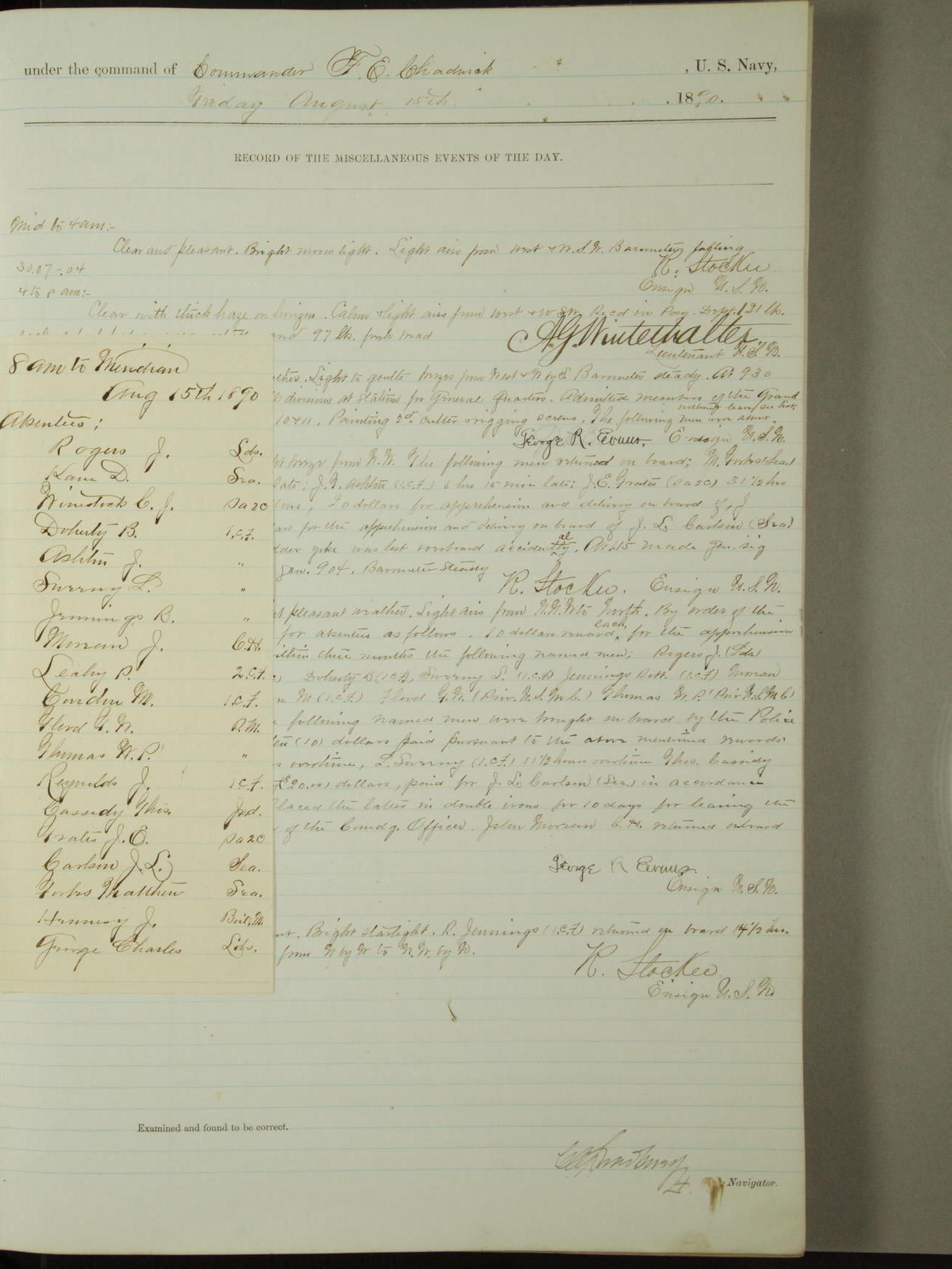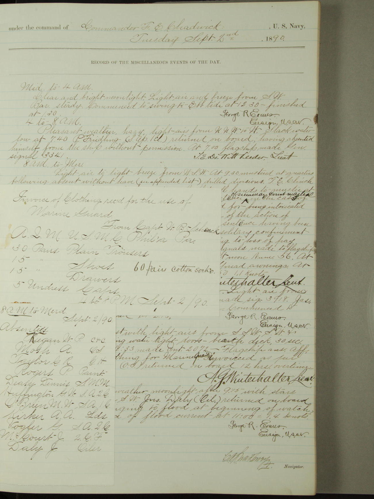 At 9.30am mustered at quarters, absent without leave: J. Ellertsen, Quarter Gunner, M.J. McGrath, Oiler, and C.J. Winestock, Seaman Apprentice Second-class.