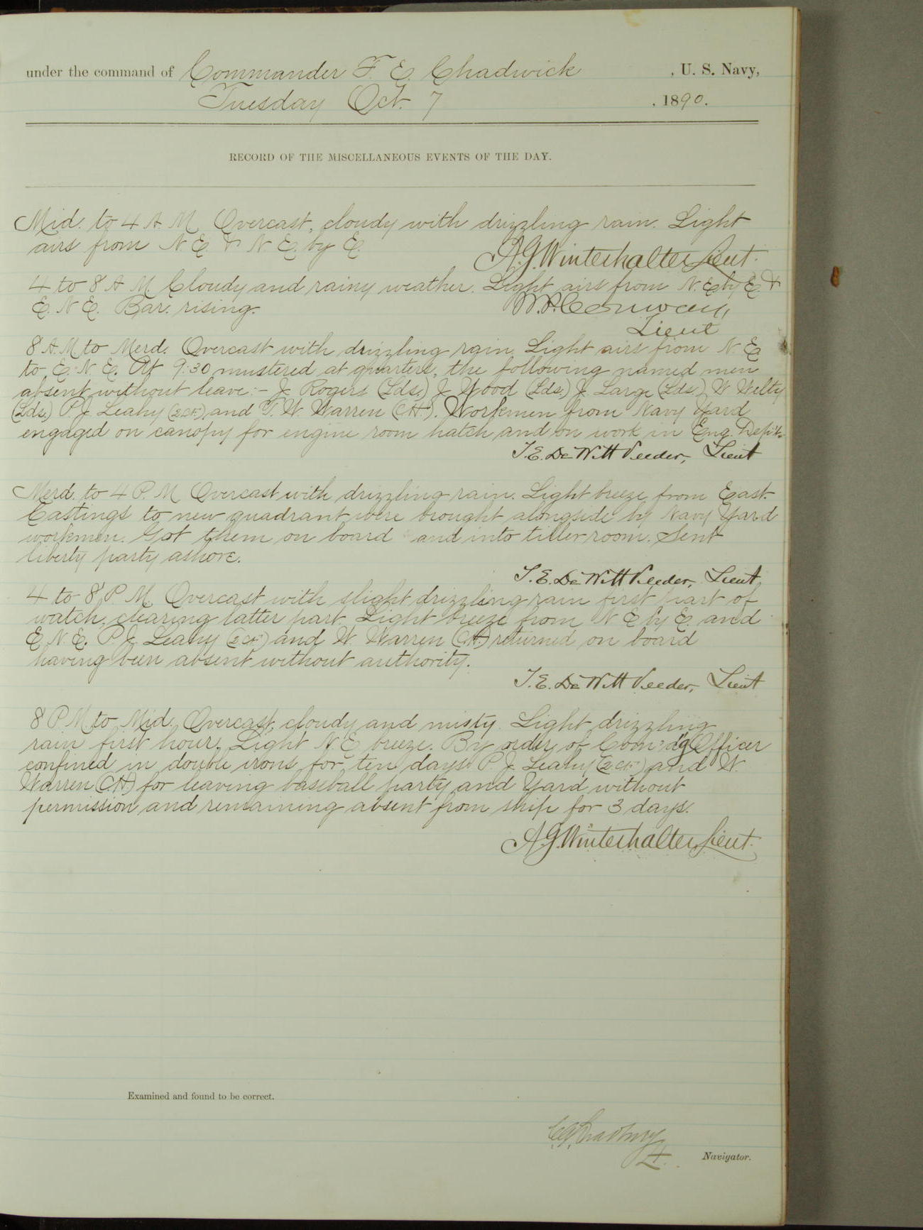 The following named men were absent without leave, namely: T.W. O'Donnell, Seaman Apprentice First-class, J. Ellertsen, Quarter Gunner, J. Mansen, Seaman, M.J. McGrath, Oiler, J. Johnson, Coxswain, C.J. Winestock, Seaman Apprentice Second-class, A.E. Lowe, Seaman Apprentice Second-class, W.H. Higgins, Seaman Apprentice Second-class, F. Baker, Ship's Corporal, and J.W. Hicks, Oiler.