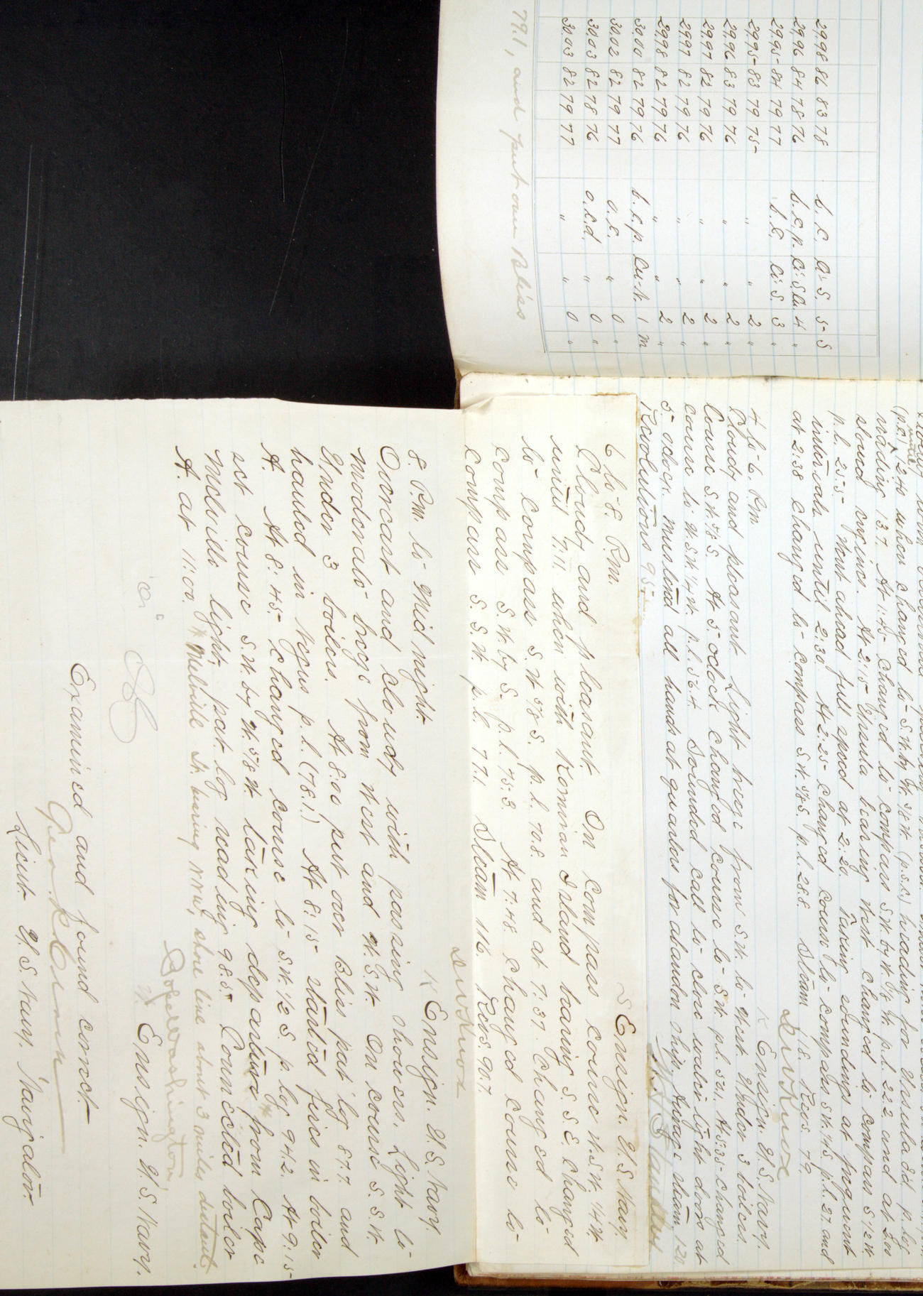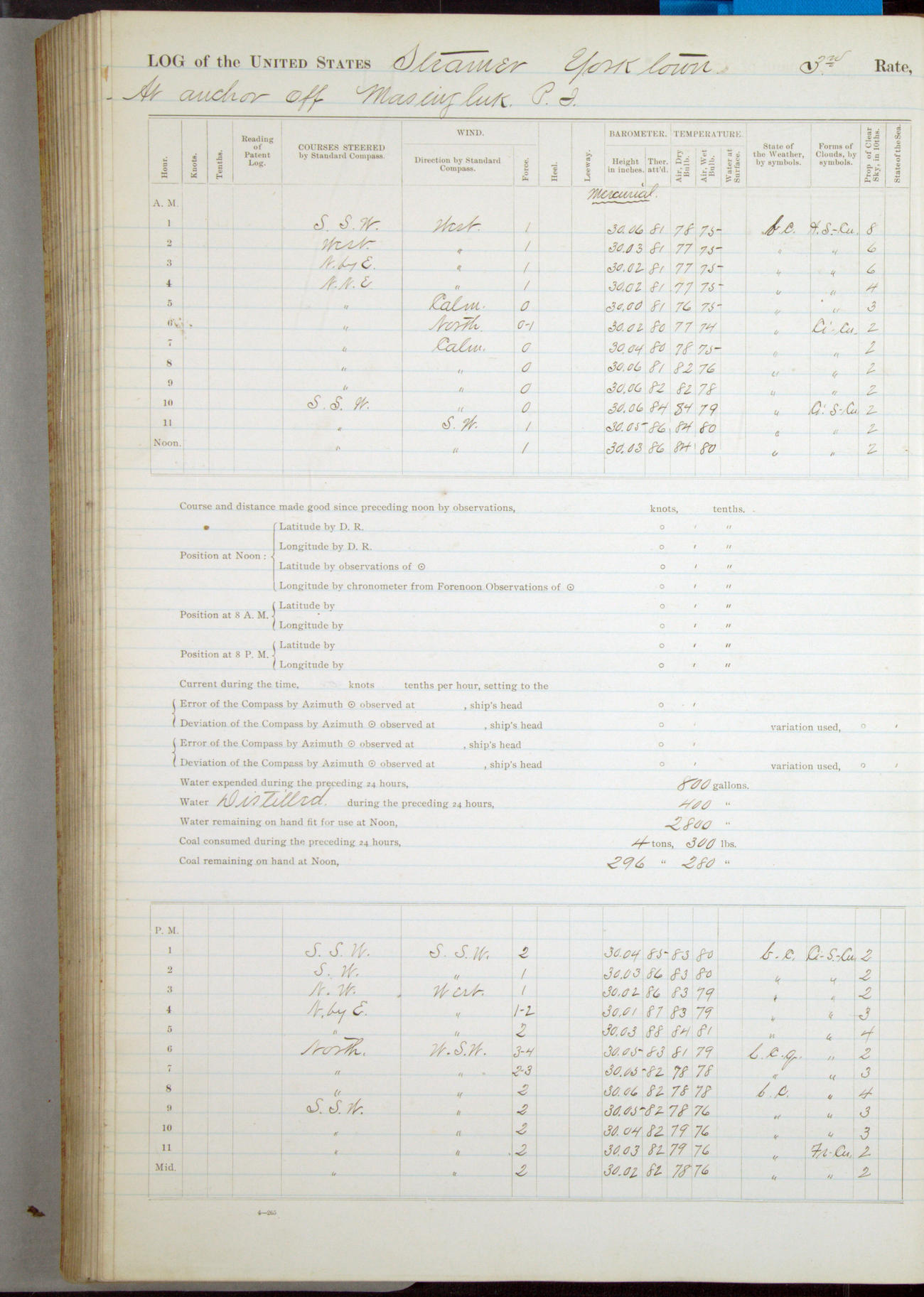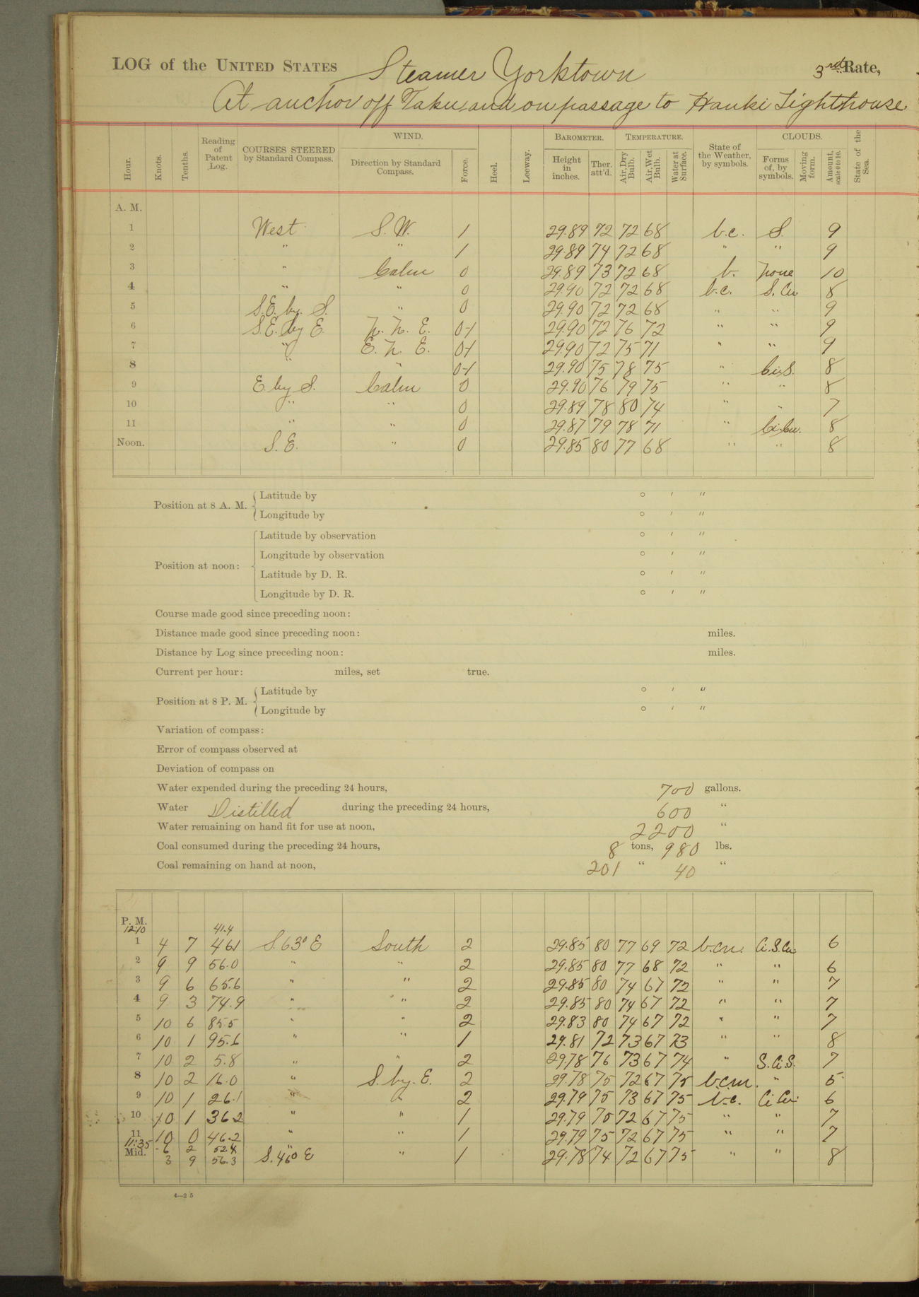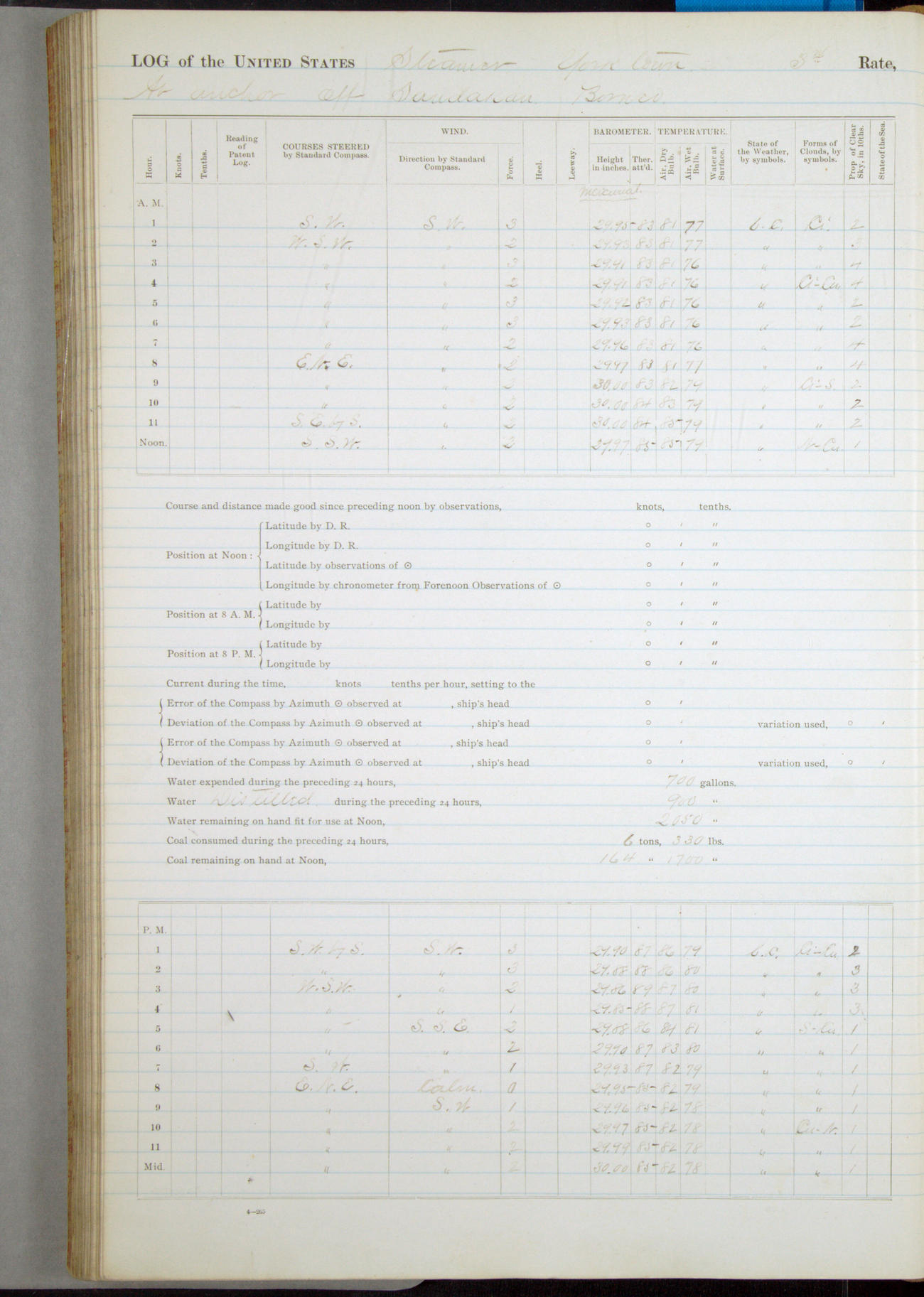 Ship under [steam from] 3 boilers and starboard engine while under way.