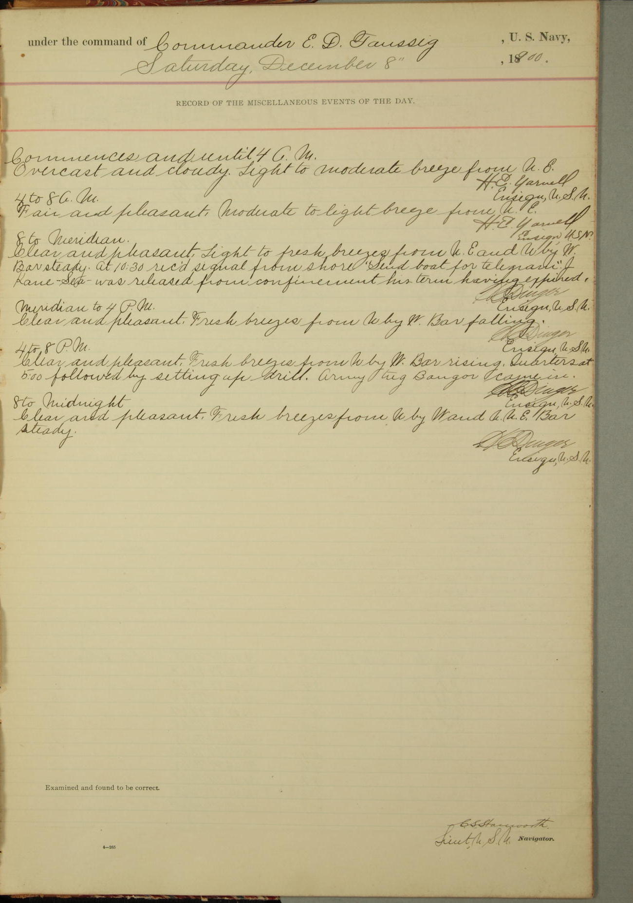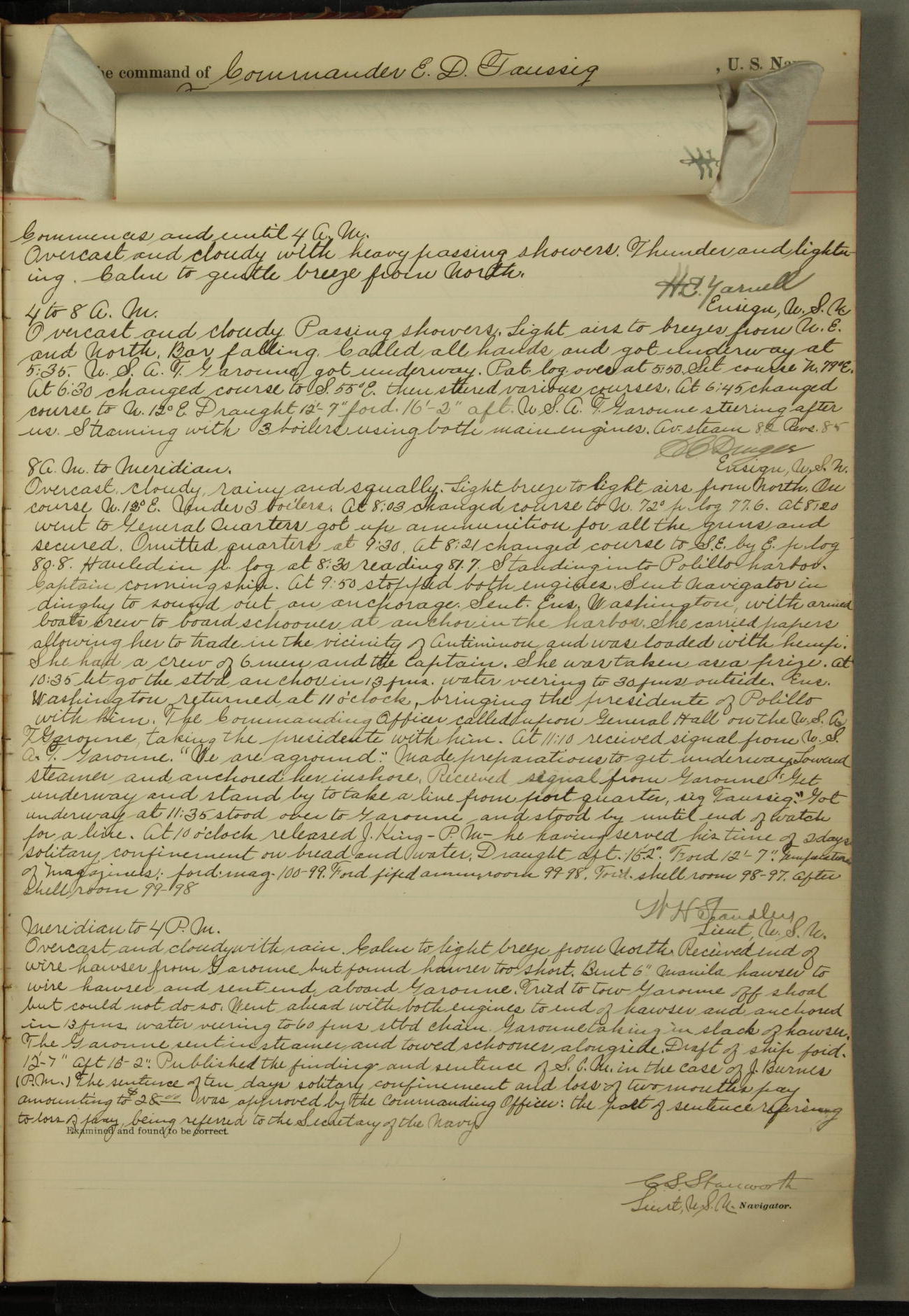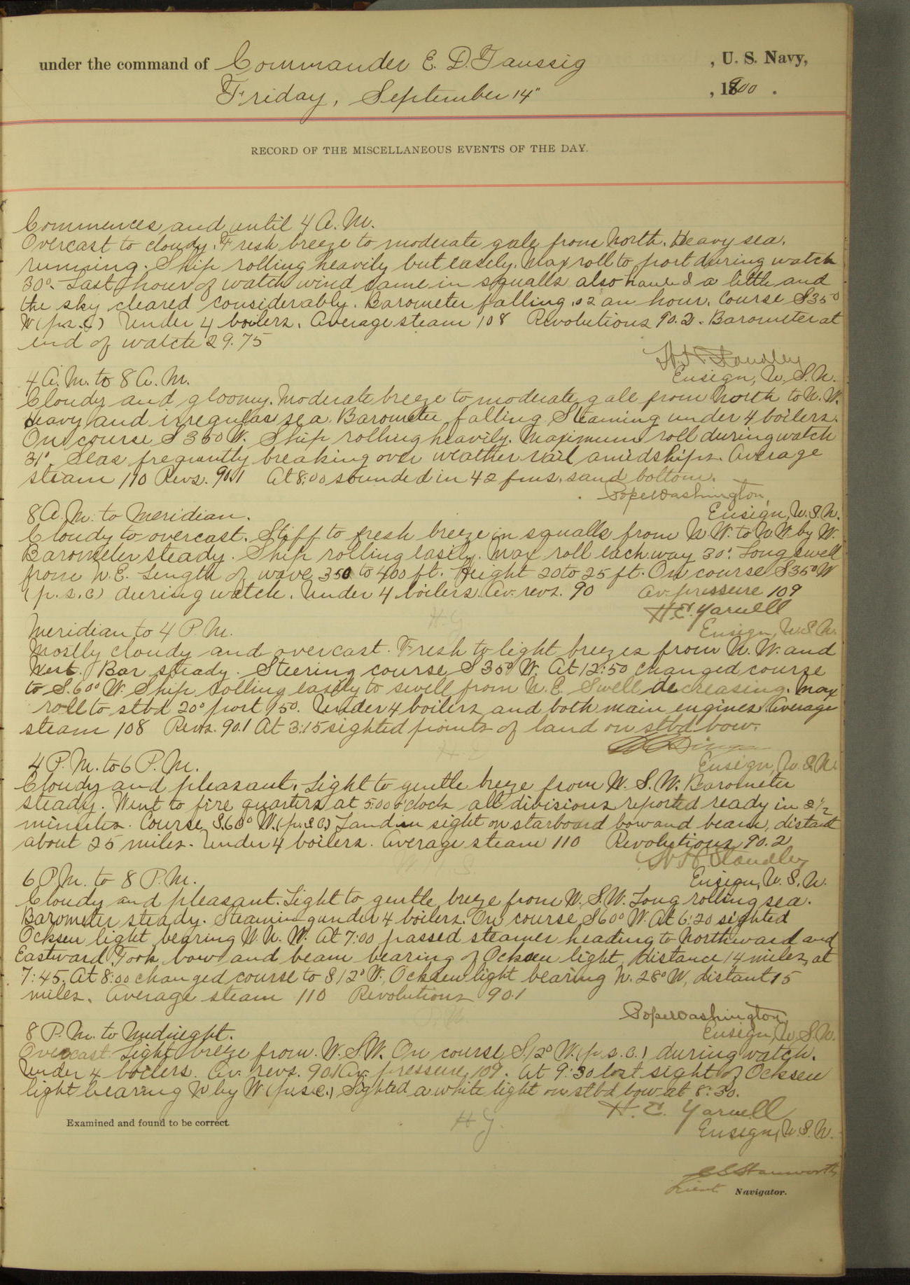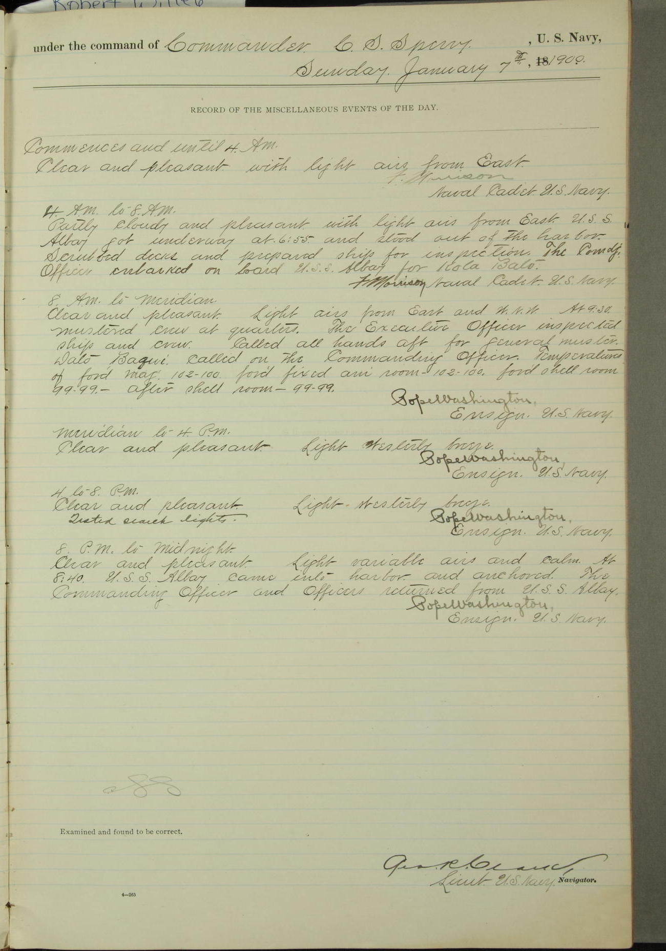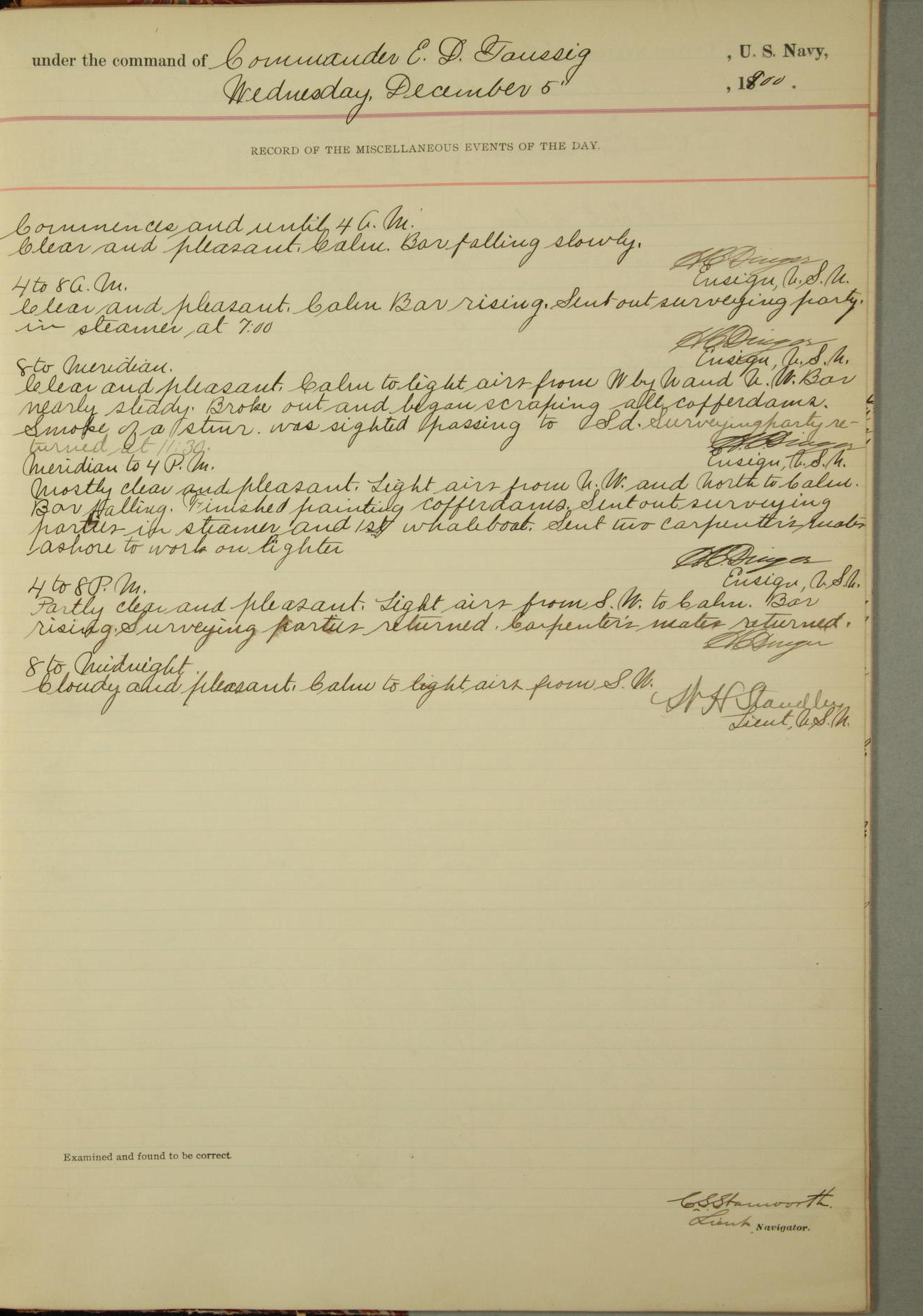 [In red, probably because of a sudden jump of 0.31 inches at 5.00am:] Many of the barometer readings of the first half of this day are obviously wrong, [signed] C.S. Sperry.