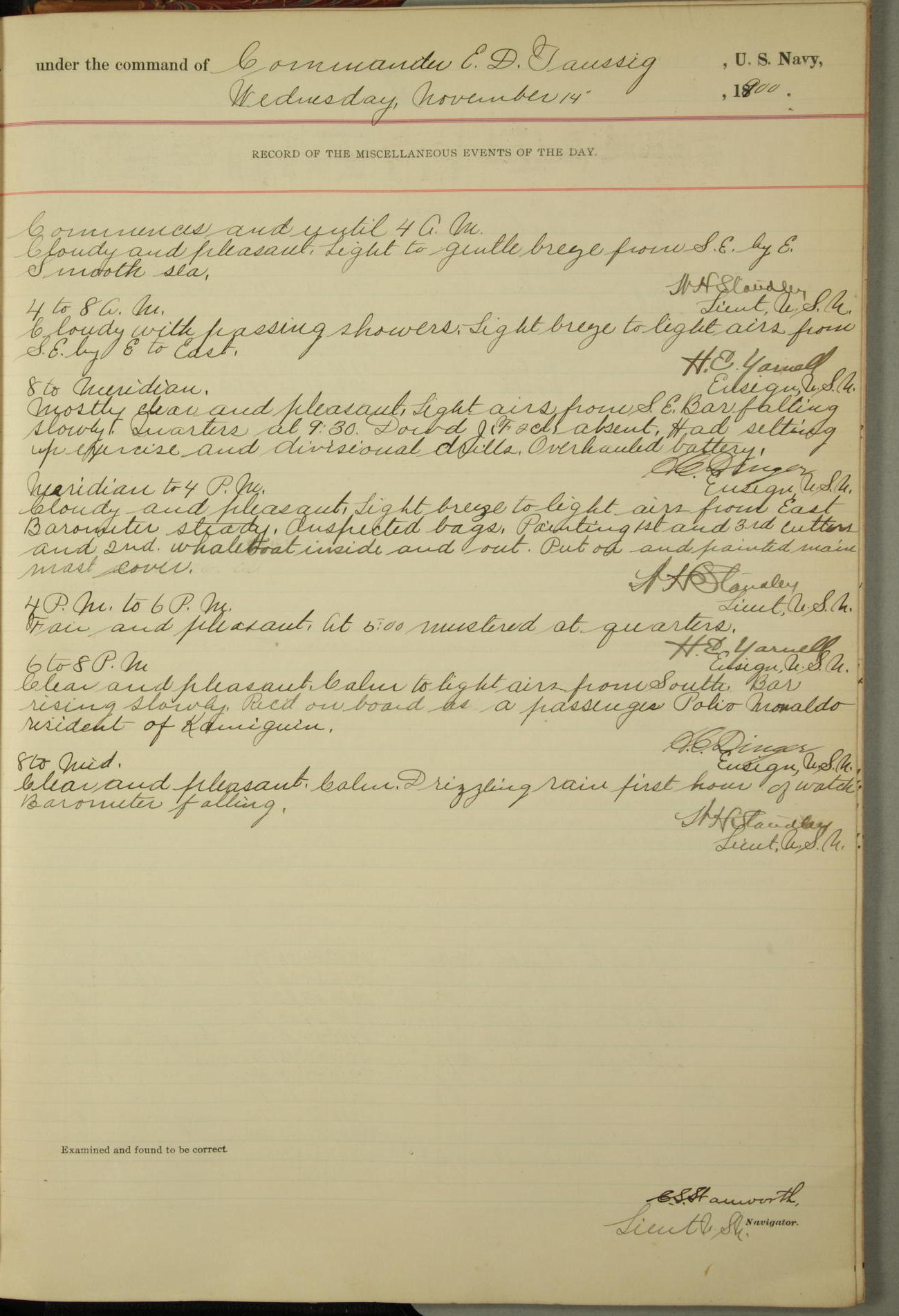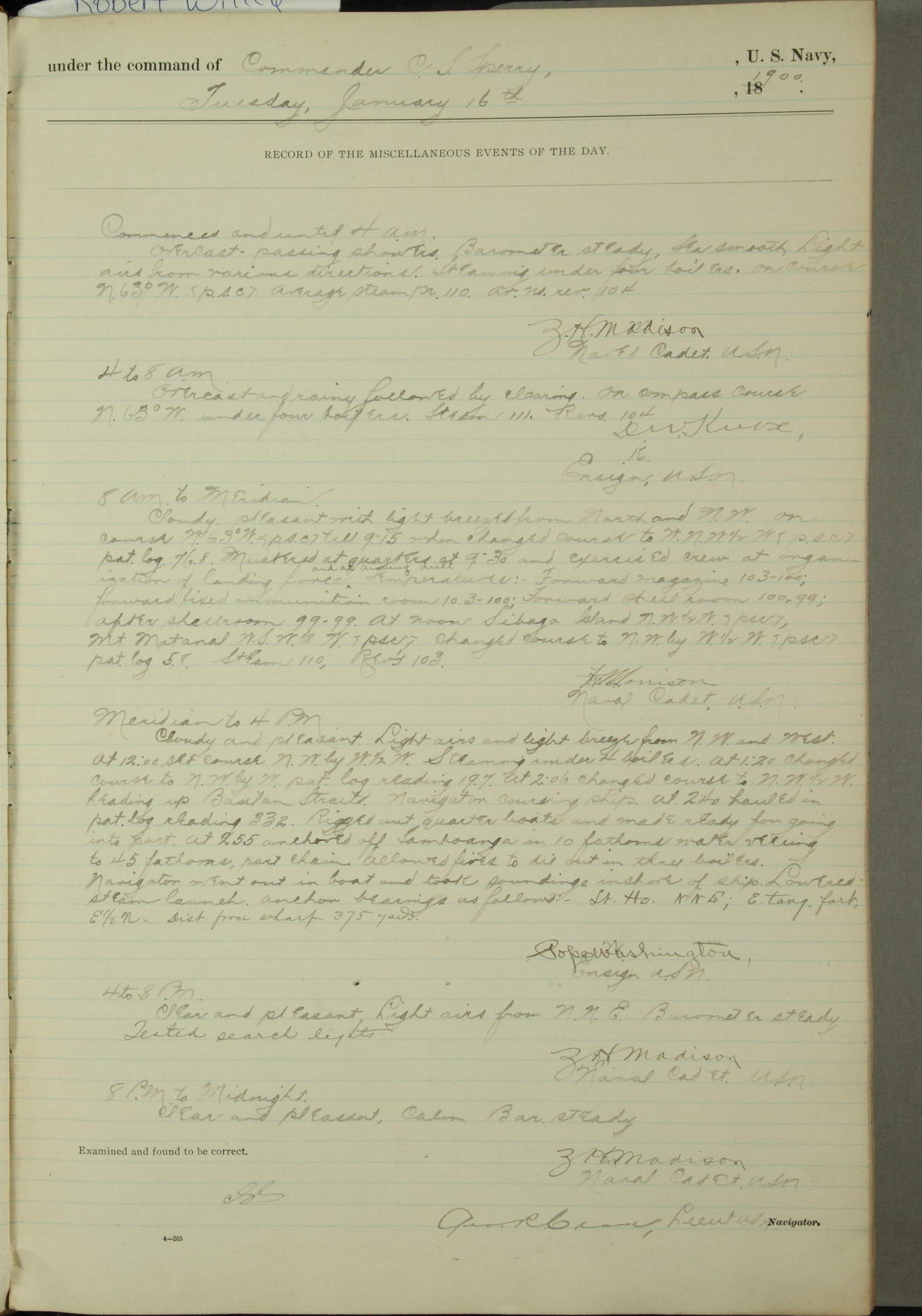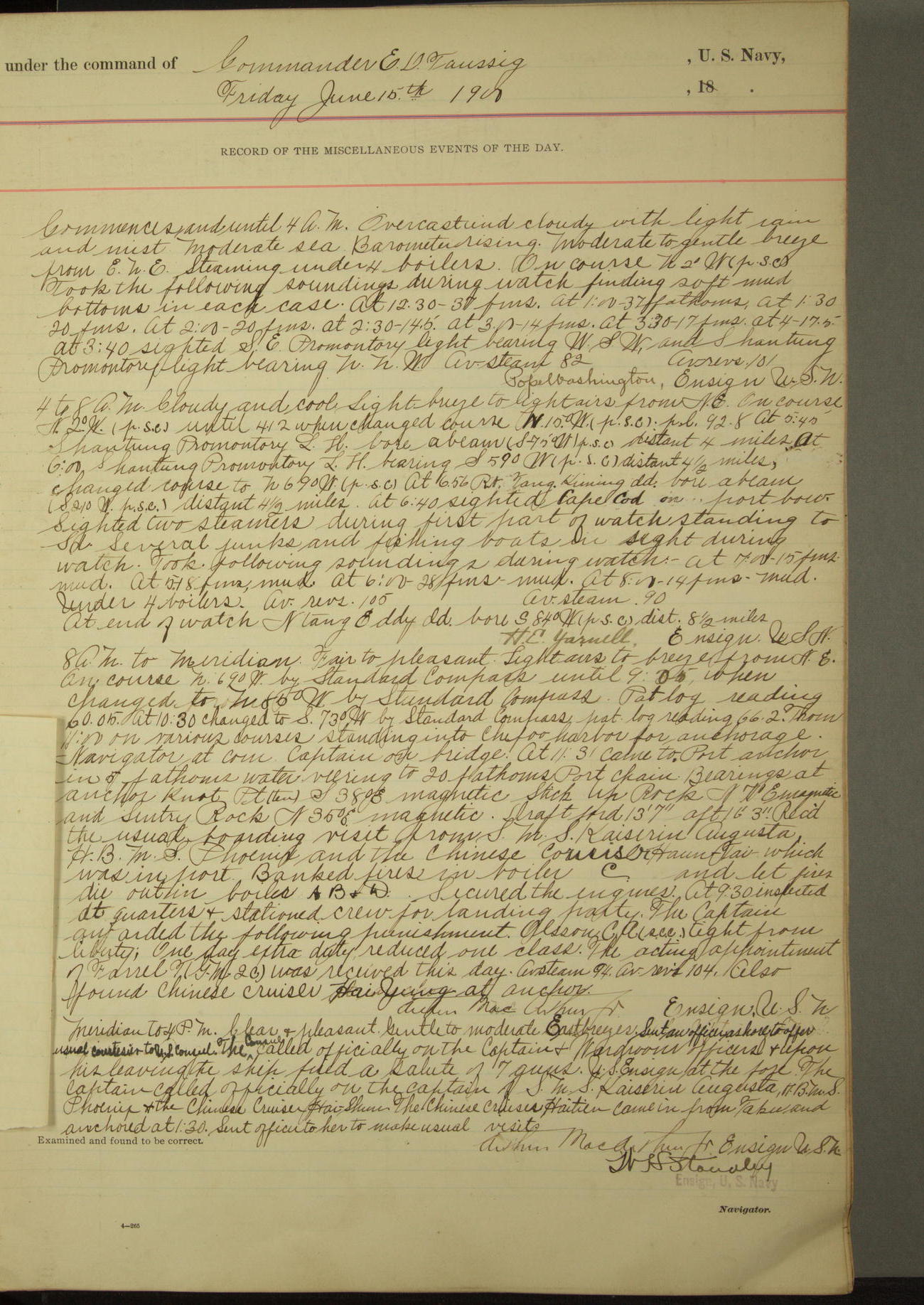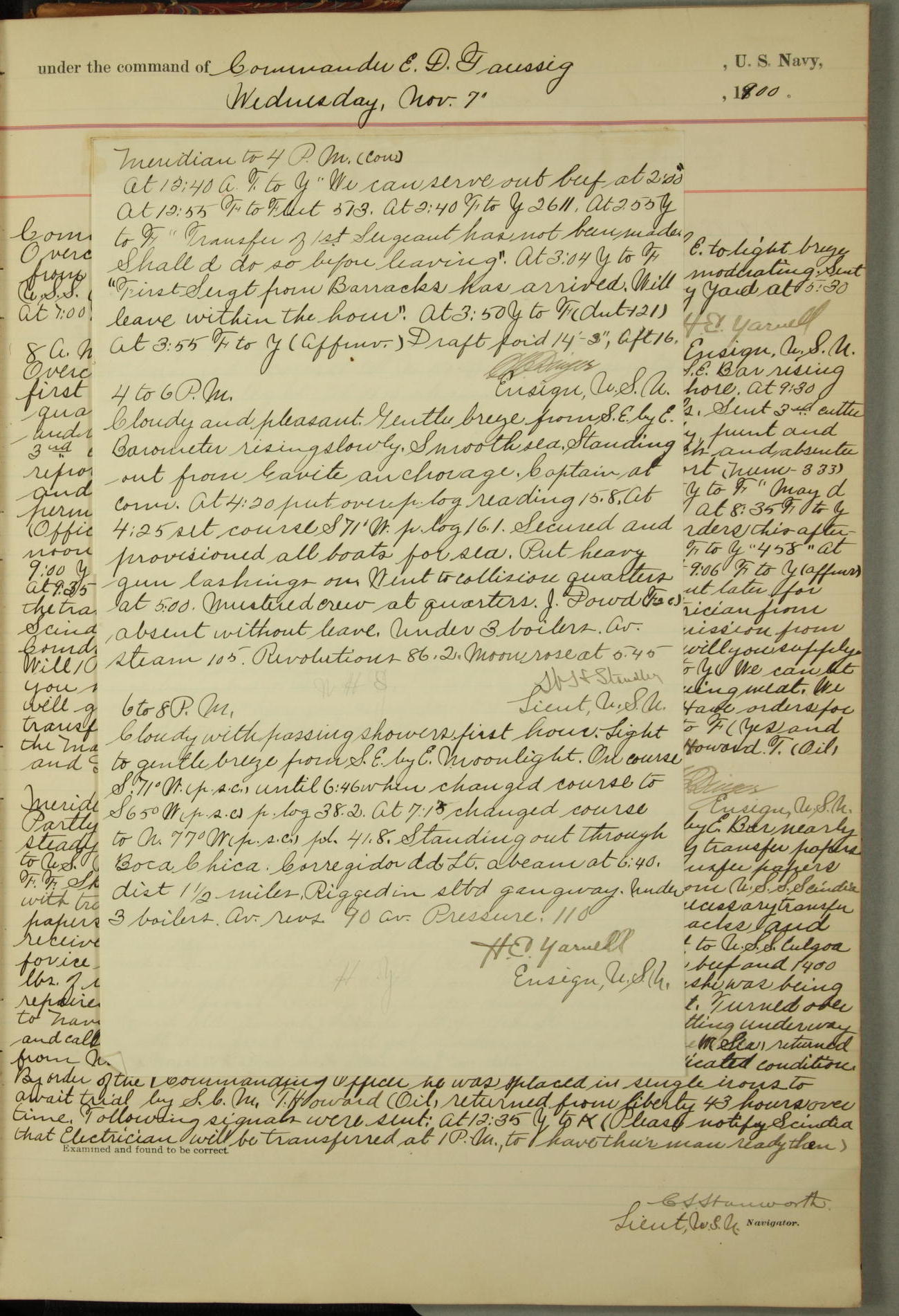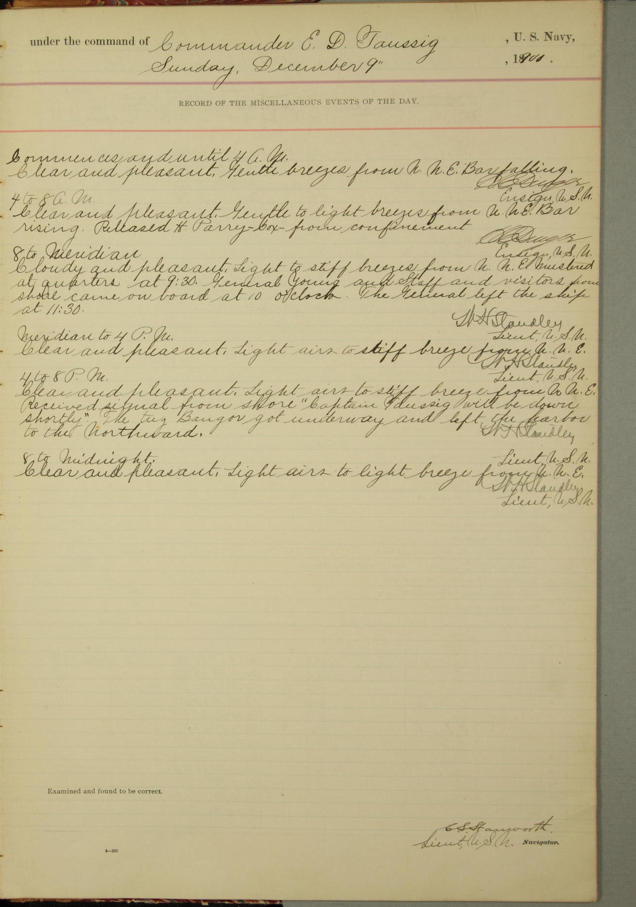 [In red, probably because of a sudden jump of 0.31 inches at 5.00am:] Many of the barometer readings of the first half of this day are obviously wrong, [signed] C.S. Sperry.