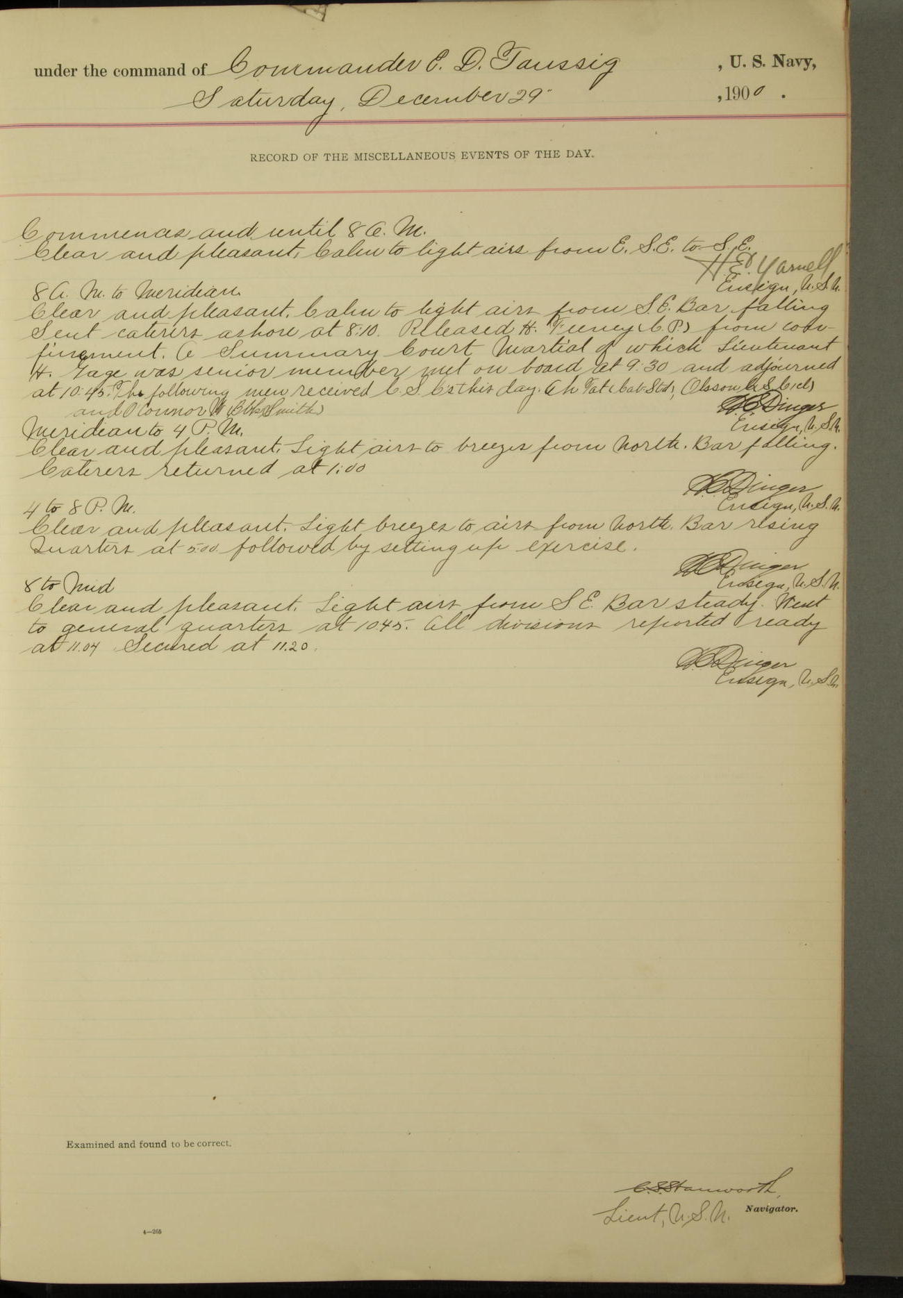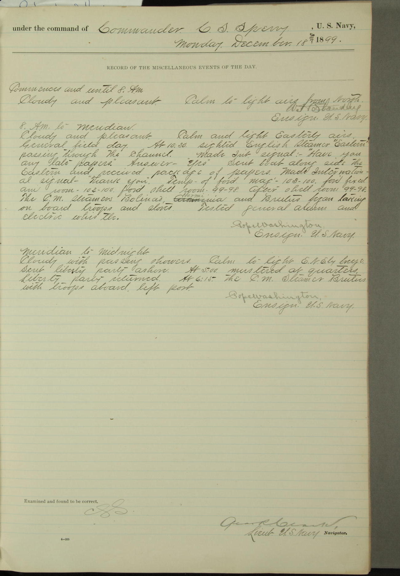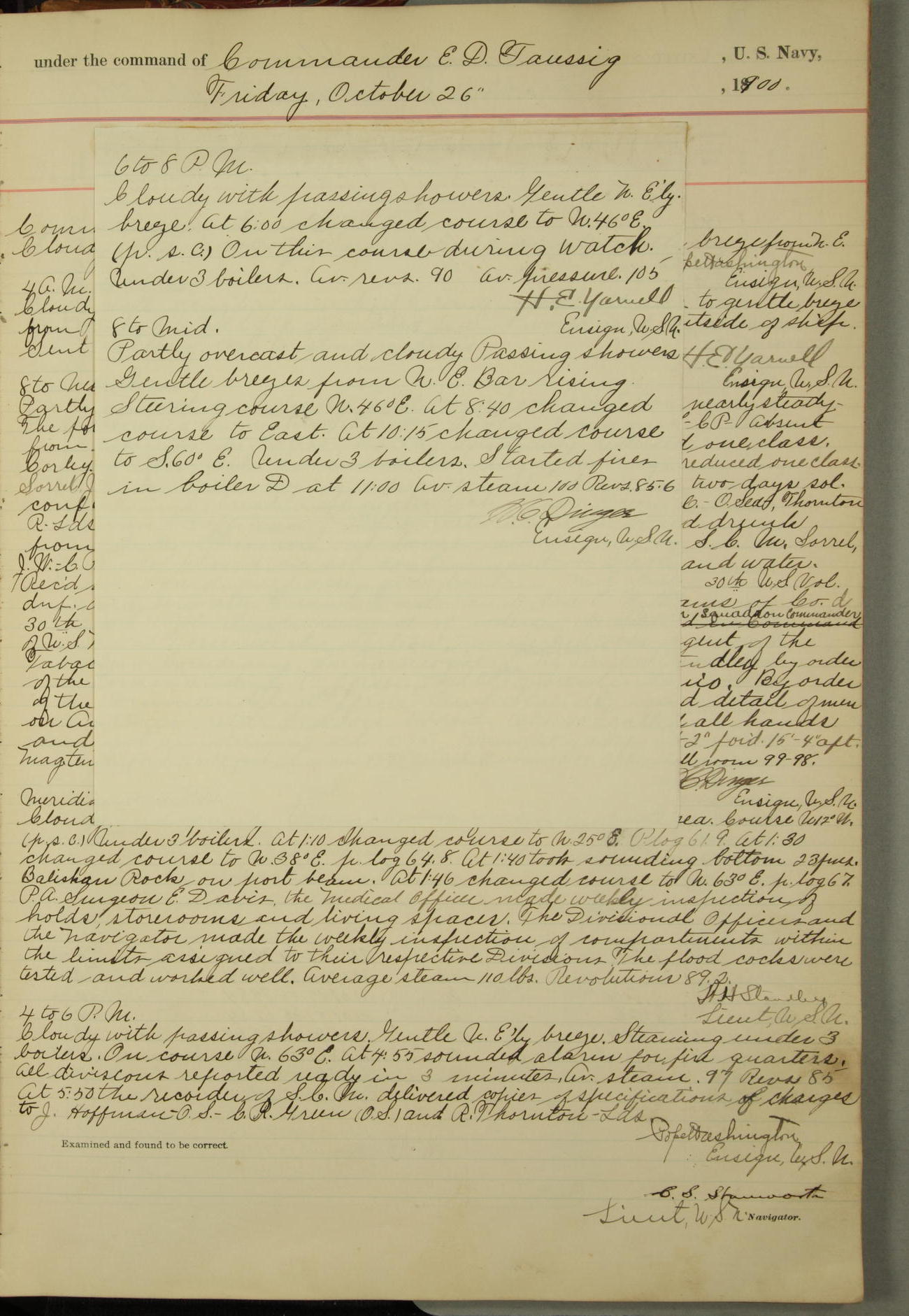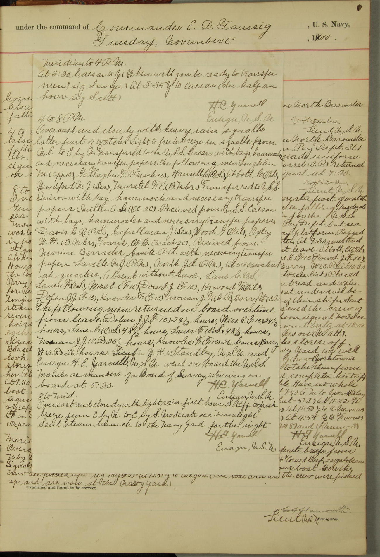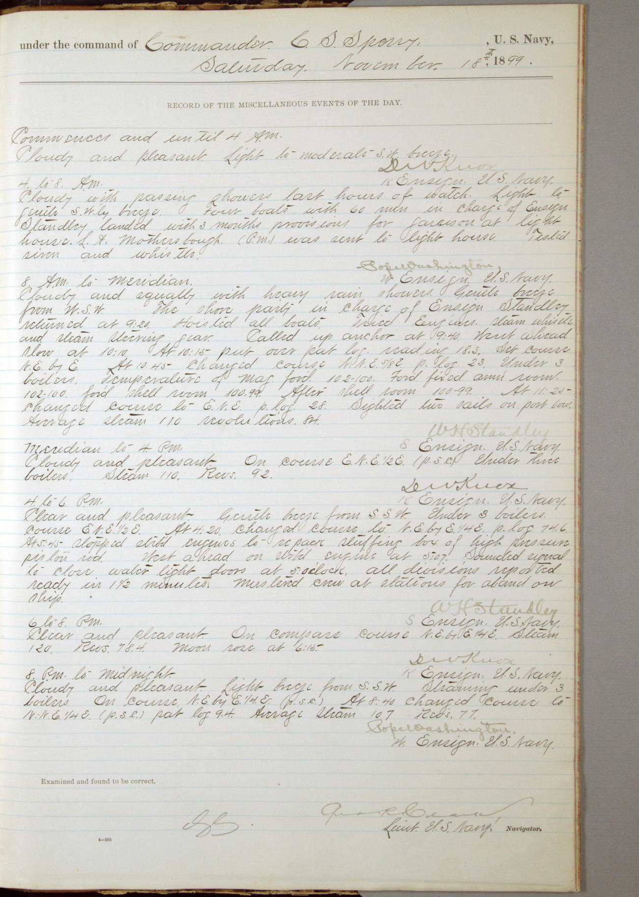 [In red, probably because of a sudden jump of 0.31 inches at 5.00am:] Many of the barometer readings of the first half of this day are obviously wrong, [signed] C.S. Sperry.