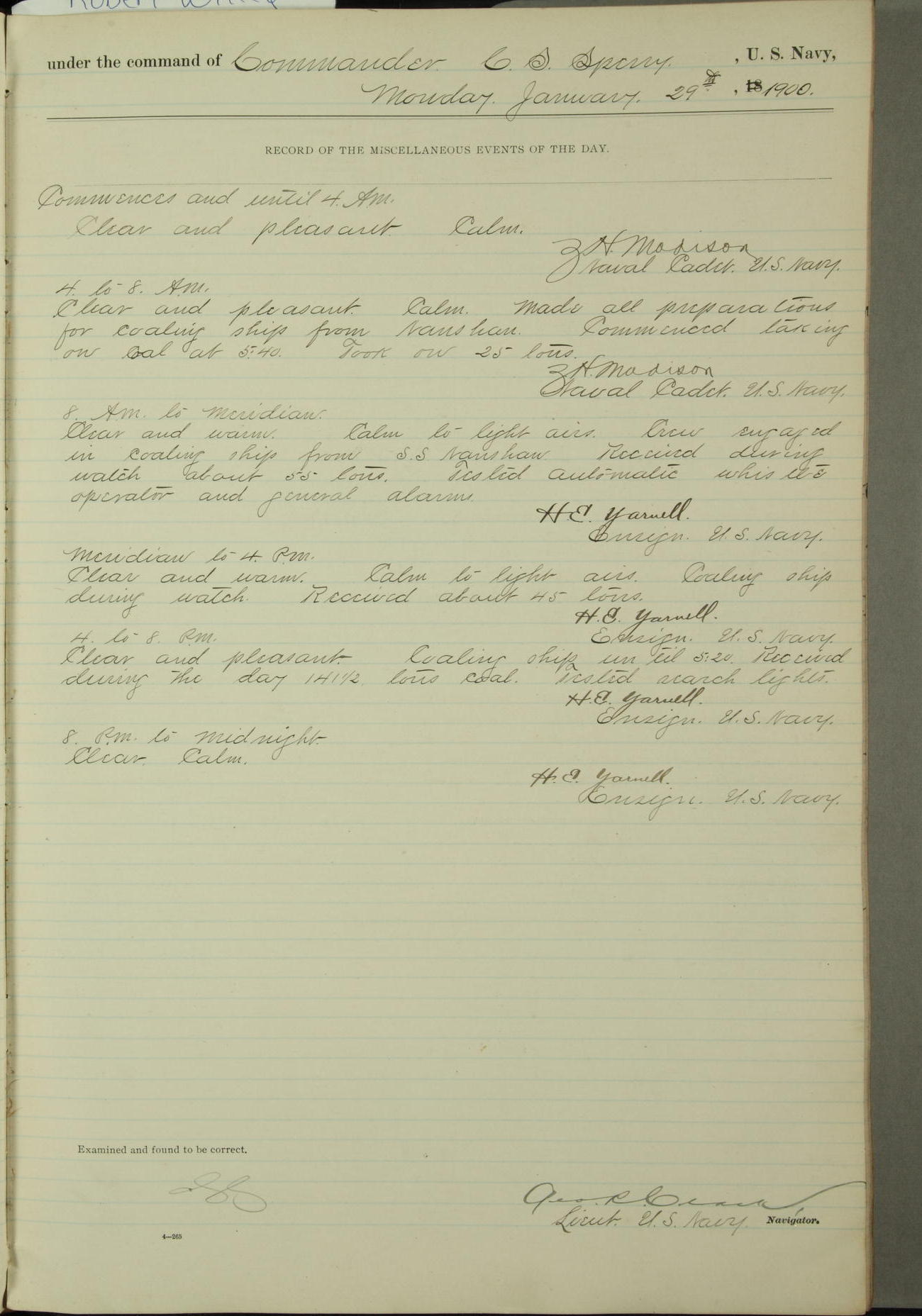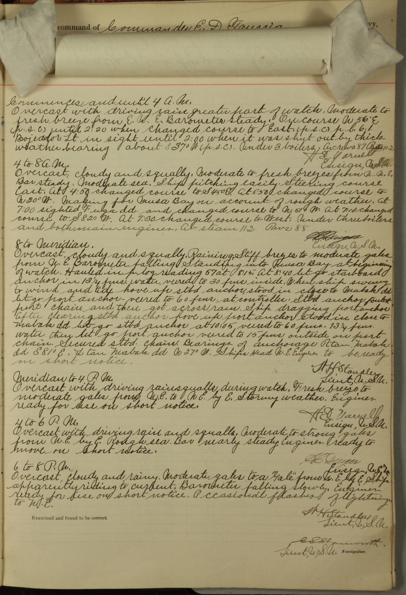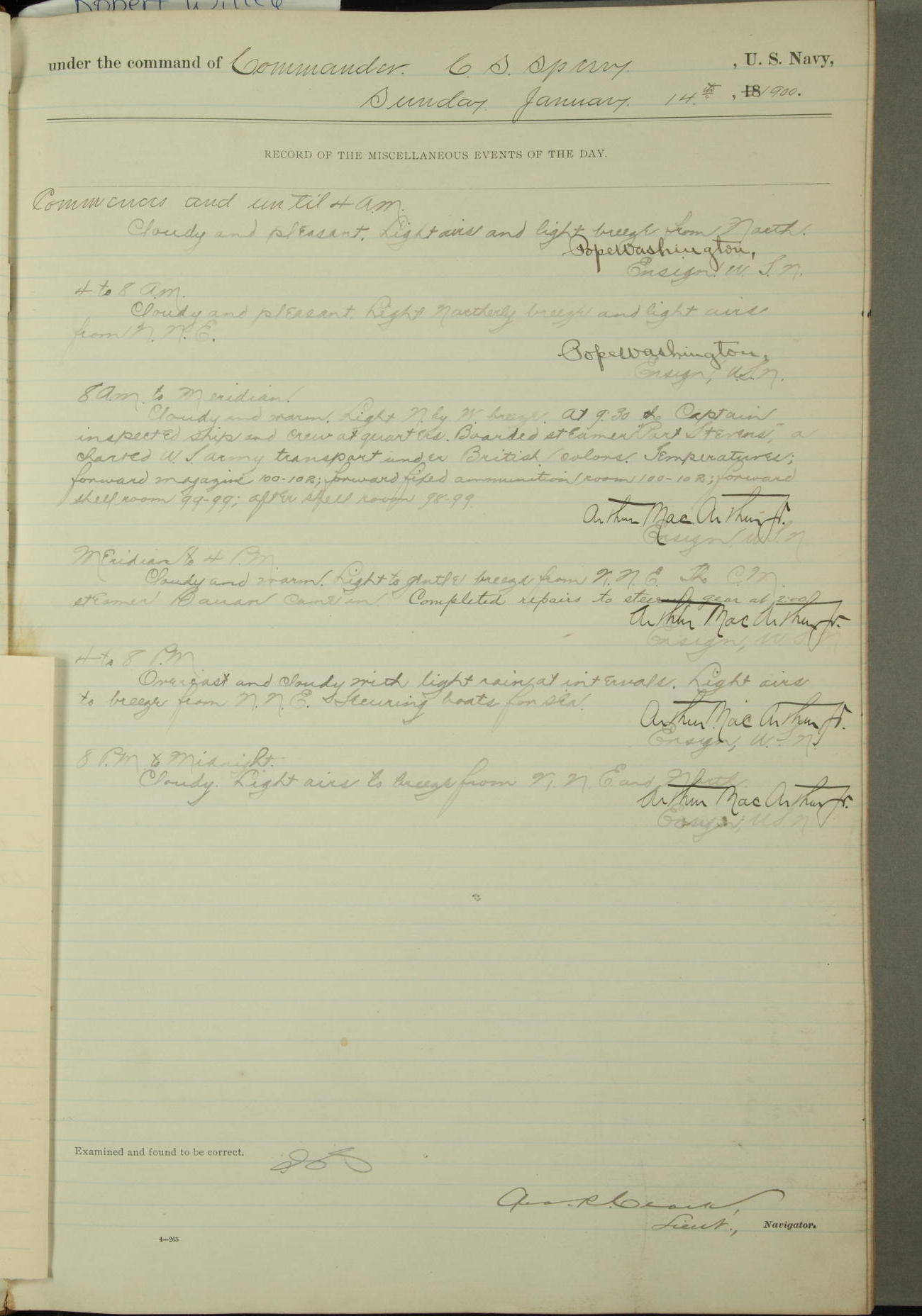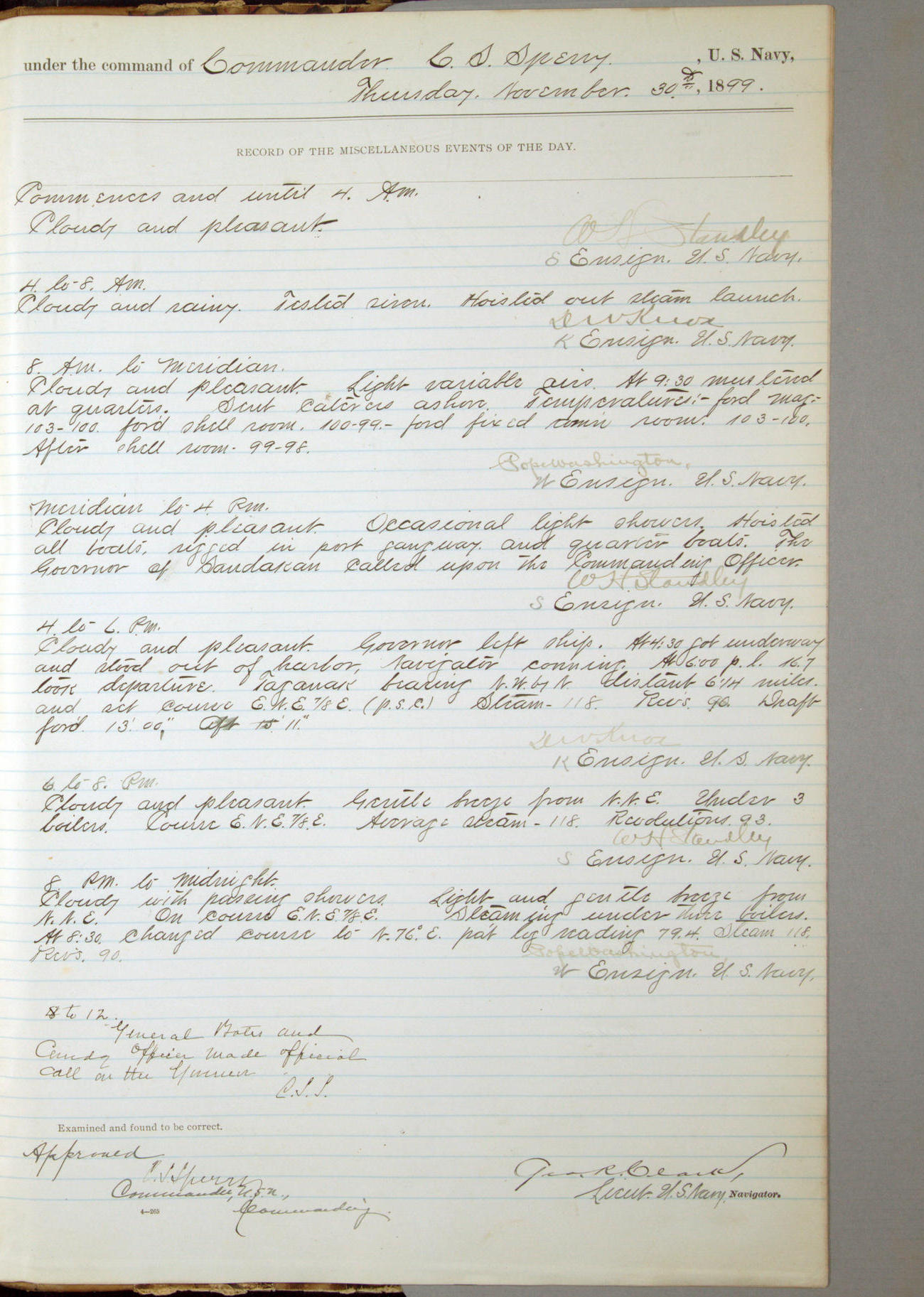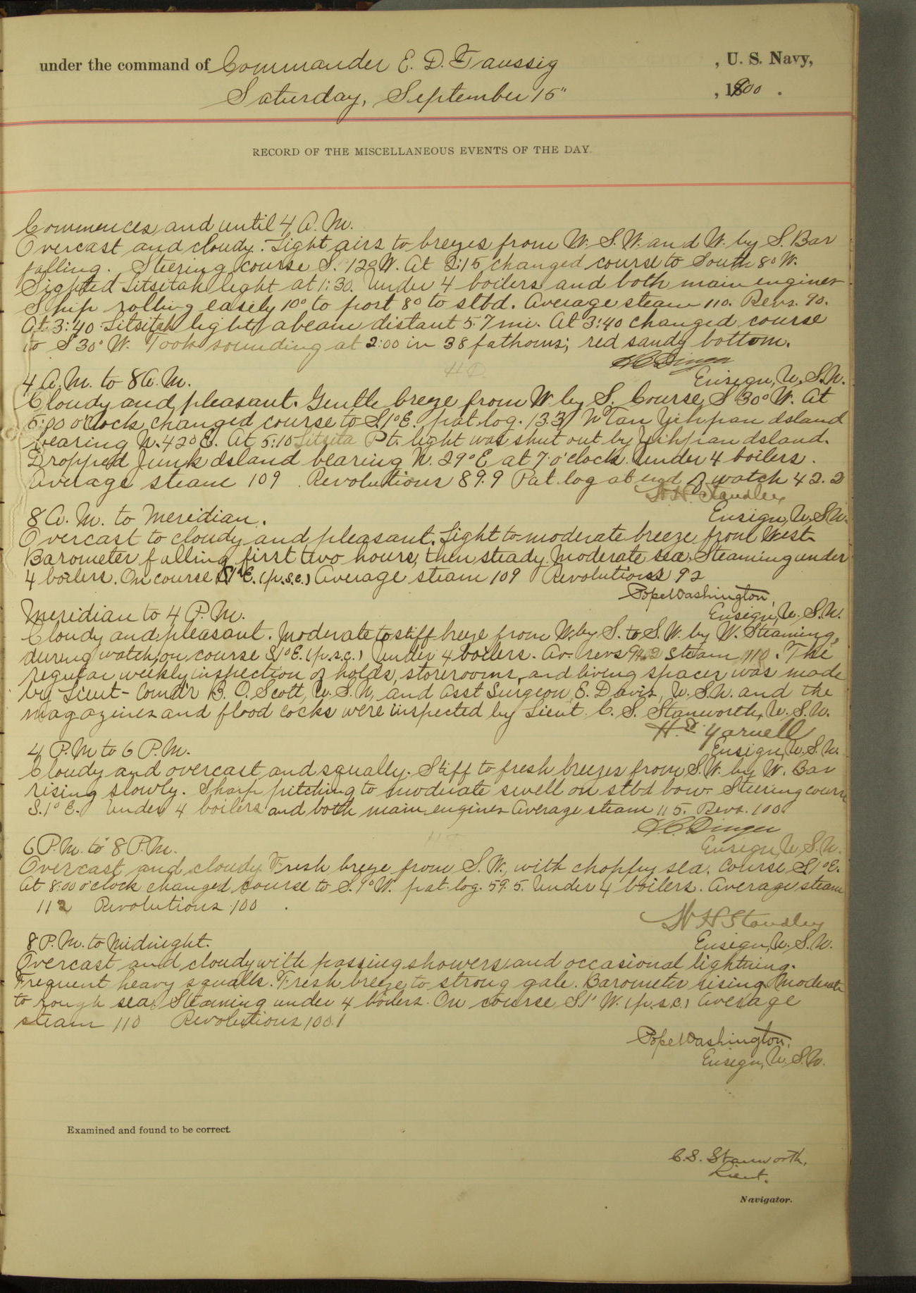 [In red, probably because of a sudden jump of 0.31 inches at 5.00am:] Many of the barometer readings of the first half of this day are obviously wrong, [signed] C.S. Sperry.