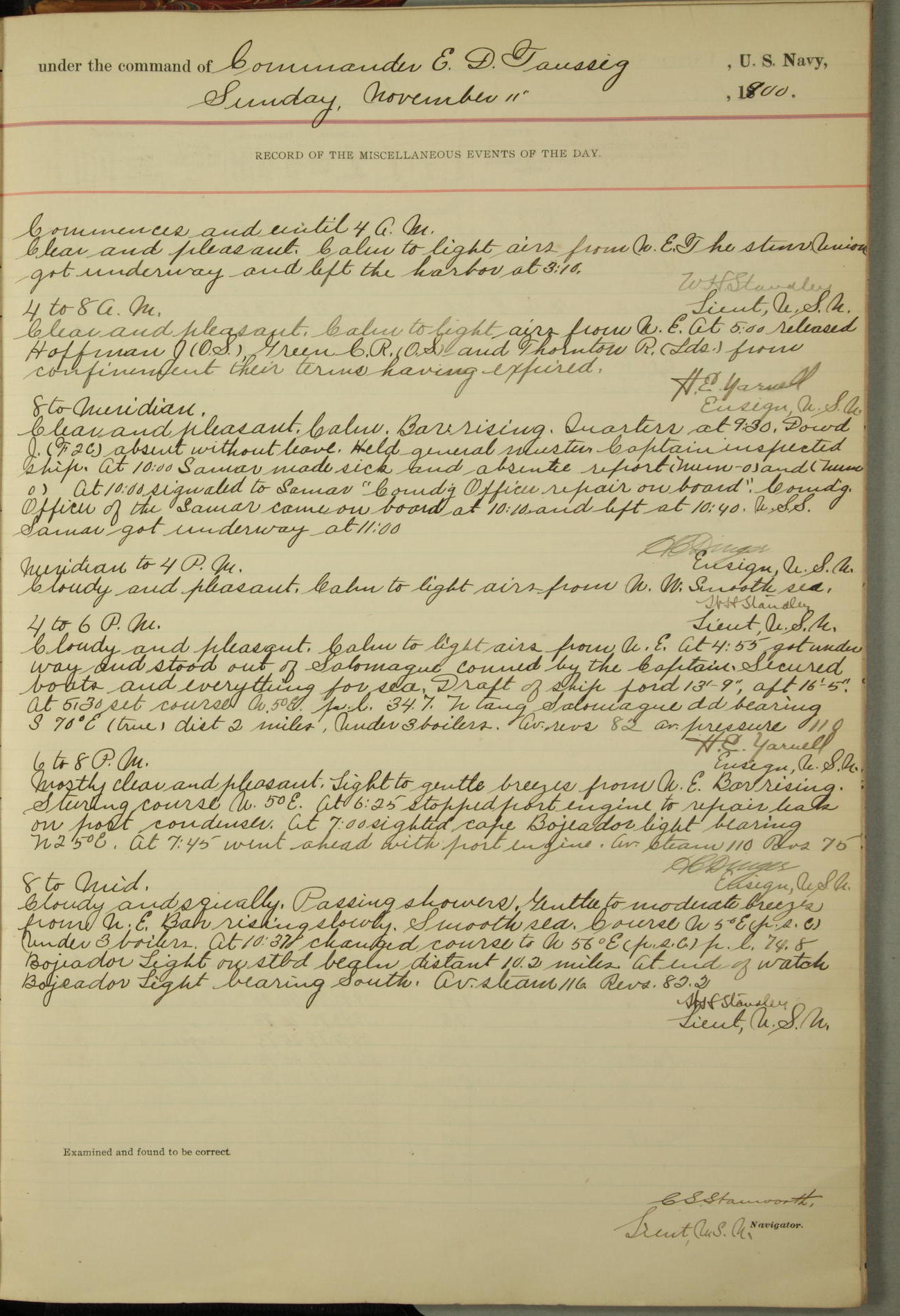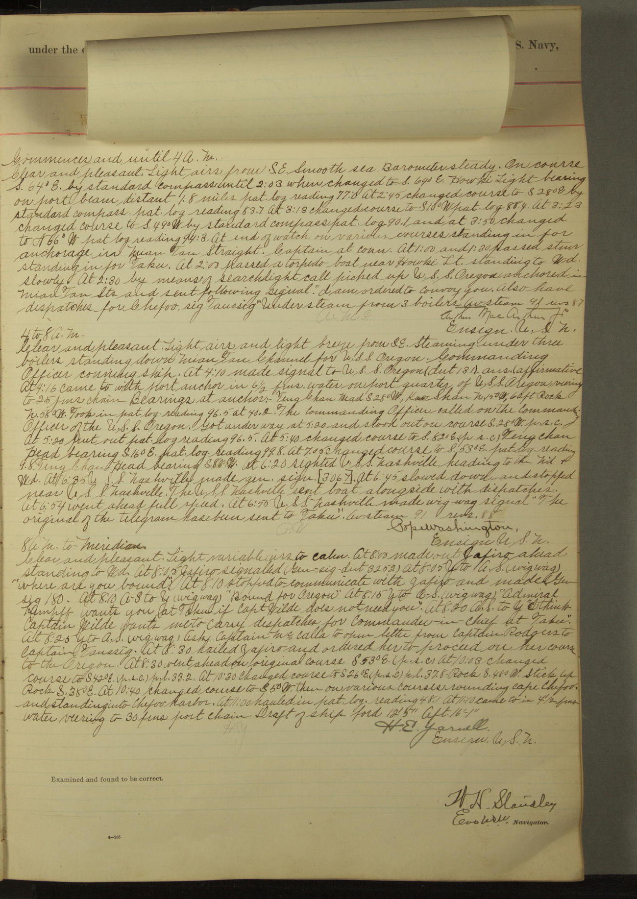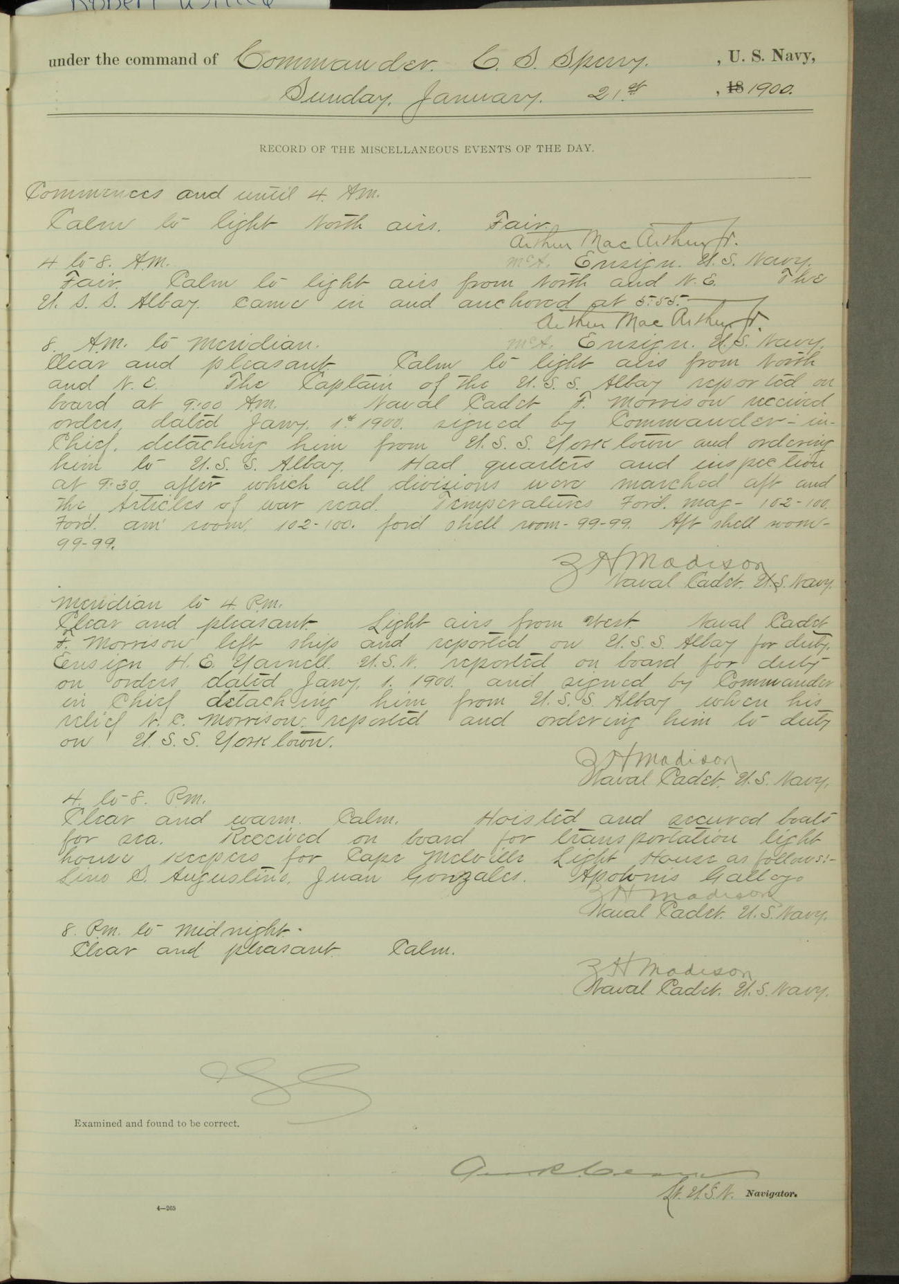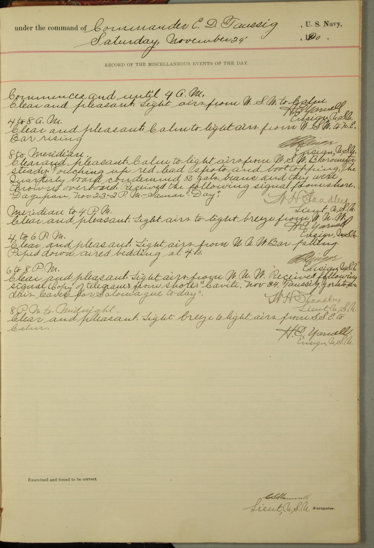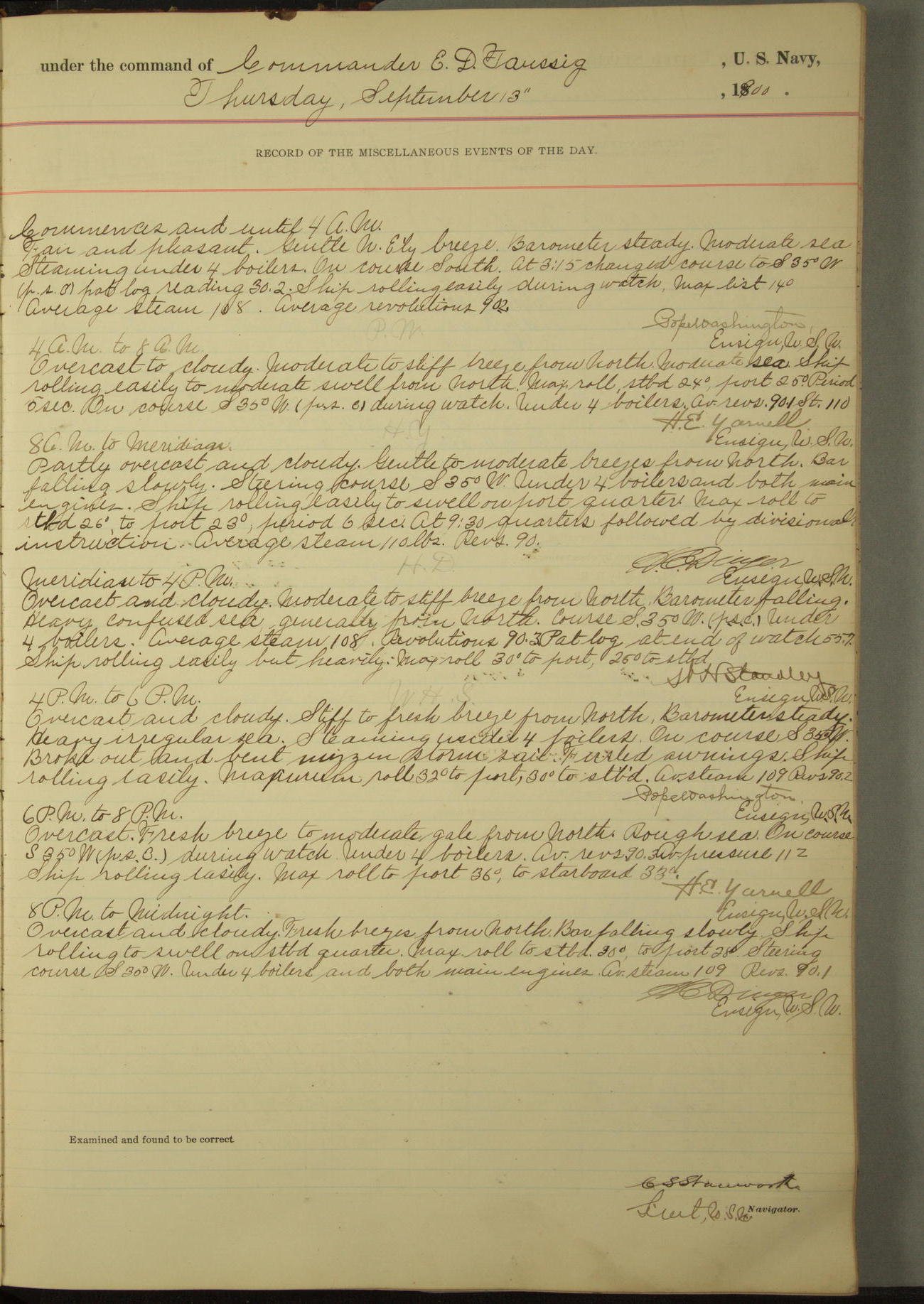 [In red, probably because of a sudden jump of 0.31 inches at 5.00am:] Many of the barometer readings of the first half of this day are obviously wrong, [signed] C.S. Sperry.