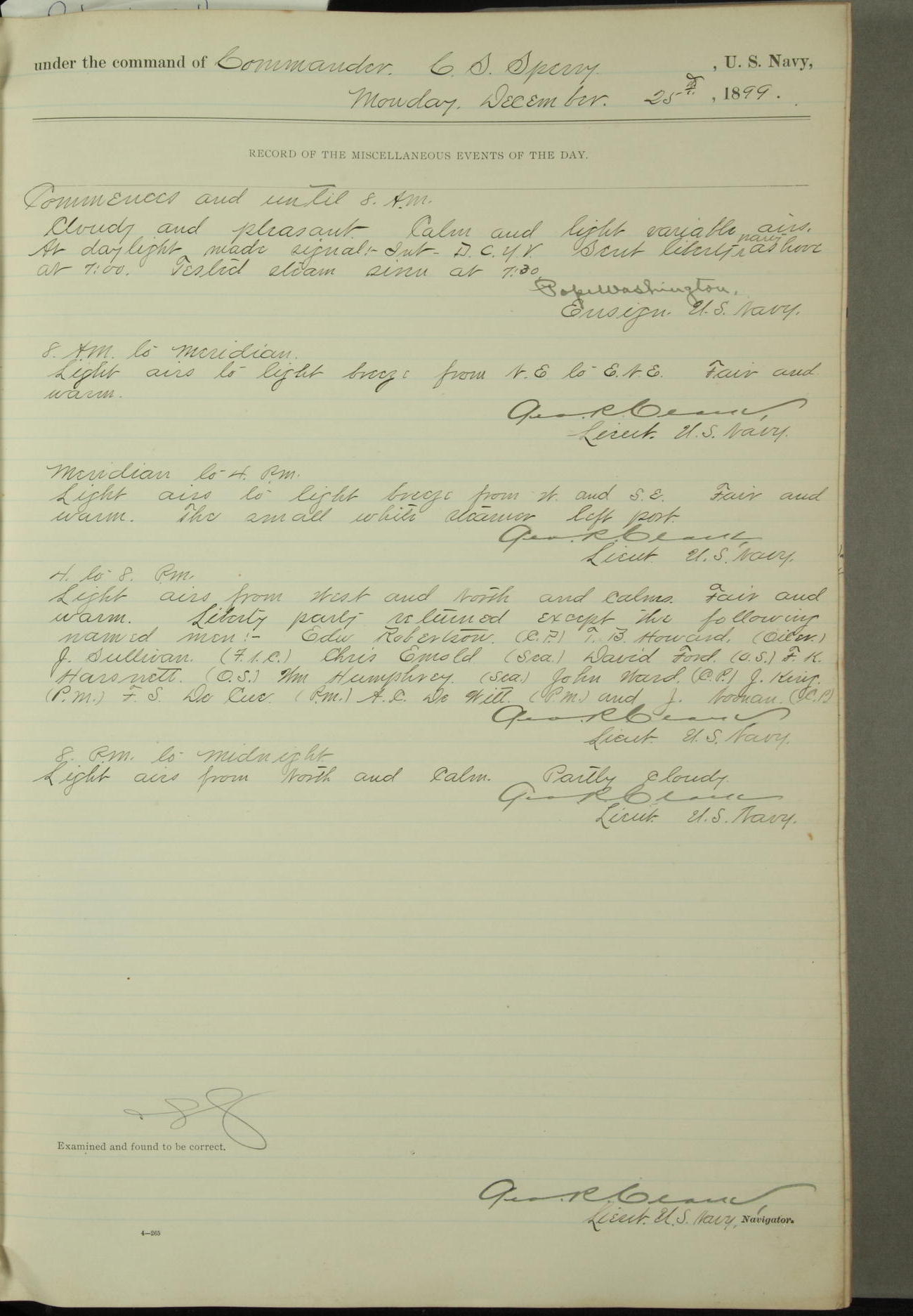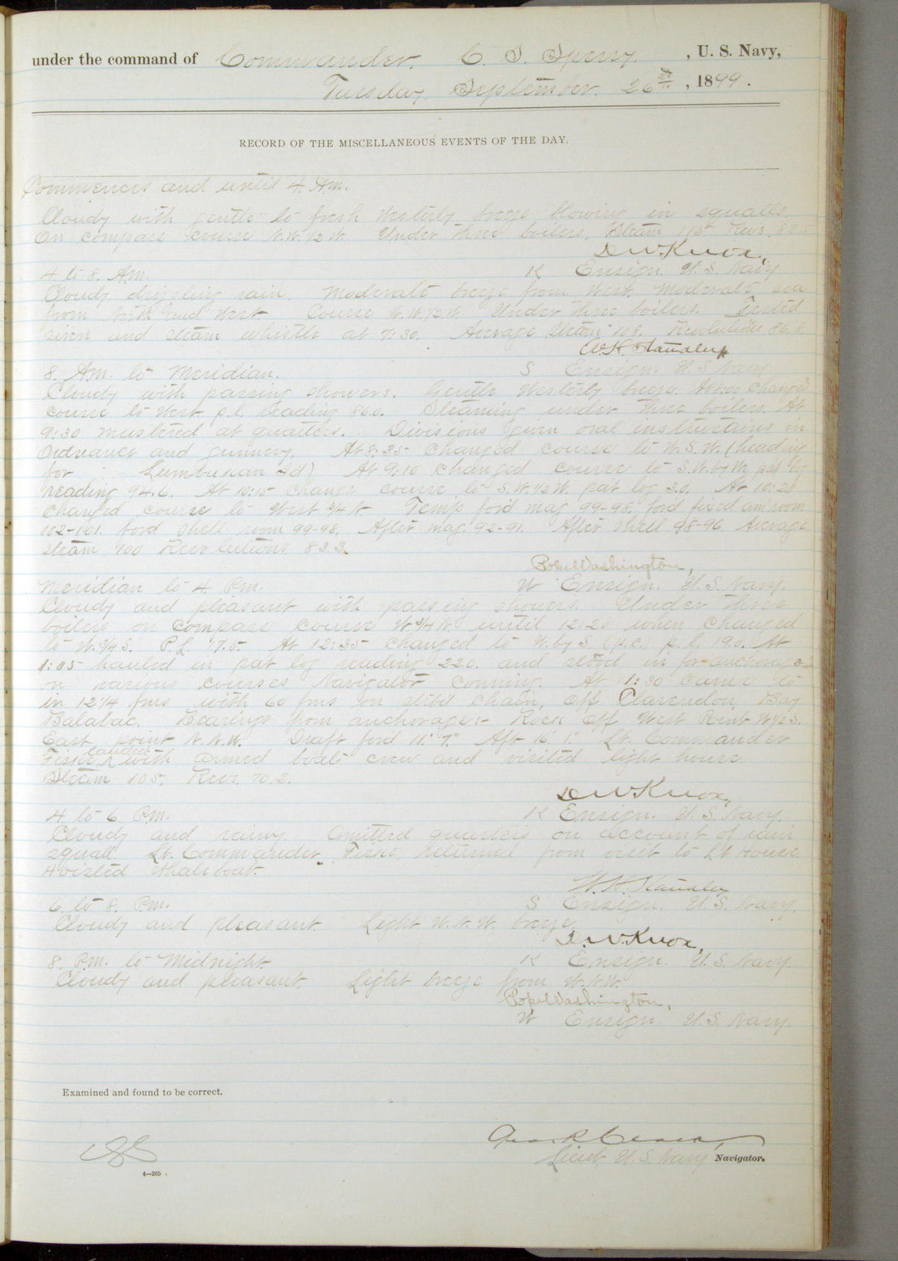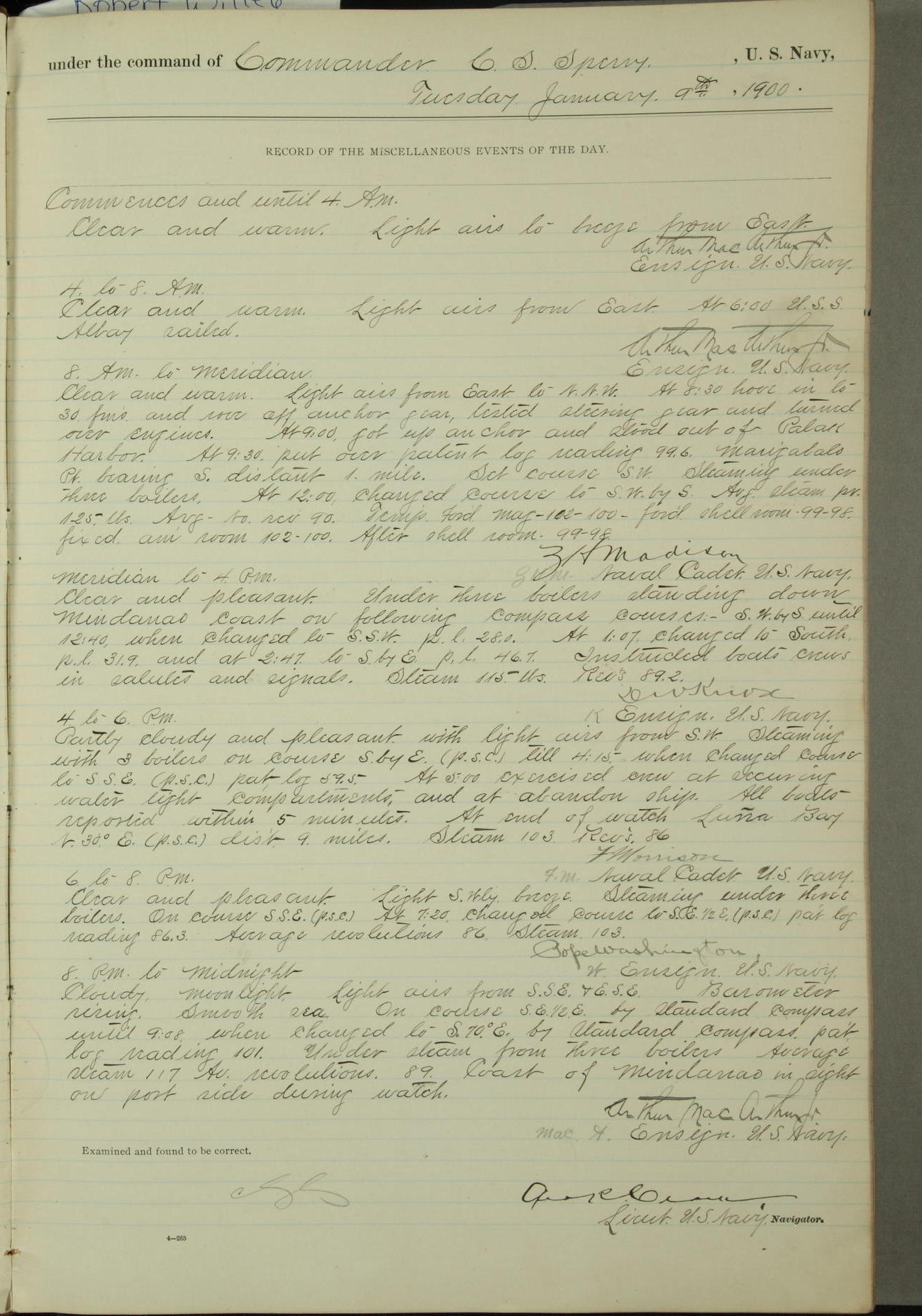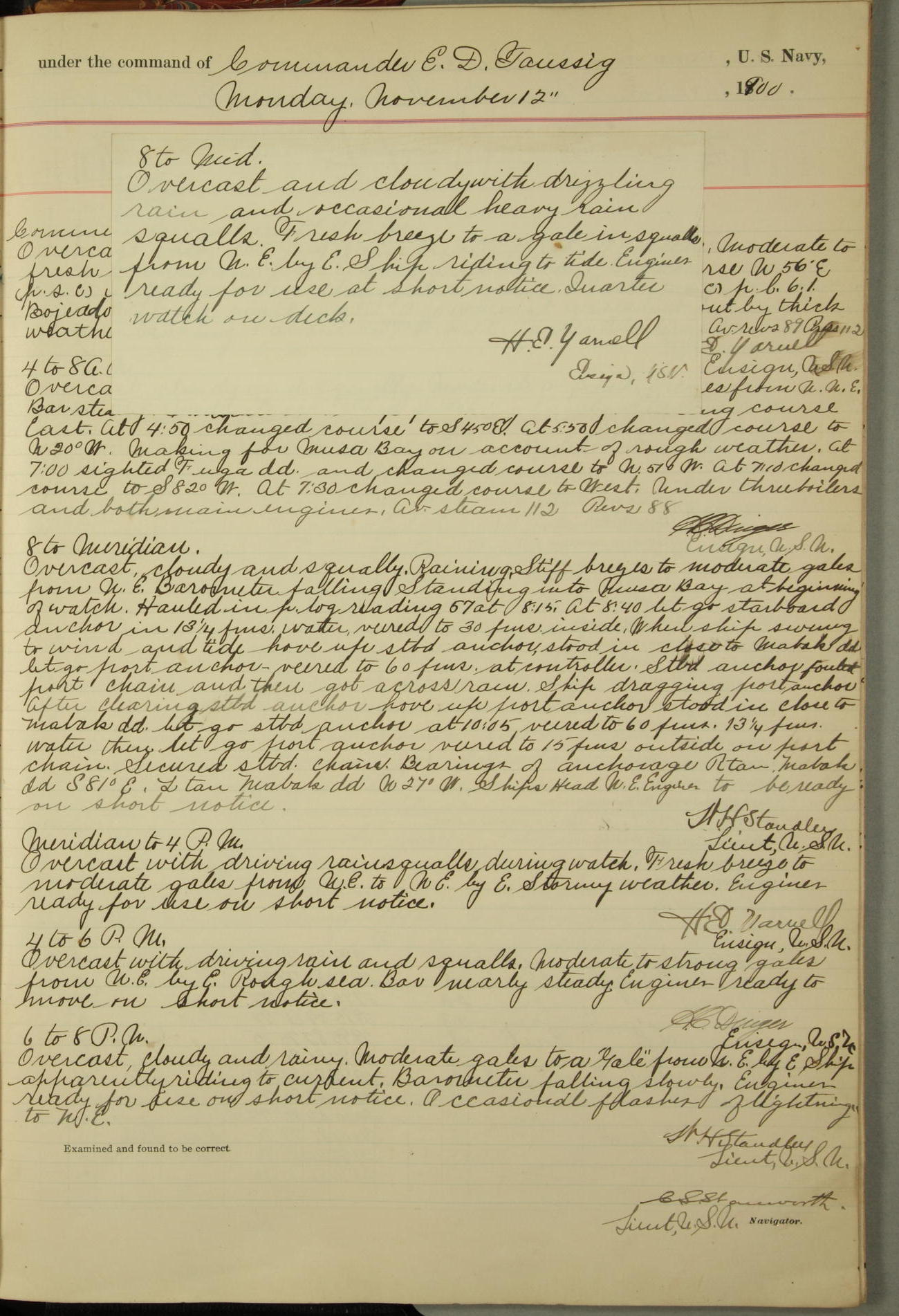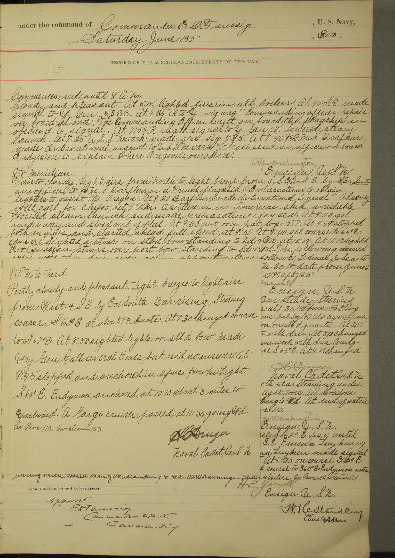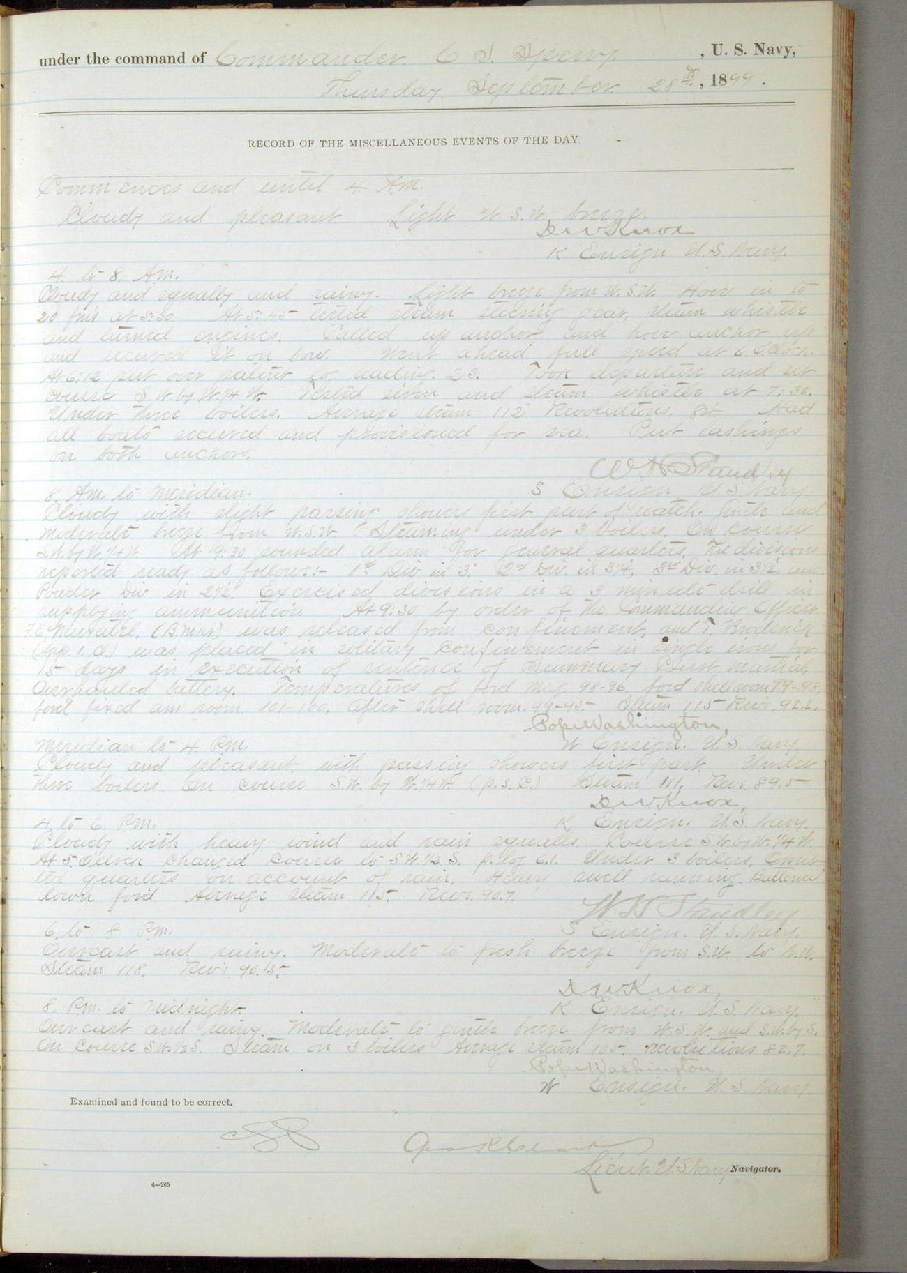[In red, probably because of a sudden jump of 0.31 inches at 5.00am:] Many of the barometer readings of the first half of this day are obviously wrong, [signed] C.S. Sperry.