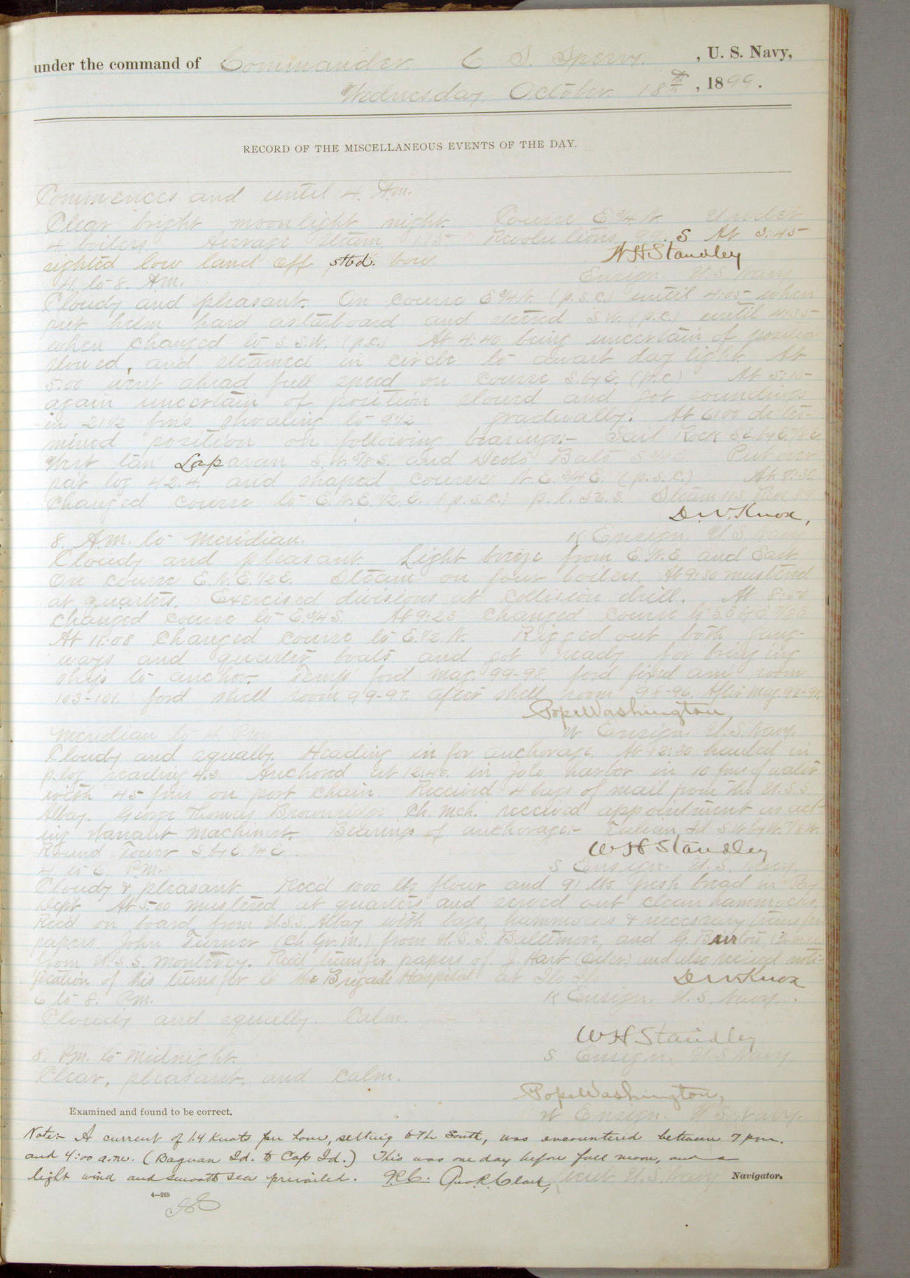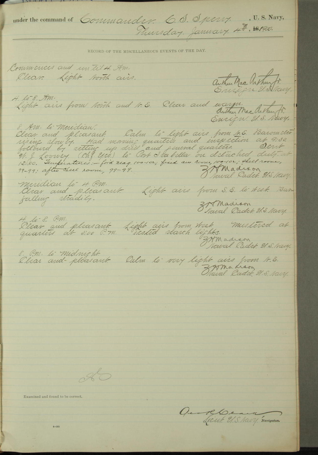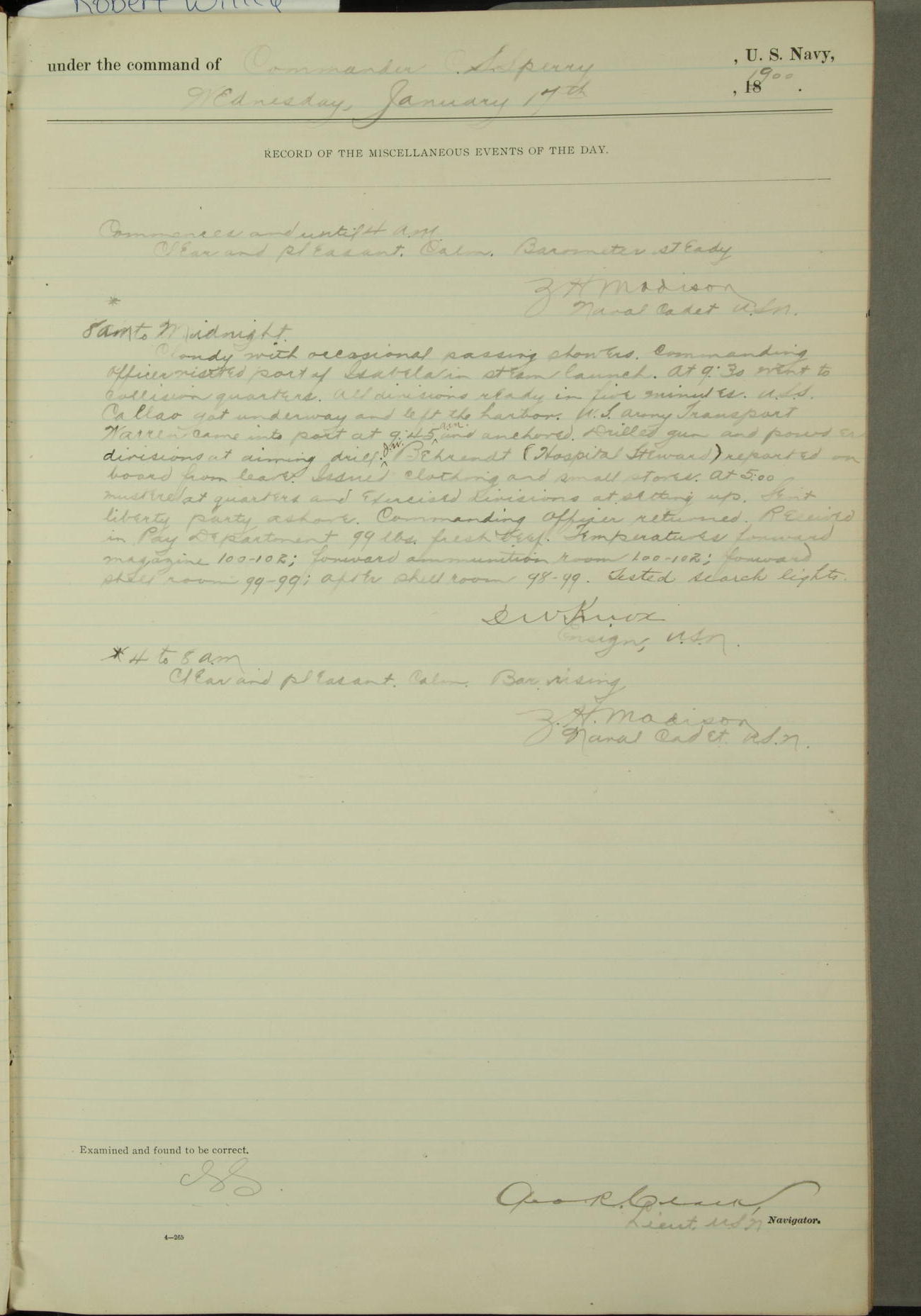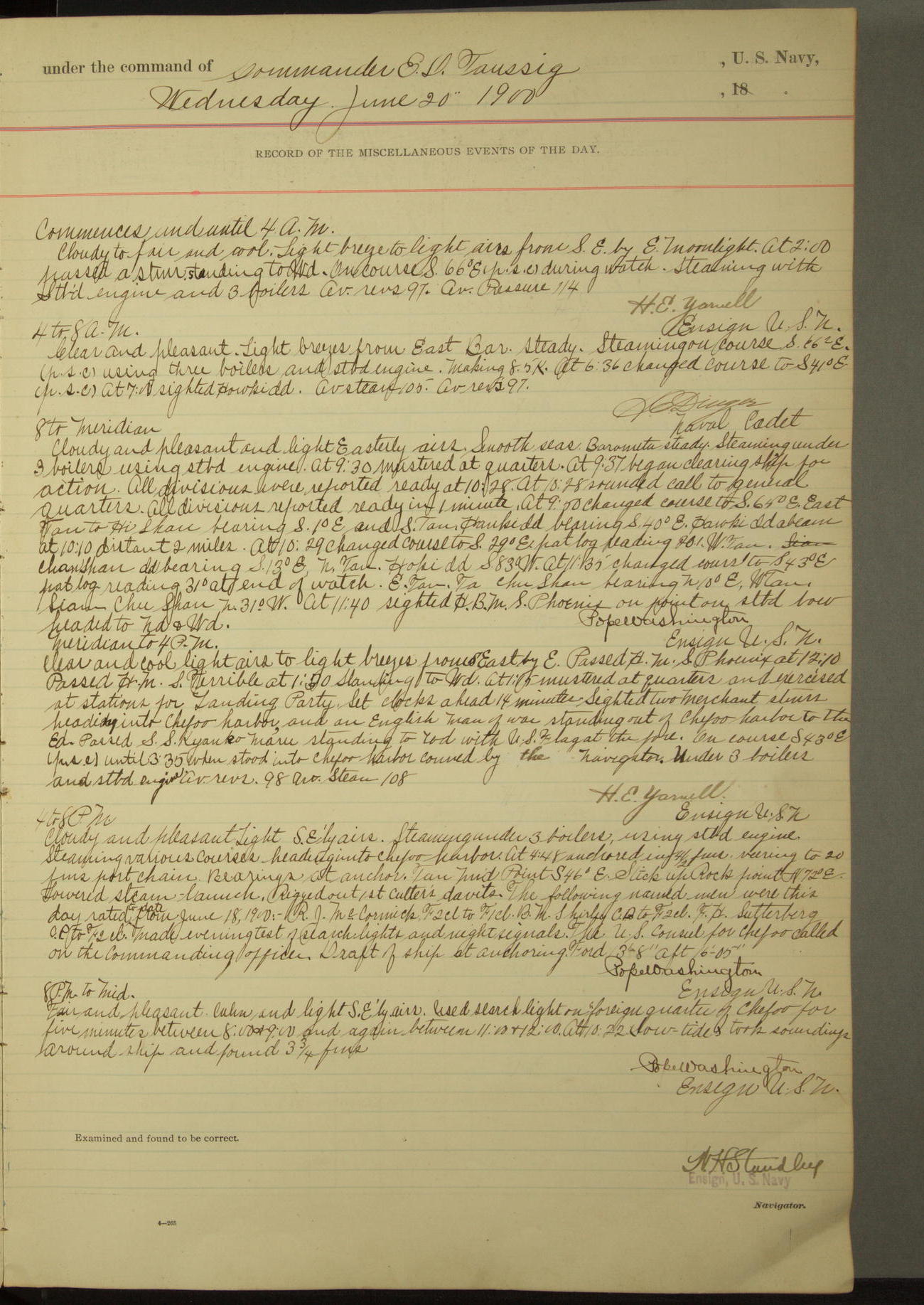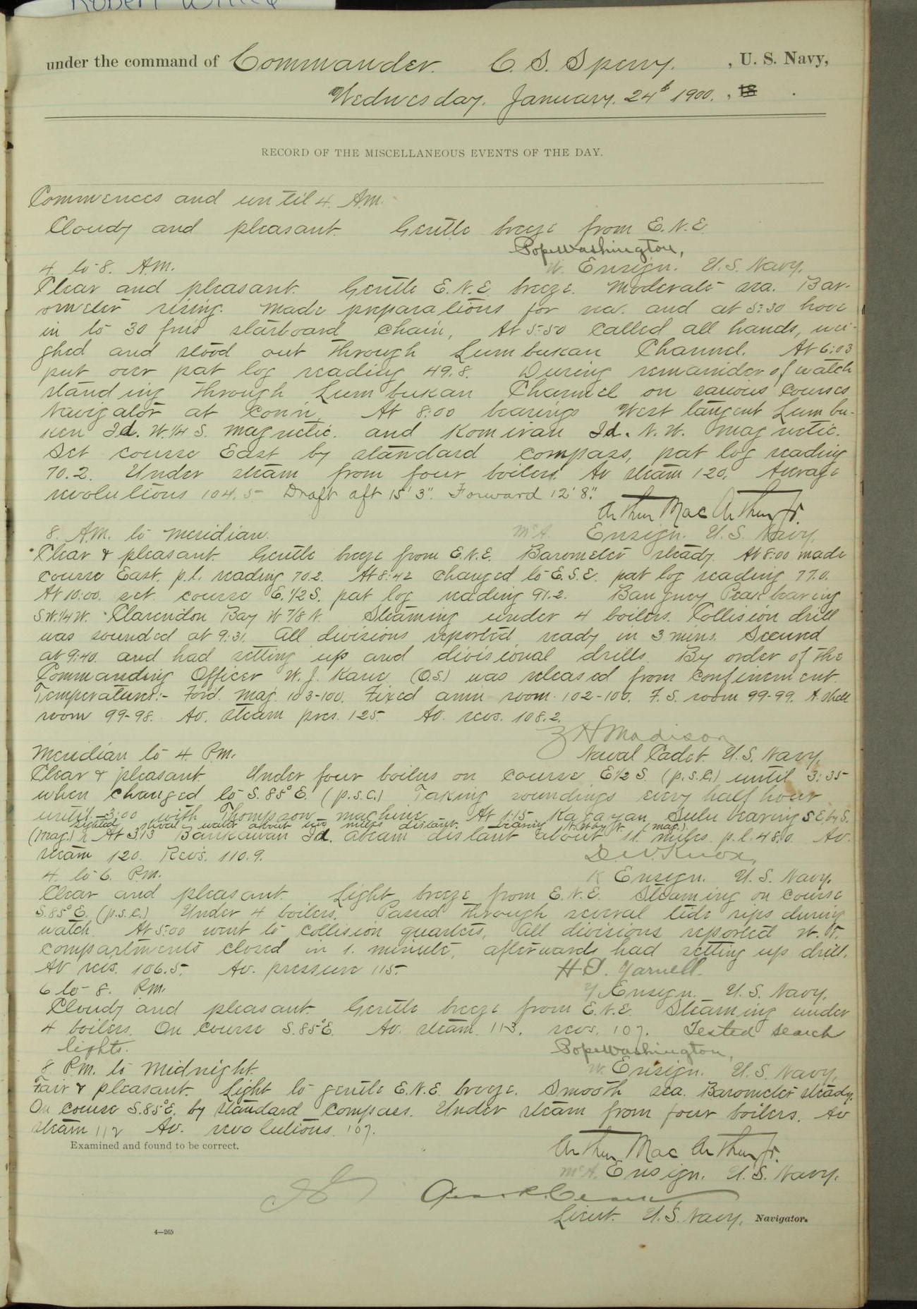 [In red, probably because of a sudden jump of 0.31 inches at 5.00am:] Many of the barometer readings of the first half of this day are obviously wrong, [signed] C.S. Sperry.