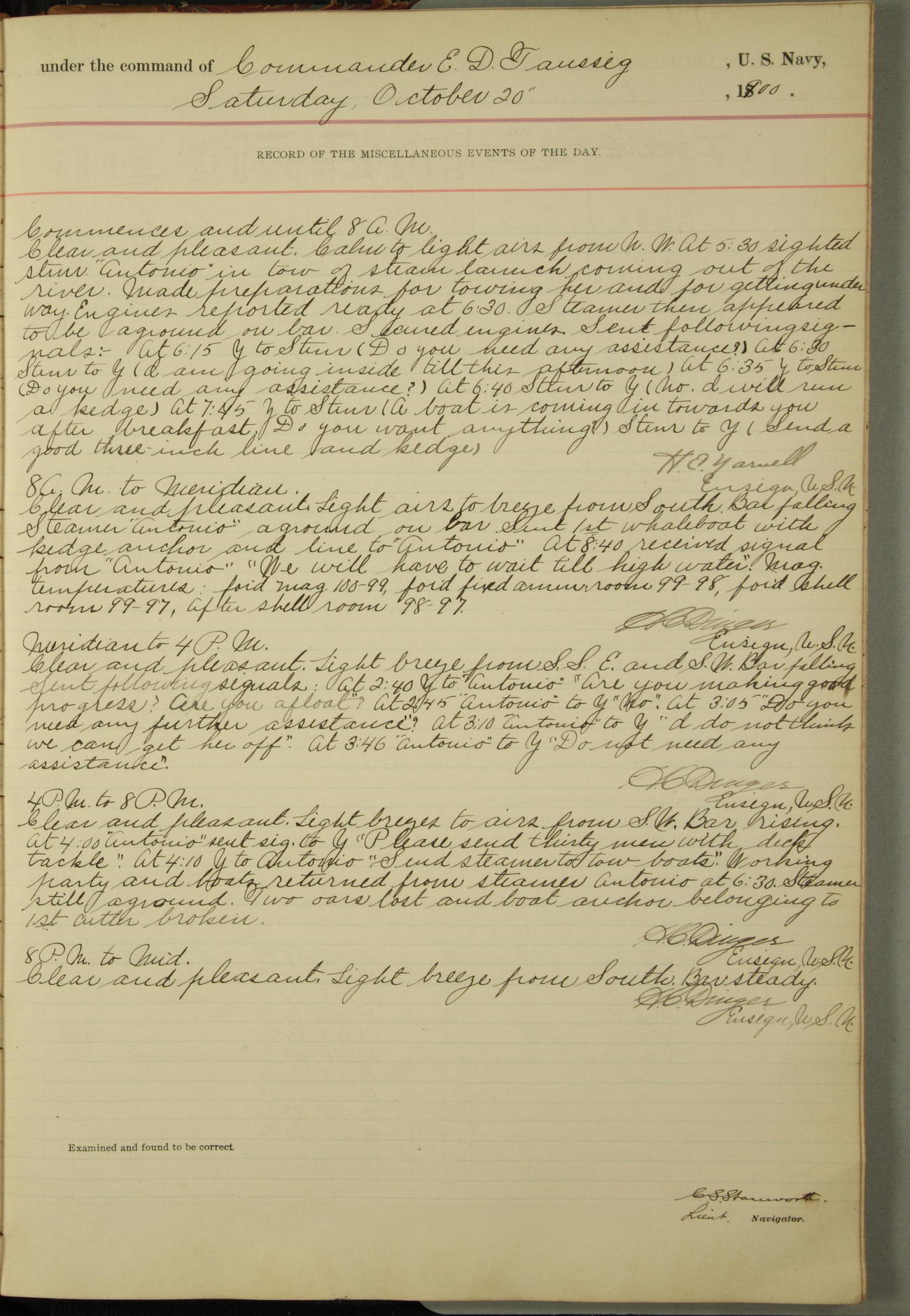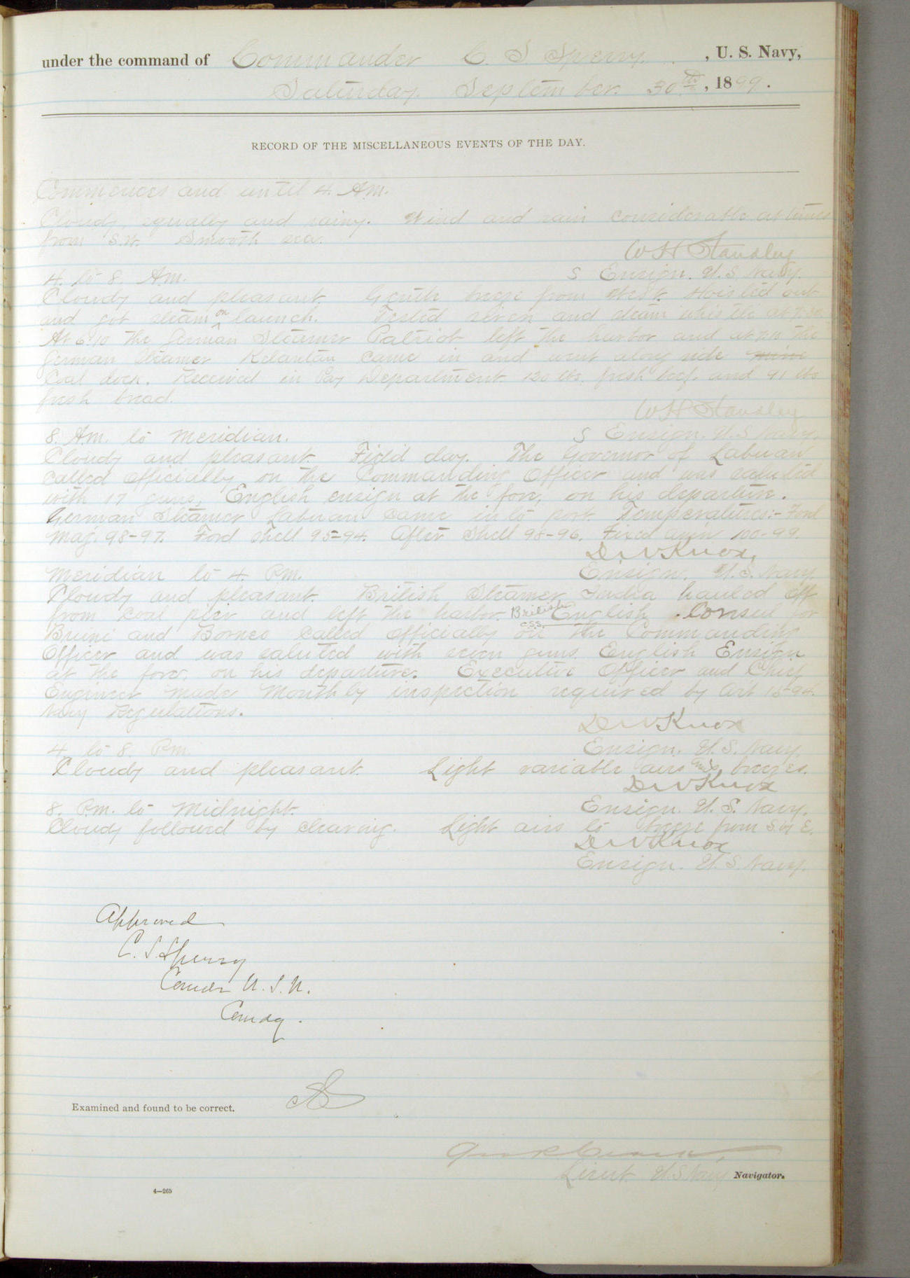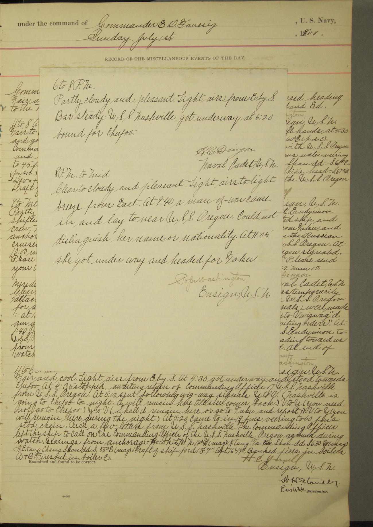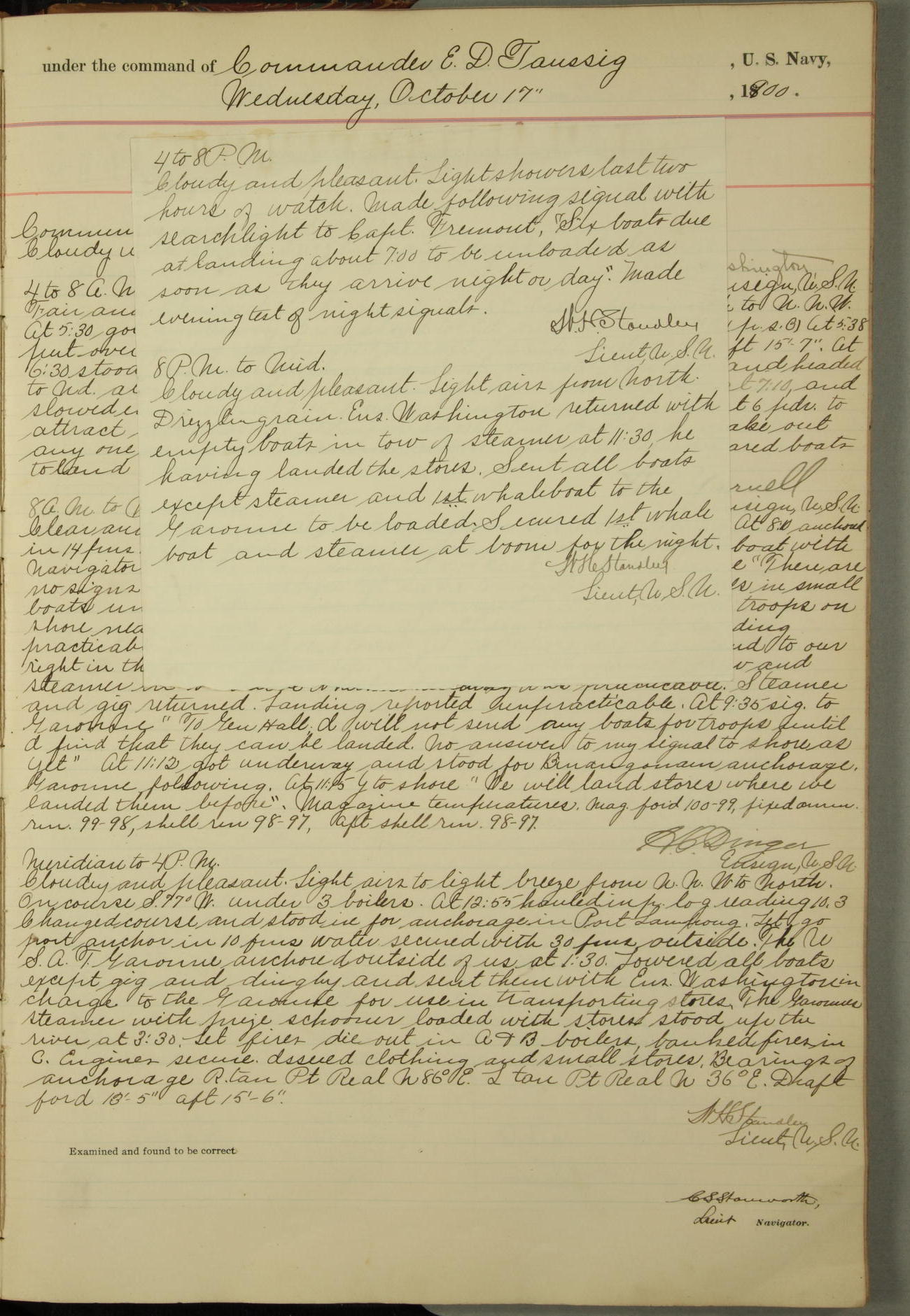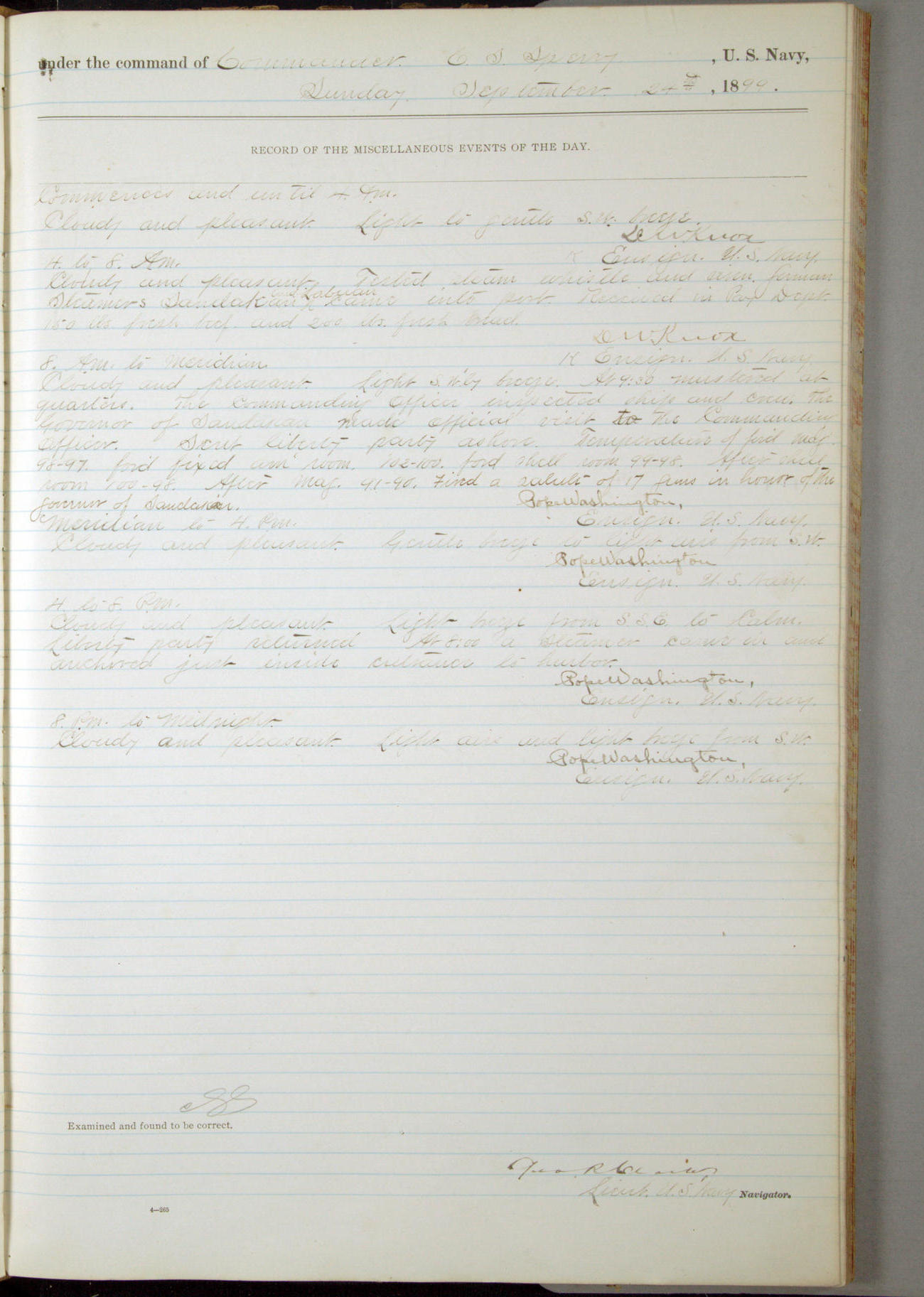 [In red, probably because of a sudden jump of 0.31 inches at 5.00am:] Many of the barometer readings of the first half of this day are obviously wrong, [signed] C.S. Sperry.