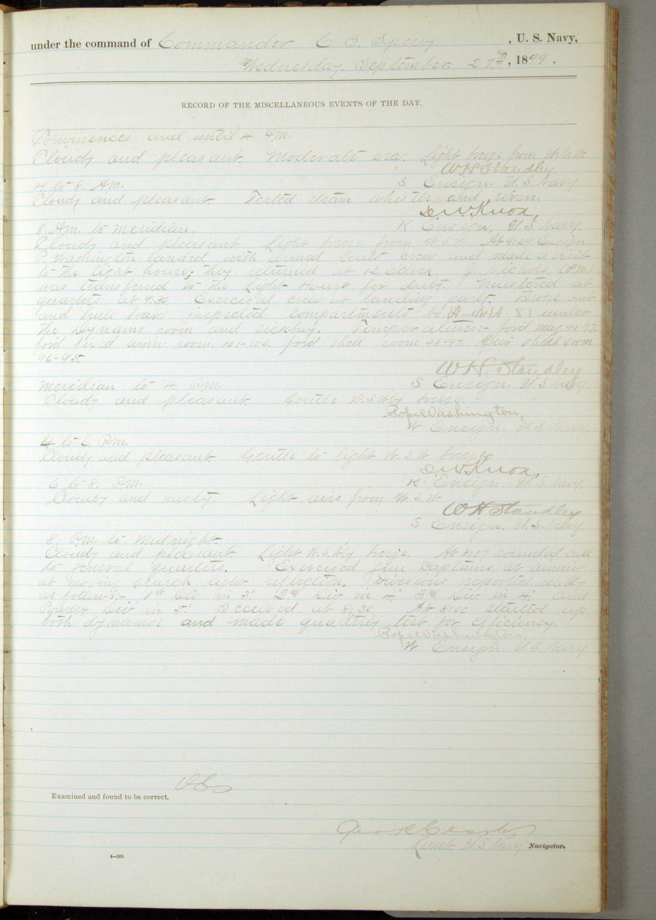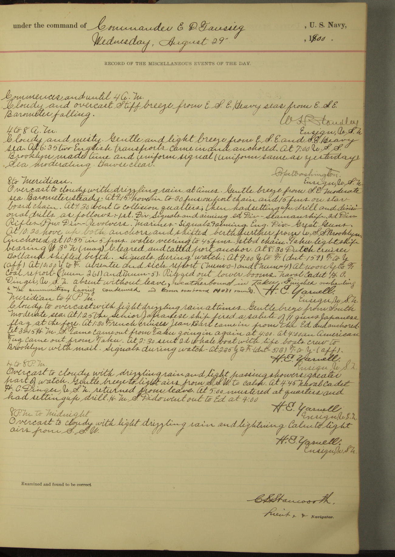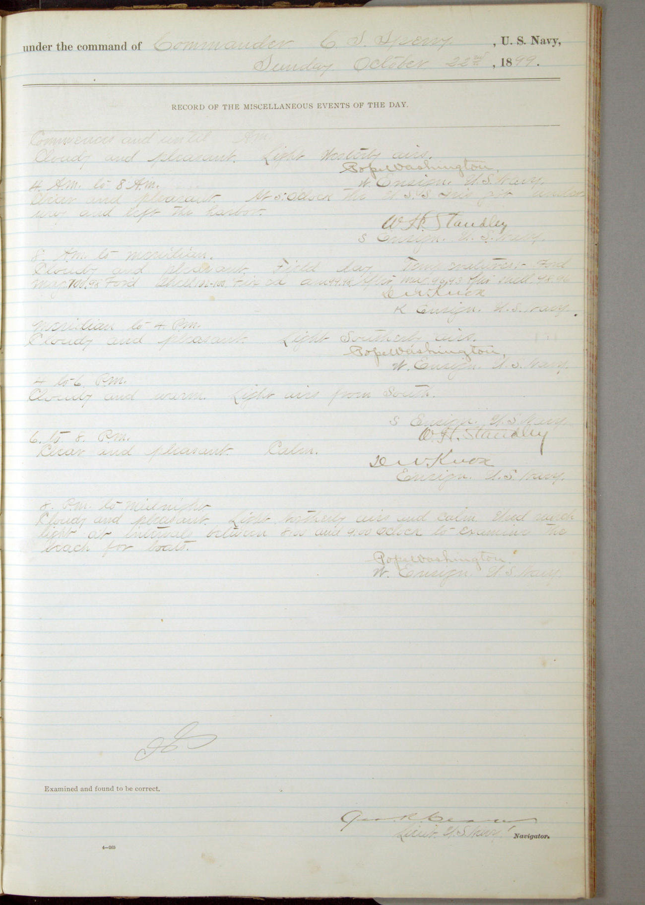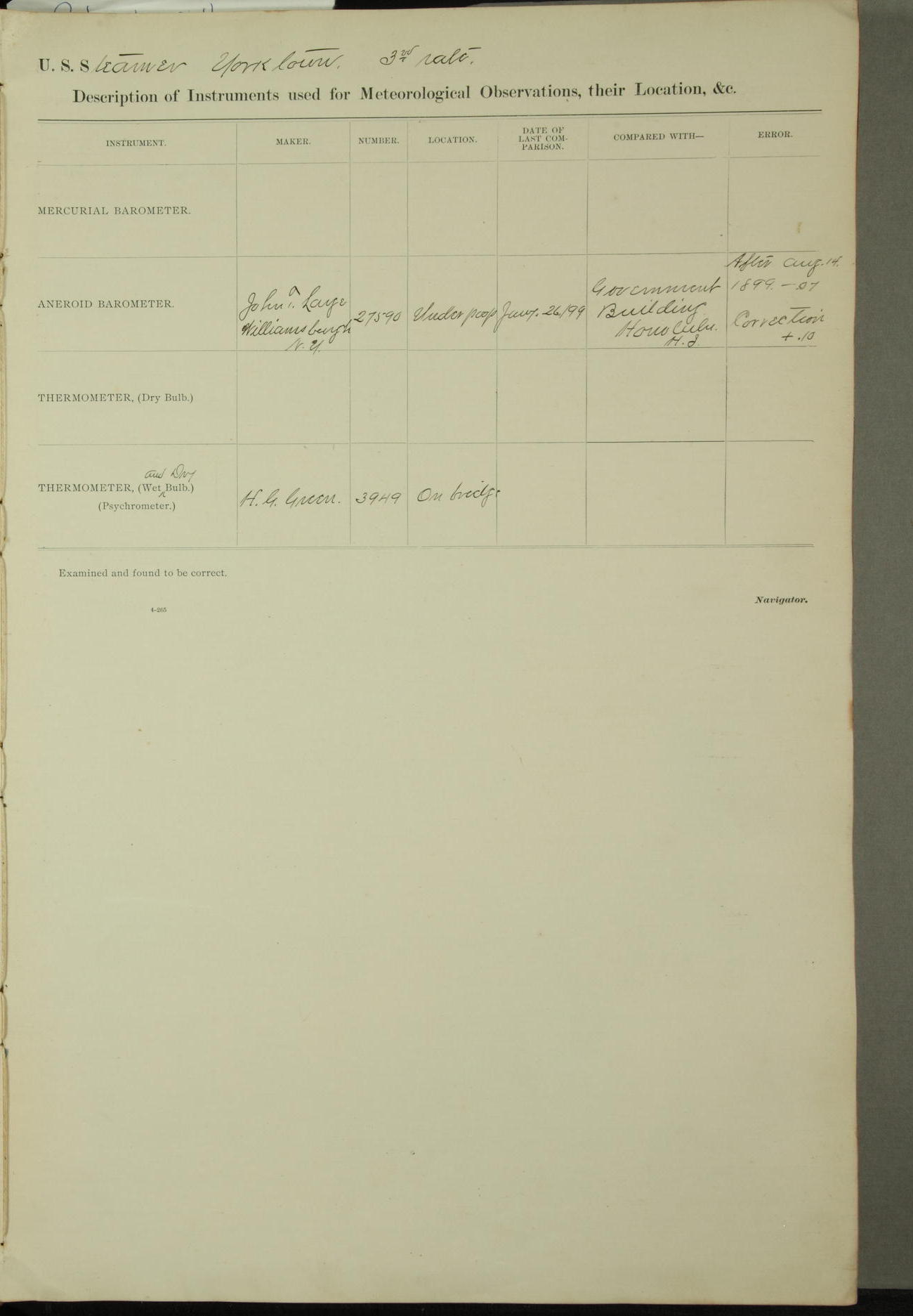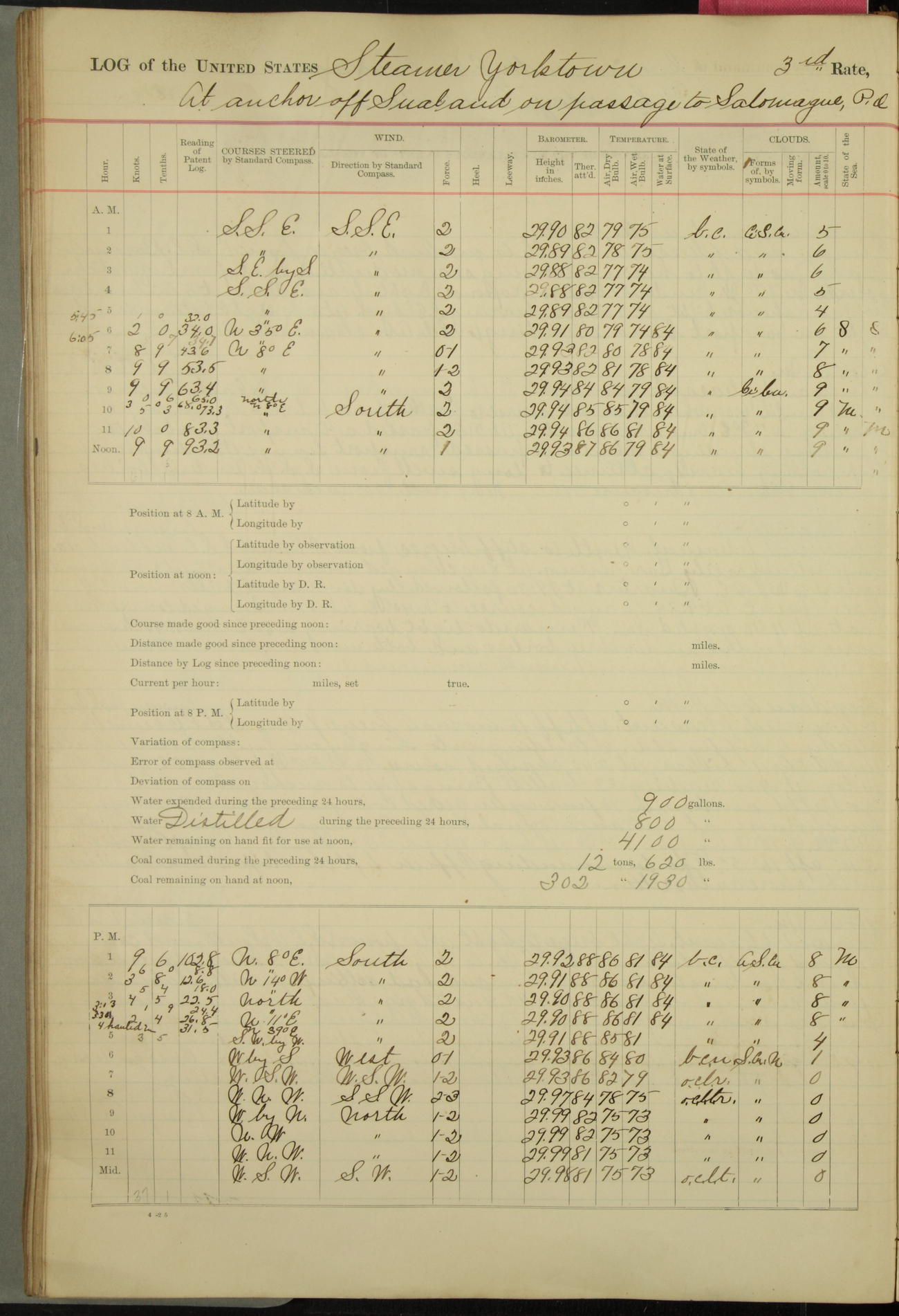 [In red, probably because of a sudden jump of 0.31 inches at 5.00am:] Many of the barometer readings of the first half of this day are obviously wrong, [signed] C.S. Sperry.