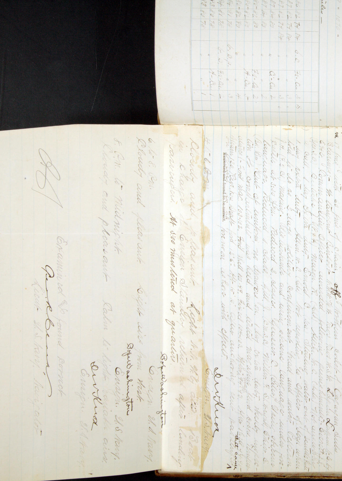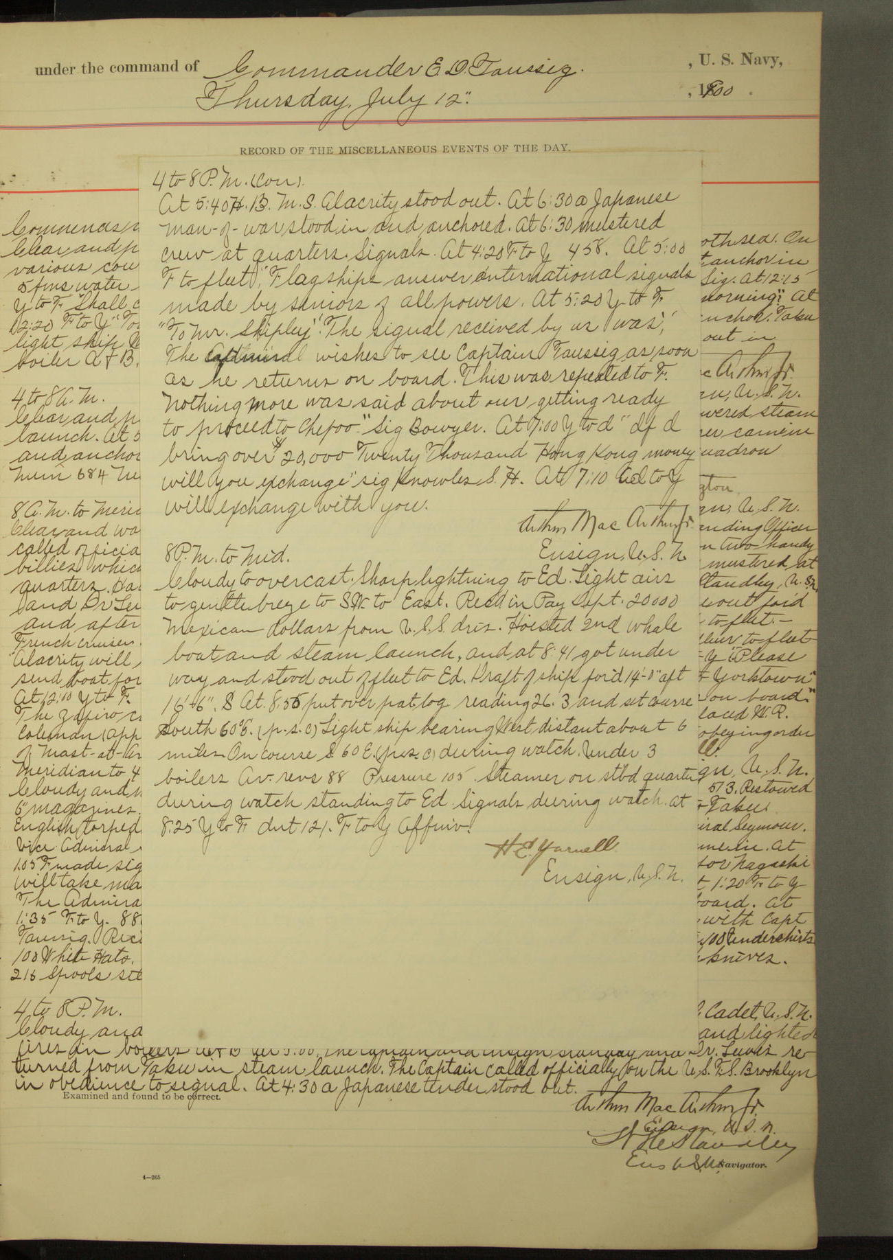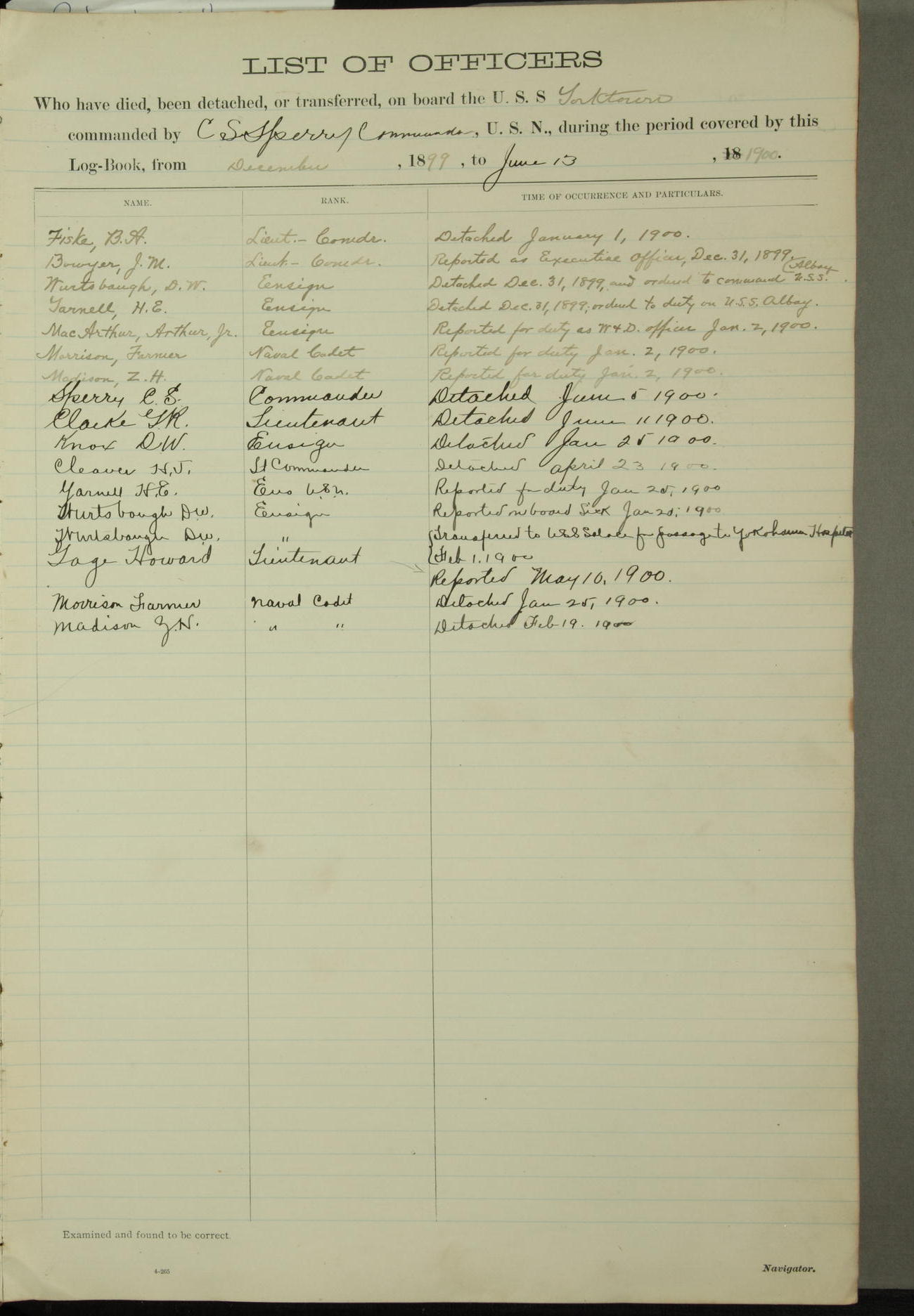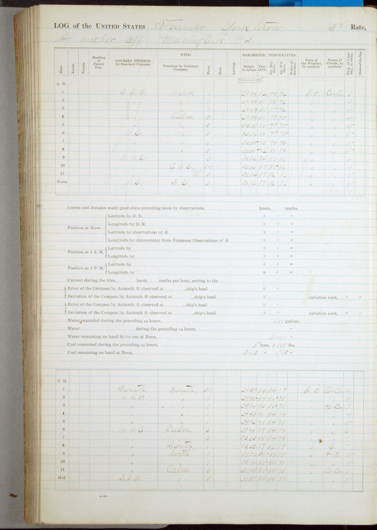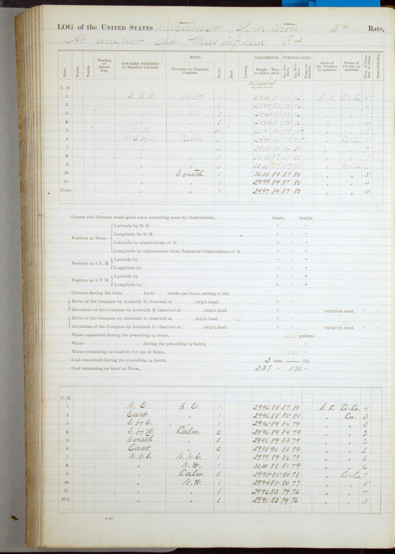 [In red, probably because of a sudden jump of 0.31 inches at 5.00am:] Many of the barometer readings of the first half of this day are obviously wrong, [signed] C.S. Sperry.