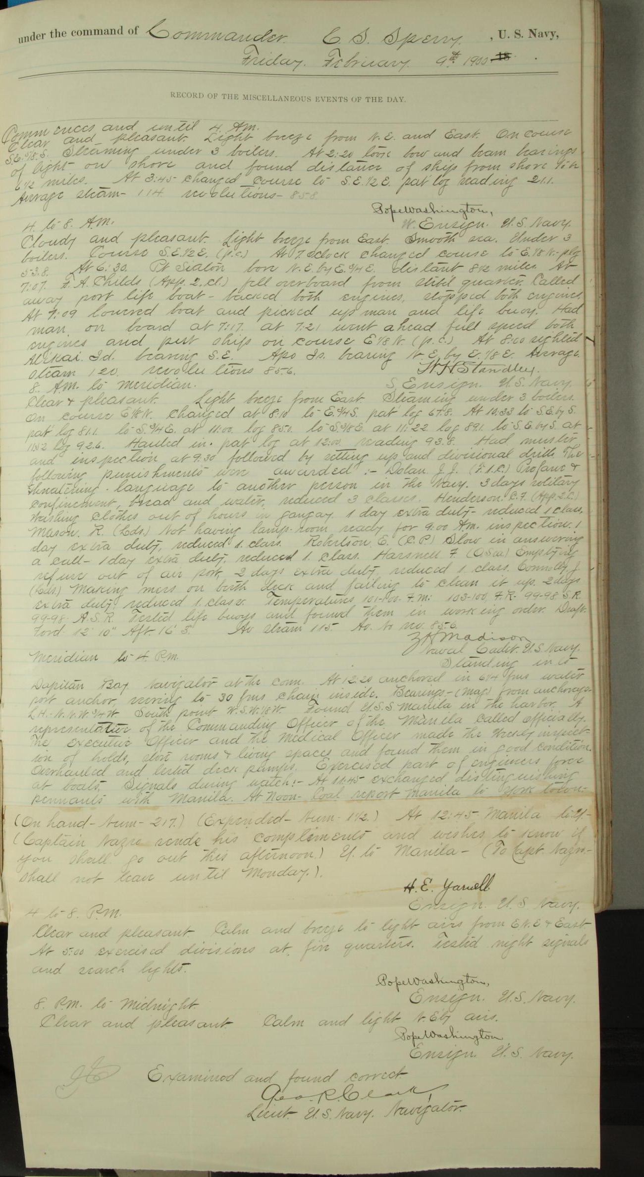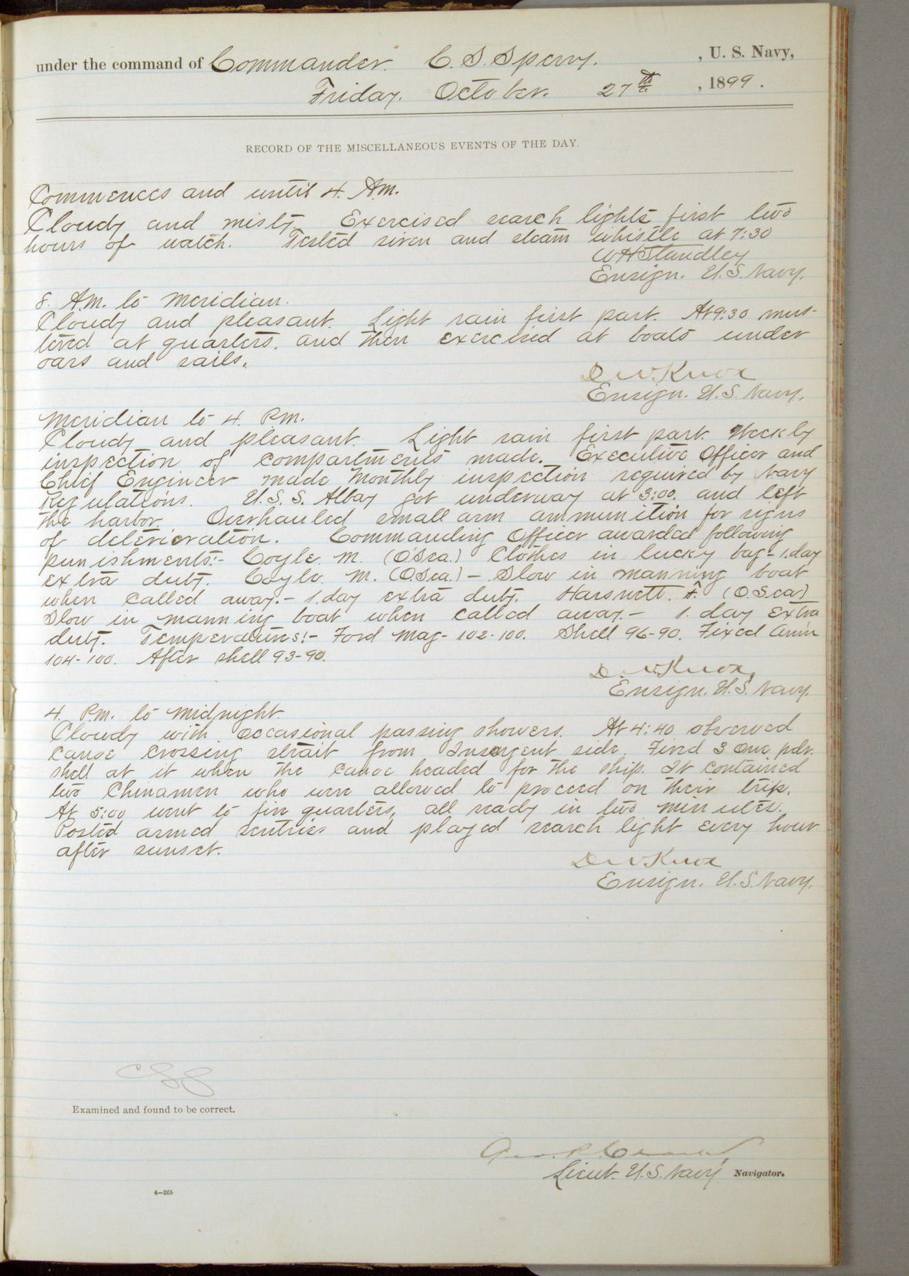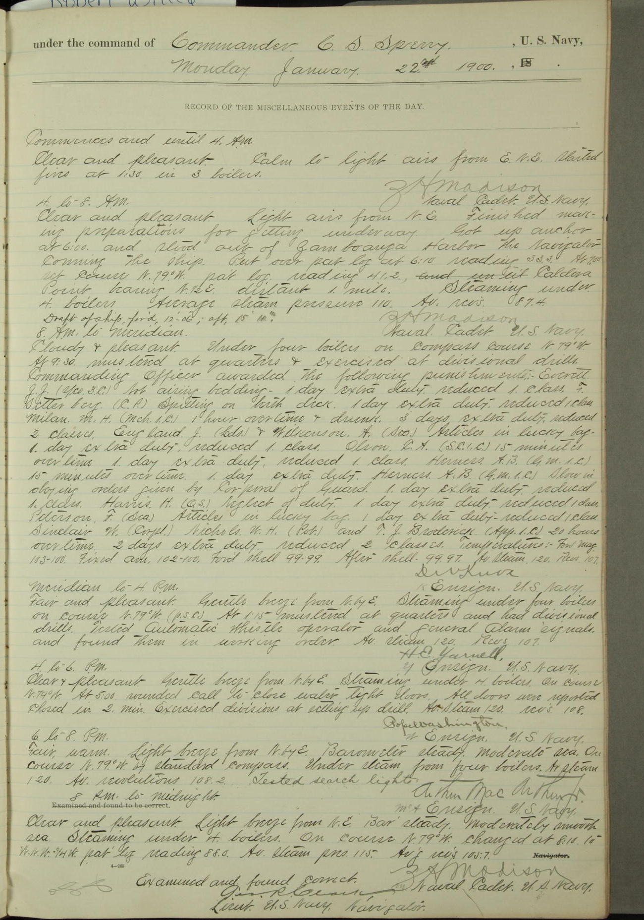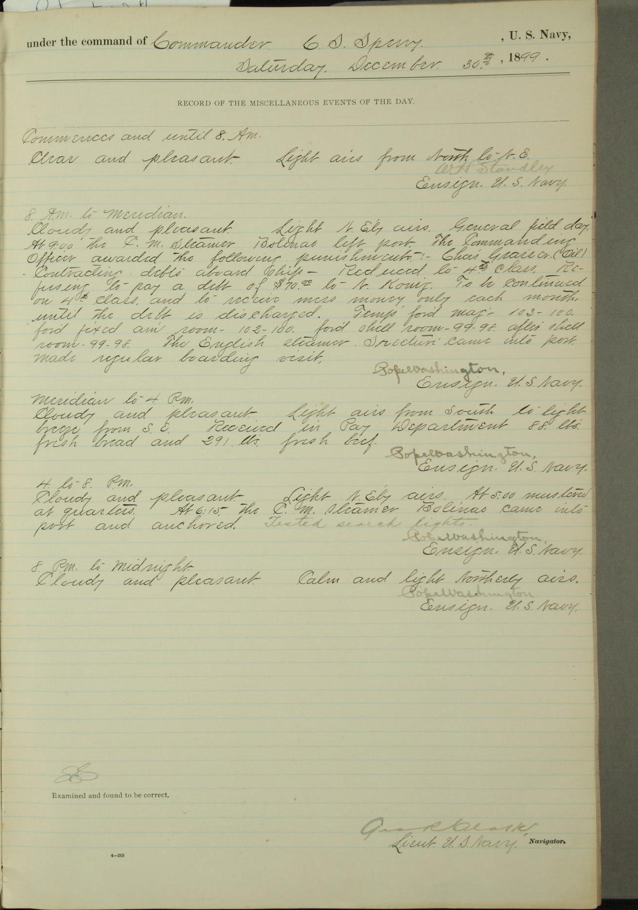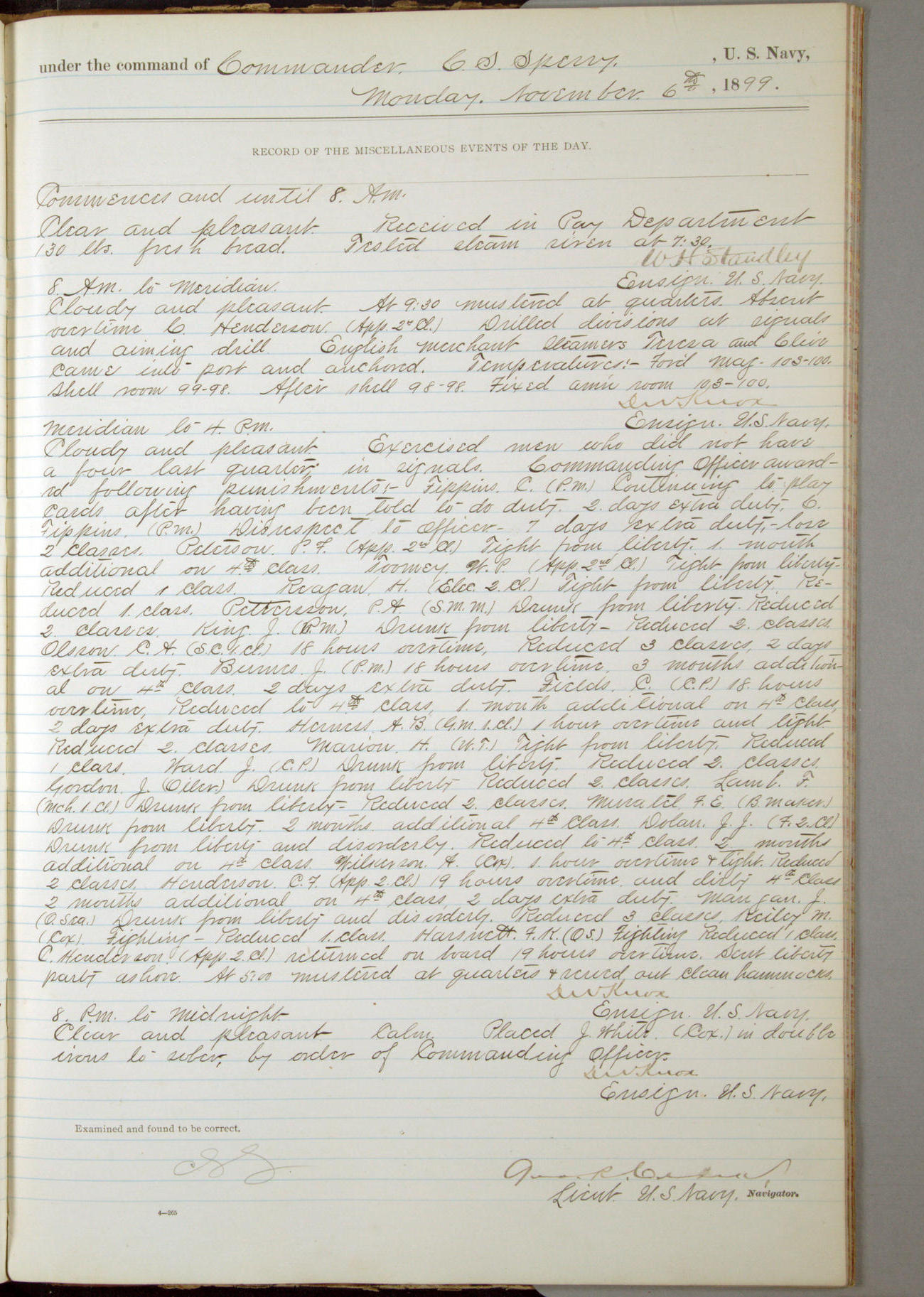Commanding Officer awarded the following punishments: P.M. Anderson, Coal Passer, reduced to 2nd [conduct] class, for ½ hour over time; A. Kelly, Coxswain, 4th [conduct] class and 2 days' extra duty, for 12 hours over time and tight; H. Milan, Machinist First-class, 3rd [conduct] class and 1 day's extra duty, for 3 hours over time and drunk.