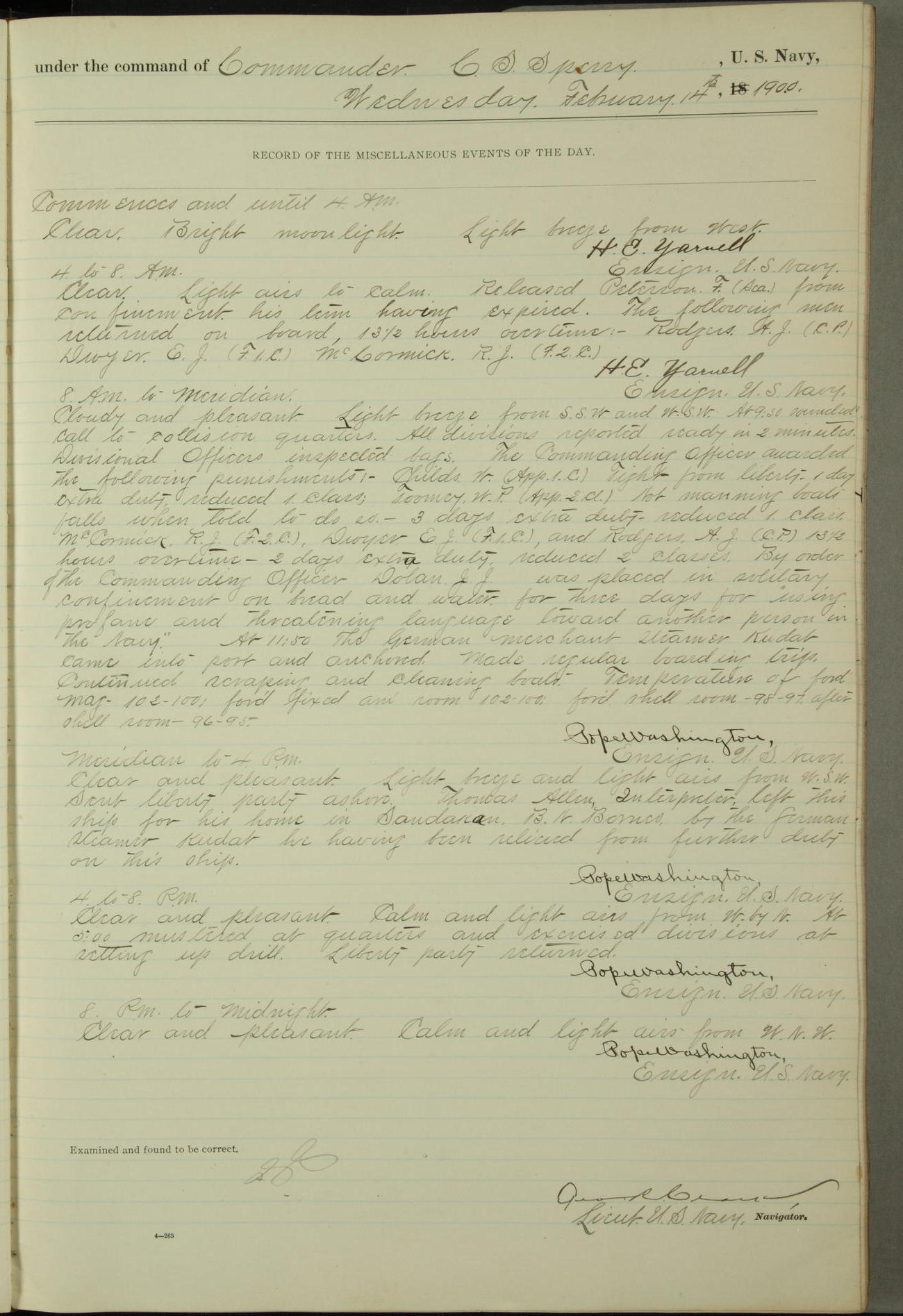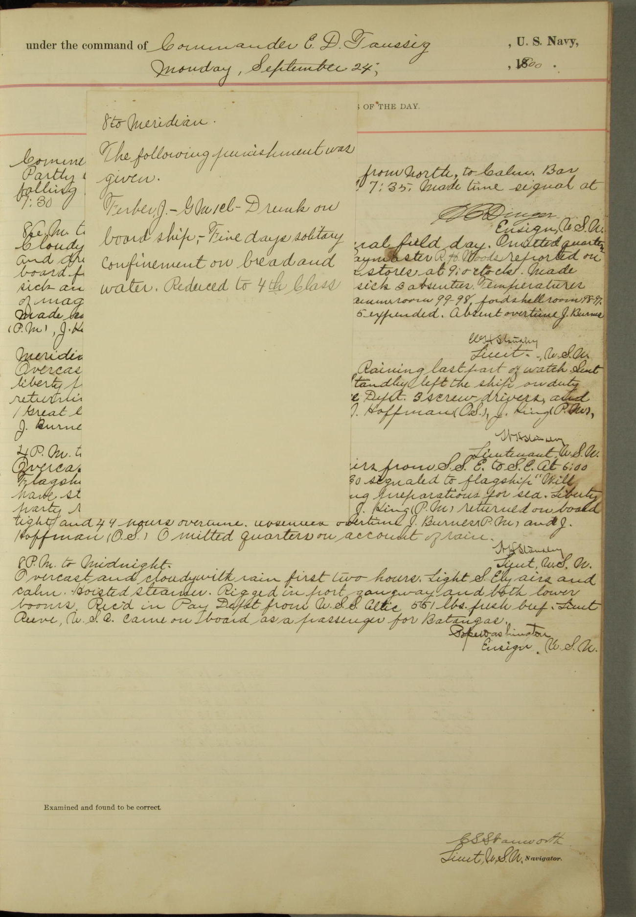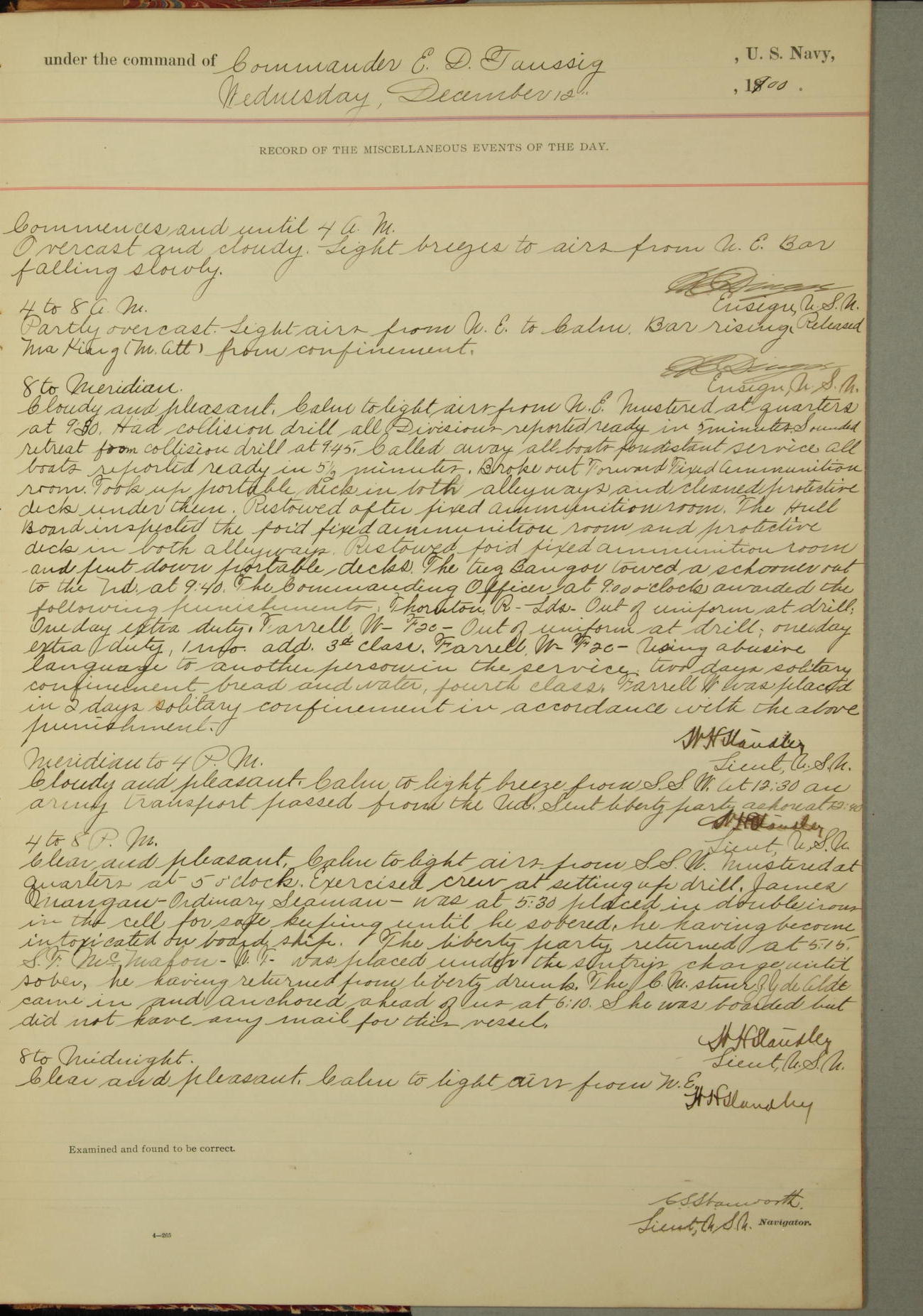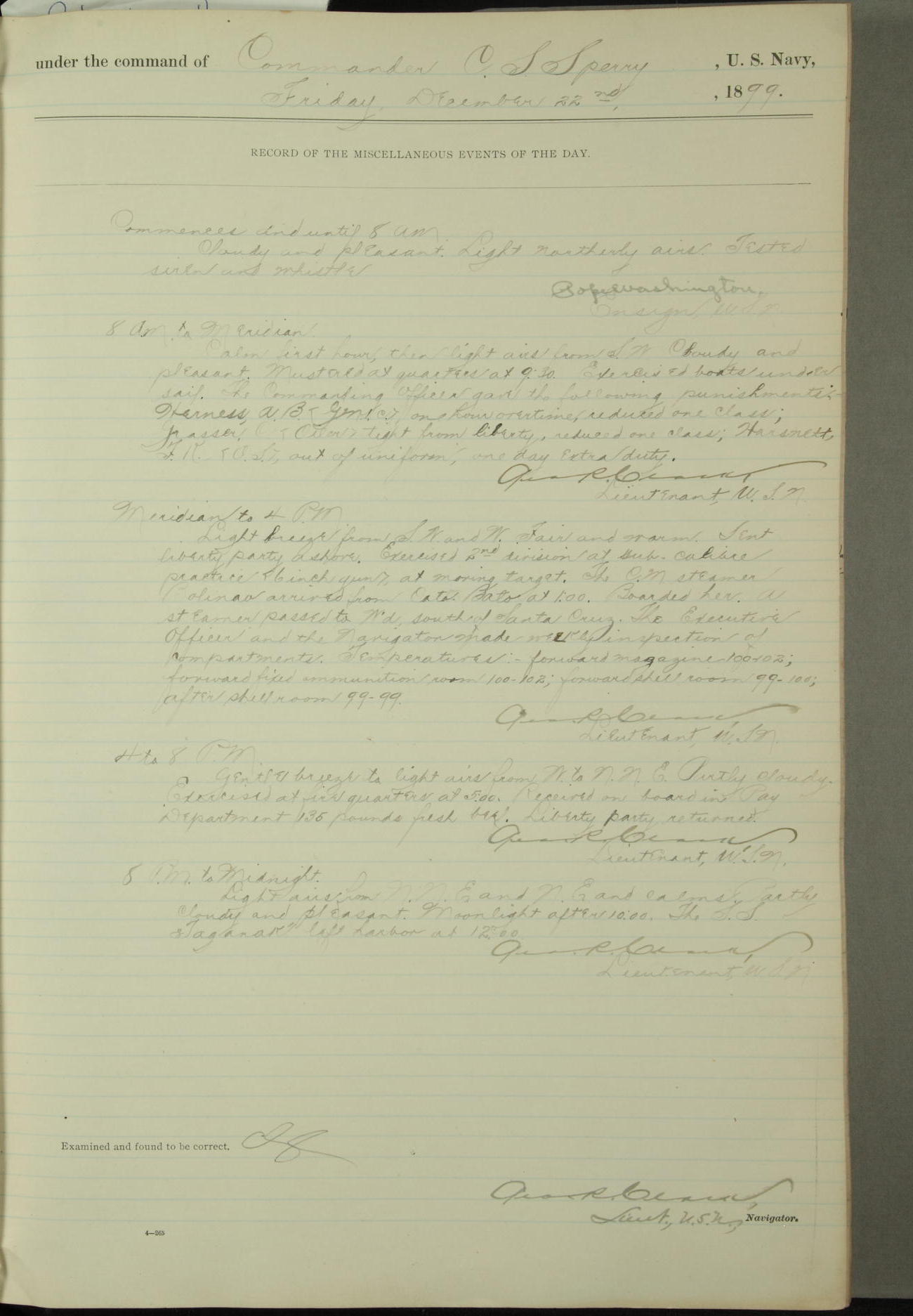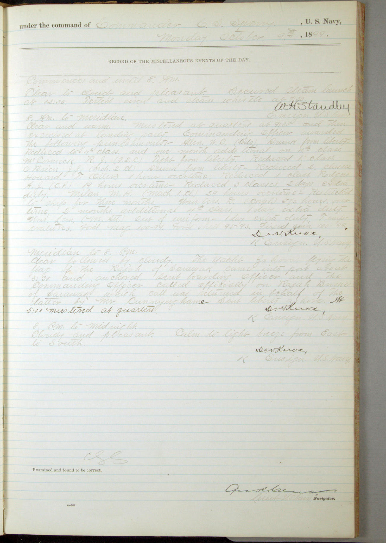 Commanding Officer awarded the following punishments: P.M. Anderson, Coal Passer, reduced to 2nd [conduct] class, for ½ hour over time; A. Kelly, Coxswain, 4th [conduct] class and 2 days' extra duty, for 12 hours over time and tight; H. Milan, Machinist First-class, 3rd [conduct] class and 1 day's extra duty, for 3 hours over time and drunk.