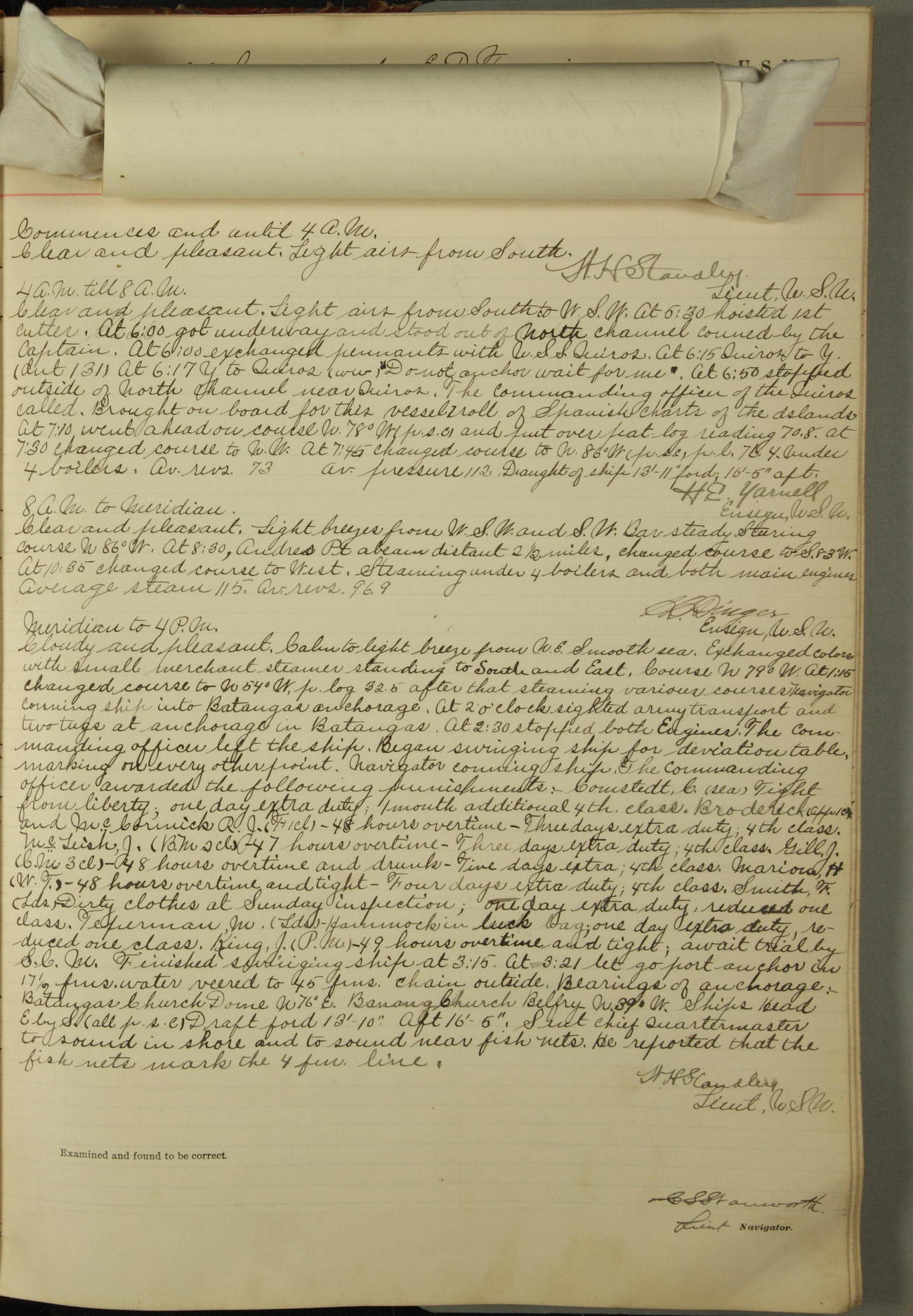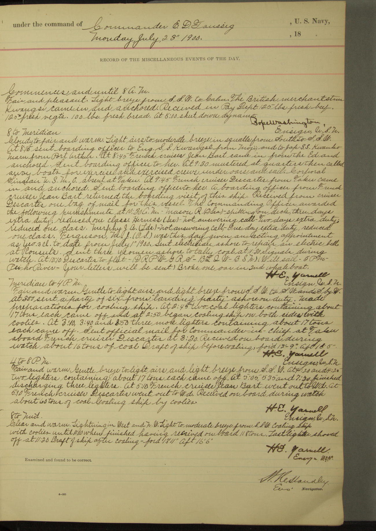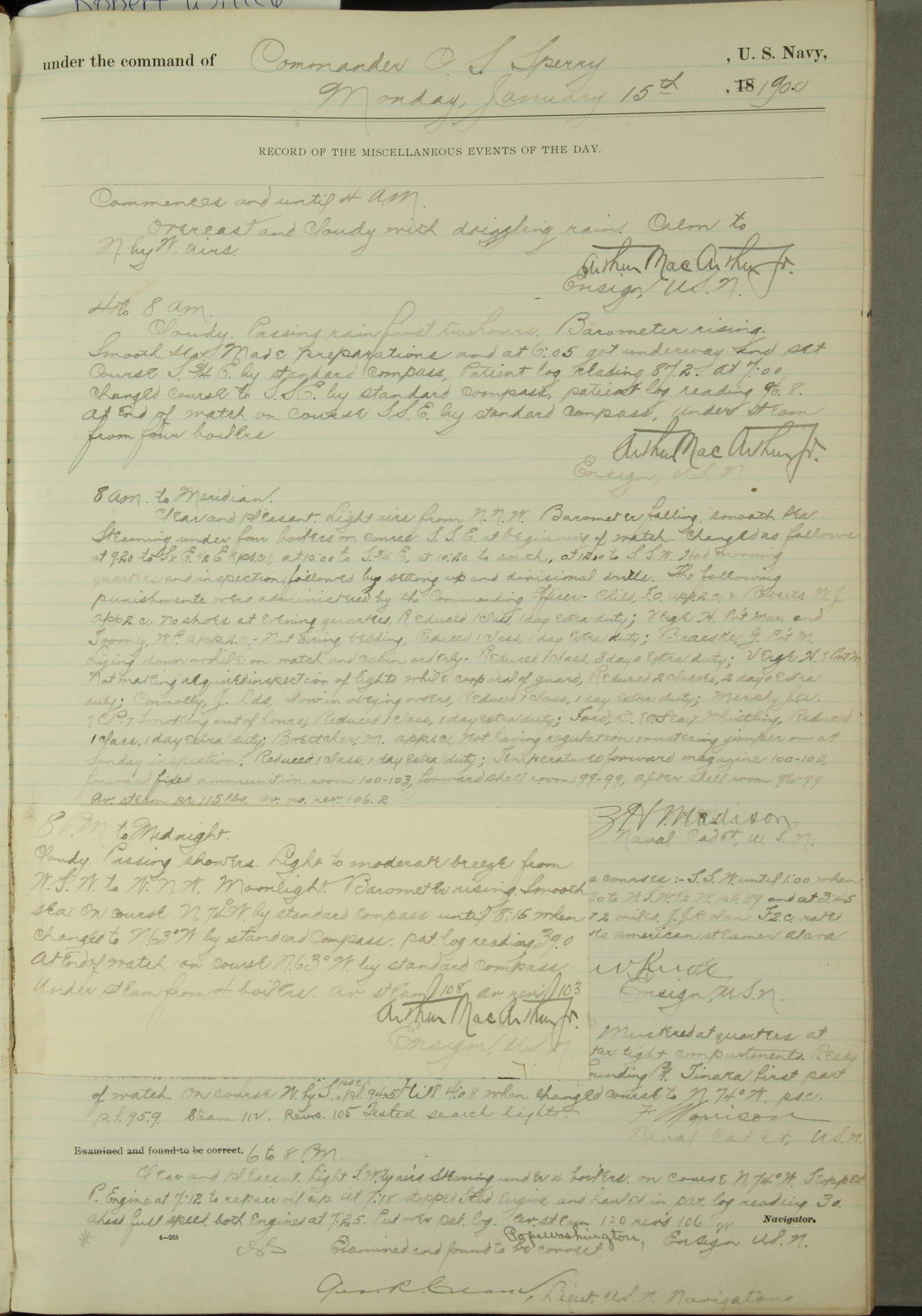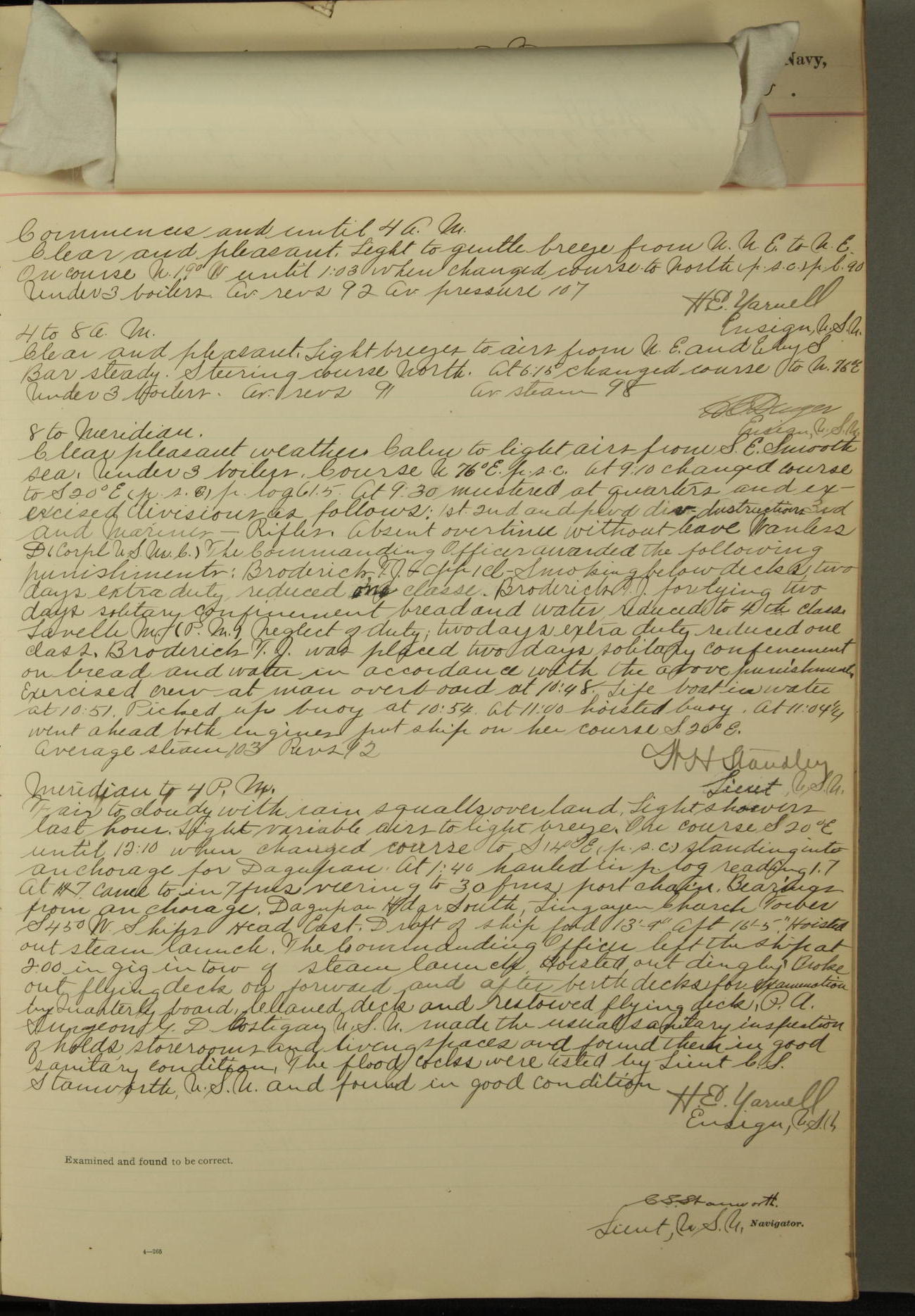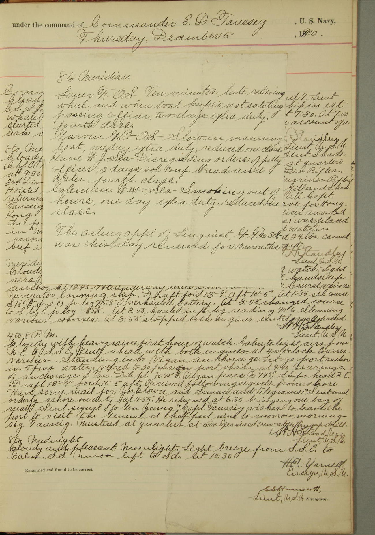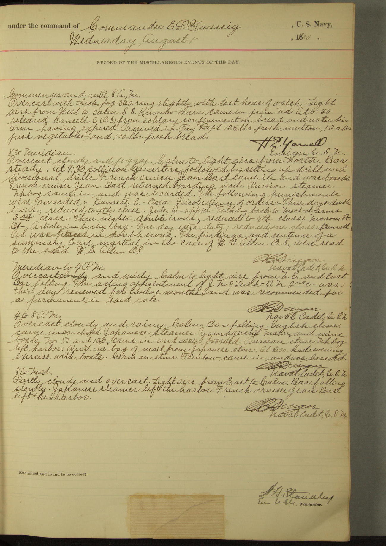 Commanding Officer awarded the following punishments: P.M. Anderson, Coal Passer, reduced to 2nd [conduct] class, for ½ hour over time; A. Kelly, Coxswain, 4th [conduct] class and 2 days' extra duty, for 12 hours over time and tight; H. Milan, Machinist First-class, 3rd [conduct] class and 1 day's extra duty, for 3 hours over time and drunk.