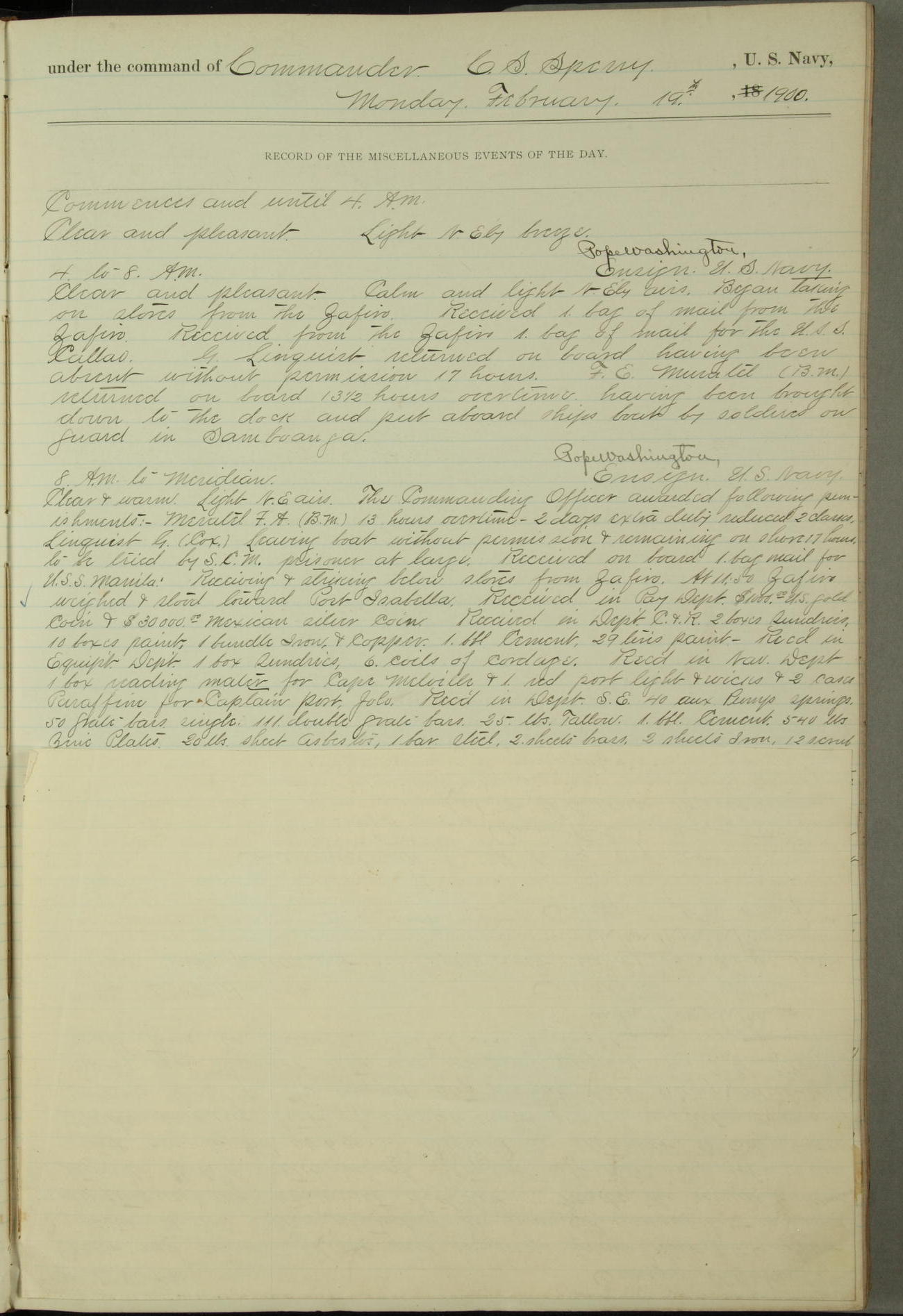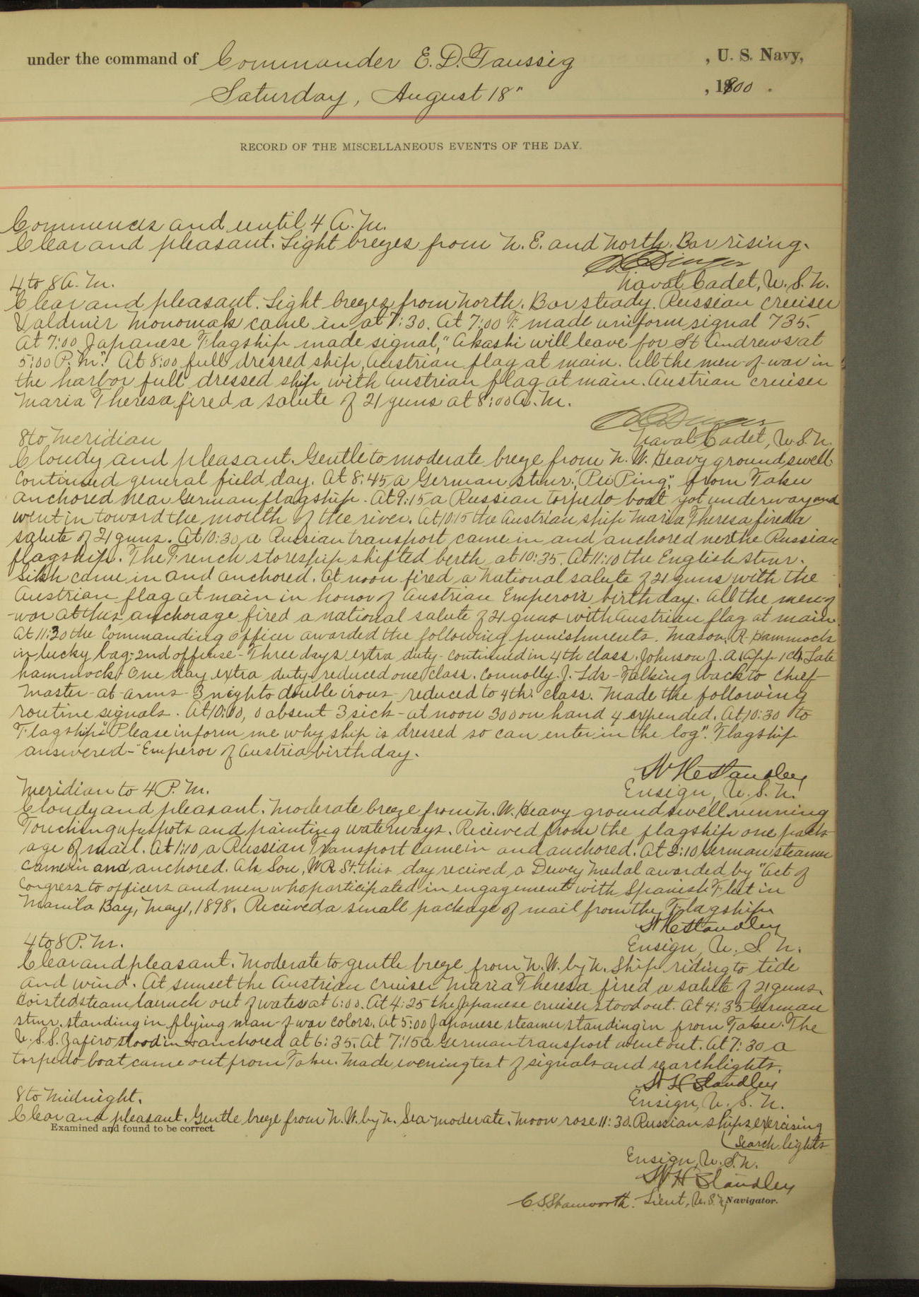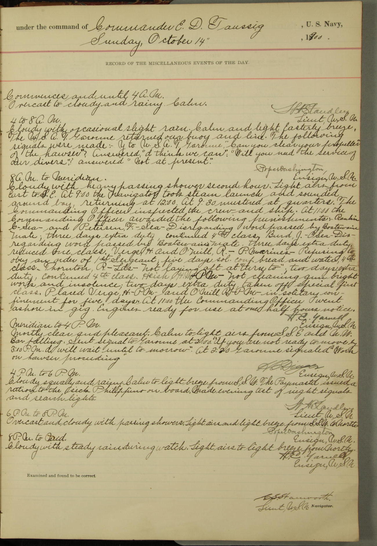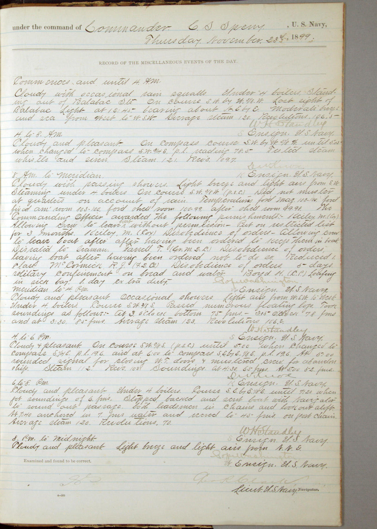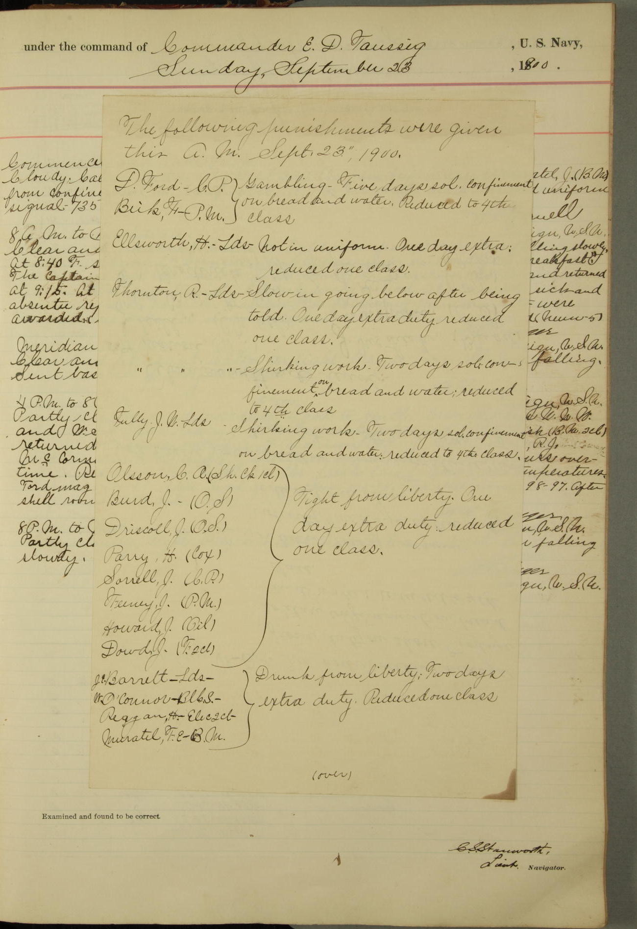 Commanding Officer awarded the following punishments: P.M. Anderson, Coal Passer, reduced to 2nd [conduct] class, for ½ hour over time; A. Kelly, Coxswain, 4th [conduct] class and 2 days' extra duty, for 12 hours over time and tight; H. Milan, Machinist First-class, 3rd [conduct] class and 1 day's extra duty, for 3 hours over time and drunk.